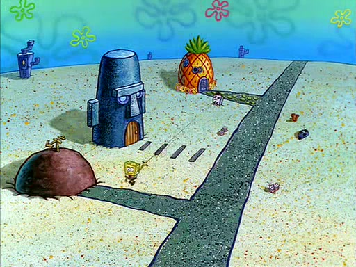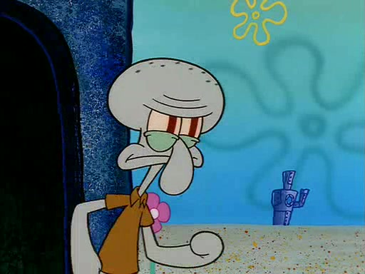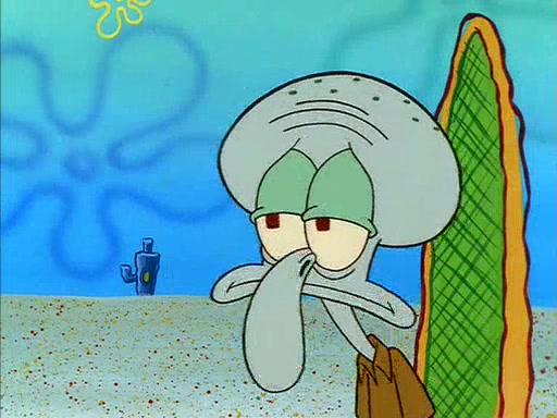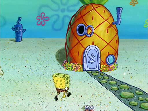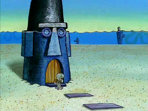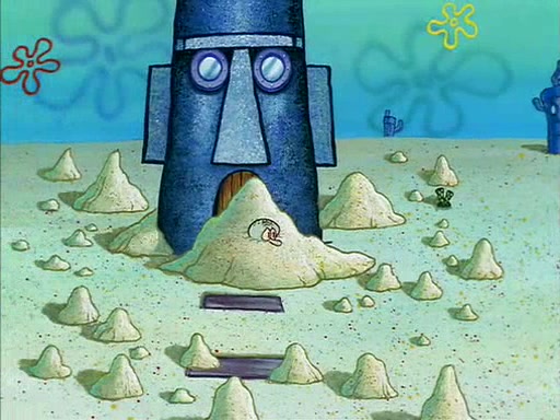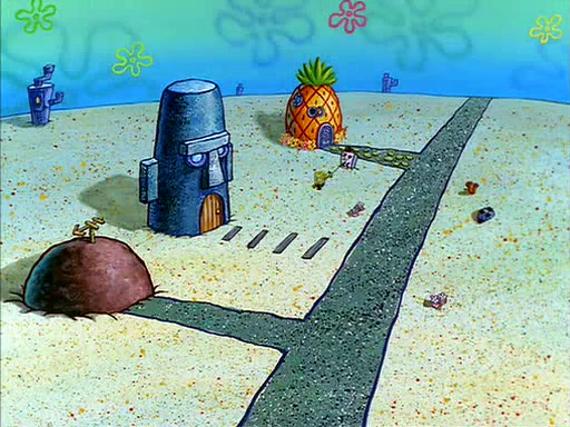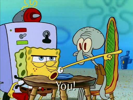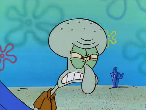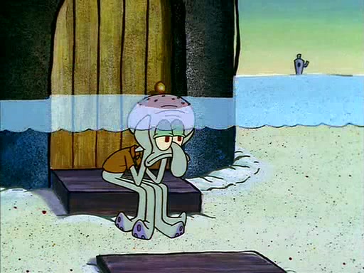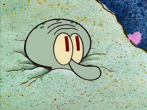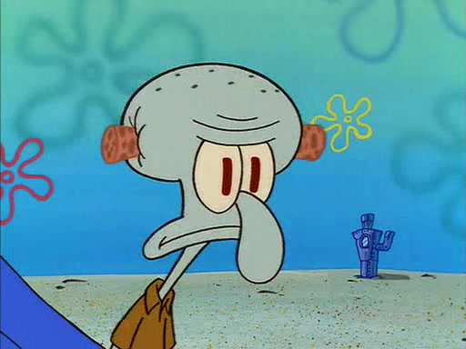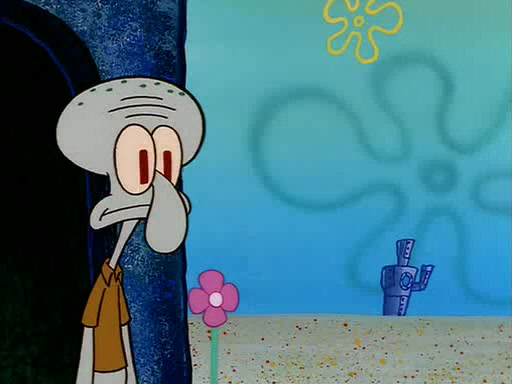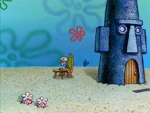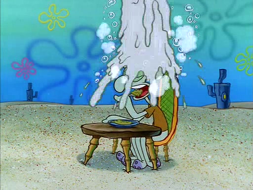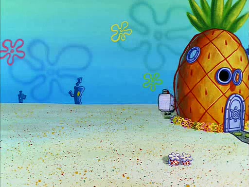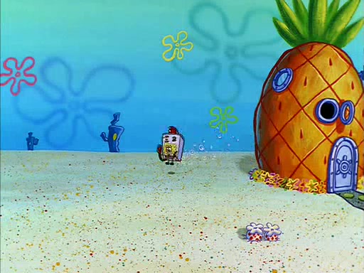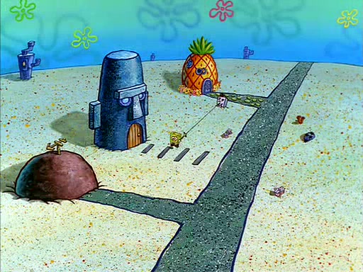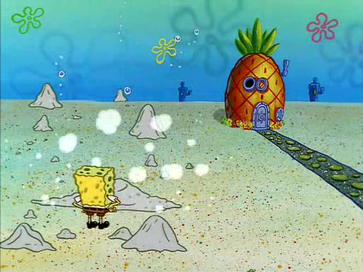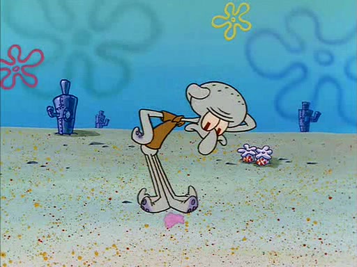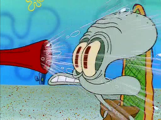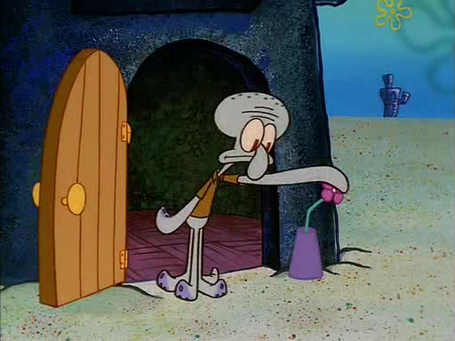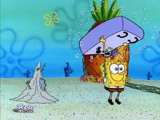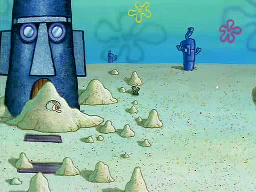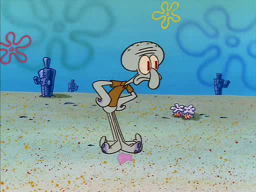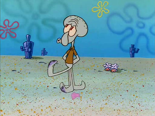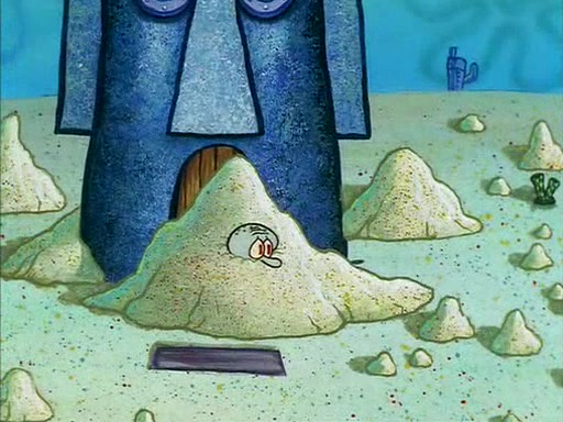 After failing attempts, he angrily blows a large column of sand onto Squidward. To fix this problem, SpongeBob blows the sand off, which irritates Squidward's eyes. SpongeBob peers over at his sidewalk and sees a pile of sand. A subtitle "You" appears as SpongeBob points at the pile (no dialogue is heard).