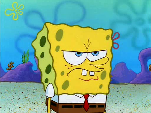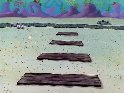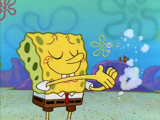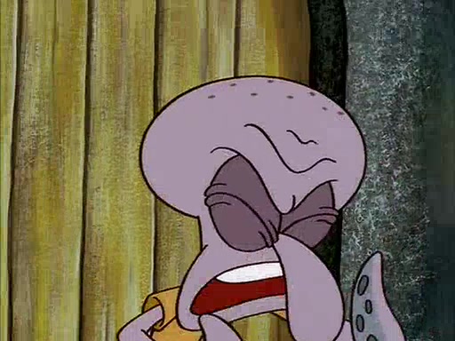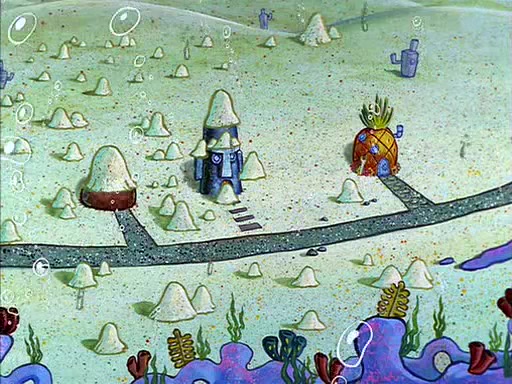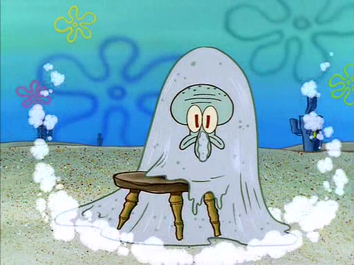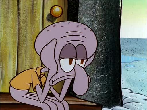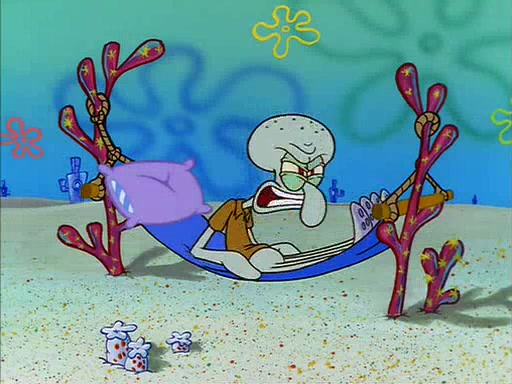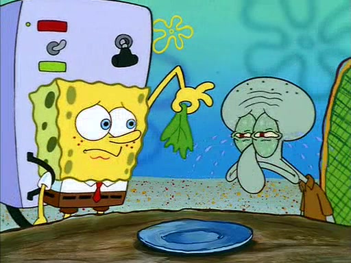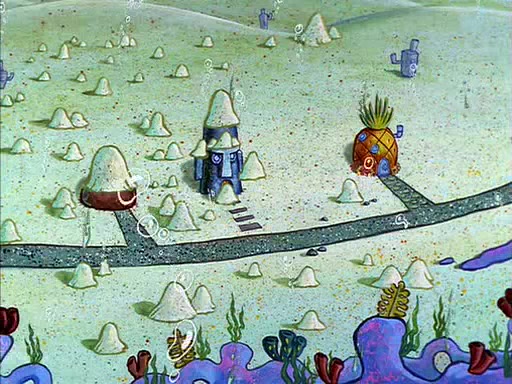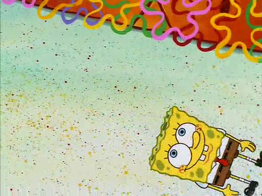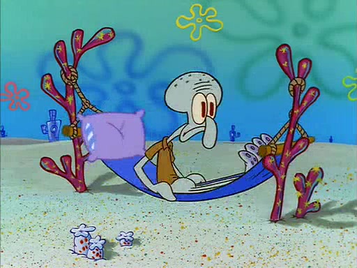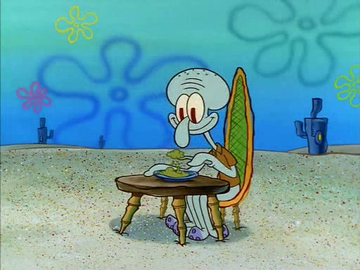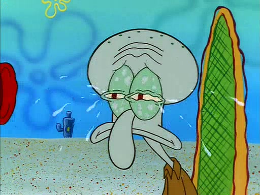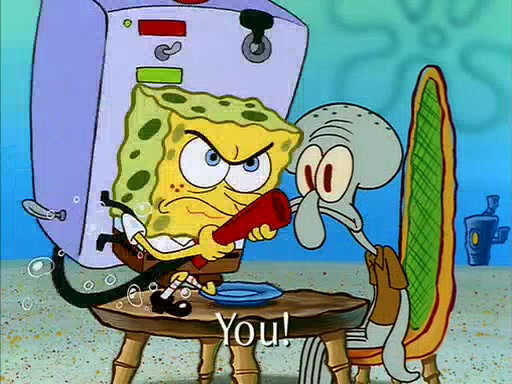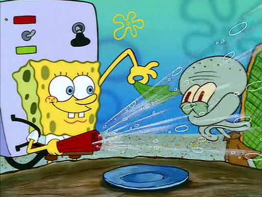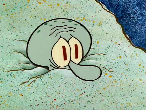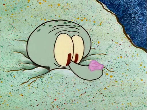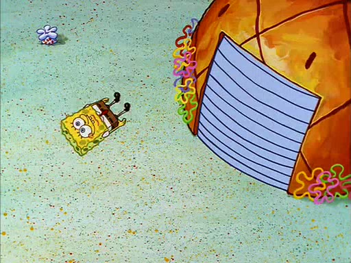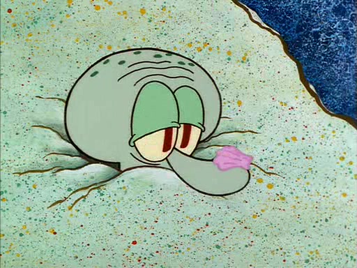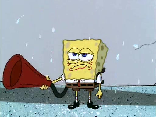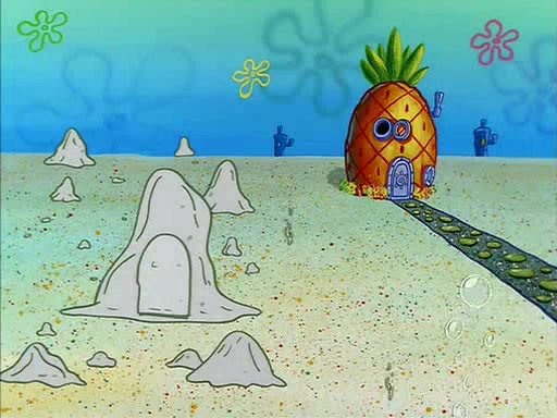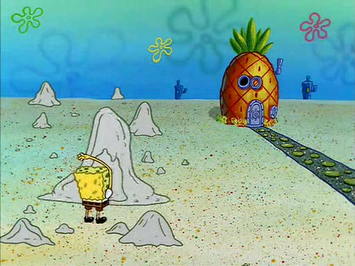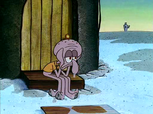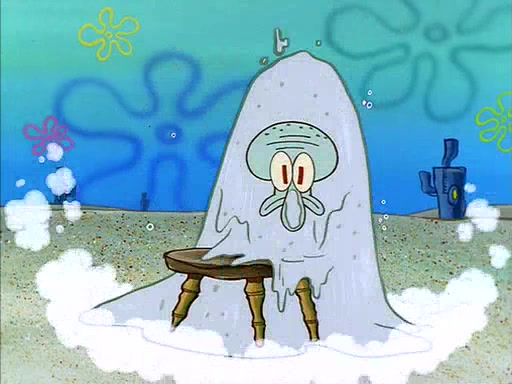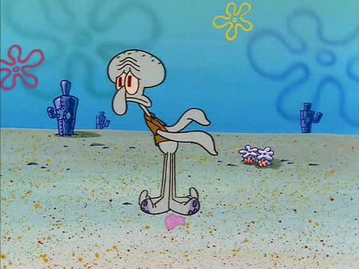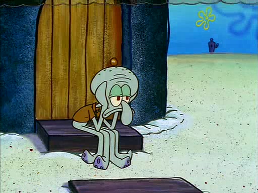 After failing attempts, he angrily blows a large column of sand onto Squidward. To fix this problem, SpongeBob blows the sand off, which irritates Squidward's eyes. SpongeBob peers over at his sidewalk and sees a pile of sand. A subtitle "You" appears as SpongeBob points at the pile (no dialogue is heard).