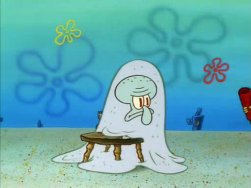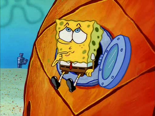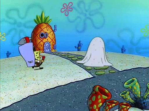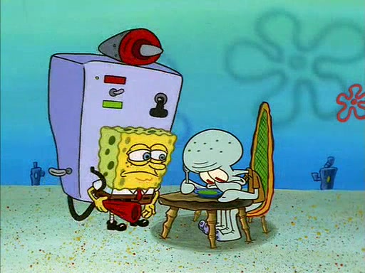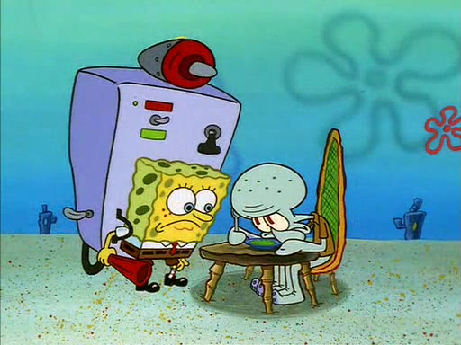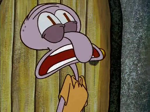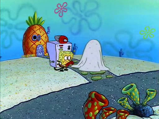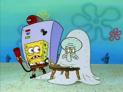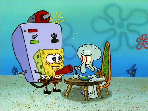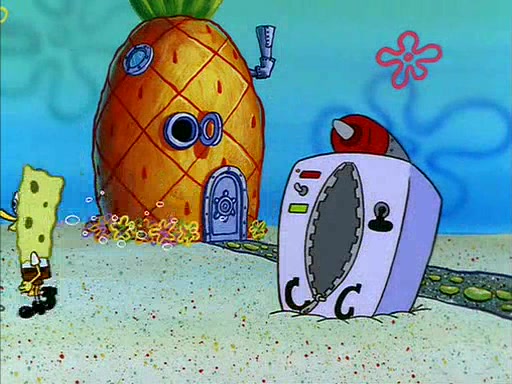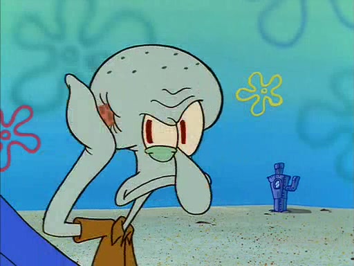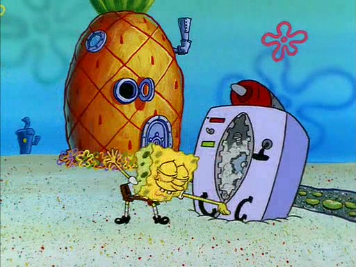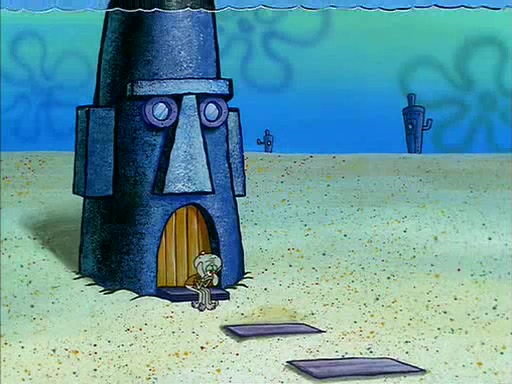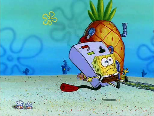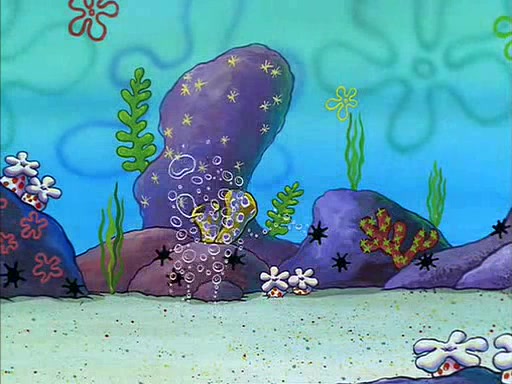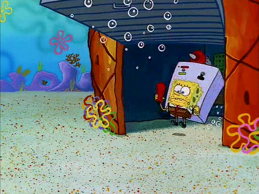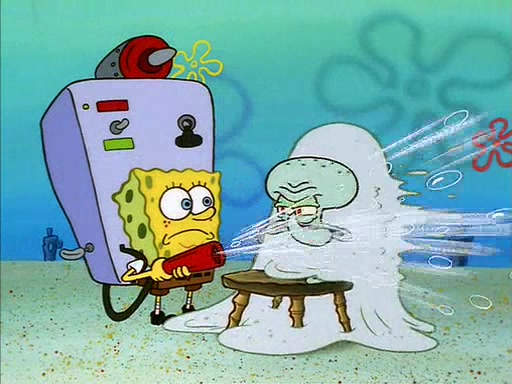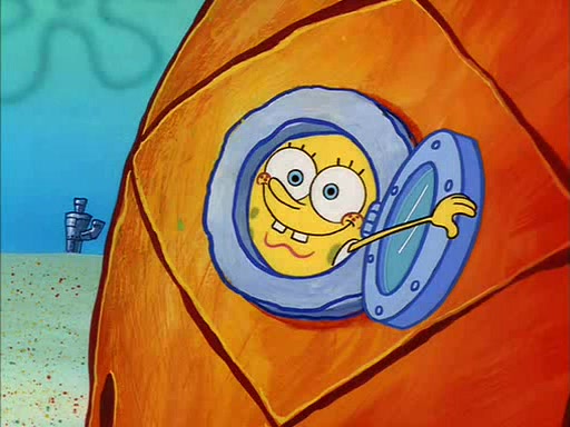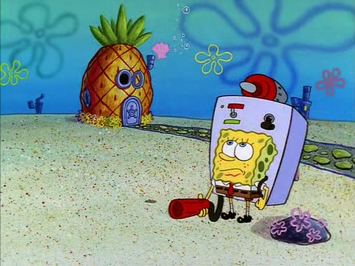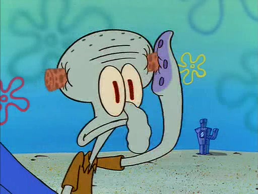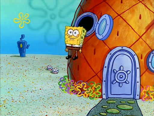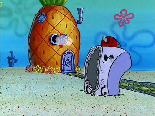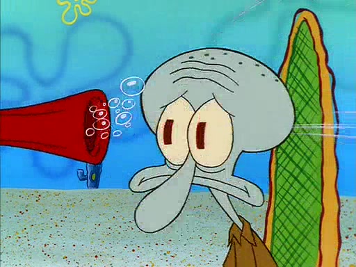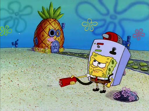 Suddenly, SpongeBob pops out of his window and sees the shell. He also believes that it ruins the appearance of his front lawn, so he gets his "reef blower" (an underwater version of a leaf blower) out of his garage. He turns it on, much to the annoyance of Squidward. Squidward plugs his ears and SpongeBob struggles to blow the shell away.