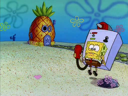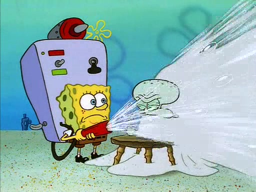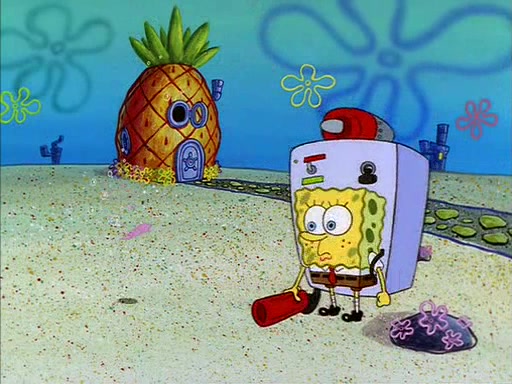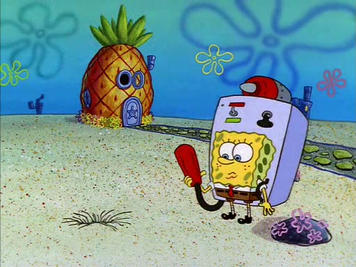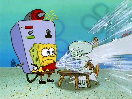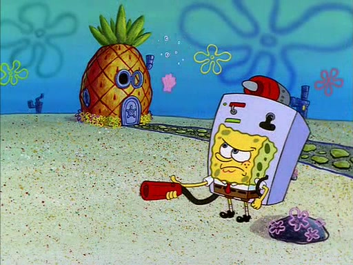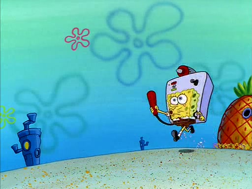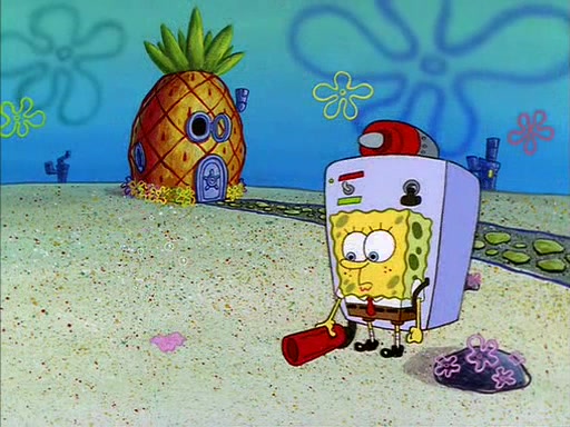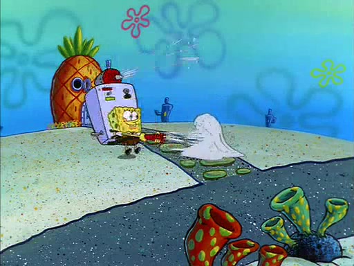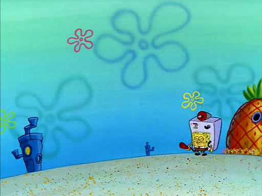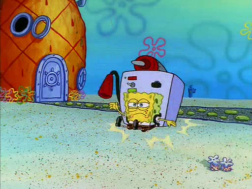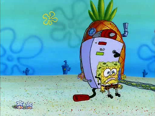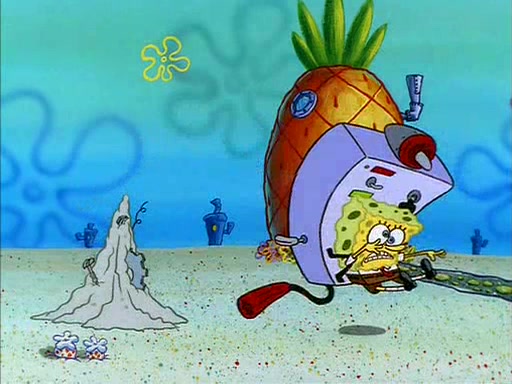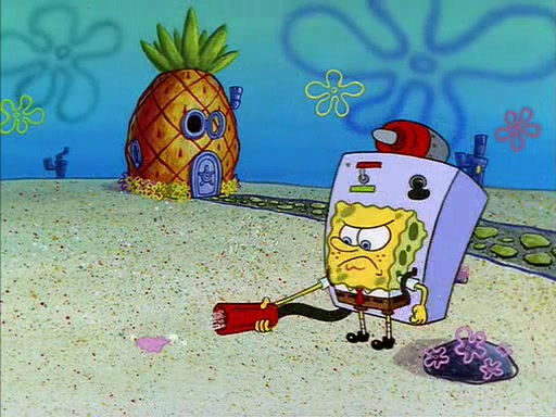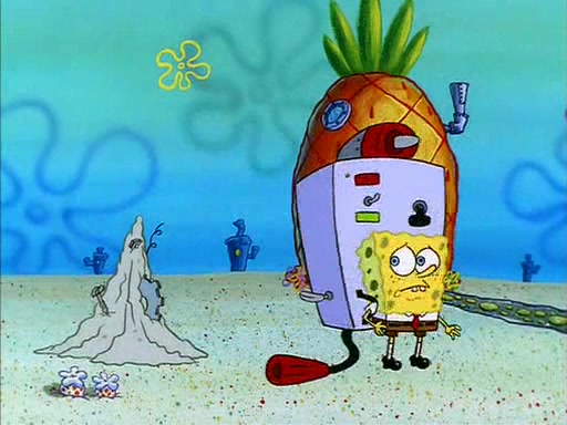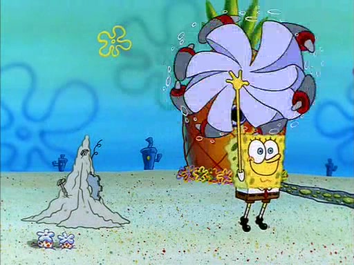 He then sucks the pile of sand into the reef blower, which begins to malfunction. The sand and a few mechanical gears blow out. So, SpongeBob unzips the reef blower and puts them in himself. The reef blower sneezes.