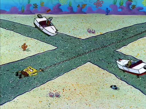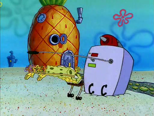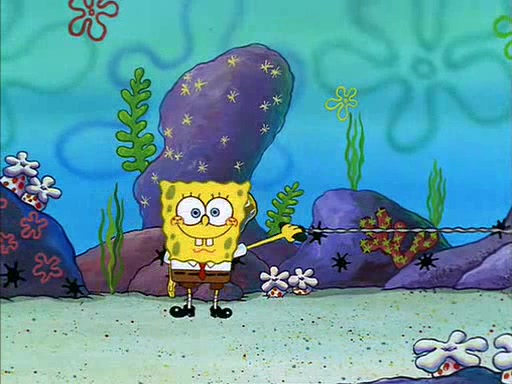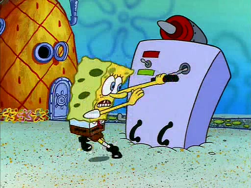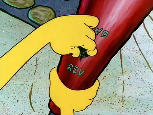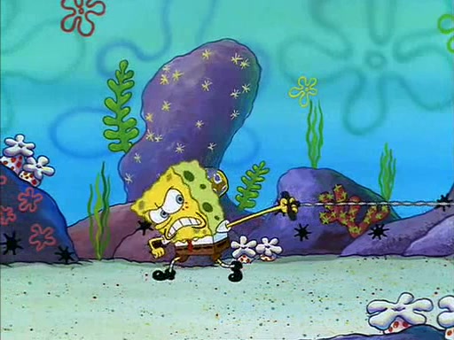 When the reef blower refuses to start, SpongeBob pulls the cord to an extreme distance and before finally starts. However, this causes it to suck in all of the water in the ocean.