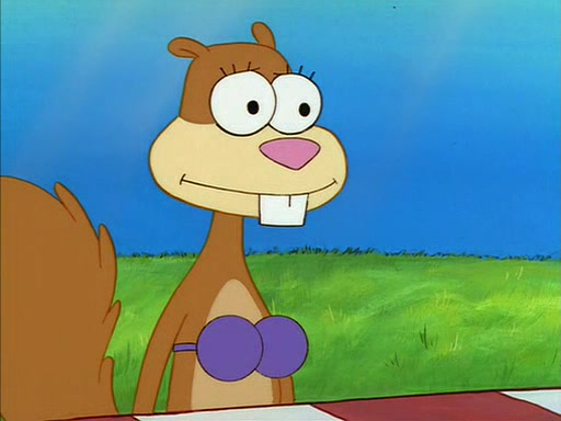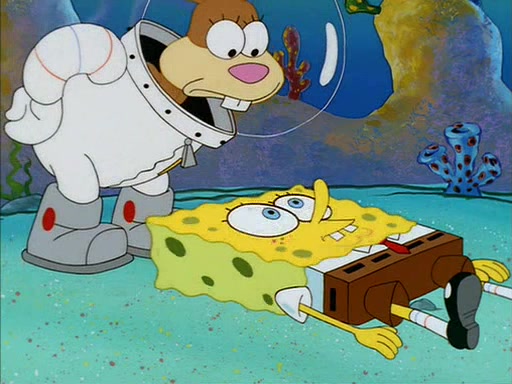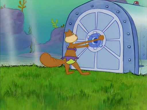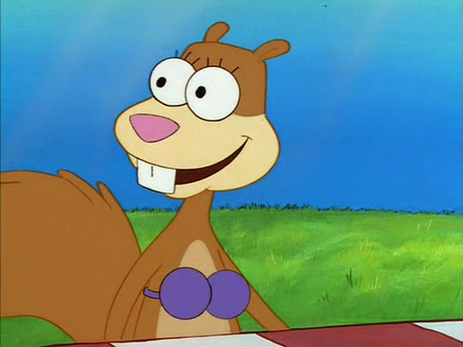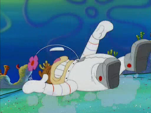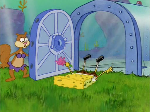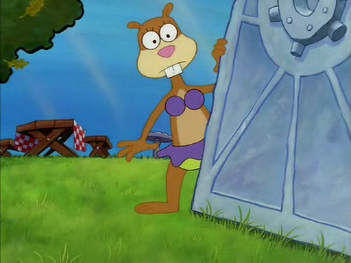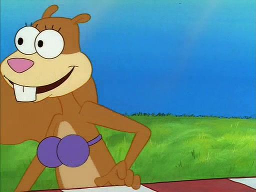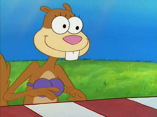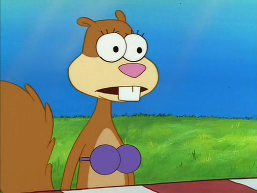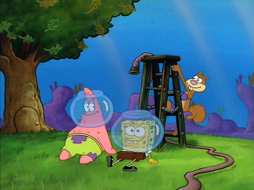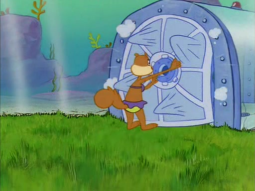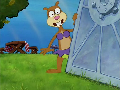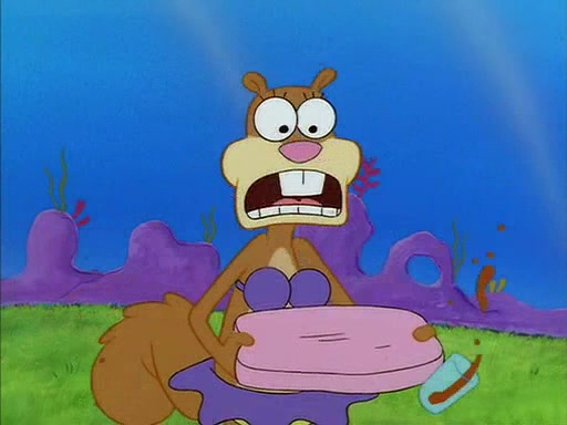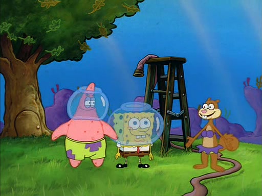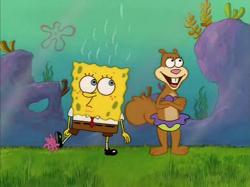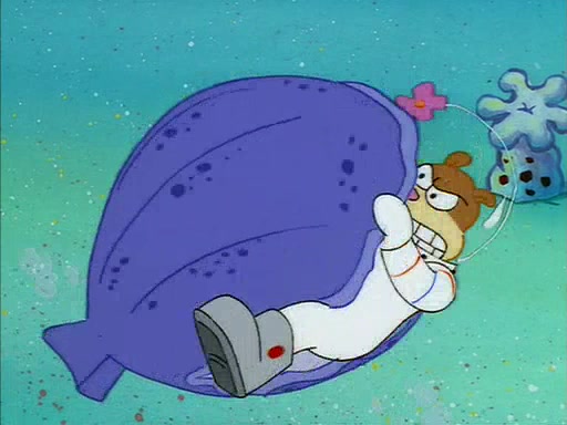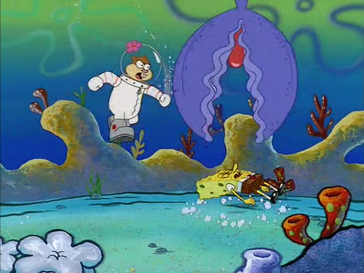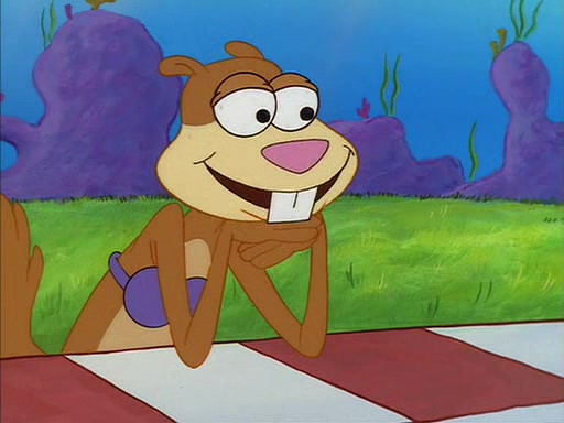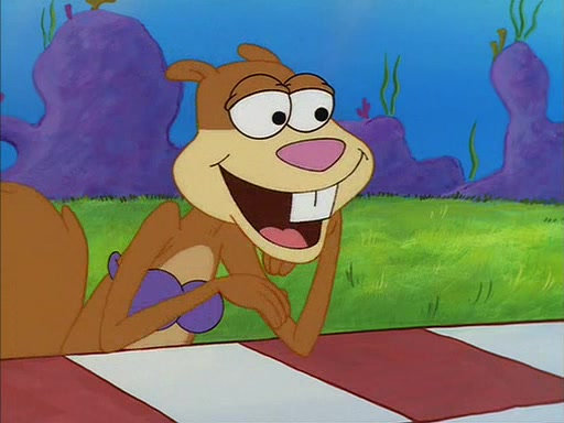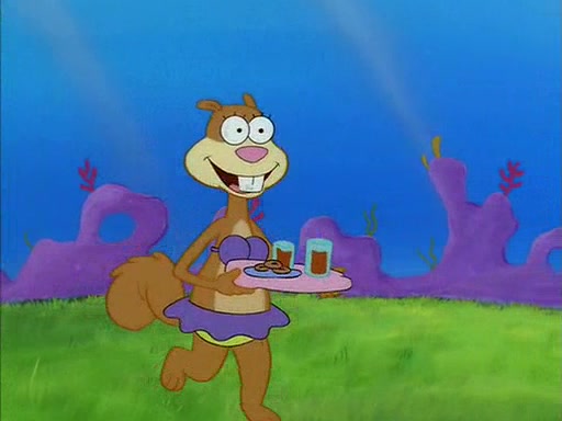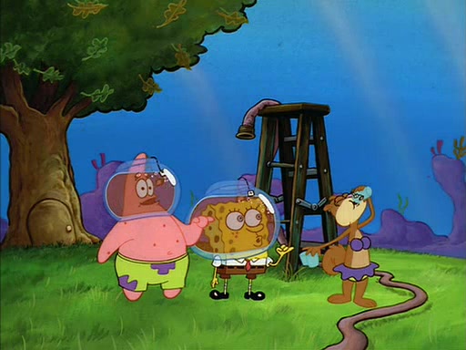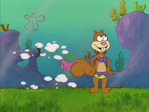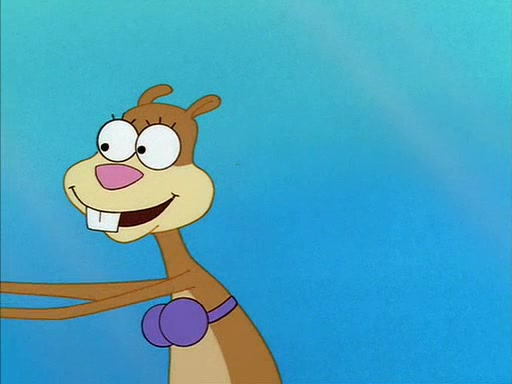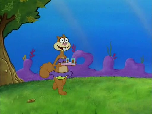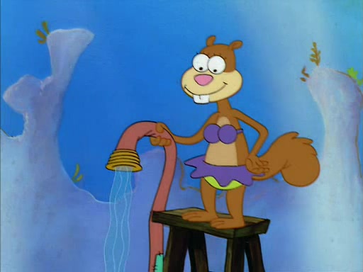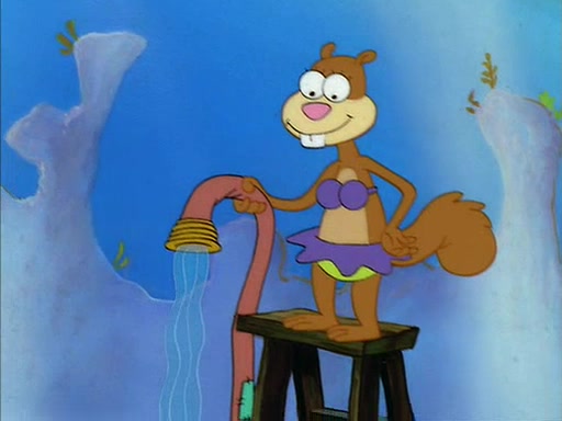 When SpongeBob arrives at Sandy's treedome, Sandy is in a purple bikini, since she does not need her air helmet inside. SpongeBob goes inside, and notices that the water level drops to almost nothing. He panics, and tells Sandy that there is no water. She tells him that, it's just air. SpongeBob says that there isn't any problem and tries hard to breathe. He doesn't realize that sea creatures need water to survive.