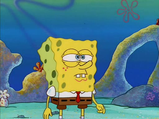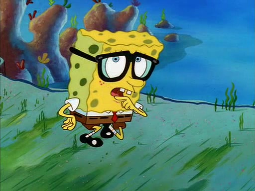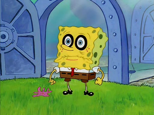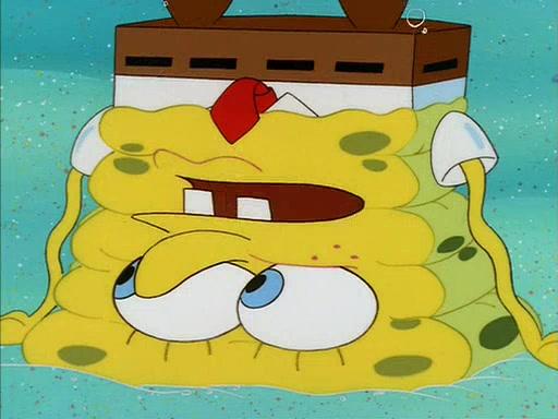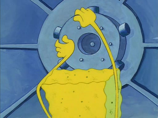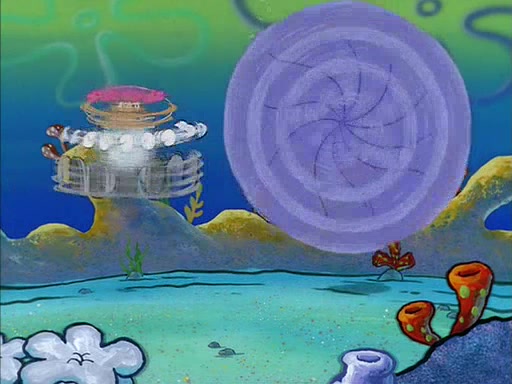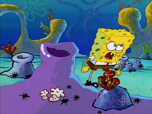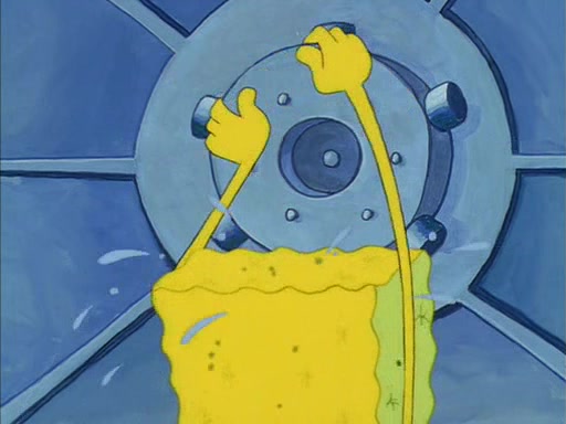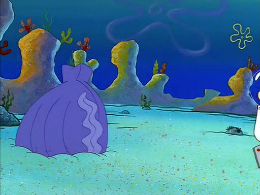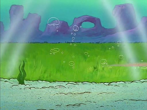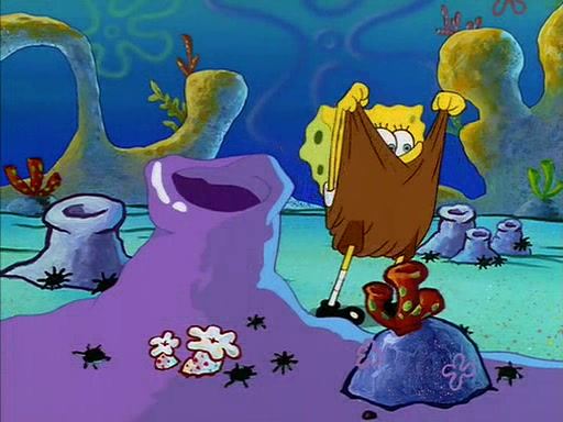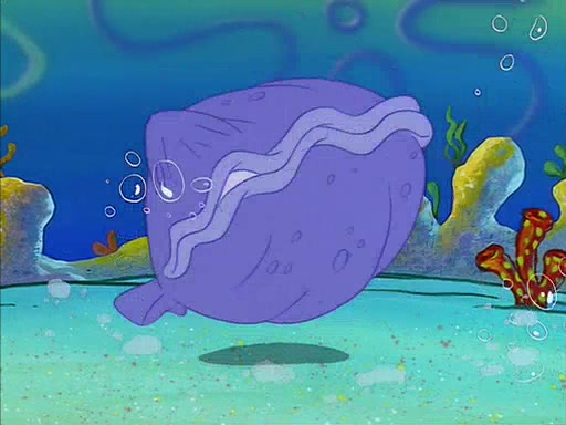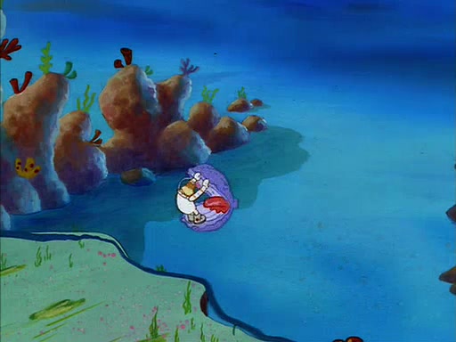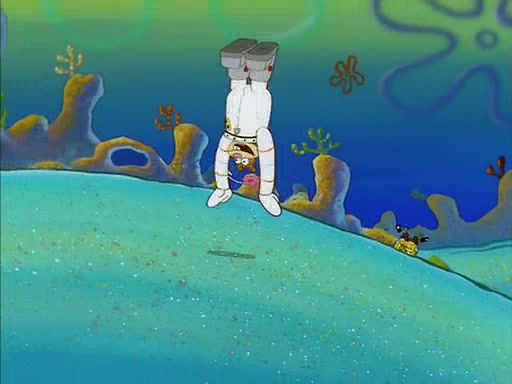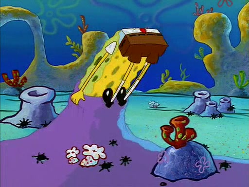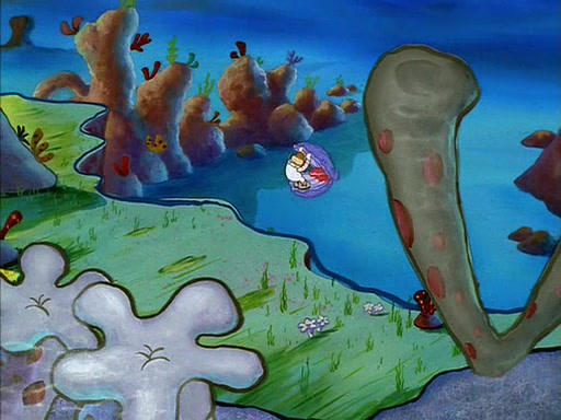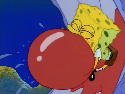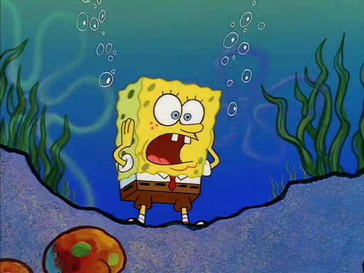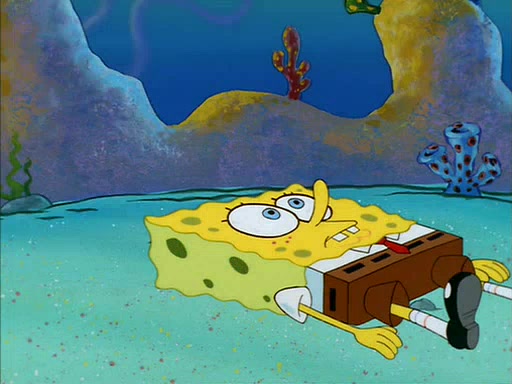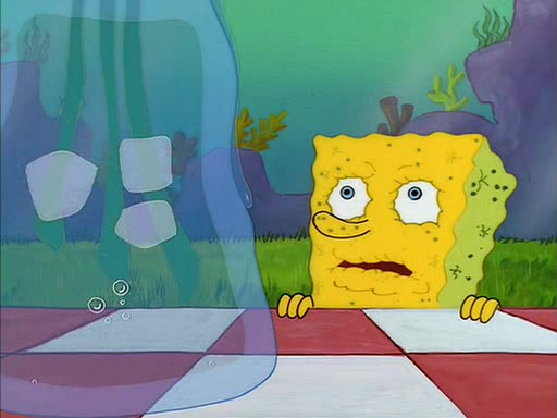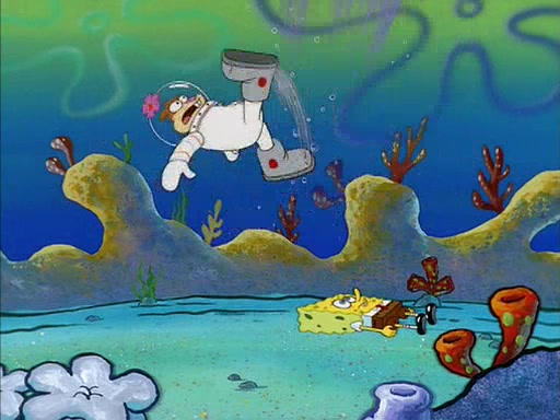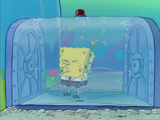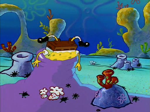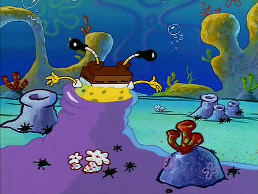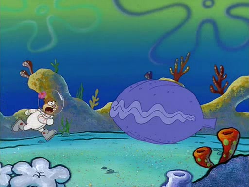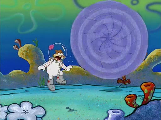 When SpongeBob arrives at Sandy's treedome, Sandy is in a purple bikini, since she does not need her air helmet inside. SpongeBob goes inside, and notices that the water level drops to almost nothing. He panics, and tells Sandy that there is no water. She tells him that, it's just air. SpongeBob says that there isn't any problem and tries hard to breathe. He doesn't realize that sea creatures need water to survive.