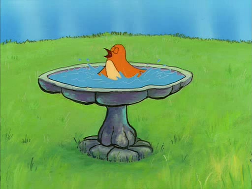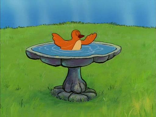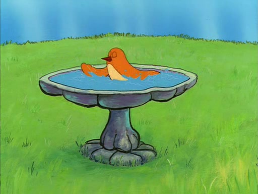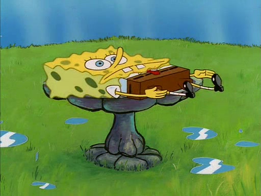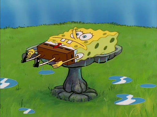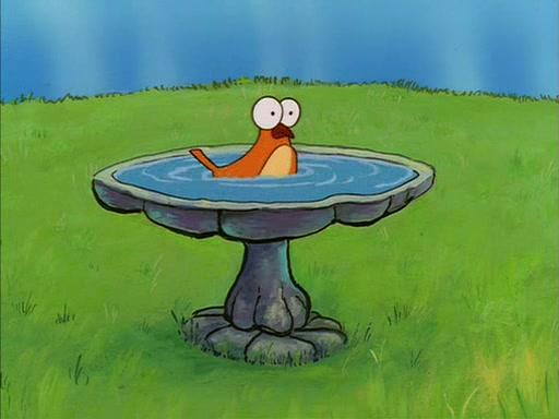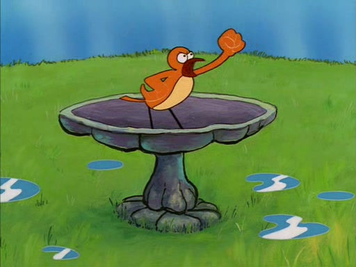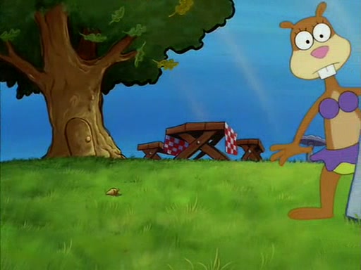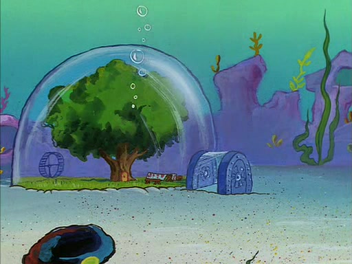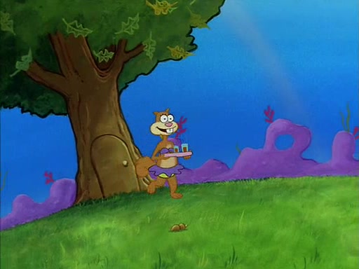 Sandy gives him a tour of her treedome, showing him that she has an oak tree, a bird bath, and other things. During this, SpongeBob quickly sneaks over to the bird bath, which is filled with water, and soaks up the water. The bird then angrily kicks him out.