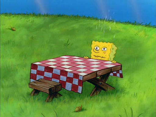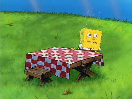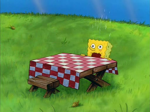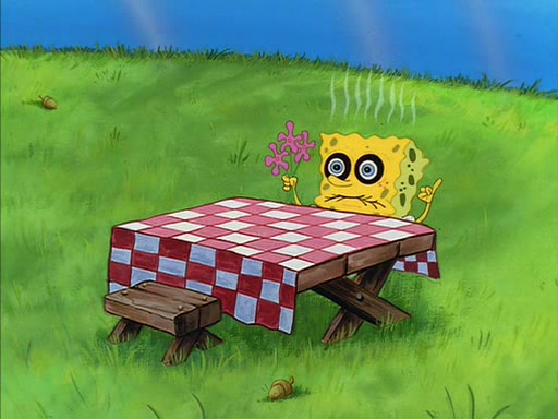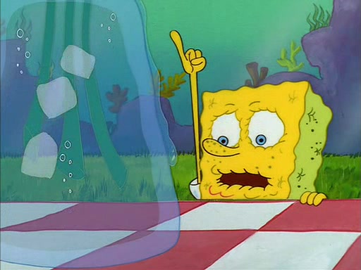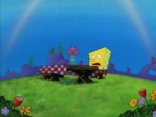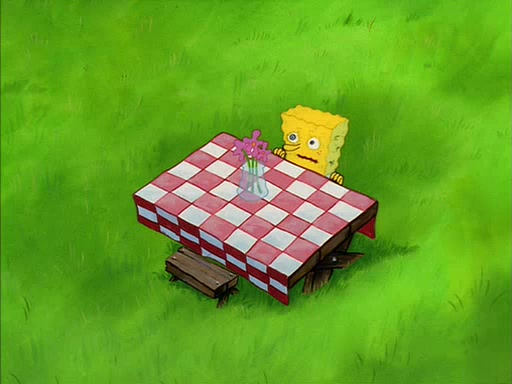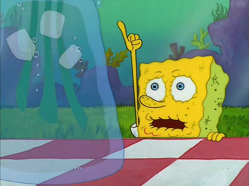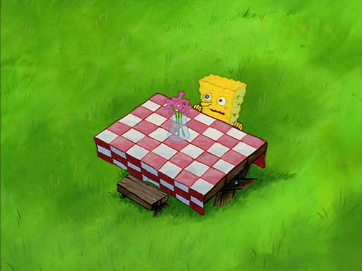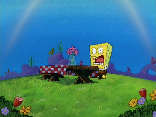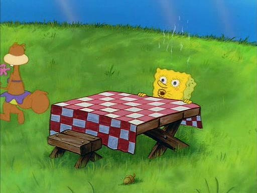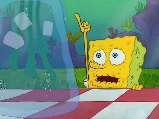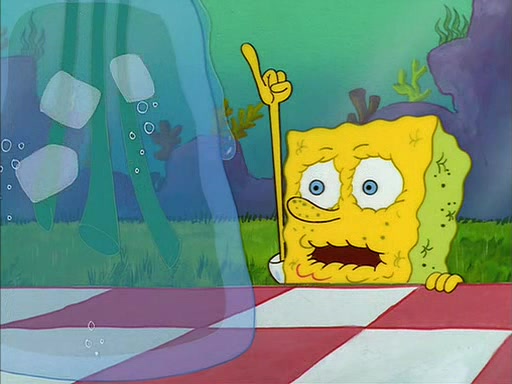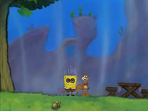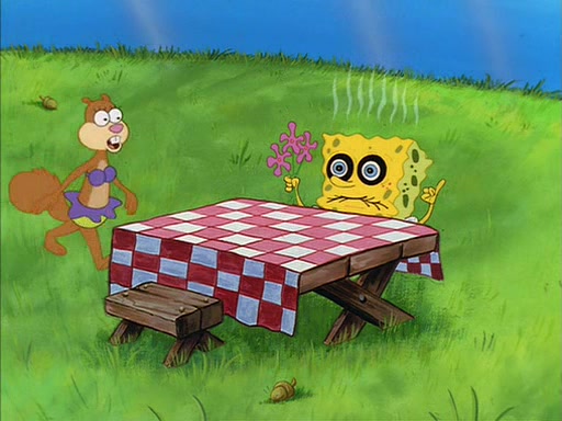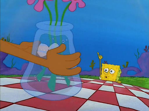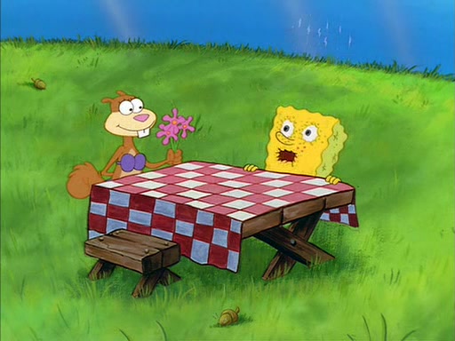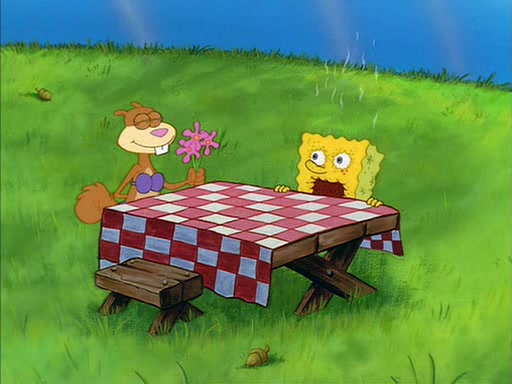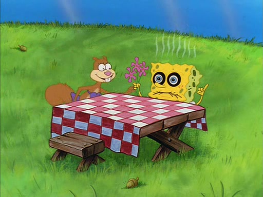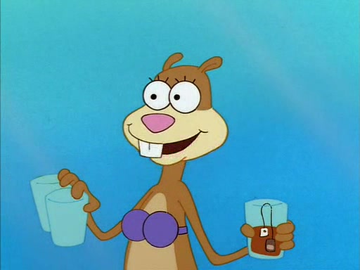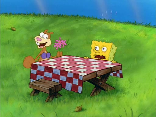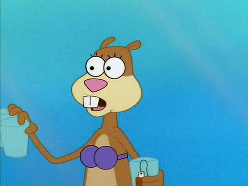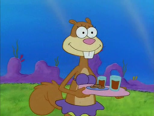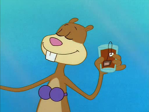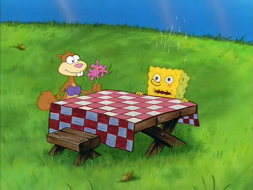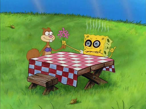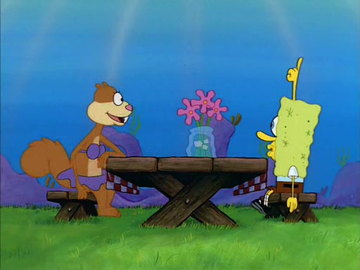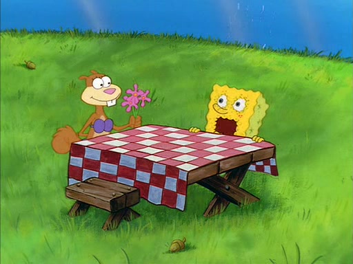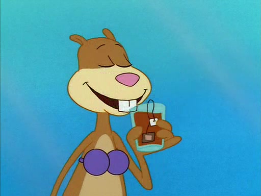 Meanwhile, Patrick, watching from outside the treedome, tells SpongeBob to keep his pinky finger up. Sandy comes back and puts the flowers in a vase, filled with ice cold water, on the picnic table. SpongeBob tries to resist drinking the water. Sandy asks him to tell her about himself, and remarks that being a "sea critter" must be fascinating. However, the oven dings and Sandy goes to get the tea and cookies.