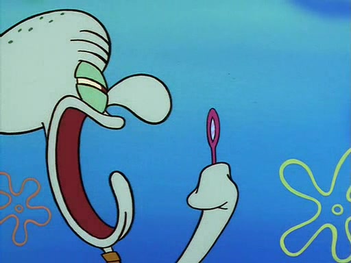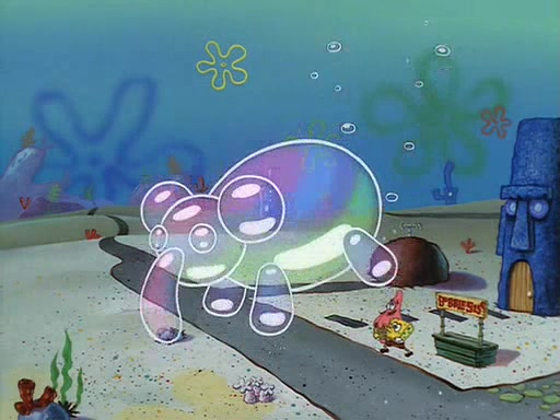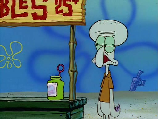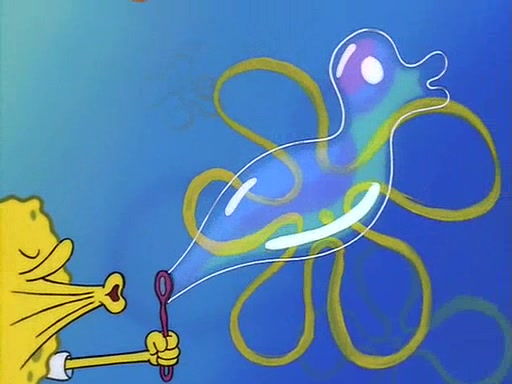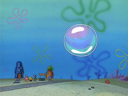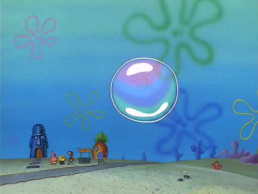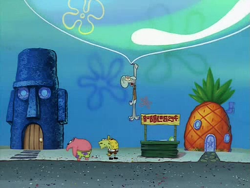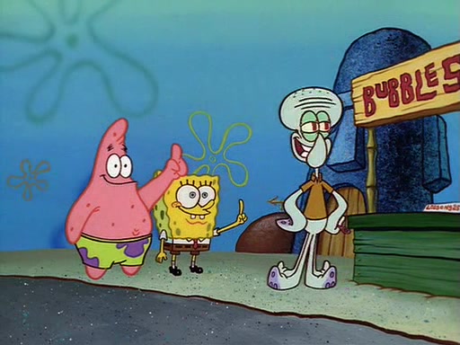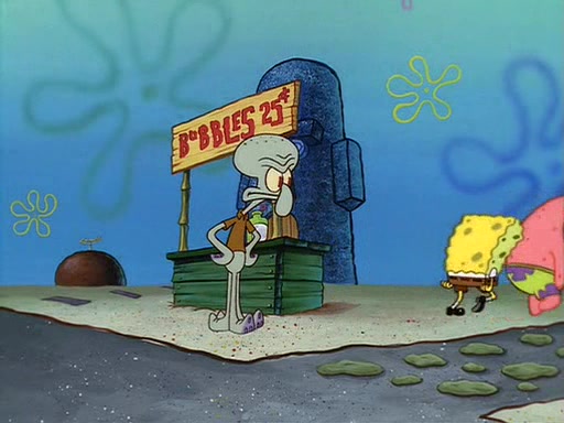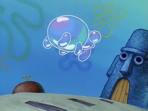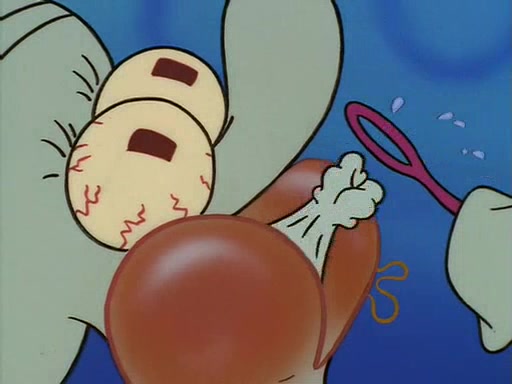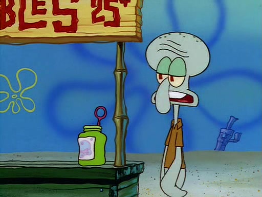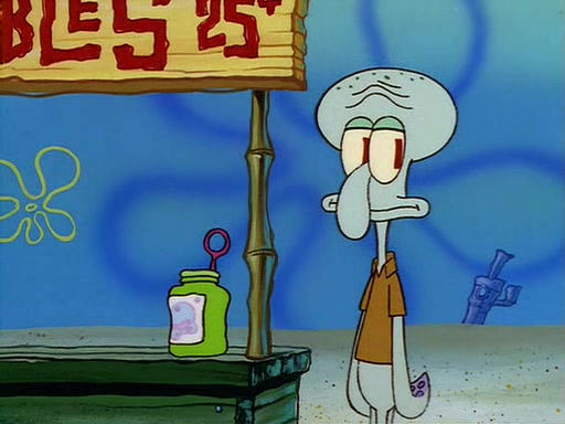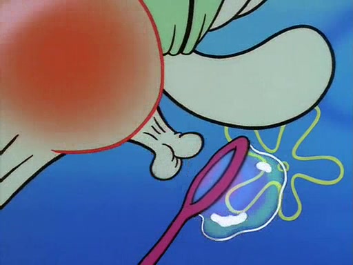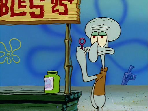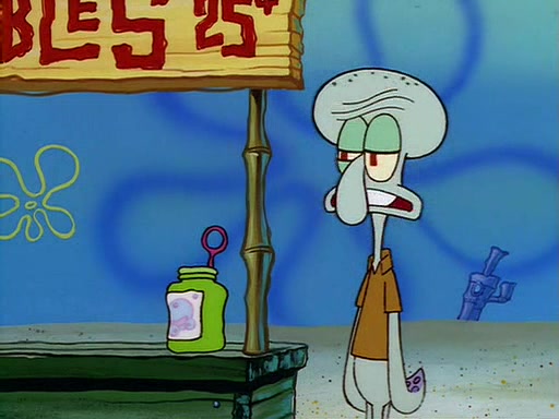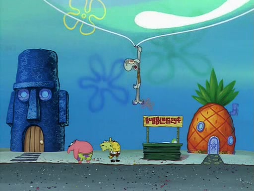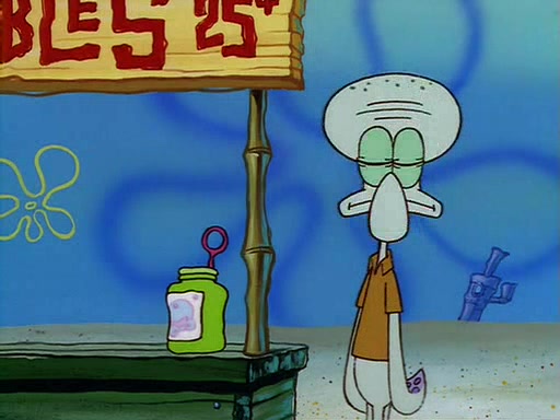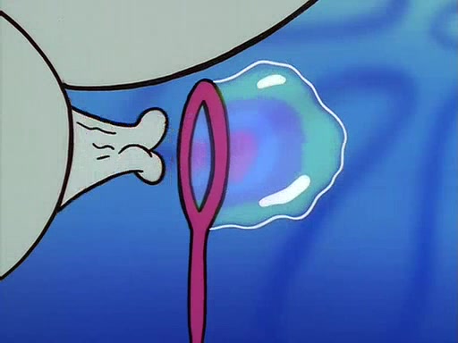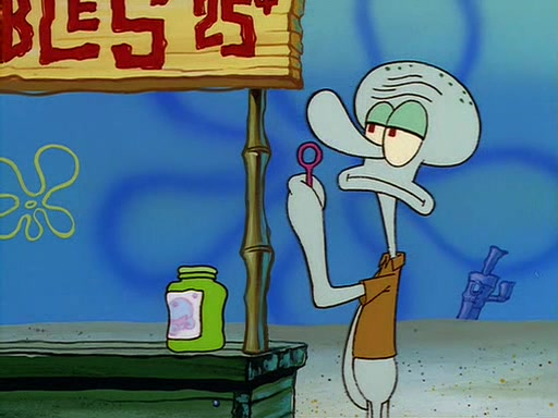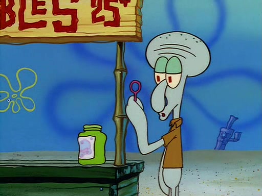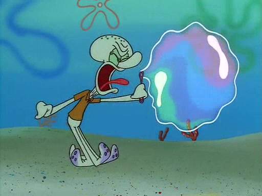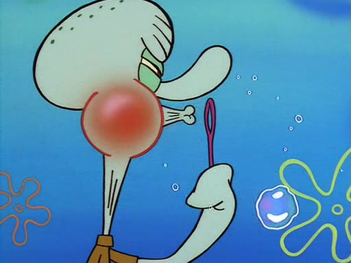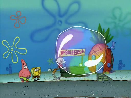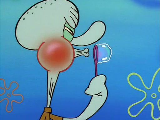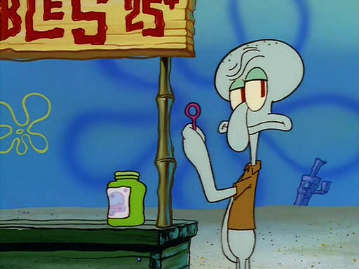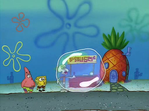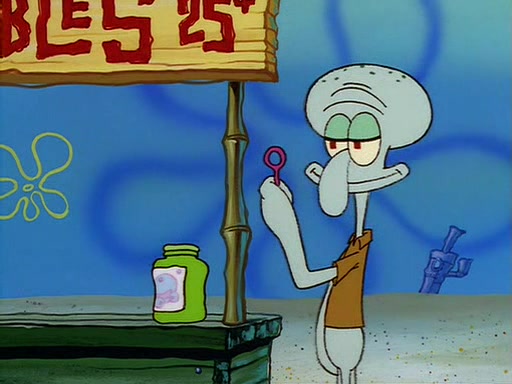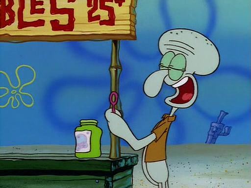 Then, after all the bubbles pop SpongeBob then uses two hands to blow a bubble elephant, Patrick calls it a "giraffe," The elephant (or giraffe) flies into Squidward's window and pops inside the house causing an explosion. Squidward, enraged, comes out and demands to know how they are just making so much noise just blowing bubbles. SpongeBob shows him the technique and blows a butterfly bubble, but Squidward angrily rejects SpongeBob's ideas and shoos SpongeBob and Patrick back into their houses in embarrassment. However, Squidward begins to blow a bubble out of curiosity, but SpongeBob and Patrick return to ask for payment. Squidward the reluctantly has to give them 25 cents for the bubble.