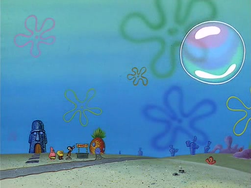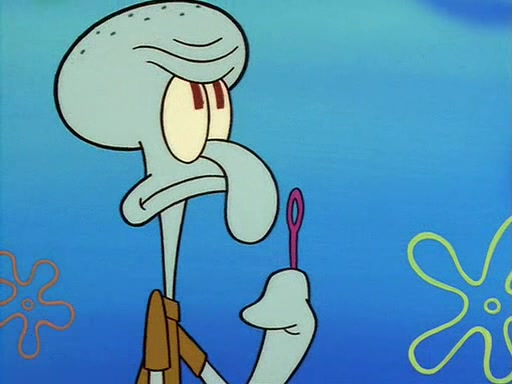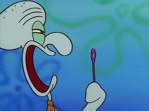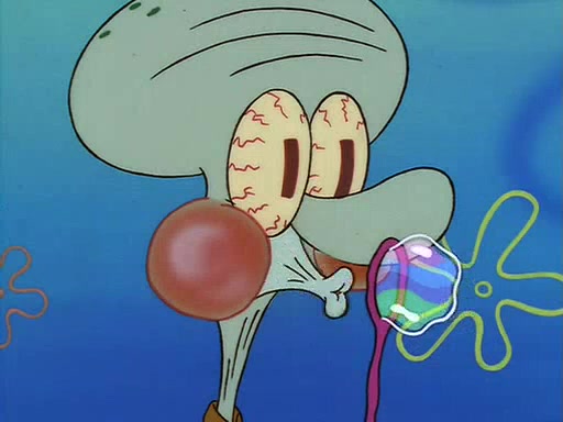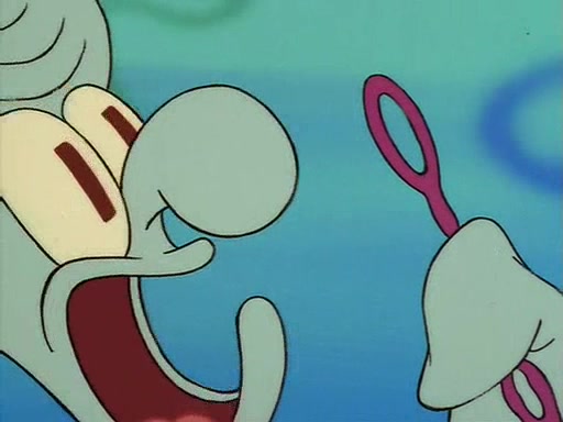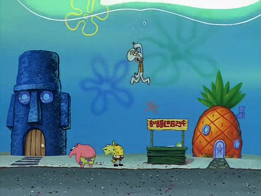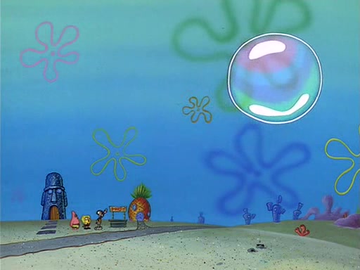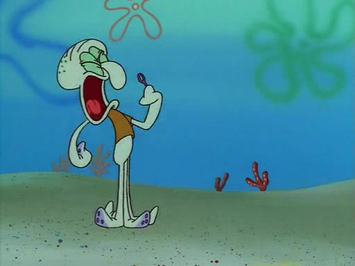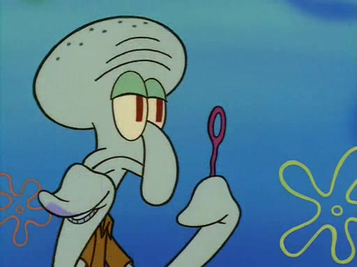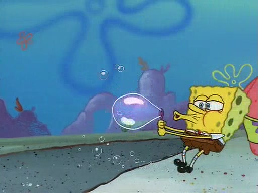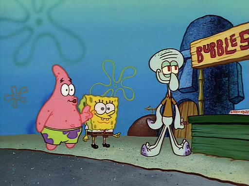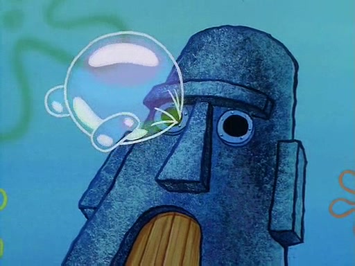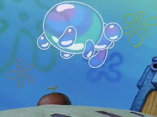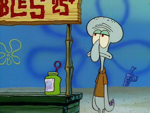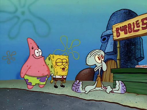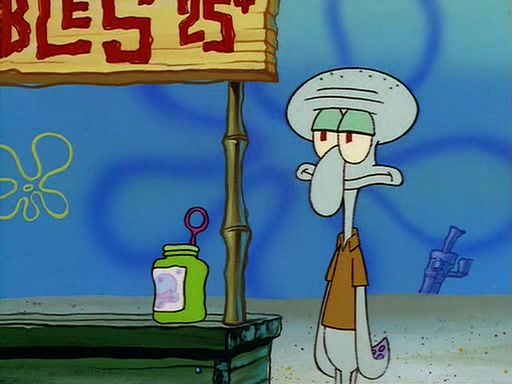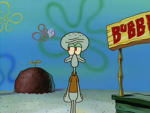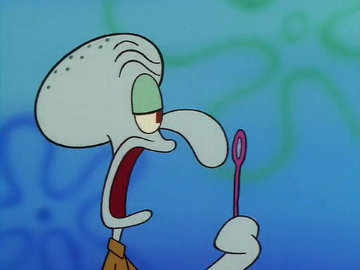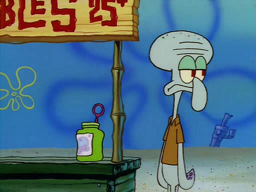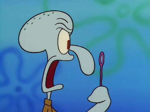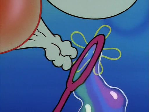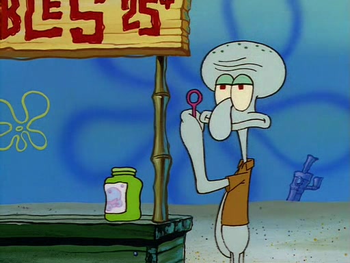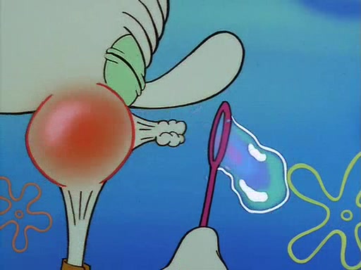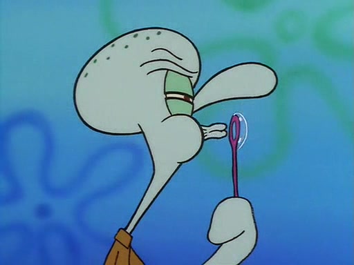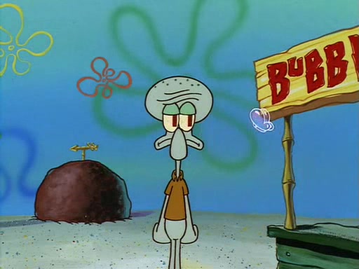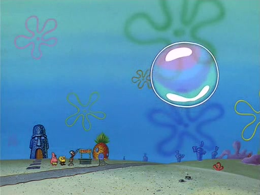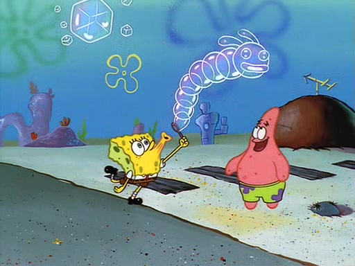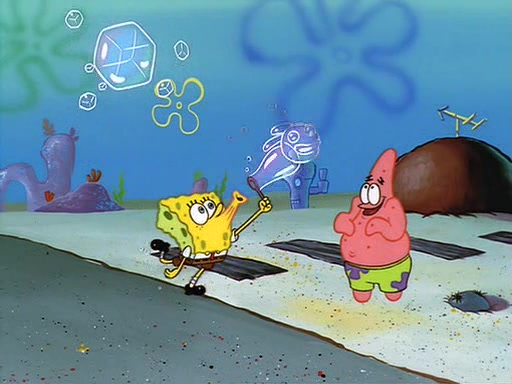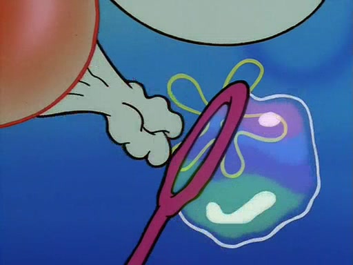 Then, after all the bubbles pop SpongeBob then uses two hands to blow a bubble elephant, Patrick calls it a "giraffe," The elephant (or giraffe) flies into Squidward's window and pops inside the house causing an explosion. Squidward, enraged, comes out and demands to know how they are just making so much noise just blowing bubbles. SpongeBob shows him the technique and blows a butterfly bubble, but Squidward angrily rejects SpongeBob's ideas and shoos SpongeBob and Patrick back into their houses in embarrassment. However, Squidward begins to blow a bubble out of curiosity, but SpongeBob and Patrick return to ask for payment. Squidward the reluctantly has to give them 25 cents for the bubble.