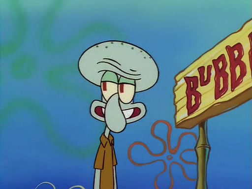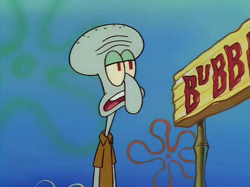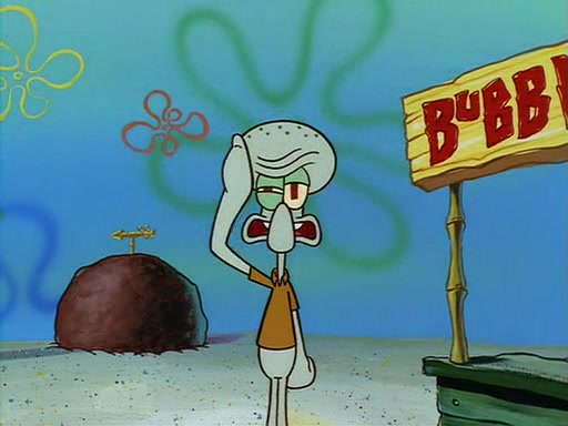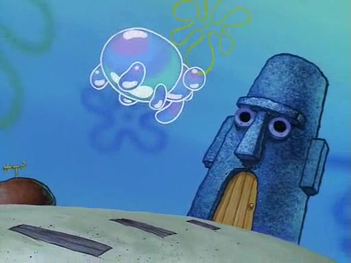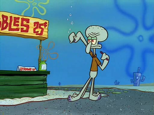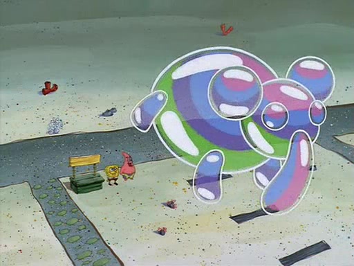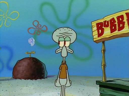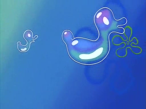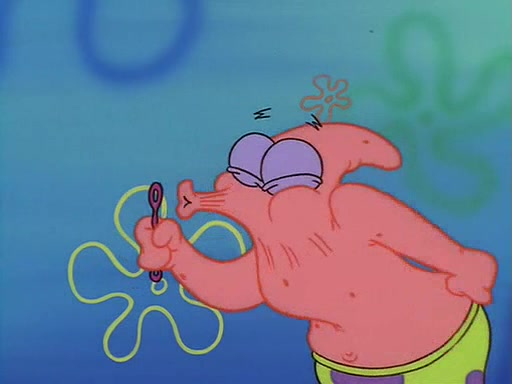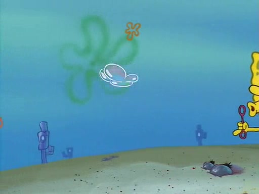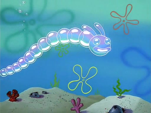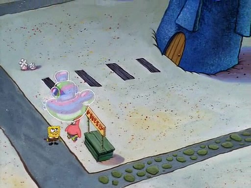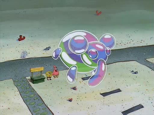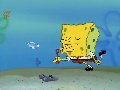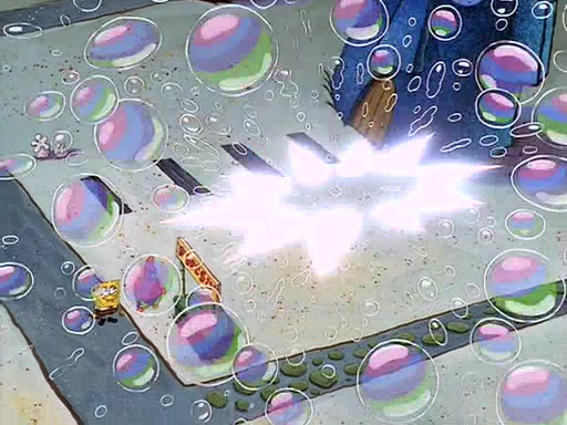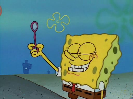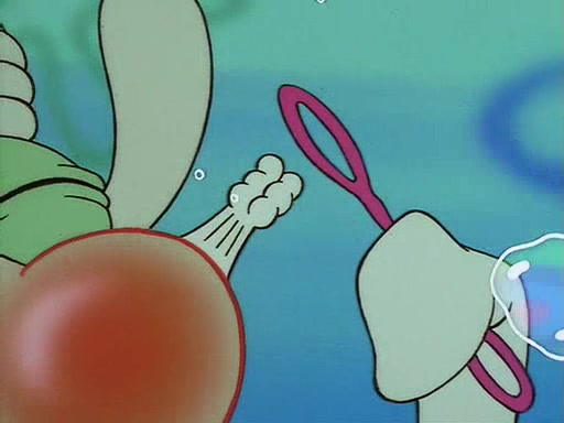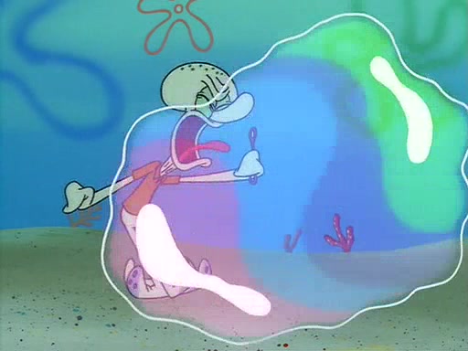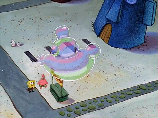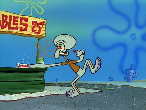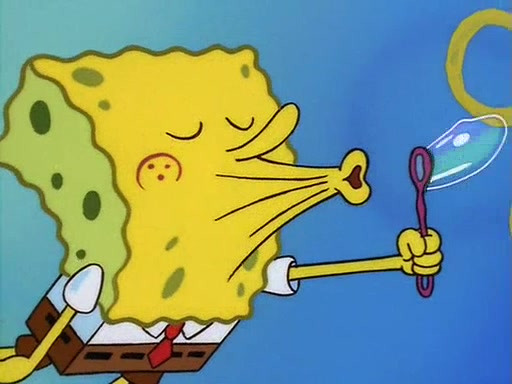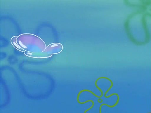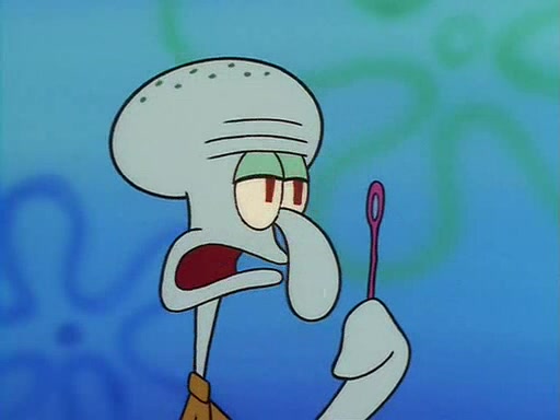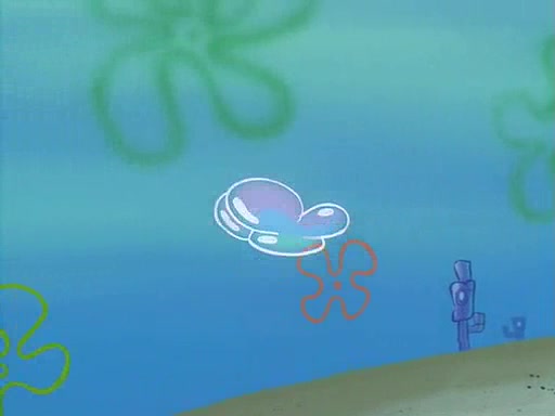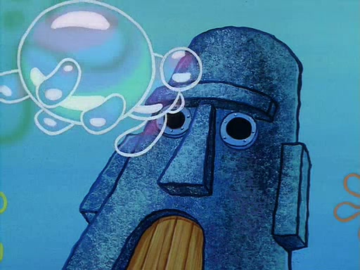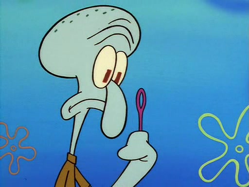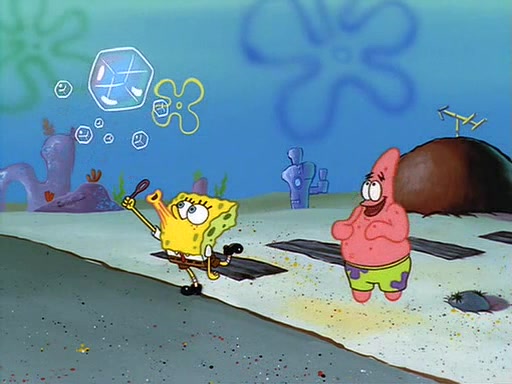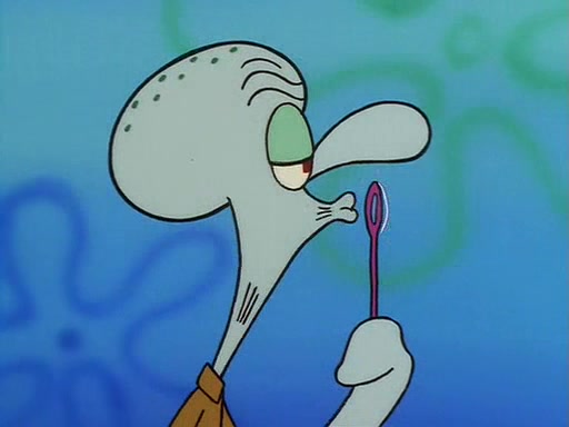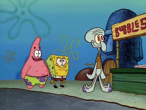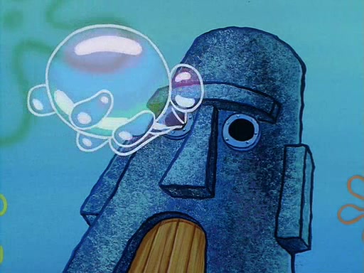Then, after all the bubbles pop SpongeBob then uses two hands to blow a bubble elephant, Patrick calls it a "giraffe," The elephant (or giraffe) flies into Squidward's window and pops inside the house causing an explosion. Squidward, enraged, comes out and demands to know how they are just making so much noise just blowing bubbles. SpongeBob shows him the technique and blows a butterfly bubble, but Squidward angrily rejects SpongeBob's ideas and shoos SpongeBob and Patrick back into their houses in embarrassment. However, Squidward begins to blow a bubble out of curiosity, but SpongeBob and Patrick return to ask for payment. Squidward the reluctantly has to give them 25 cents for the bubble.