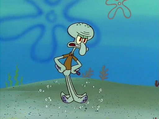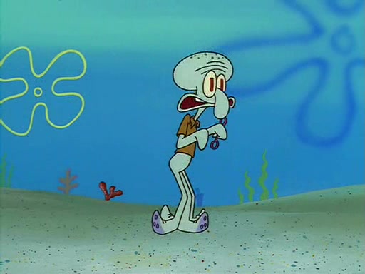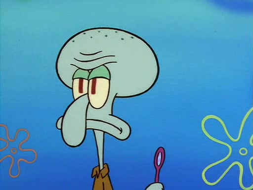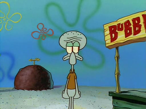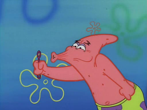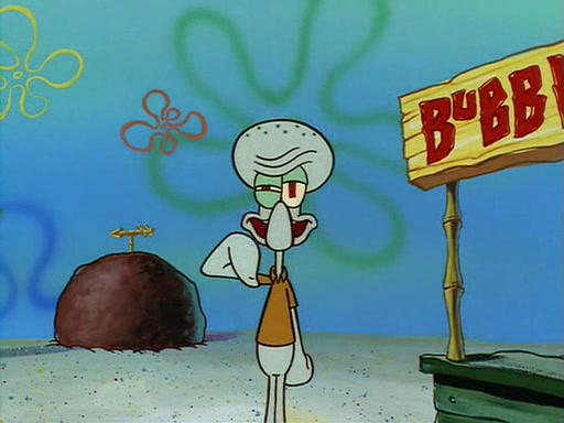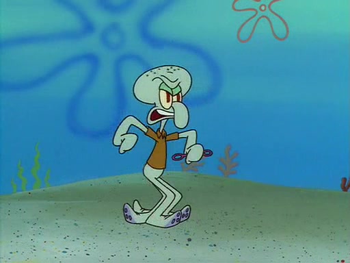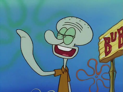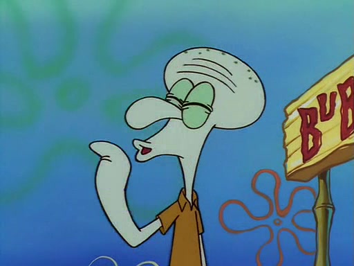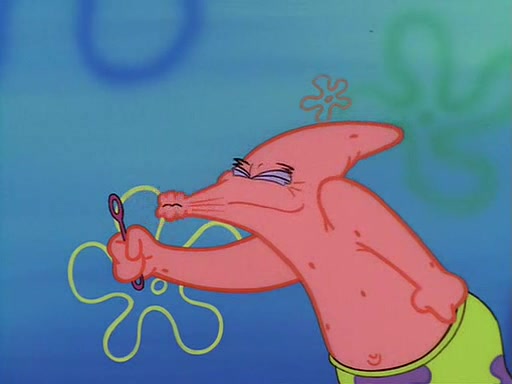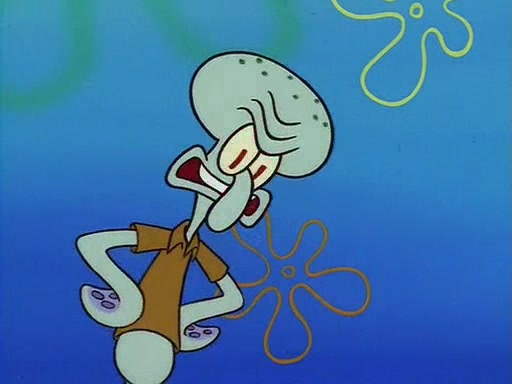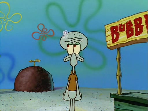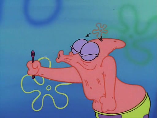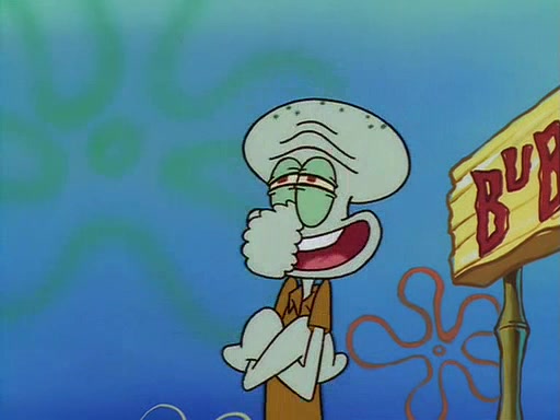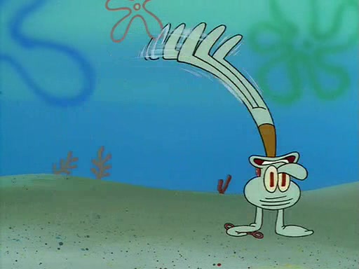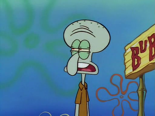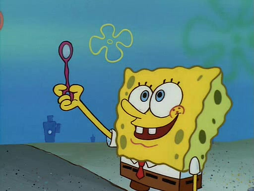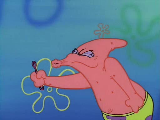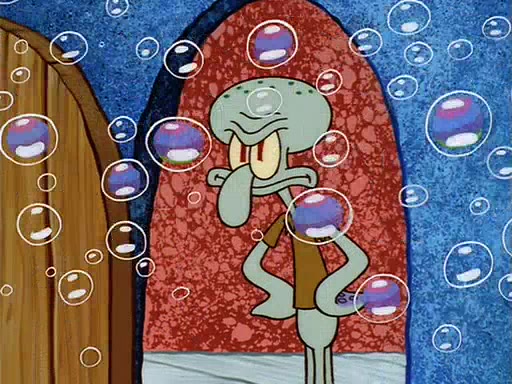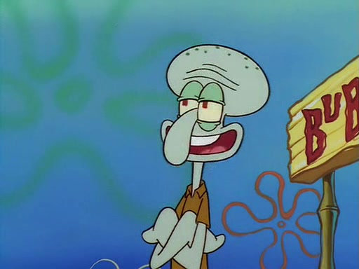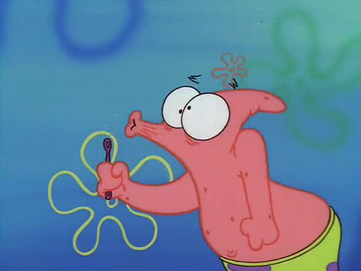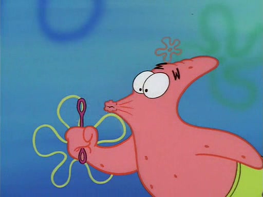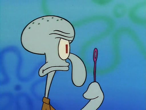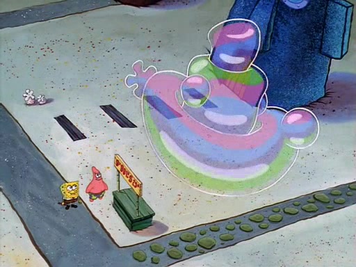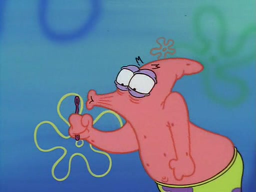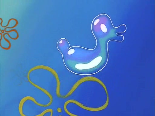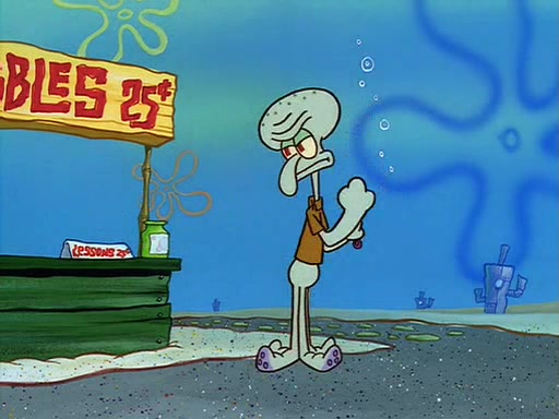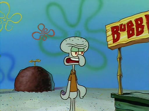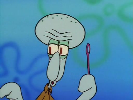 Then, after all the bubbles pop SpongeBob then uses two hands to blow a bubble elephant, Patrick calls it a "giraffe," The elephant (or giraffe) flies into Squidward's window and pops inside the house causing an explosion. Squidward, enraged, comes out and demands to know how they are just making so much noise just blowing bubbles. SpongeBob shows him the technique and blows a butterfly bubble, but Squidward angrily rejects SpongeBob's ideas and shoos SpongeBob and Patrick back into their houses in embarrassment. However, Squidward begins to blow a bubble out of curiosity, but SpongeBob and Patrick return to ask for payment. Squidward the reluctantly has to give them 25 cents for the bubble.