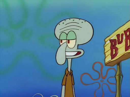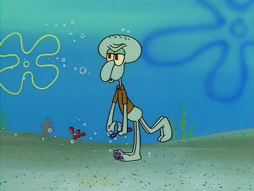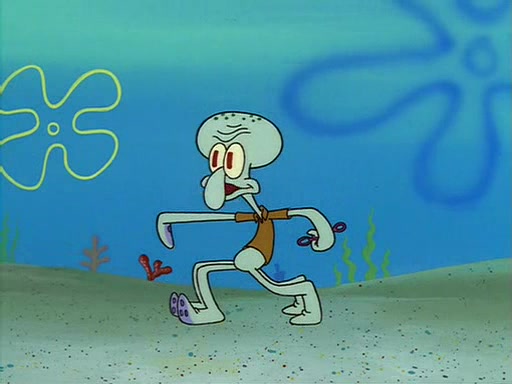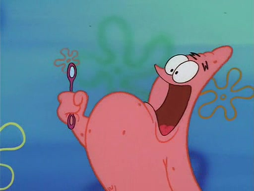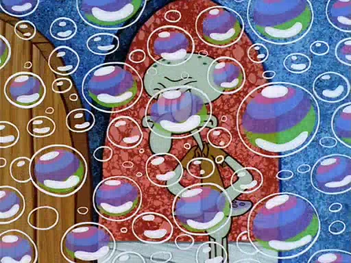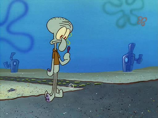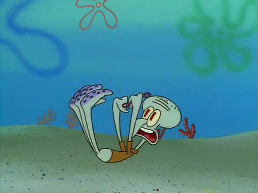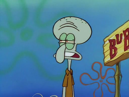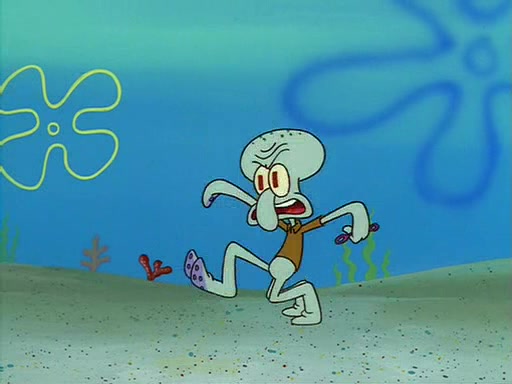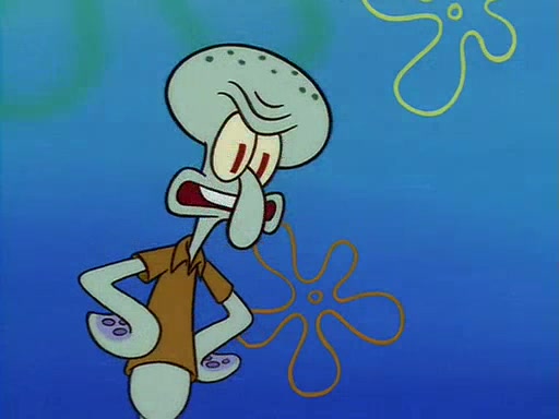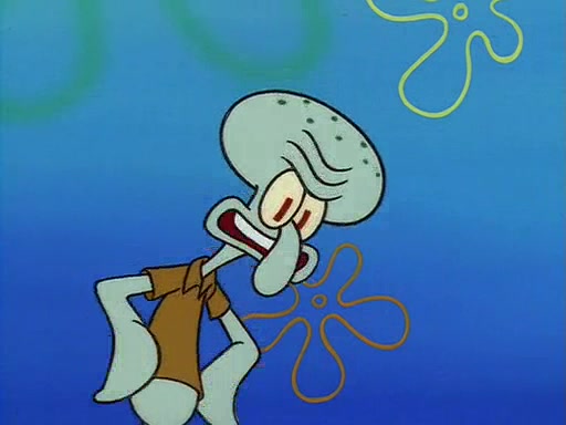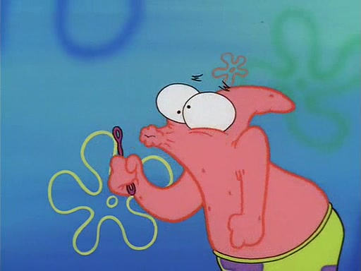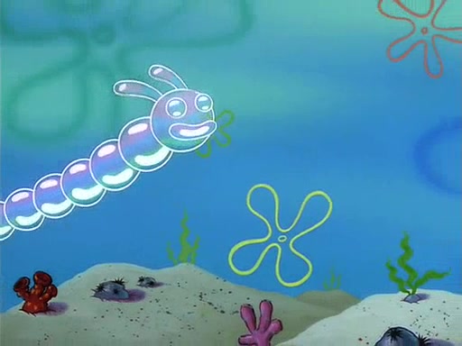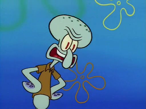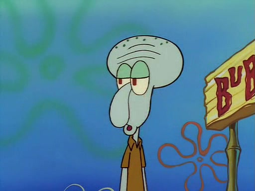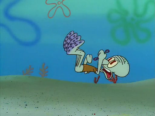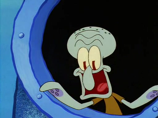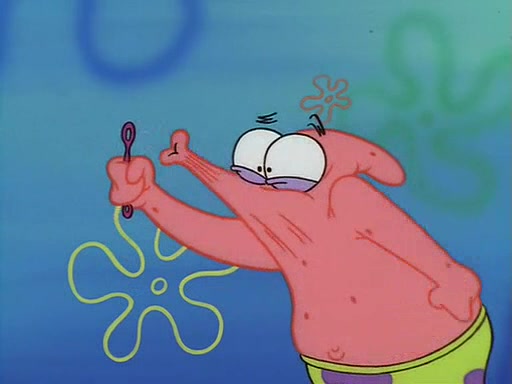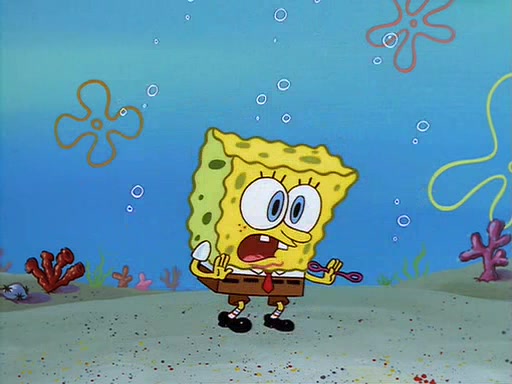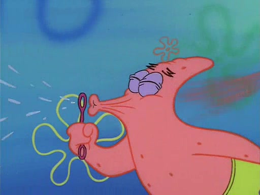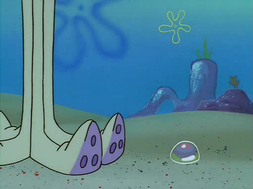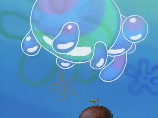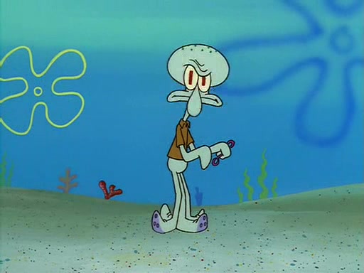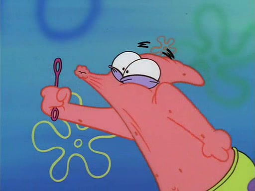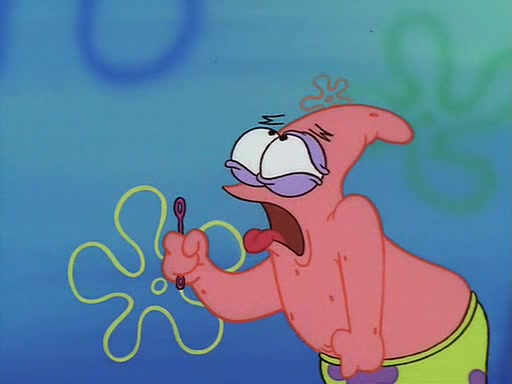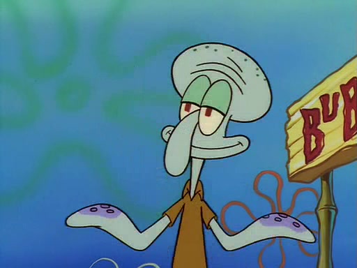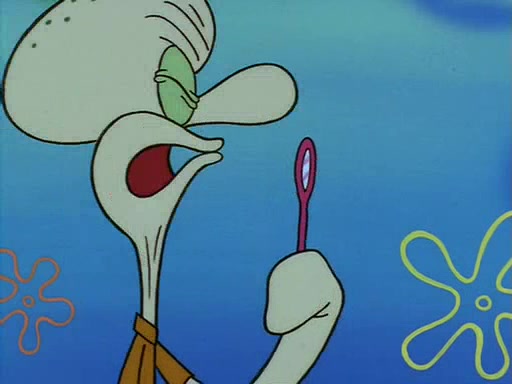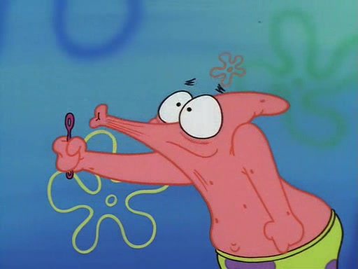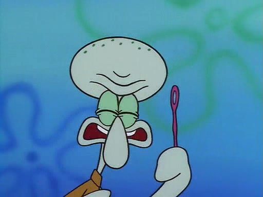 Then, after all the bubbles pop SpongeBob then uses two hands to blow a bubble elephant, Patrick calls it a "giraffe," The elephant (or giraffe) flies into Squidward's window and pops inside the house causing an explosion. Squidward, enraged, comes out and demands to know how they are just making so much noise just blowing bubbles. SpongeBob shows him the technique and blows a butterfly bubble, but Squidward angrily rejects SpongeBob's ideas and shoos SpongeBob and Patrick back into their houses in embarrassment. However, Squidward begins to blow a bubble out of curiosity, but SpongeBob and Patrick return to ask for payment. Squidward the reluctantly has to give them 25 cents for the bubble.