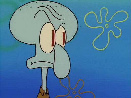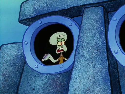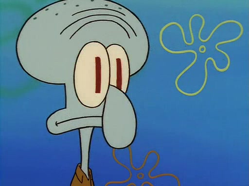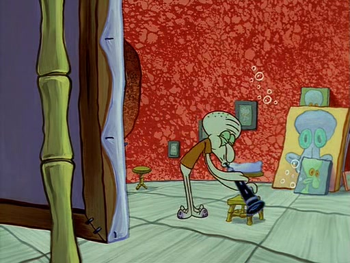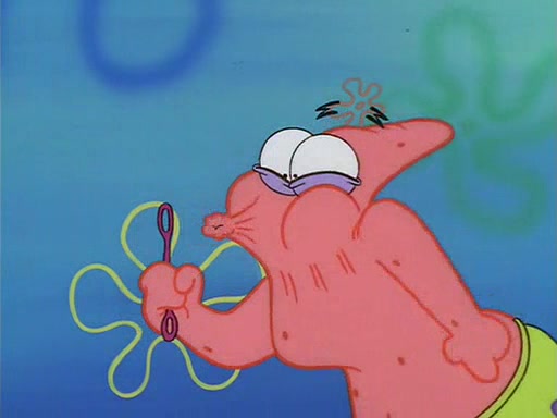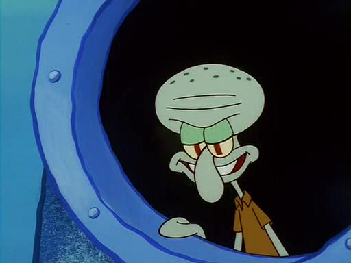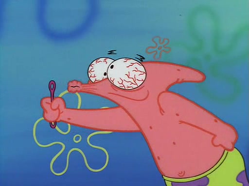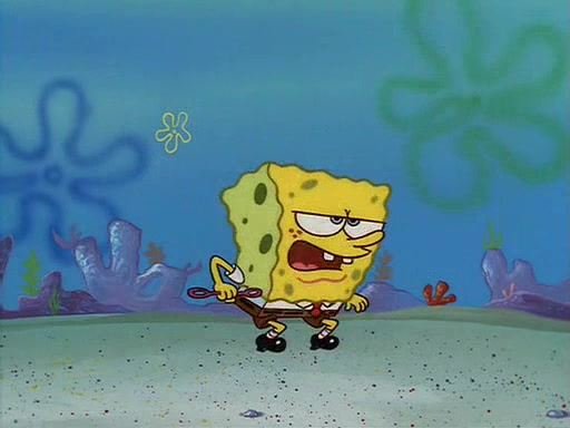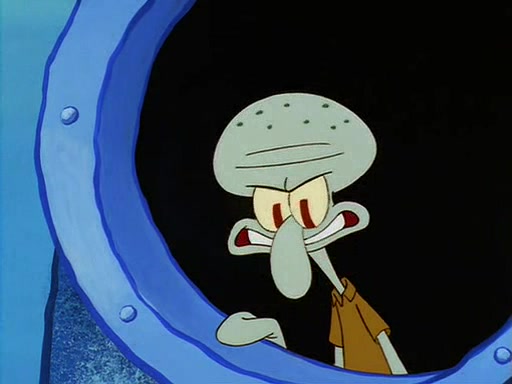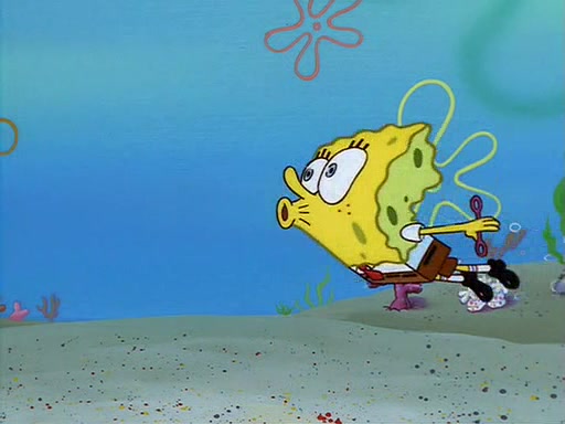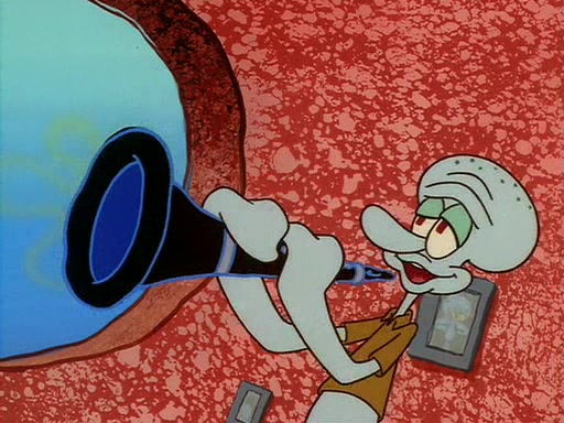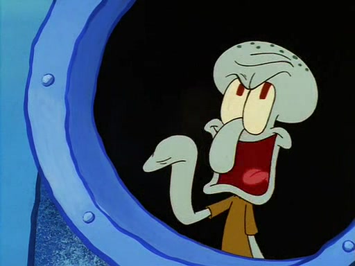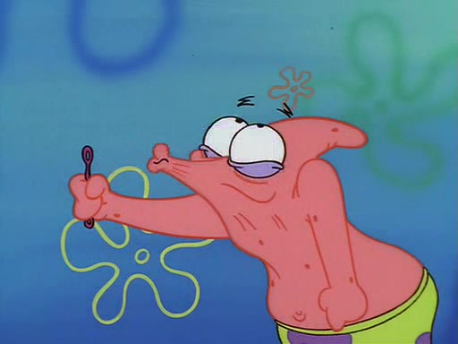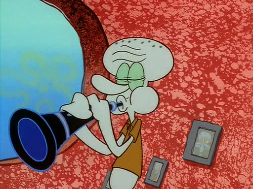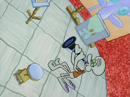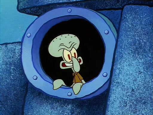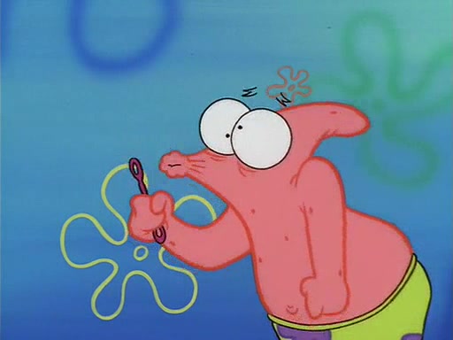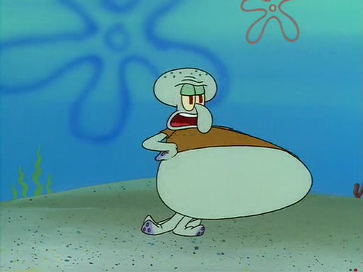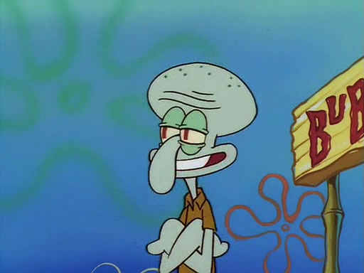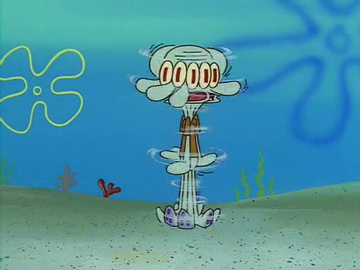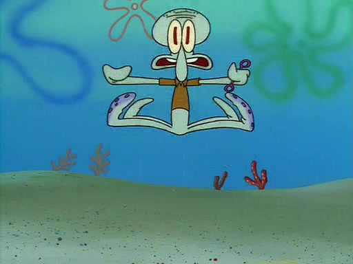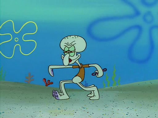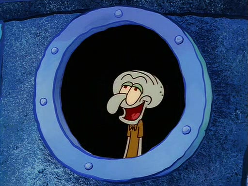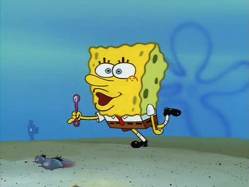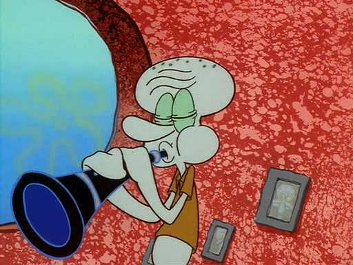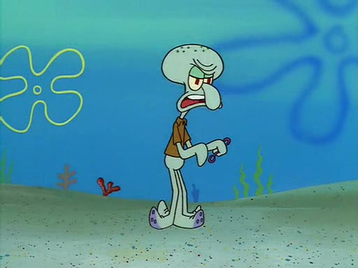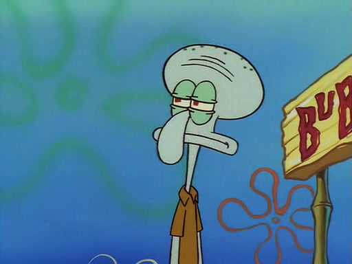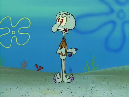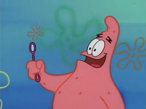 Then, after all the bubbles pop SpongeBob then uses two hands to blow a bubble elephant, Patrick calls it a "giraffe," The elephant (or giraffe) flies into Squidward's window and pops inside the house causing an explosion. Squidward, enraged, comes out and demands to know how they are just making so much noise just blowing bubbles. SpongeBob shows him the technique and blows a butterfly bubble, but Squidward angrily rejects SpongeBob's ideas and shoos SpongeBob and Patrick back into their houses in embarrassment. However, Squidward begins to blow a bubble out of curiosity, but SpongeBob and Patrick return to ask for payment. Squidward the reluctantly has to give them 25 cents for the bubble.