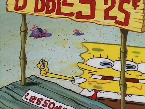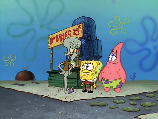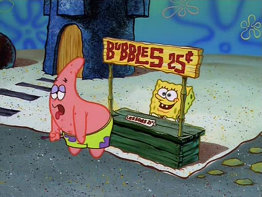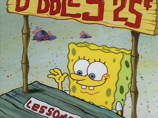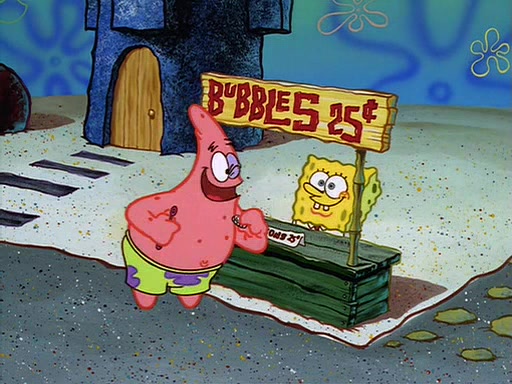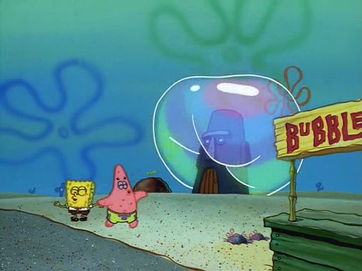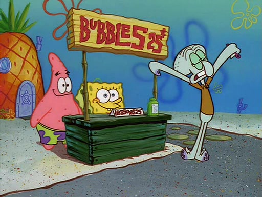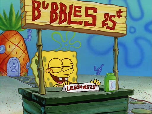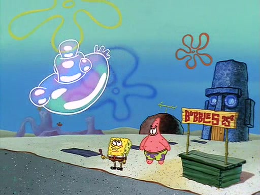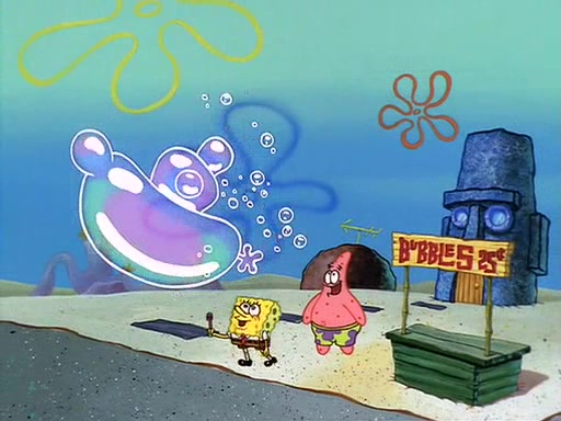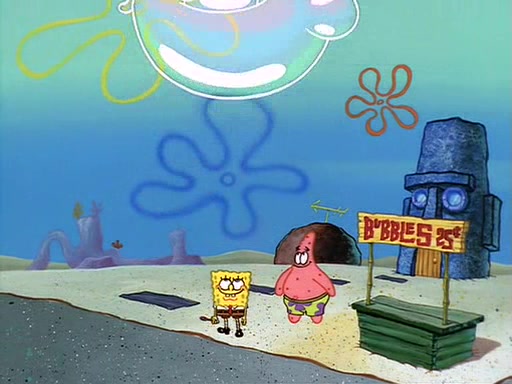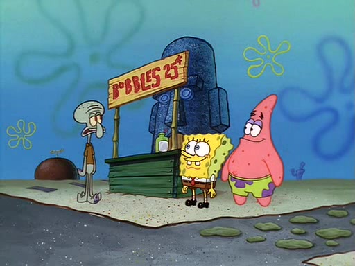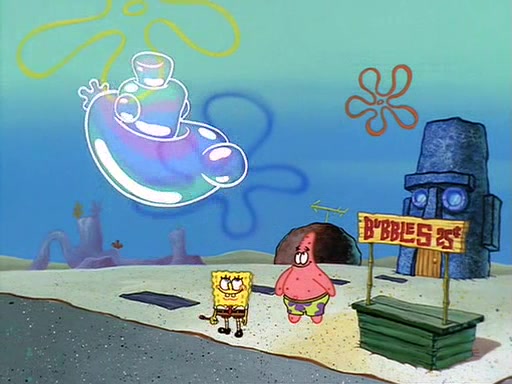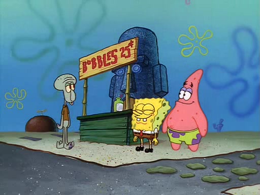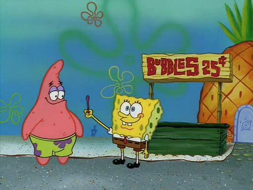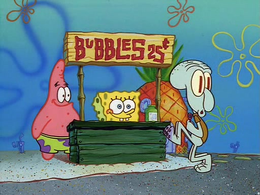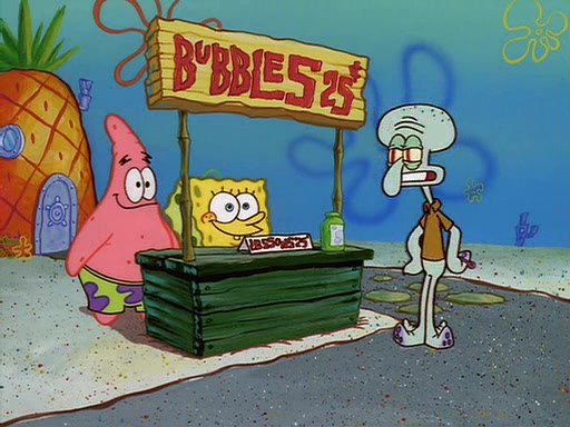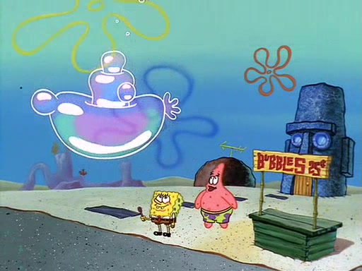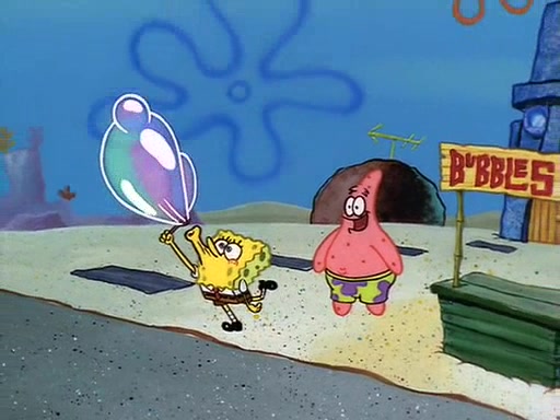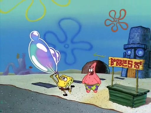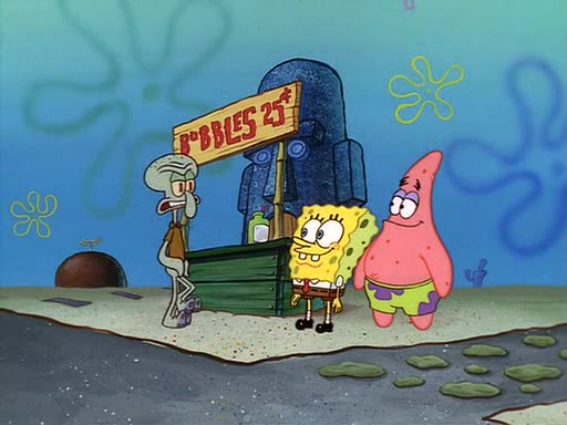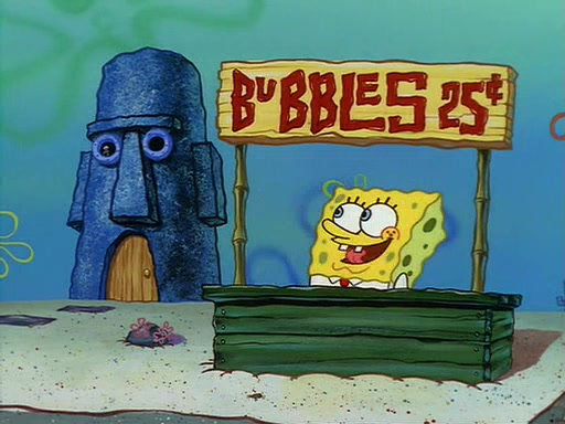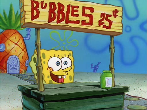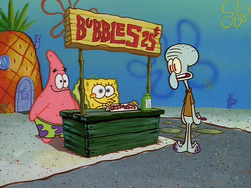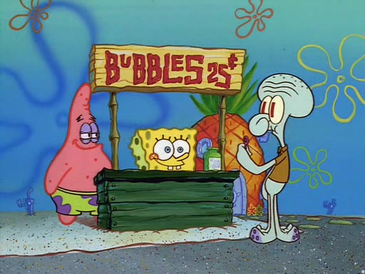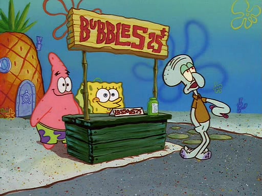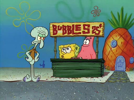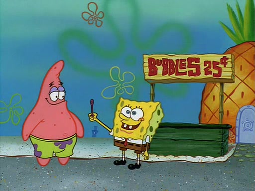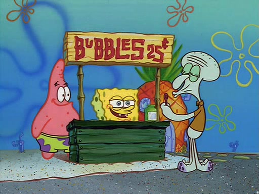 SpongeBob walks outside to breathe in the peacefulness of the neighborhood. Suddenly, he loudly begins to build a bubblestand, much to the dismay and annoyance of Squidward. At the stand, SpongeBob offers to teach how to blow bubbles for twenty-five cents. The noise disturbs Squidward, who demands SpongeBob to be quiet. Patrick comes out, comes to the stand, and asks to try it out. Patrick only buzzes his lips instead of blowing, failing to blow a bubble. SpongeBob offers to teach him for an extra quarter. SpongeBob shows how he blows bubbles with a peculiarly entertaining, yet somewhat peculiar, technique. When he shows Patrick, SpongeBob blows a duck bubble, an ice cube bubble, a caterpillar bubble, and a boat bubble.