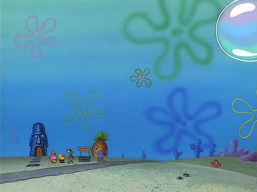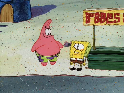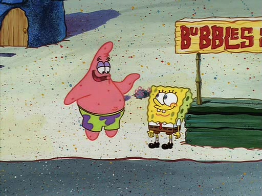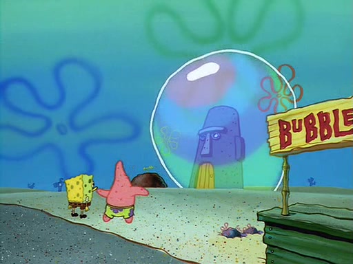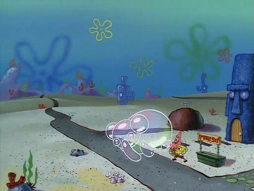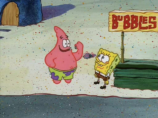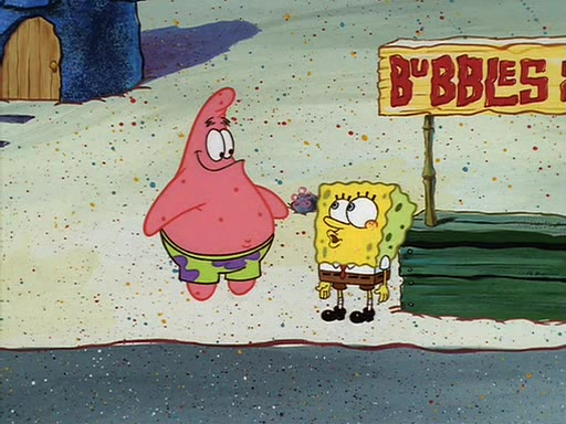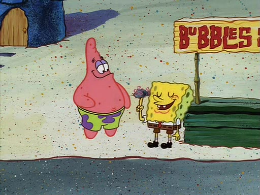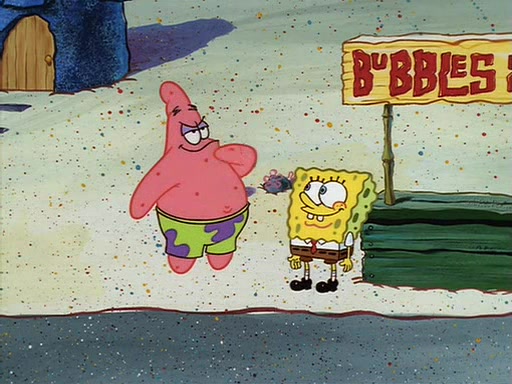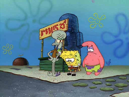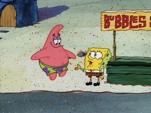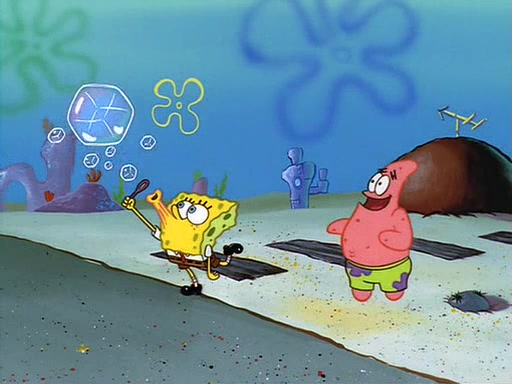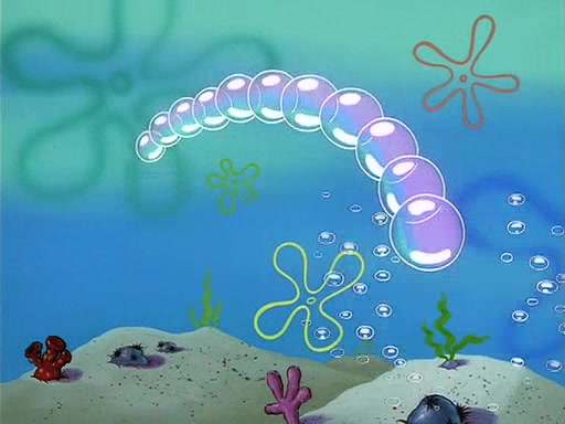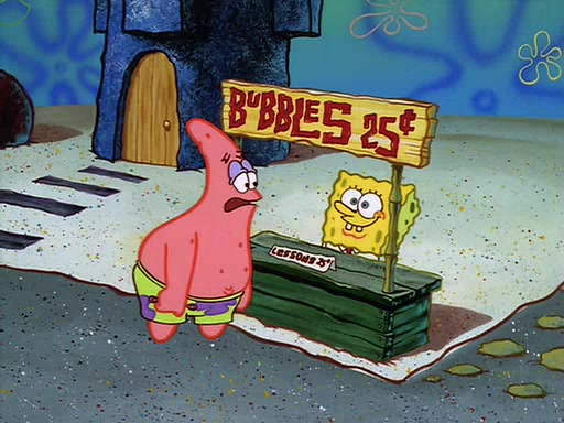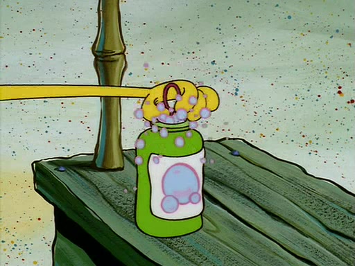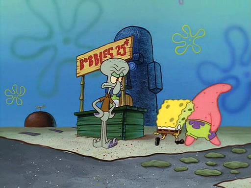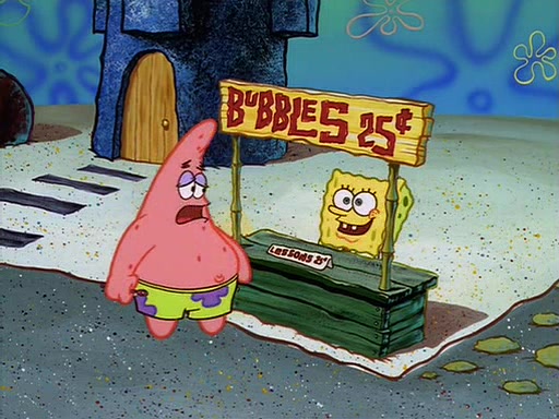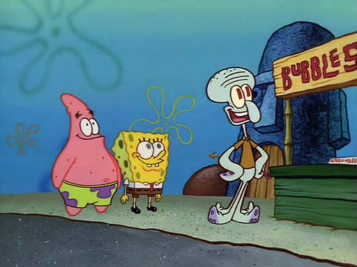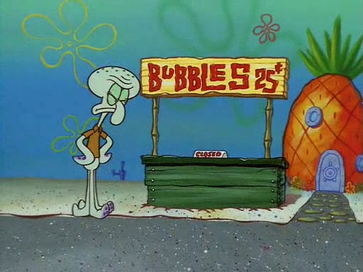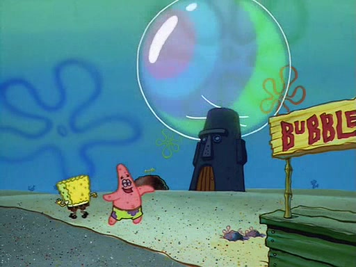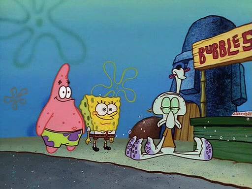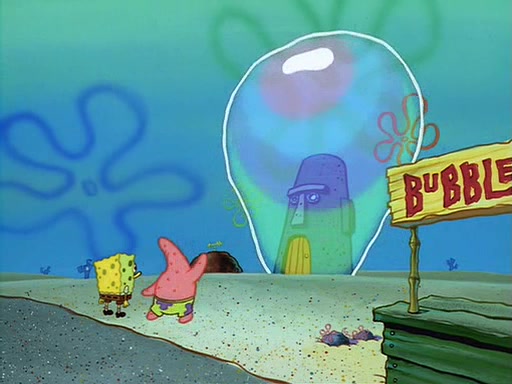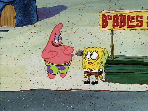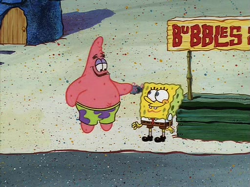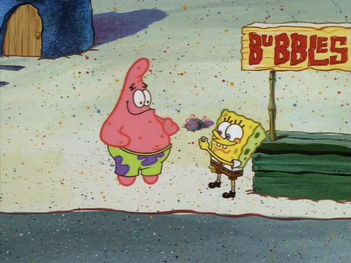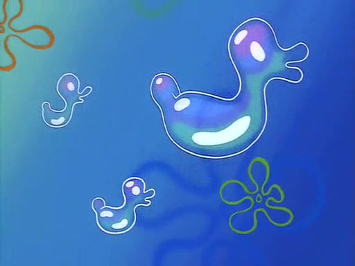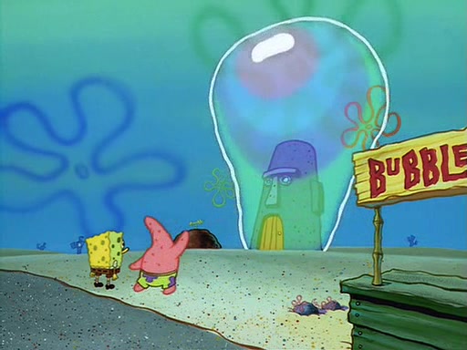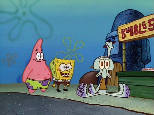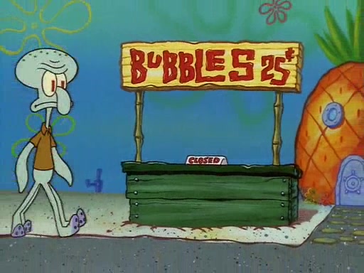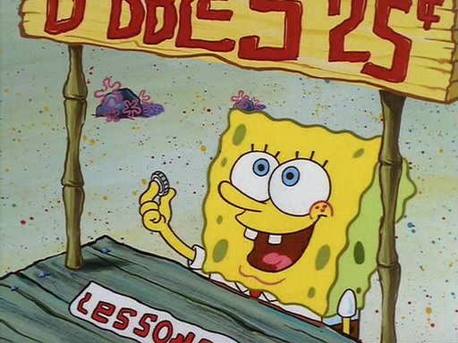 SpongeBob walks outside to breathe in the peacefulness of the neighborhood. Suddenly, he loudly begins to build a bubblestand, much to the dismay and annoyance of Squidward. At the stand, SpongeBob offers to teach how to blow bubbles for twenty-five cents. The noise disturbs Squidward, who demands SpongeBob to be quiet. Patrick comes out, comes to the stand, and asks to try it out. Patrick only buzzes his lips instead of blowing, failing to blow a bubble. SpongeBob offers to teach him for an extra quarter. SpongeBob shows how he blows bubbles with a peculiarly entertaining, yet somewhat peculiar, technique. When he shows Patrick, SpongeBob blows a duck bubble, an ice cube bubble, a caterpillar bubble, and a boat bubble.