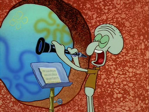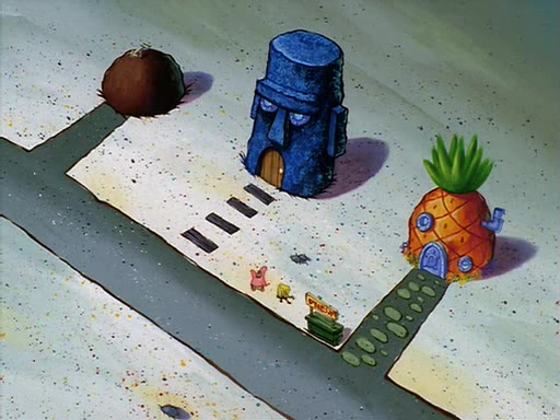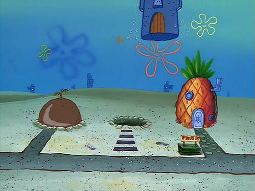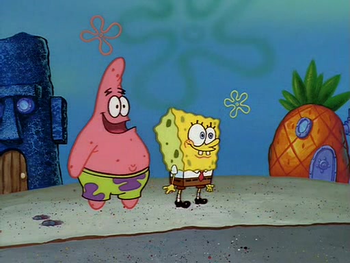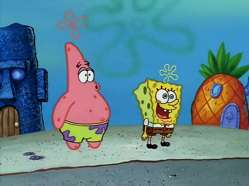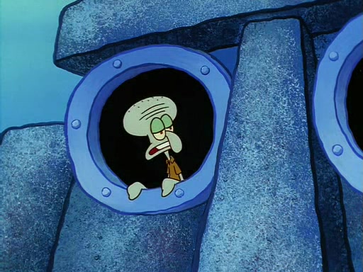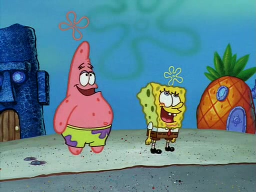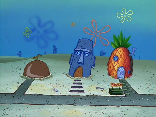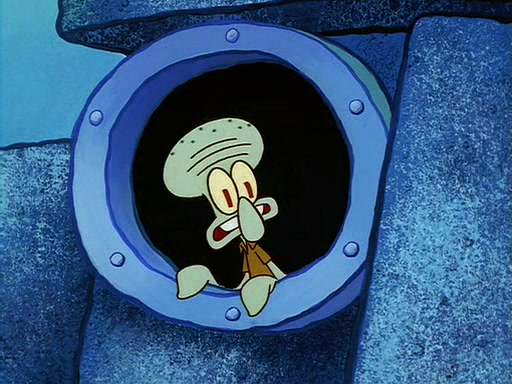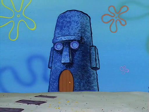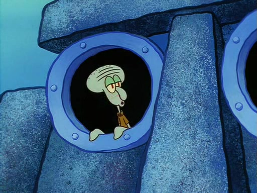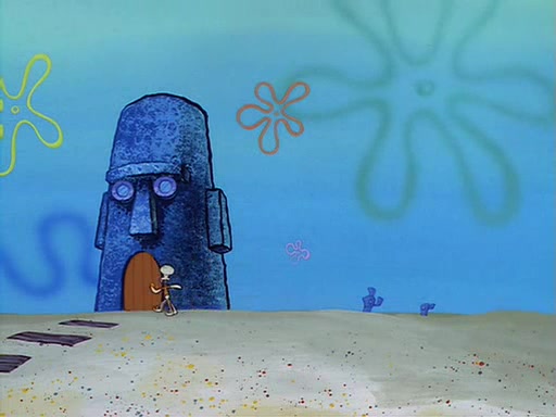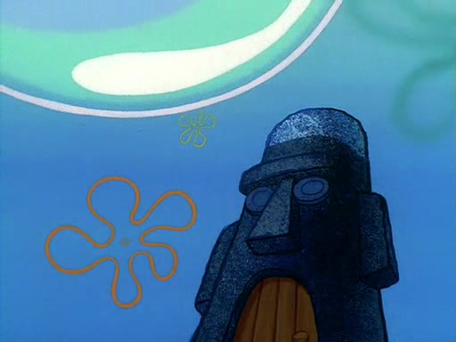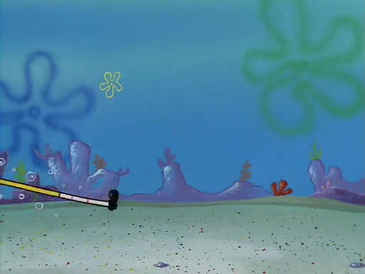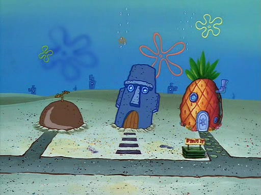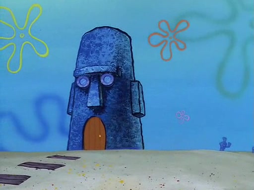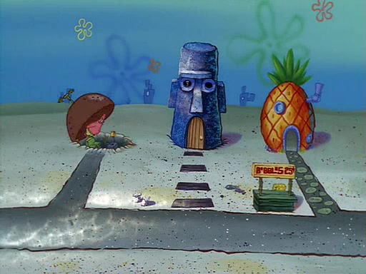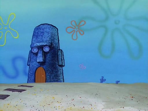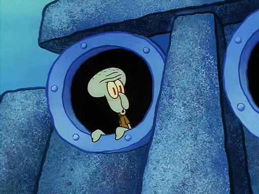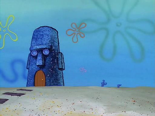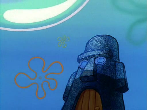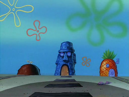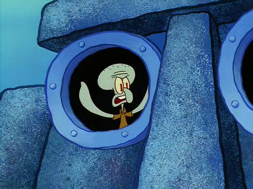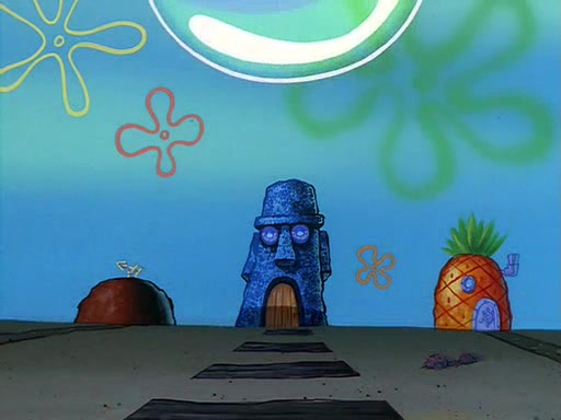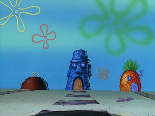 SpongeBob and Patrick try to warn Squidward, but Squidward thinks they're still chanting him and keeps playing, thinking he is "amazing." When he looks outside, he sees himself way way above the ground with SpongeBob and Patrick specks on the ground. The bubble then pops, which then shakes the ground, sending his house back to its original area, albeit with much force. SpongeBob and Patrick look at each other nervously and they retreat to their houses before Squidward can scold them.