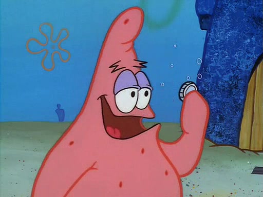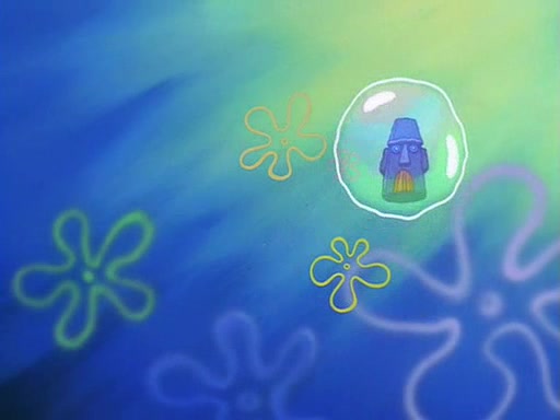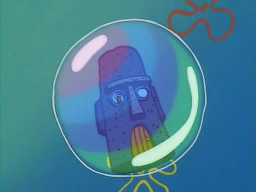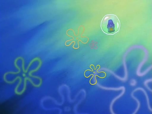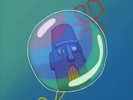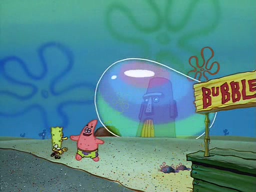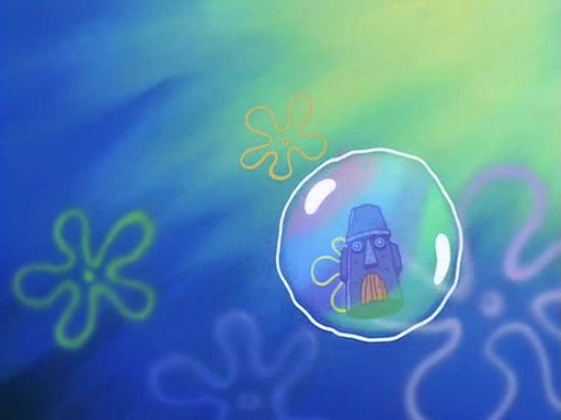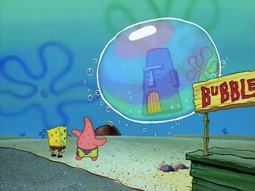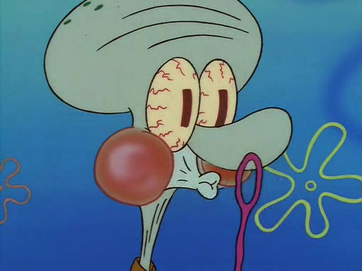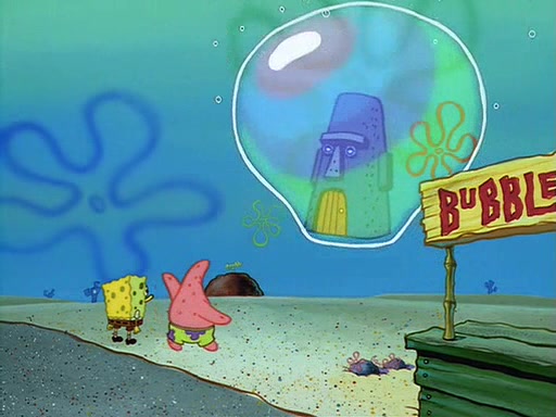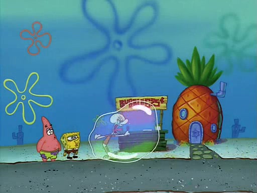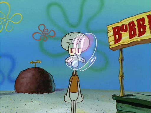Squidward attempts to impress the two with his technique, but instead fails, with each bubble falling to the ground. While Squidward still attempts to blow a satisfactory bubble (and, as a result, spends more money with each bubble he blows), SpongeBob and Patrick try to convince Squidward to use the technique. Finally, Squidward, furiously (though without realizing it) copies their technique in an attempt to mock them. However, he blows an enormous bubble by screaming in anger. SpongeBob and Patrick then congratulate Squidward, saying that he is "amazing," and that his bubble was the best. Squidward thanks them sarcastically and leaves, walking back into his house. He begins to play his clarinet, with SpongeBob and Patrick chanting his name. However, the gigantic bubble floats and traps Squidward's house inside it, unearthing it, and sending it up in the air.