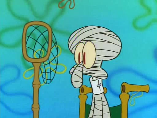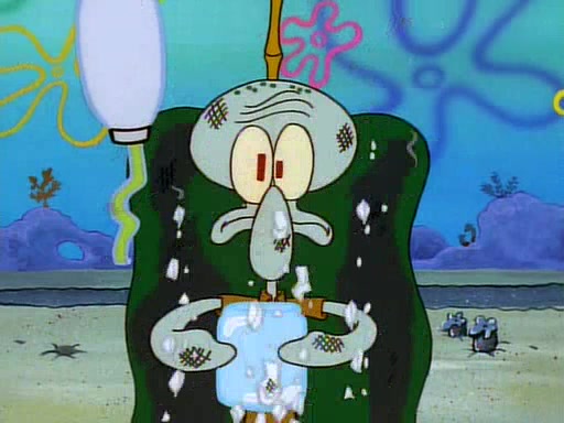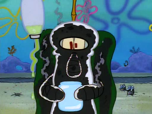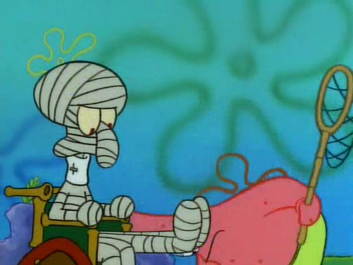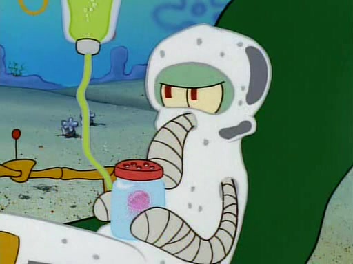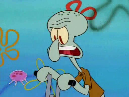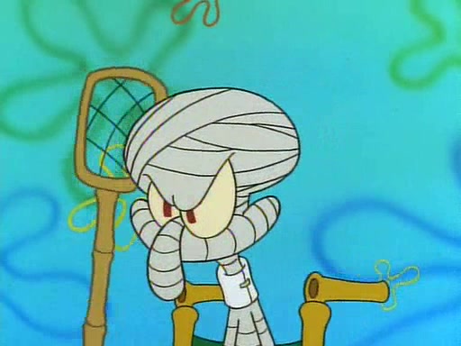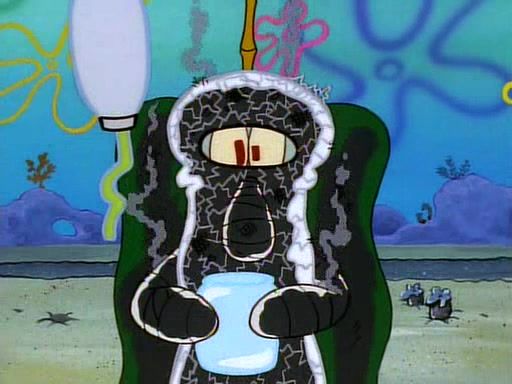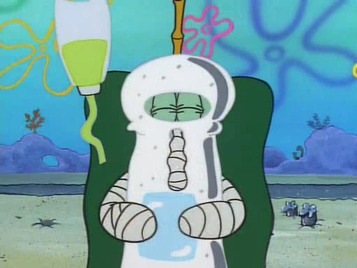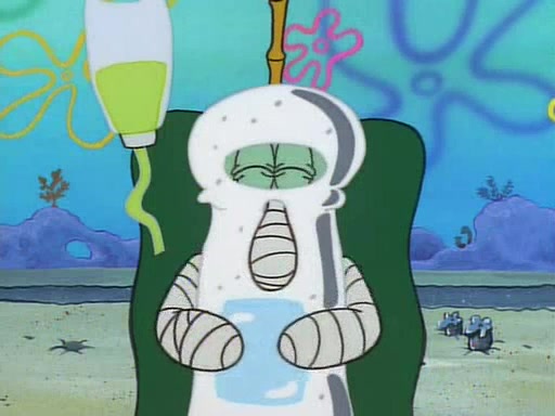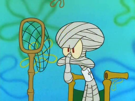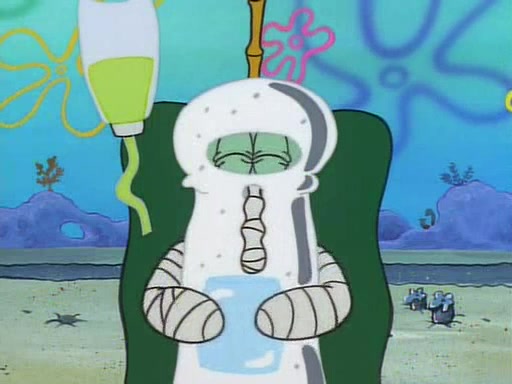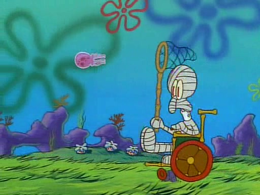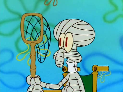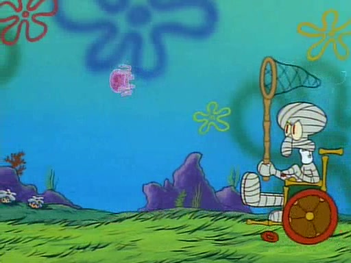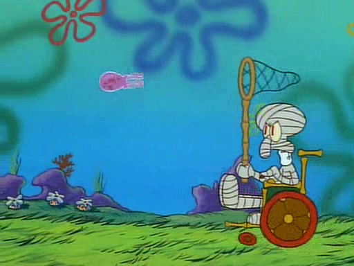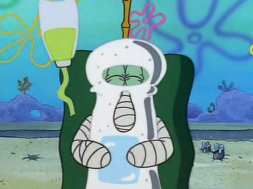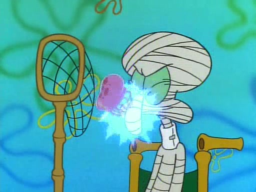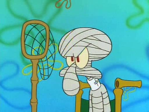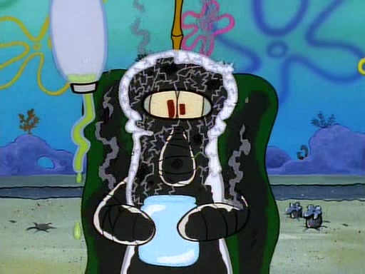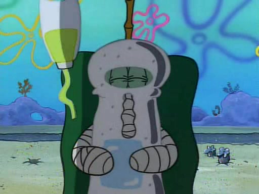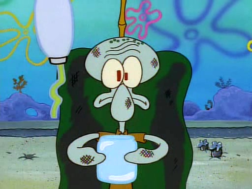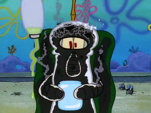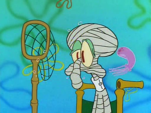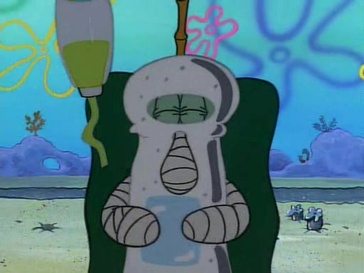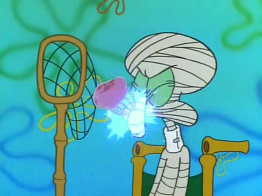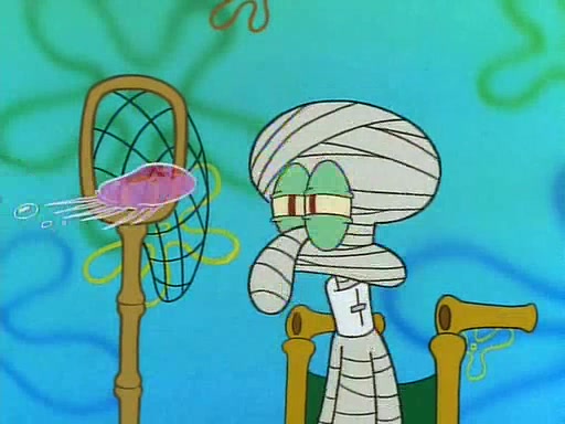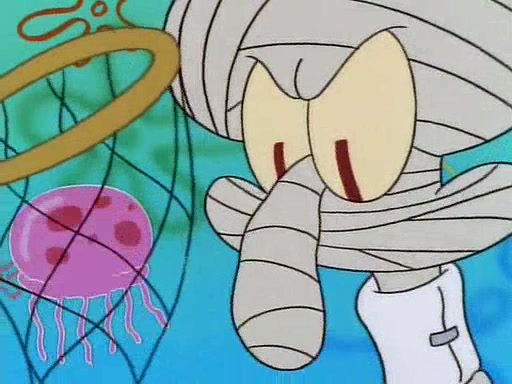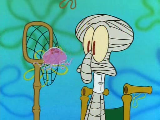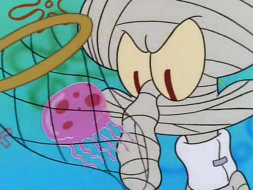 He is not into it at first, but when a jellyfish stings him, he goes after it for revenge. He manages to catch the jellyfish, and bangs his net triumphantly against a pink mass, but in doing so angers a queen jellyfish, who was the aforementioned pink mass. The queen jellyfish chases after him, attacking him with an extremely massive sting. The next day, SpongeBob and Patrick meet outside Squidward's house, and attempt to give a now life-support-bound Squidward the jellyfish that he caught the previous day. SpongeBob wonders if Squidward is still mad, and Squidward, who is still mad, according to Patrick and based on his actions, opens the jar and lets the jellyfish attack SpongeBob and Patrick, but not before the Jellyfish summons the Queen Jellyfish. As Squidward laughs, the Queen Jellyfish finds him and stings him, destroying his life-support. A completely blackened Squidward can only say, "Ow."