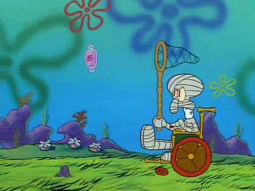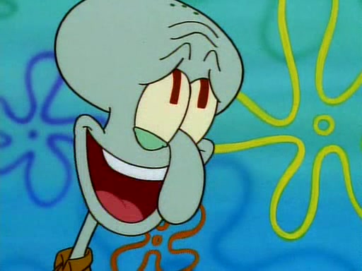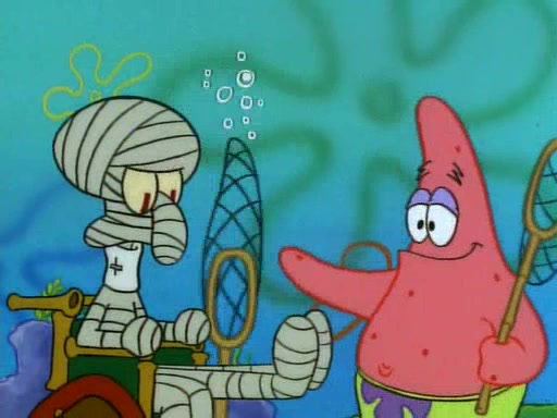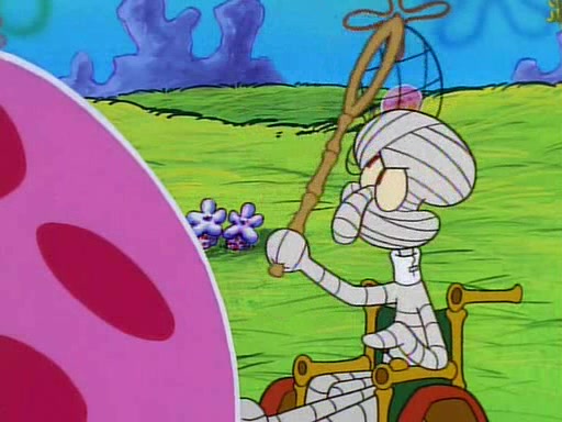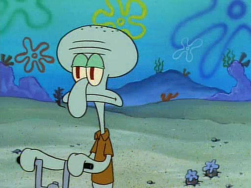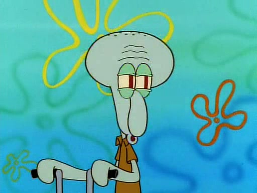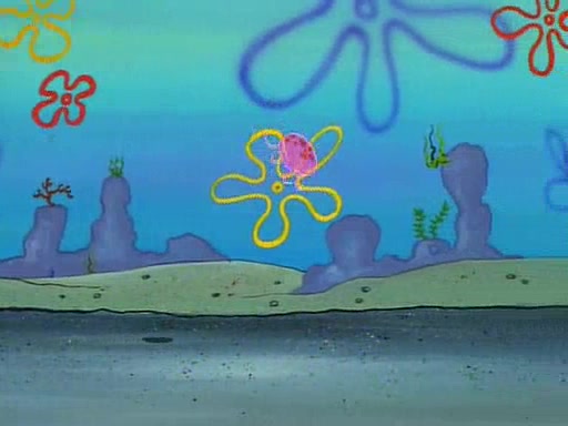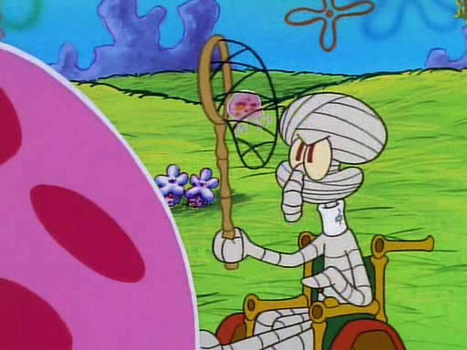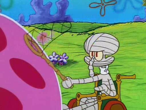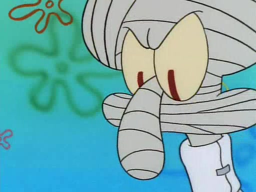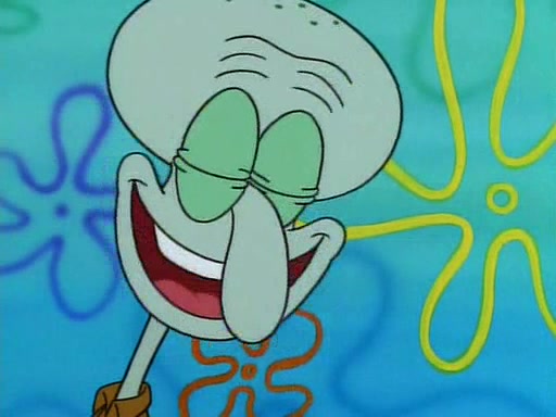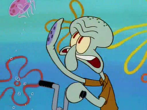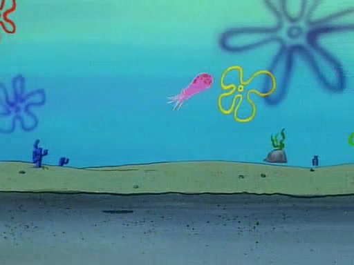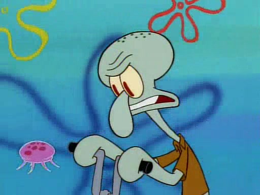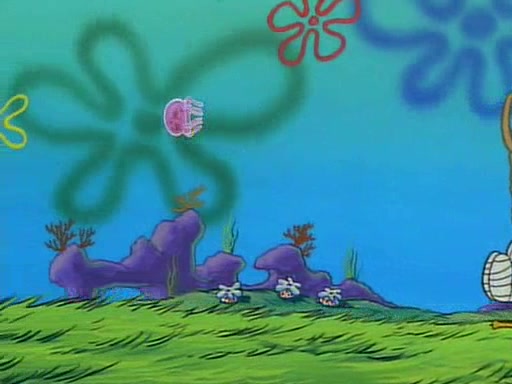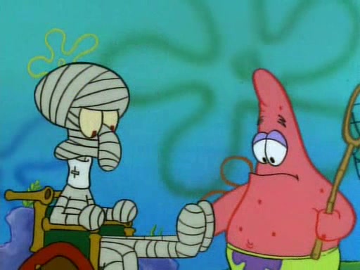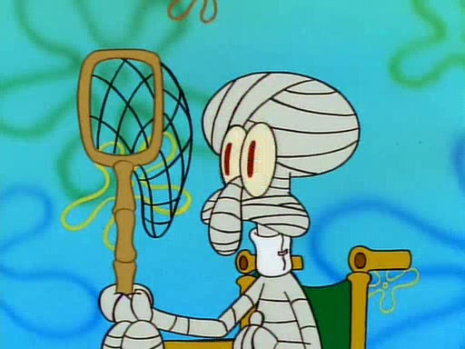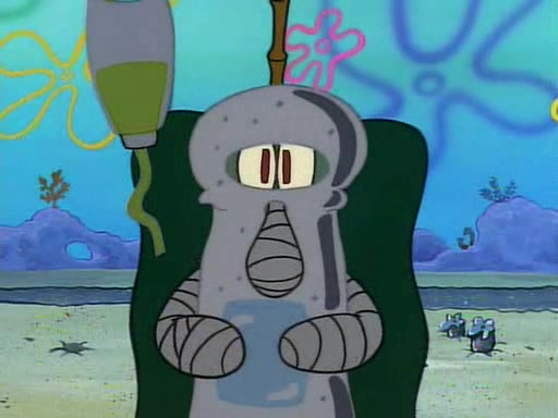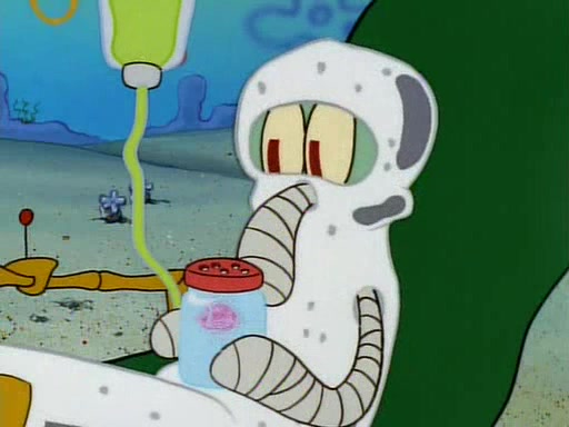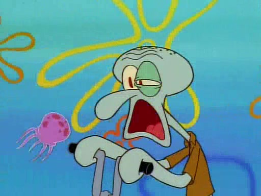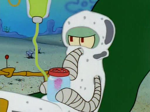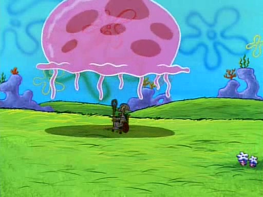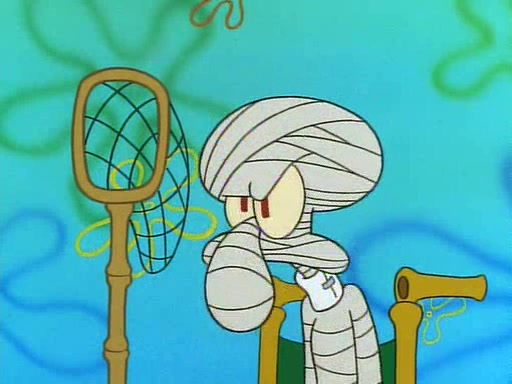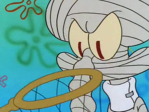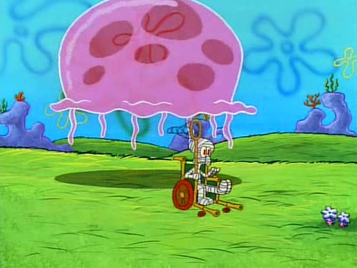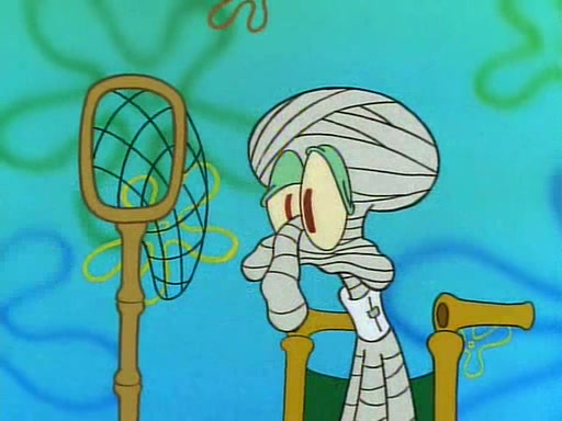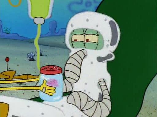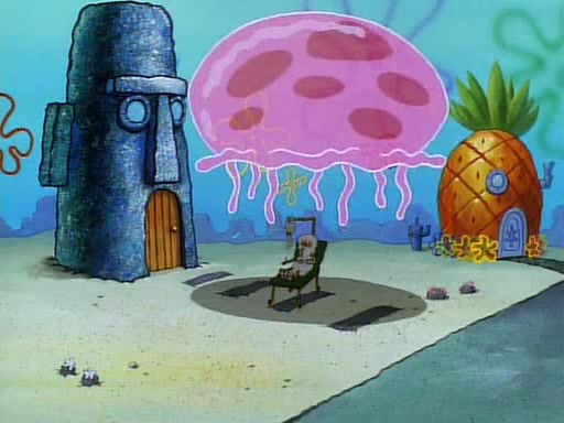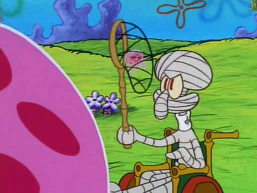 He is not into it at first, but when a jellyfish stings him, he goes after it for revenge. He manages to catch the jellyfish, and bangs his net triumphantly against a pink mass, but in doing so angers a queen jellyfish, who was the aforementioned pink mass. The queen jellyfish chases after him, attacking him with an extremely massive sting. The next day, SpongeBob and Patrick meet outside Squidward's house, and attempt to give a now life-support-bound Squidward the jellyfish that he caught the previous day. SpongeBob wonders if Squidward is still mad, and Squidward, who is still mad, according to Patrick and based on his actions, opens the jar and lets the jellyfish attack SpongeBob and Patrick, but not before the Jellyfish summons the Queen Jellyfish. As Squidward laughs, the Queen Jellyfish finds him and stings him, destroying his life-support. A completely blackened Squidward can only say, "Ow."