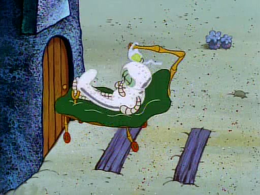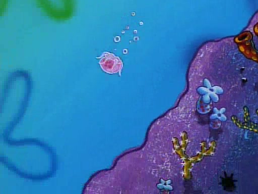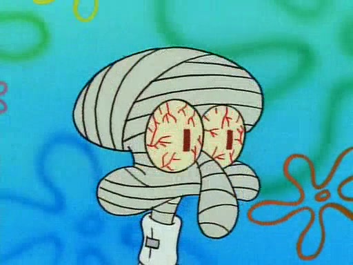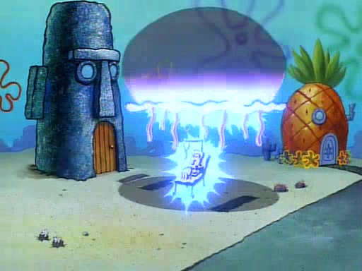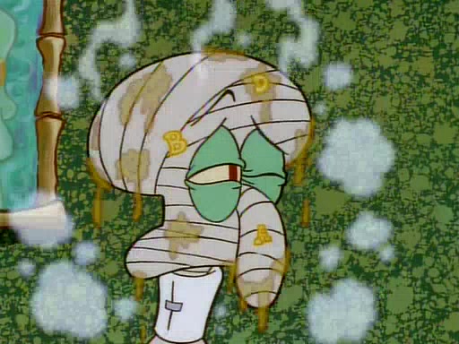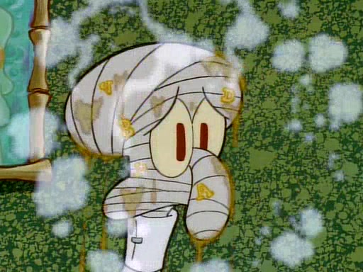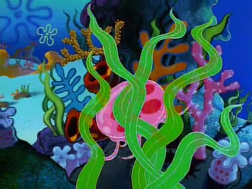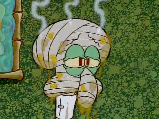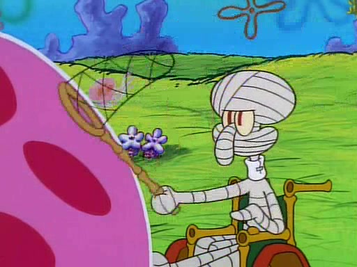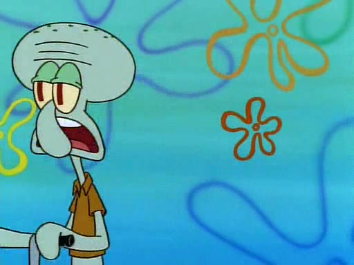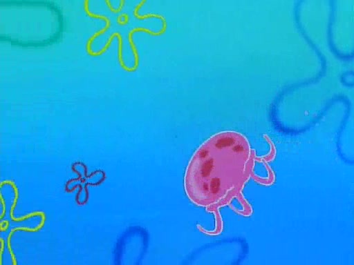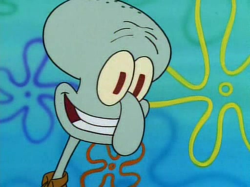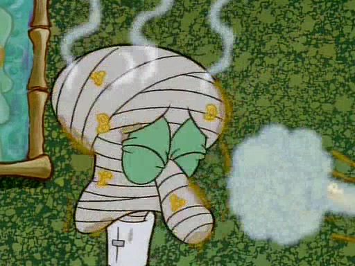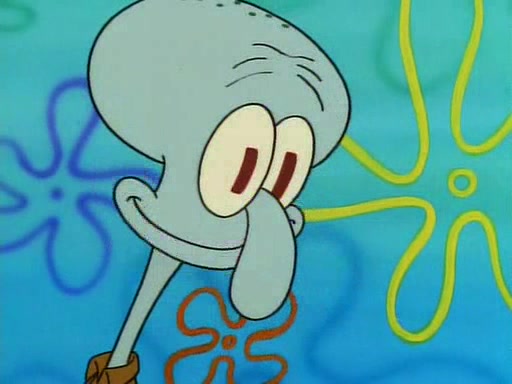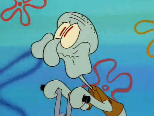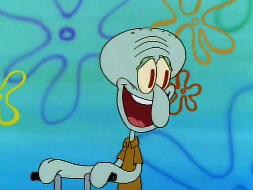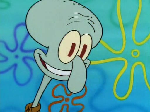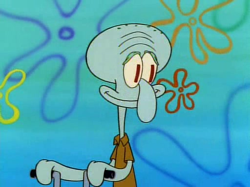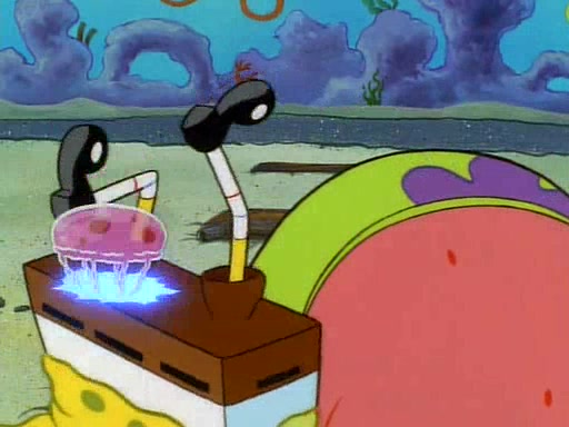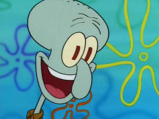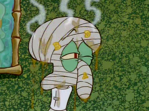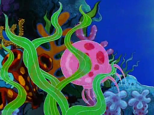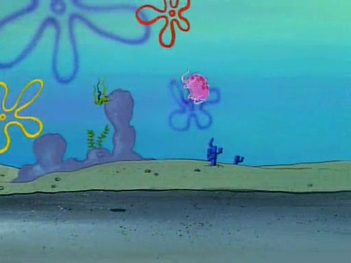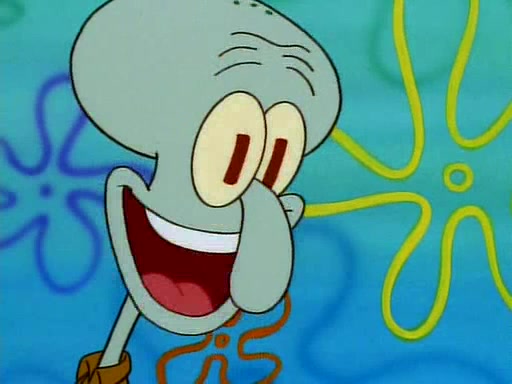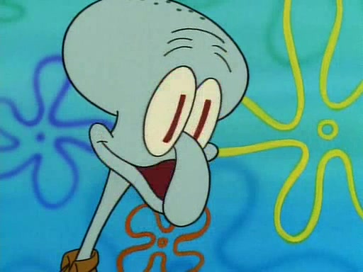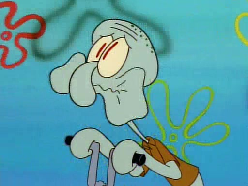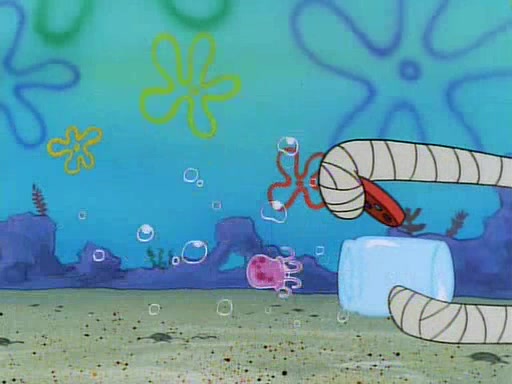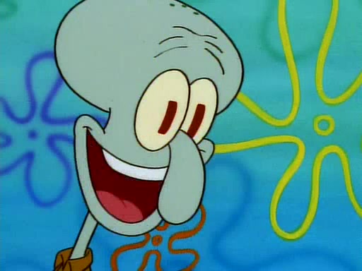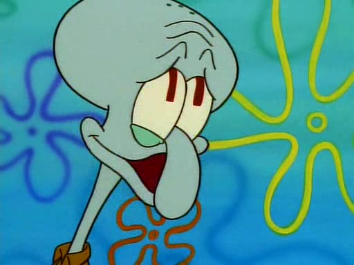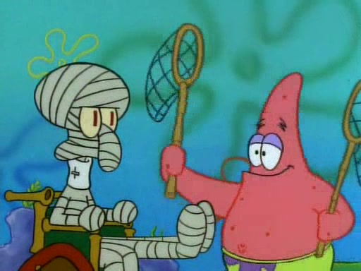 He is not into it at first, but when a jellyfish stings him, he goes after it for revenge. He manages to catch the jellyfish, and bangs his net triumphantly against a pink mass, but in doing so angers a queen jellyfish, who was the aforementioned pink mass. The queen jellyfish chases after him, attacking him with an extremely massive sting. The next day, SpongeBob and Patrick meet outside Squidward's house, and attempt to give a now life-support-bound Squidward the jellyfish that he caught the previous day. SpongeBob wonders if Squidward is still mad, and Squidward, who is still mad, according to Patrick and based on his actions, opens the jar and lets the jellyfish attack SpongeBob and Patrick, but not before the Jellyfish summons the Queen Jellyfish. As Squidward laughs, the Queen Jellyfish finds him and stings him, destroying his life-support. A completely blackened Squidward can only say, "Ow."
