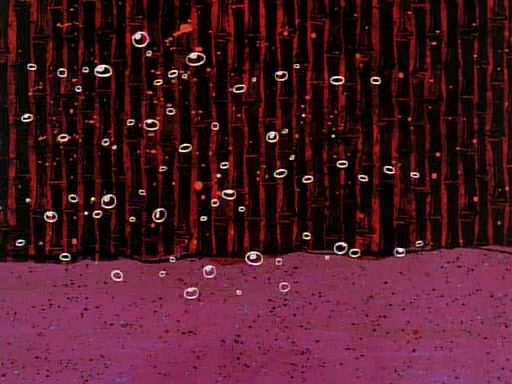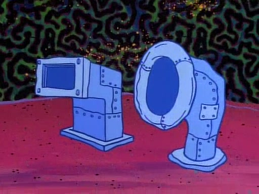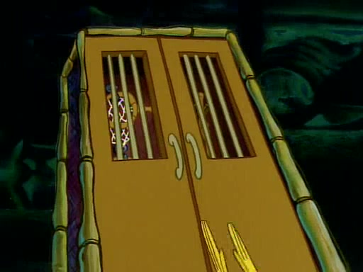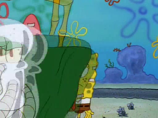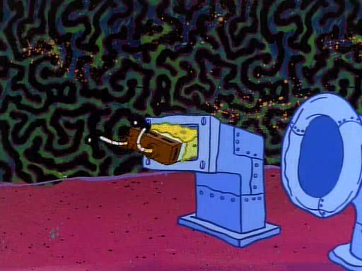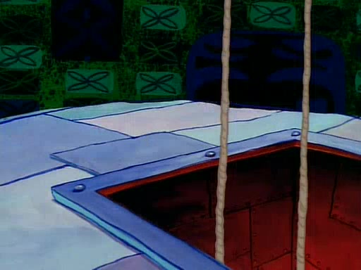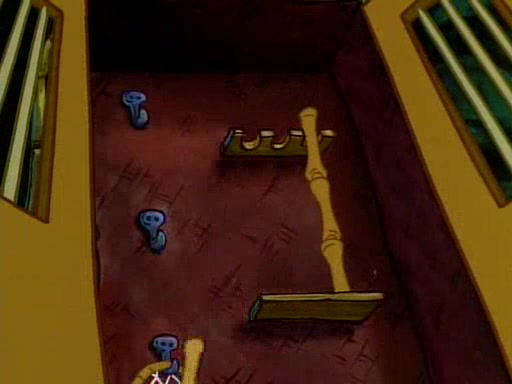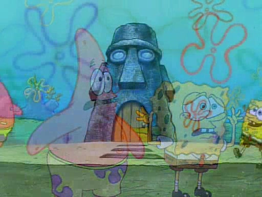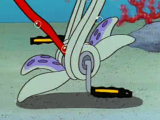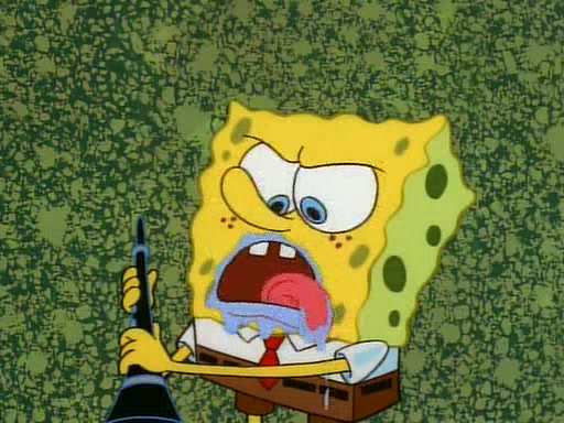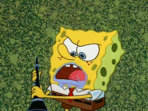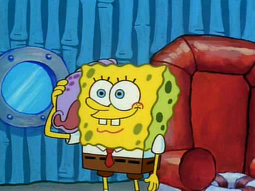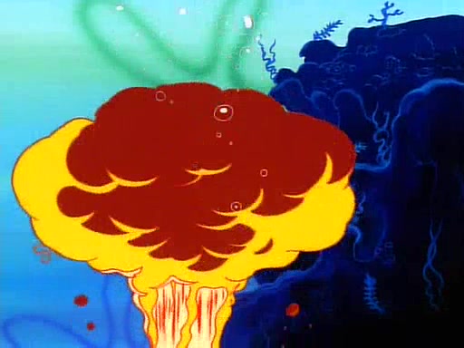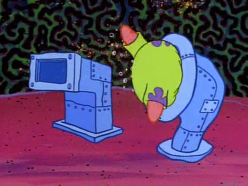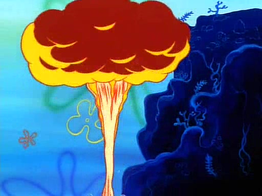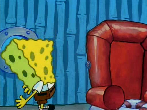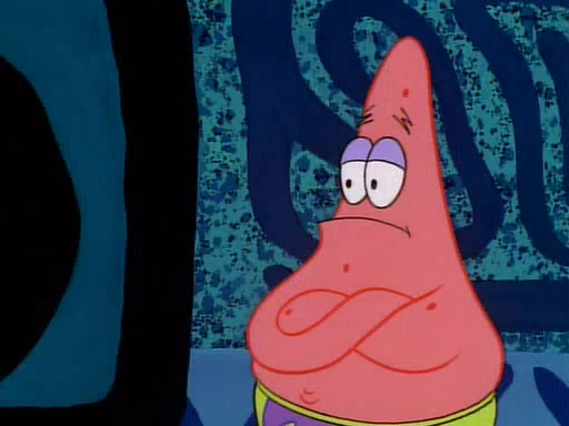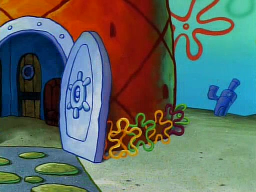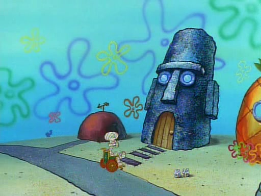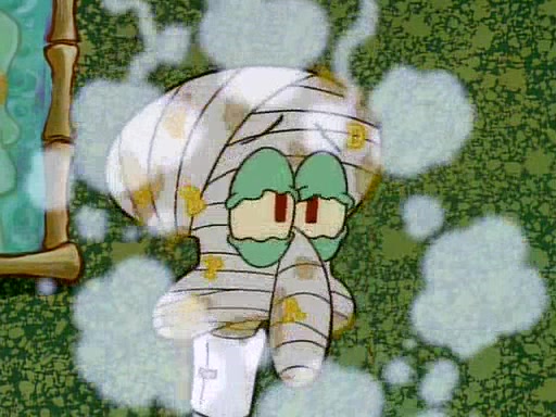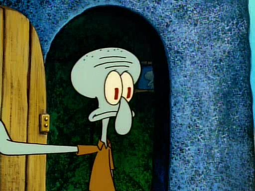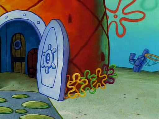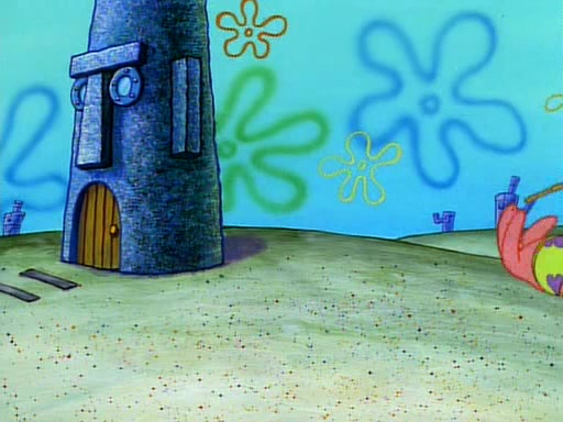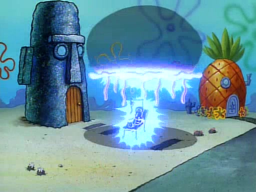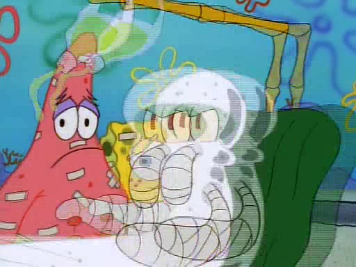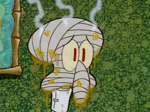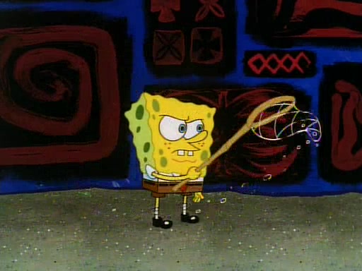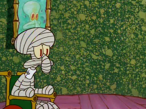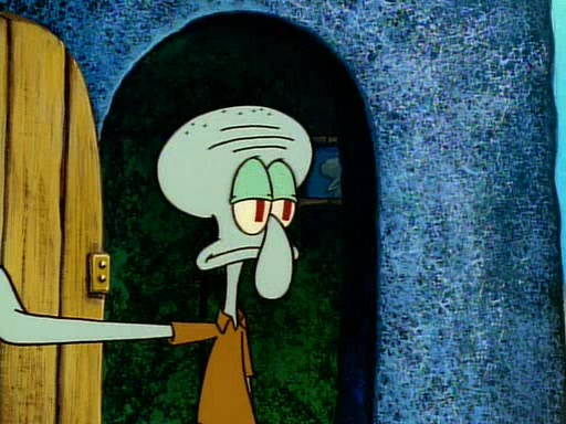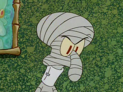 He is not into it at first, but when a jellyfish stings him, he goes after it for revenge. He manages to catch the jellyfish, and bangs his net triumphantly against a pink mass, but in doing so angers a queen jellyfish, who was the aforementioned pink mass. The queen jellyfish chases after him, attacking him with an extremely massive sting. The next day, SpongeBob and Patrick meet outside Squidward's house, and attempt to give a now life-support-bound Squidward the jellyfish that he caught the previous day. SpongeBob wonders if Squidward is still mad, and Squidward, who is still mad, according to Patrick and based on his actions, opens the jar and lets the jellyfish attack SpongeBob and Patrick, but not before the Jellyfish summons the Queen Jellyfish. As Squidward laughs, the Queen Jellyfish finds him and stings him, destroying his life-support. A completely blackened Squidward can only say, "Ow."