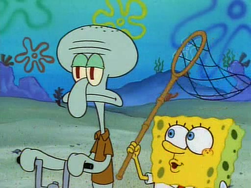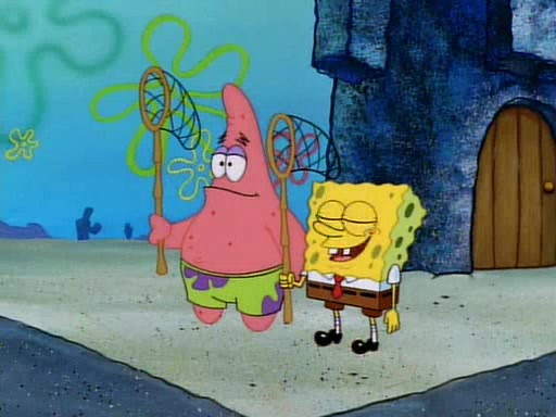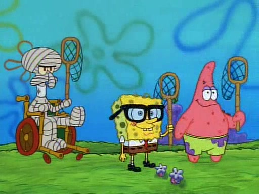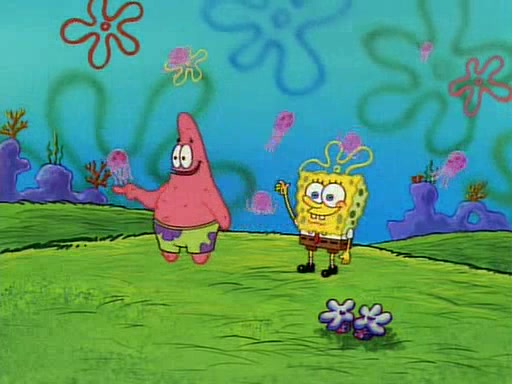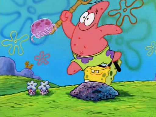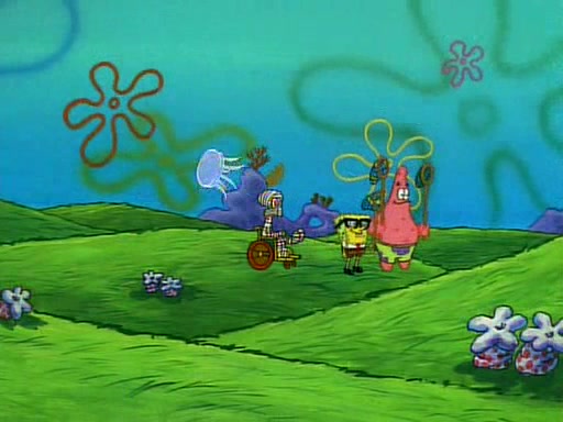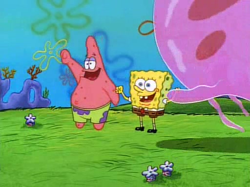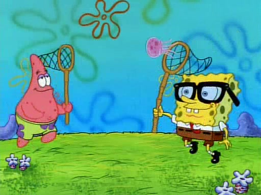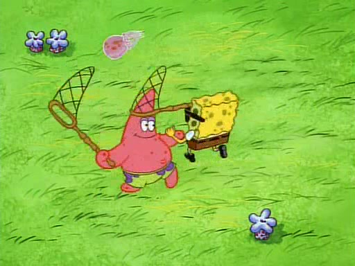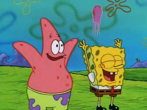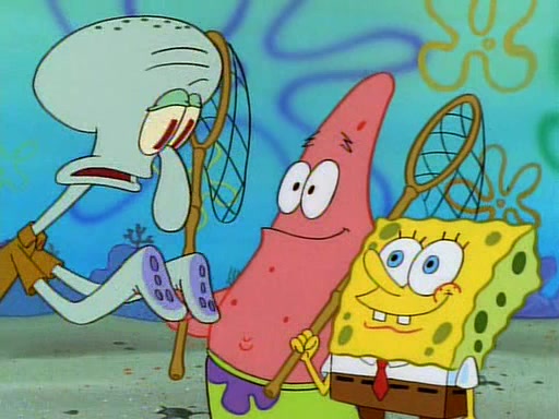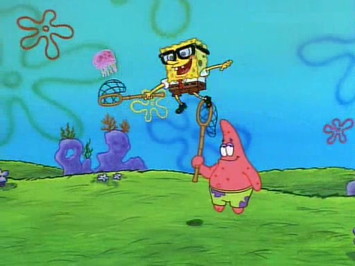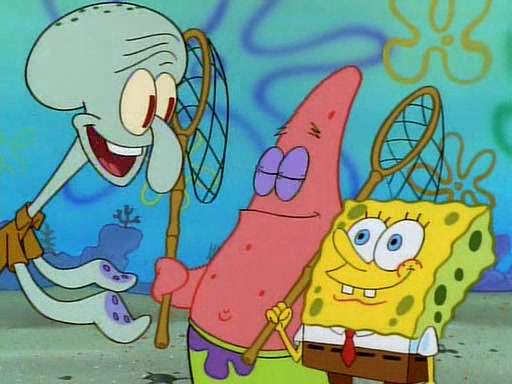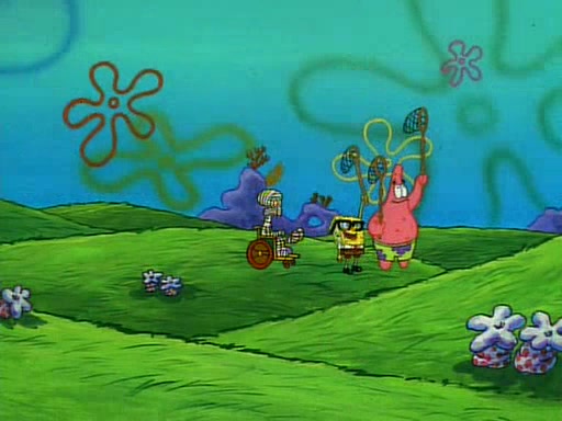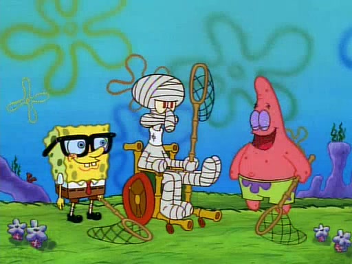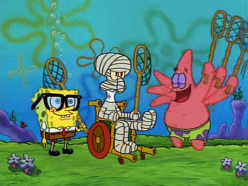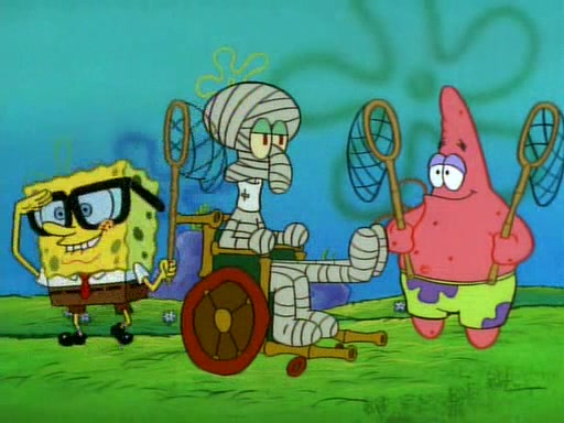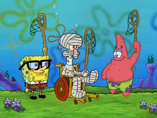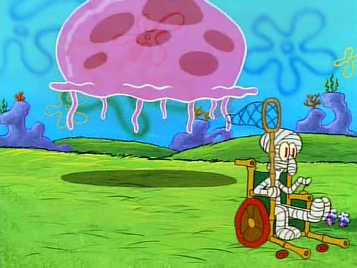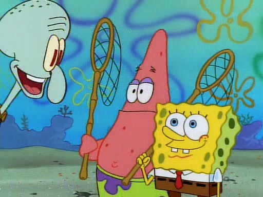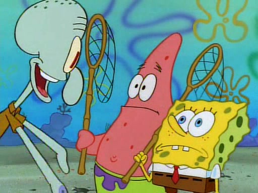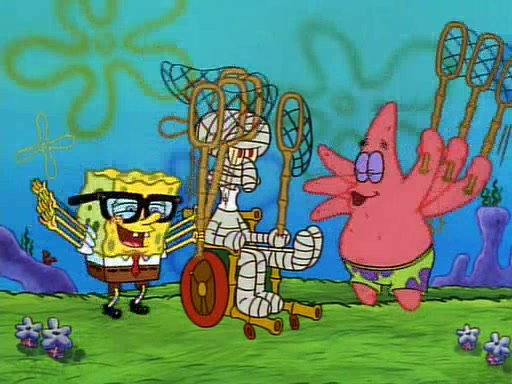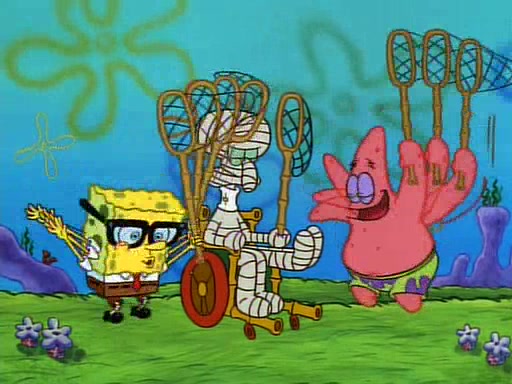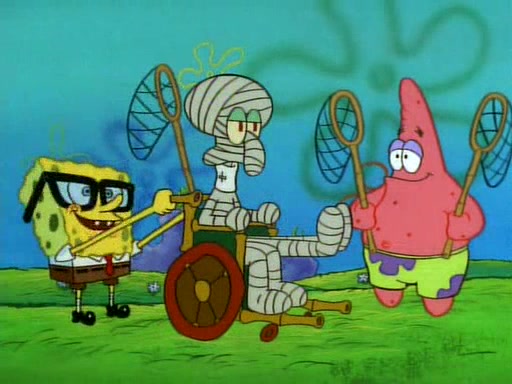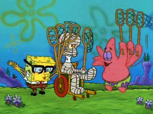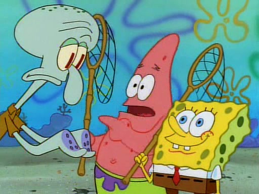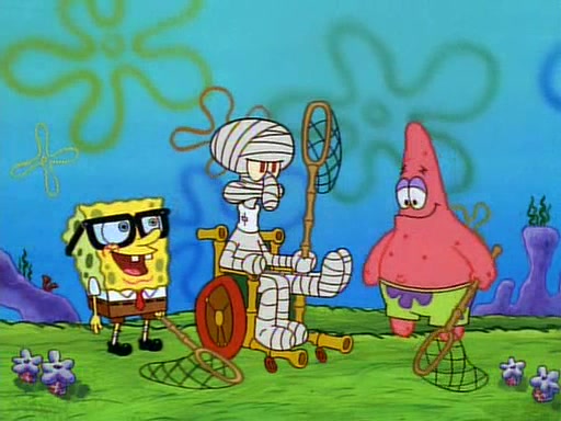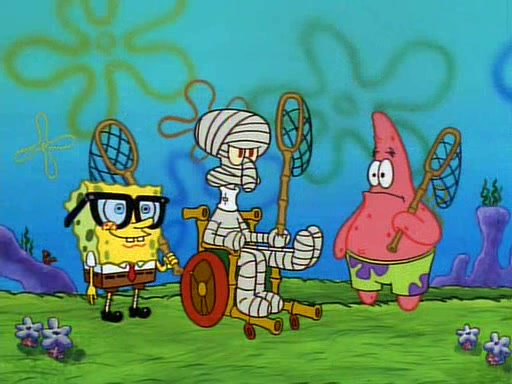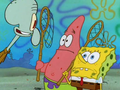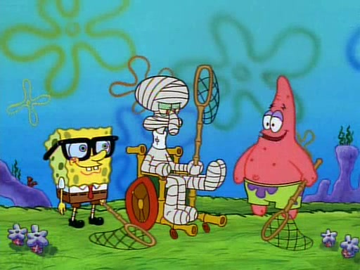 SpongeBob and Patrick then declare that a Jellyfishing expedition would be in order for the "Best Day Ever." When they arrive in Jellyfish Fields, SpongeBob tells Patrick to give a net to Squidward, while he finds "a good specimen." He (Patrick) explains that Squidward must, "firmly grasp [the net] in your hand," but when Patrick fails to put a jellyfishing net in Squidward's cast covered hand he stabs it through Squidward's palm, much to his chagrin and pain.