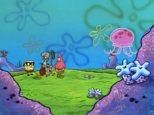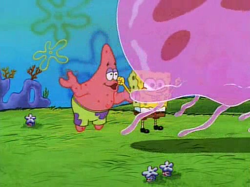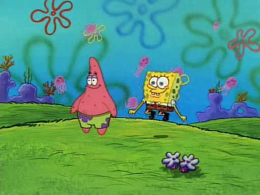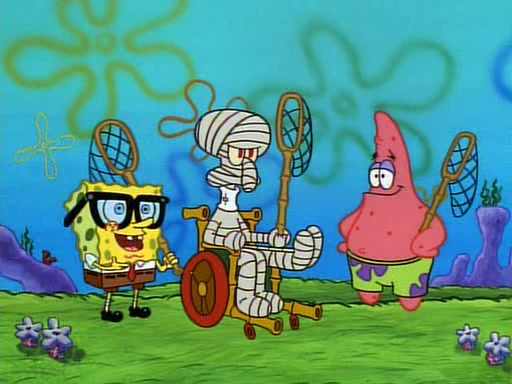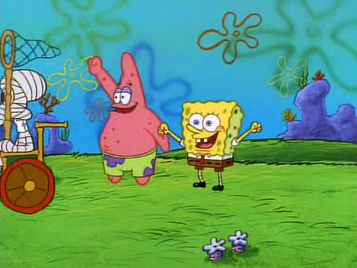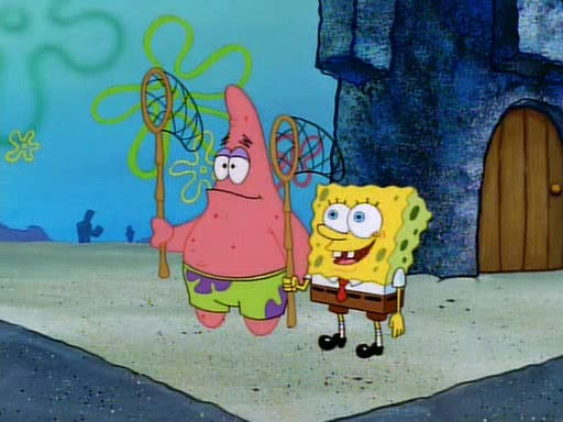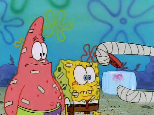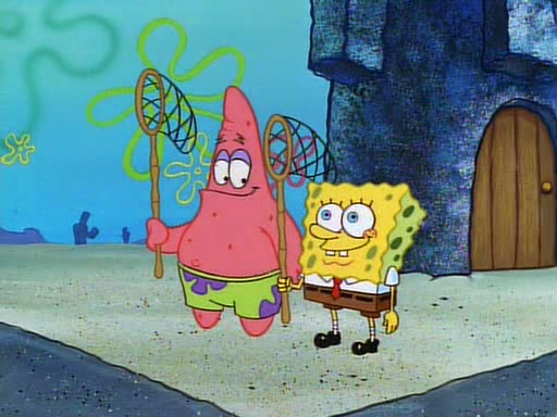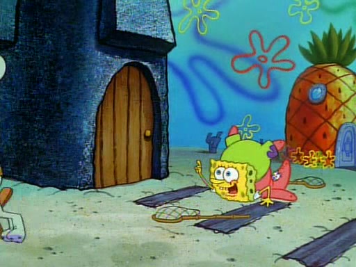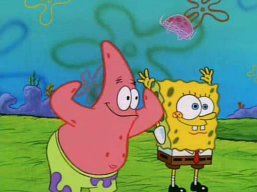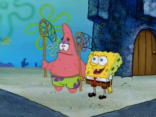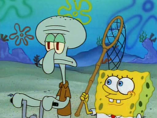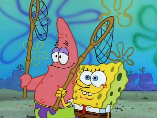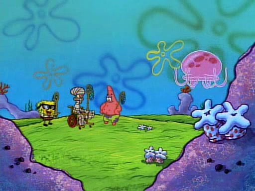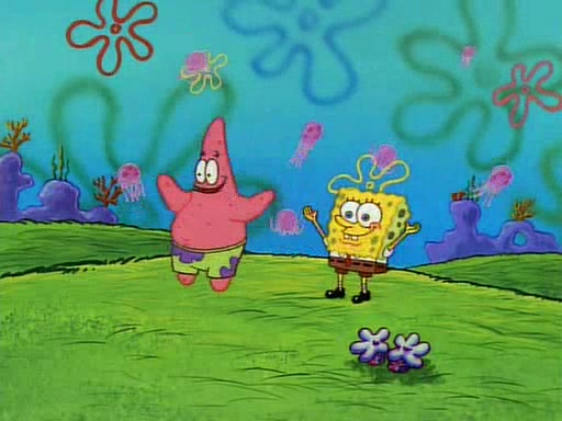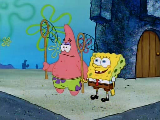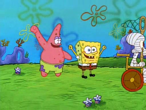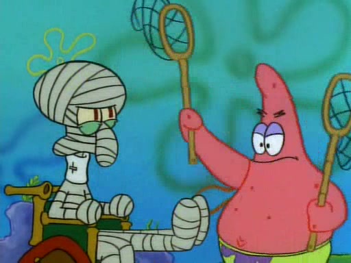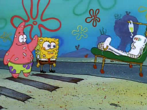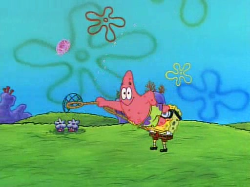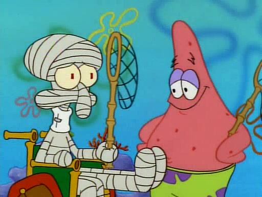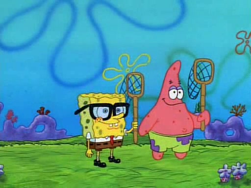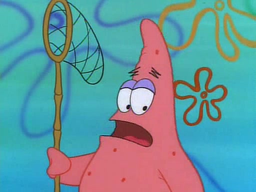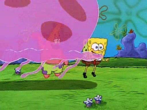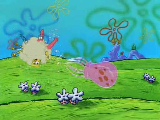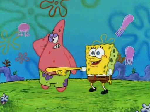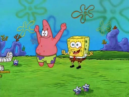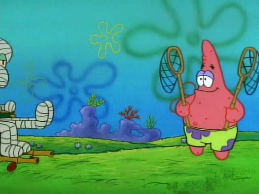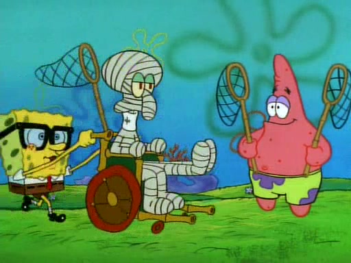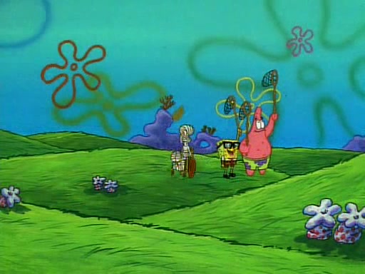 SpongeBob and Patrick then declare that a Jellyfishing expedition would be in order for the "Best Day Ever." When they arrive in Jellyfish Fields, SpongeBob tells Patrick to give a net to Squidward, while he finds "a good specimen." He (Patrick) explains that Squidward must, "firmly grasp [the net] in your hand," but when Patrick fails to put a jellyfishing net in Squidward's cast covered hand he stabs it through Squidward's palm, much to his chagrin and pain.