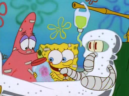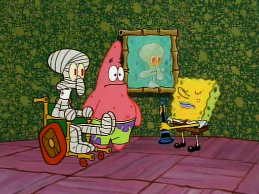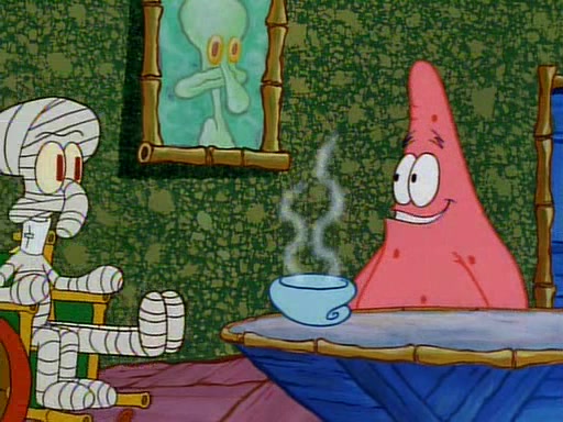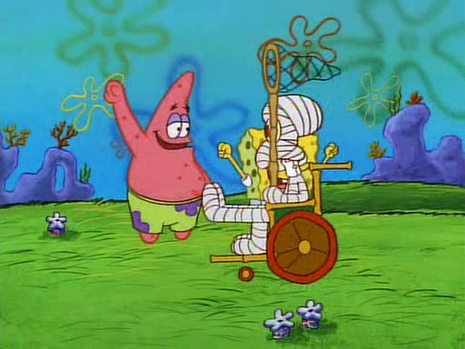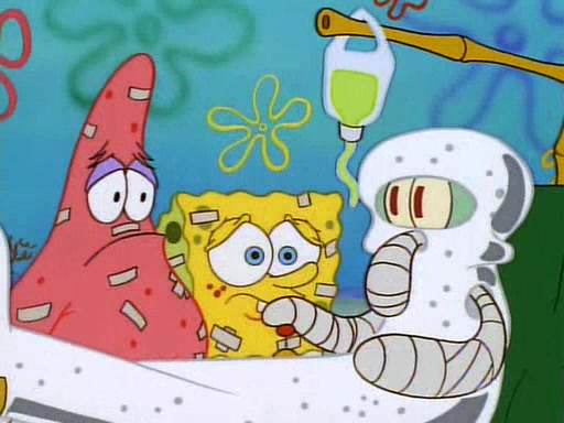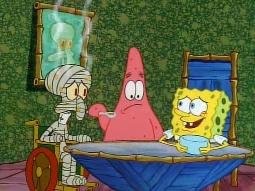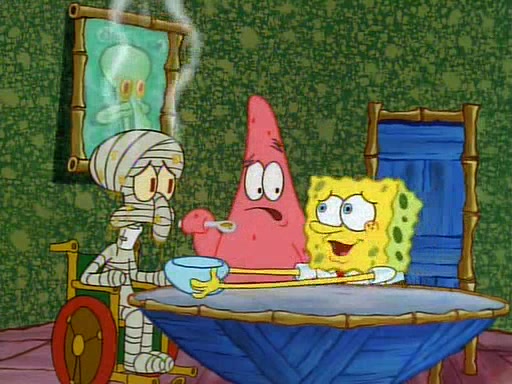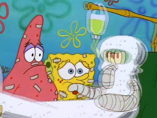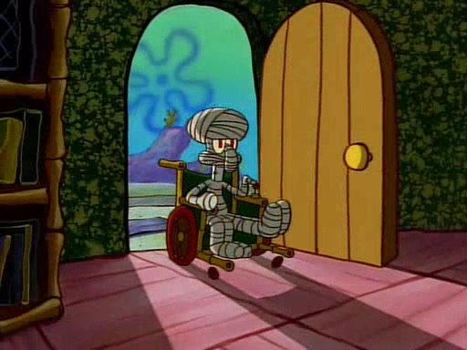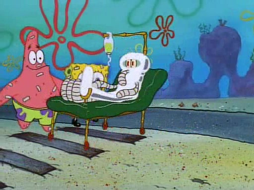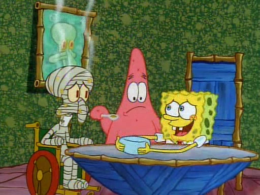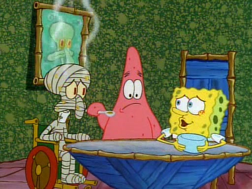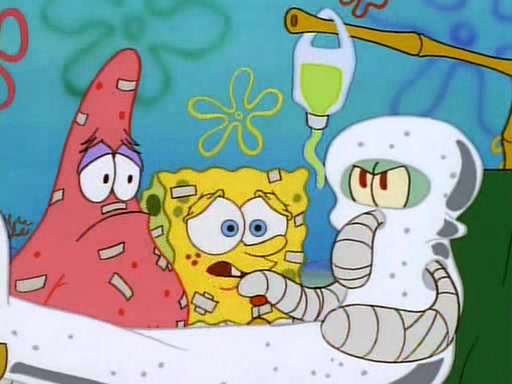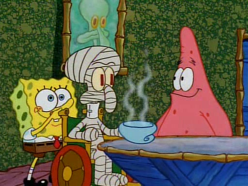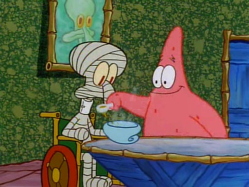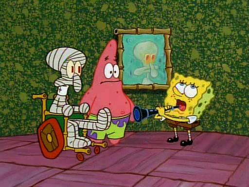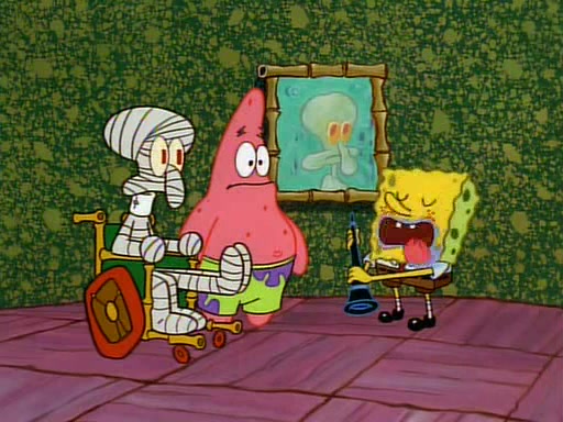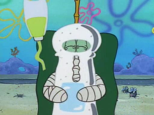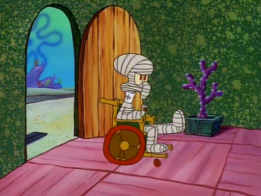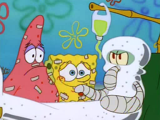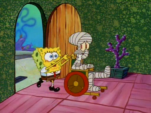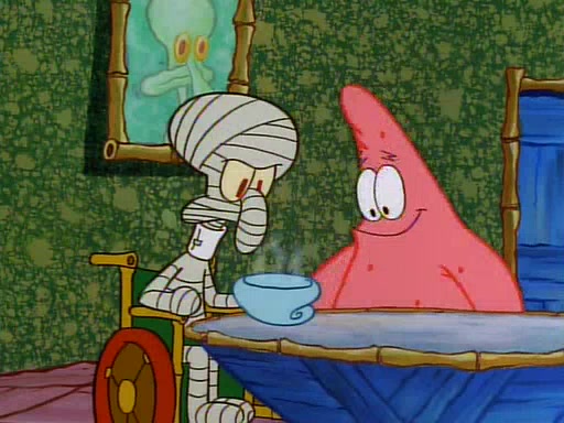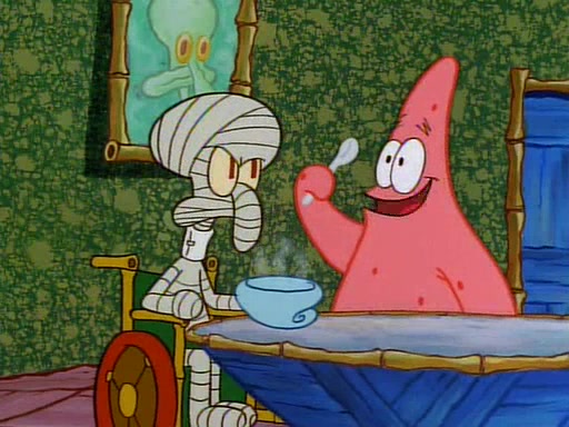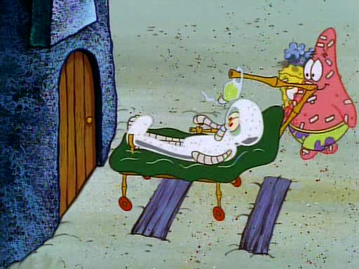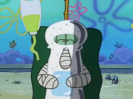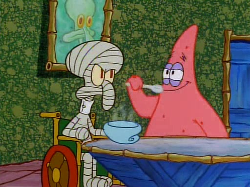 Unfortunately, while he is bicycling, he has an accident involving a jellyfish and is ultimately left wheelchair bound. SpongeBob and Patrick decide that what Squidward needs is a "Best Day Ever." It begins at Squidward's house where Patrick offers Squidward some soup. (For whatever reason, the doctors put bandages all over Squidward's body, including his mouth). Patrick blows the hot soup onto Squidward's bandaged face several times before SpongeBob says that soup isn't a good idea. SpongeBob then suggests that some music would be good, and gets Squidward's clarinet. He blows a bad note before realizing that his lips are too dry, and goes through several disgusting motions of trying to wet his lips. Patrick soon violently takes the instrument away from SpongeBob, declaring music not to be a good thing for Squidward either.