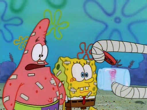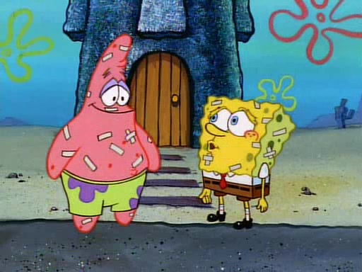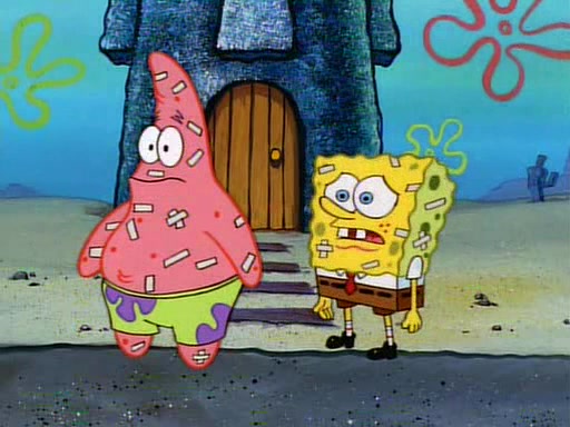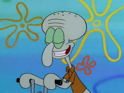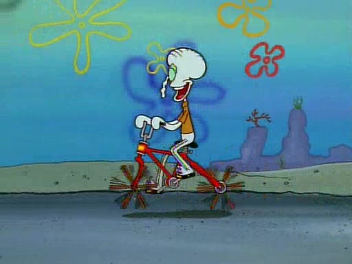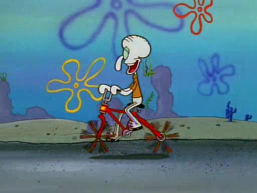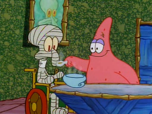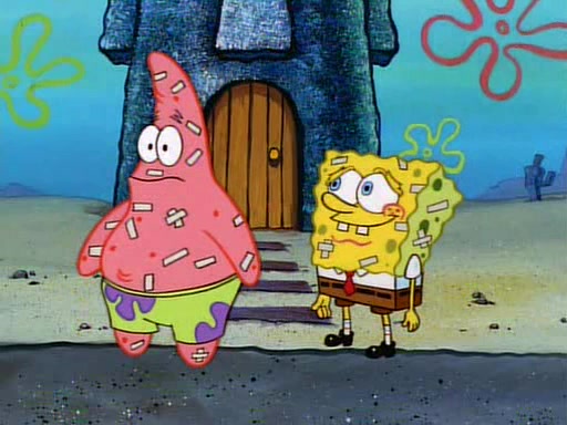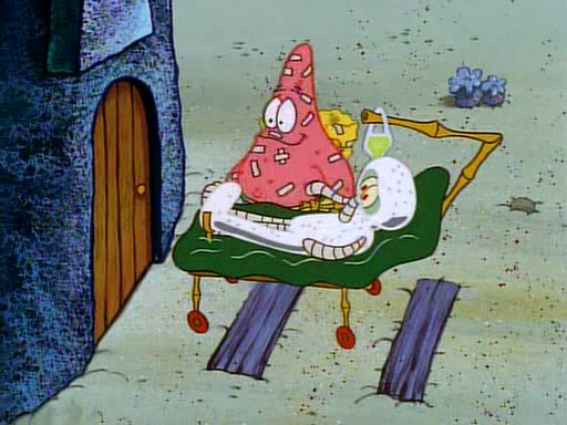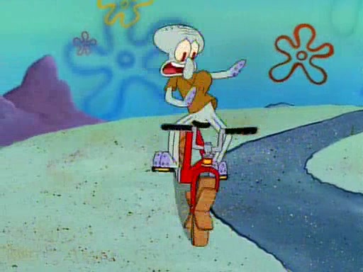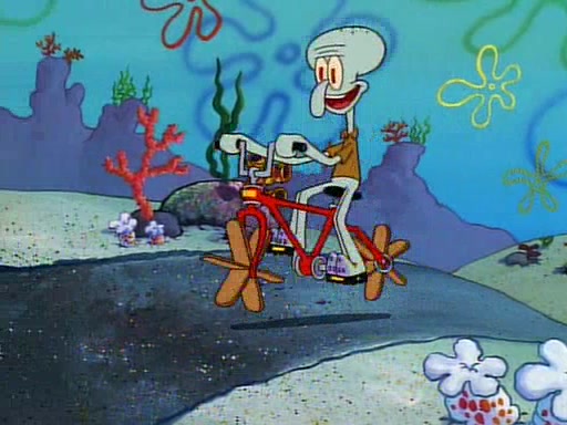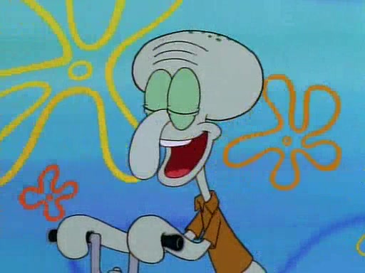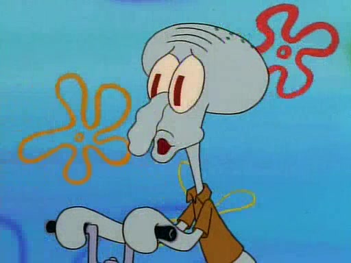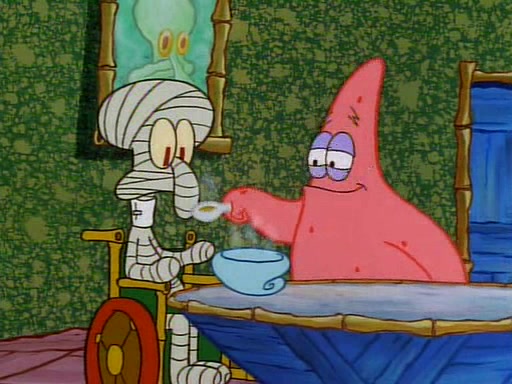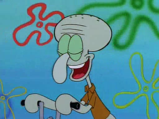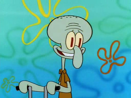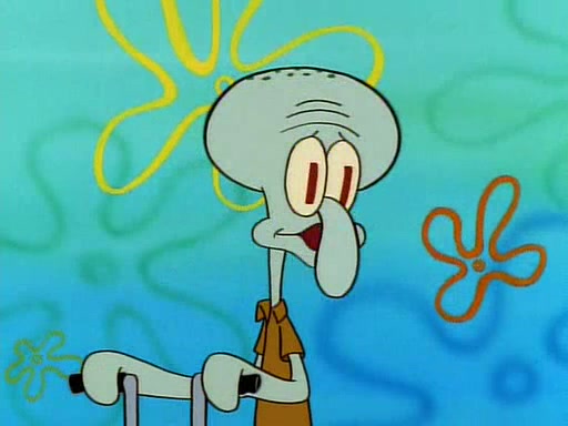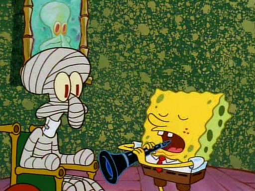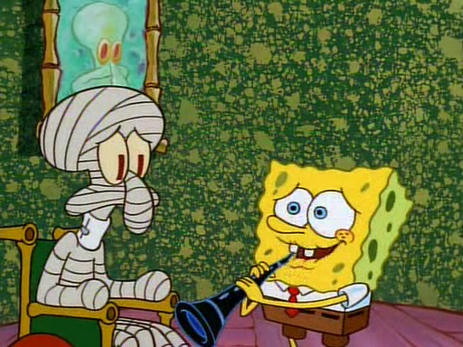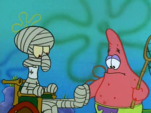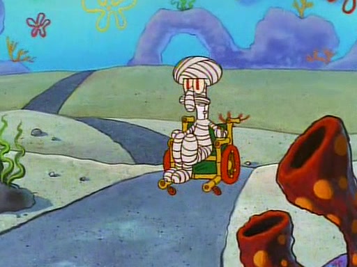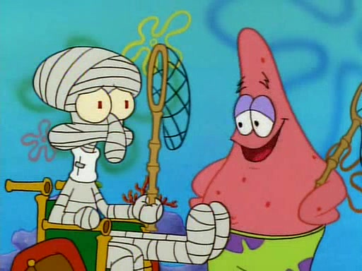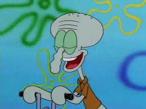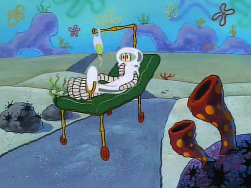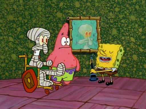Unfortunately, while he is bicycling, he has an accident involving a jellyfish and is ultimately left wheelchair bound. SpongeBob and Patrick decide that what Squidward needs is a "Best Day Ever." It begins at Squidward's house where Patrick offers Squidward some soup. (For whatever reason, the doctors put bandages all over Squidward's body, including his mouth). Patrick blows the hot soup onto Squidward's bandaged face several times before SpongeBob says that soup isn't a good idea. SpongeBob then suggests that some music would be good, and gets Squidward's clarinet. He blows a bad note before realizing that his lips are too dry, and goes through several disgusting motions of trying to wet his lips. Patrick soon violently takes the instrument away from SpongeBob, declaring music not to be a good thing for Squidward either.