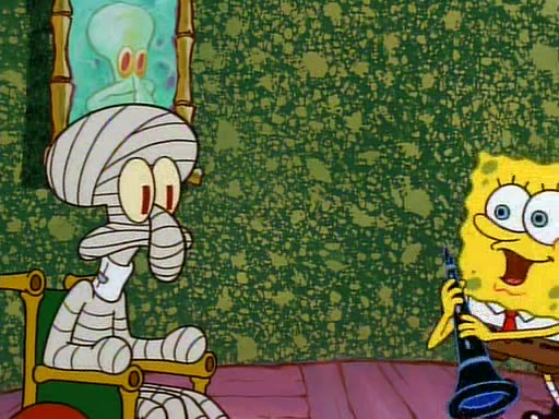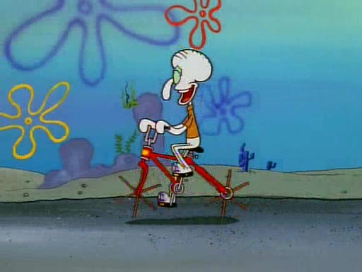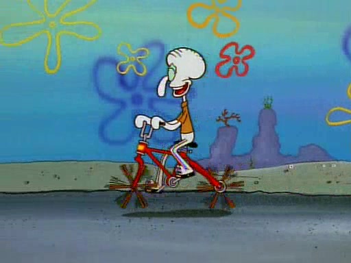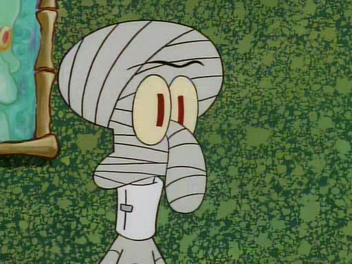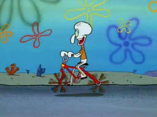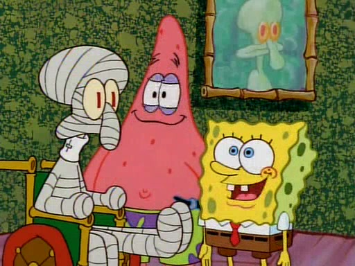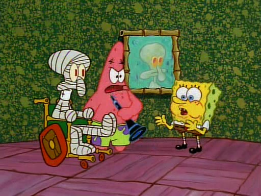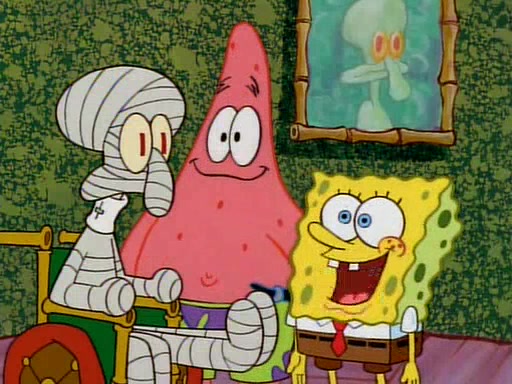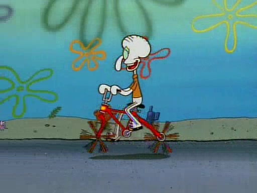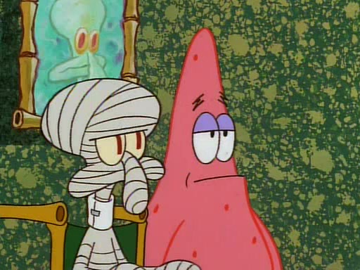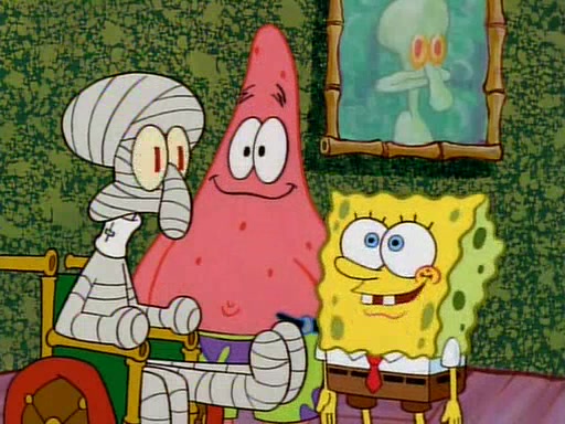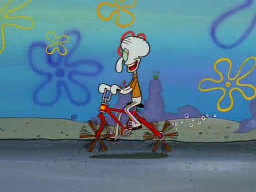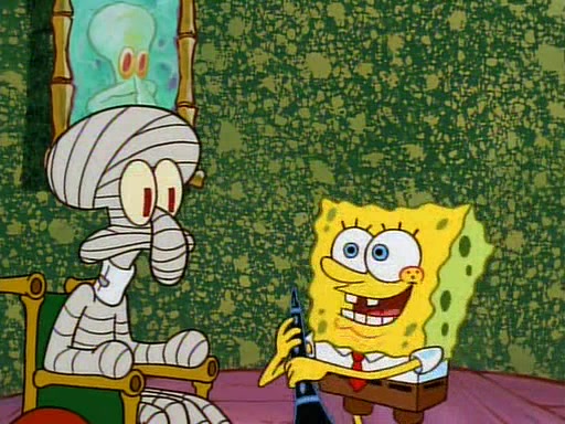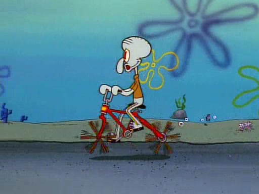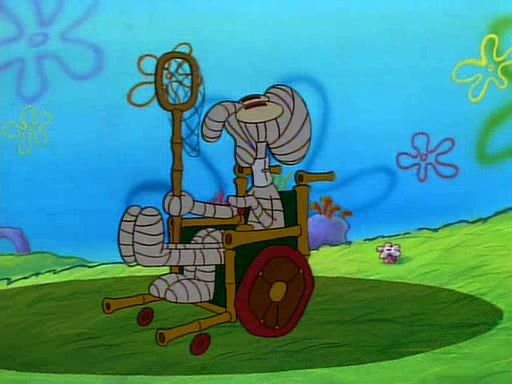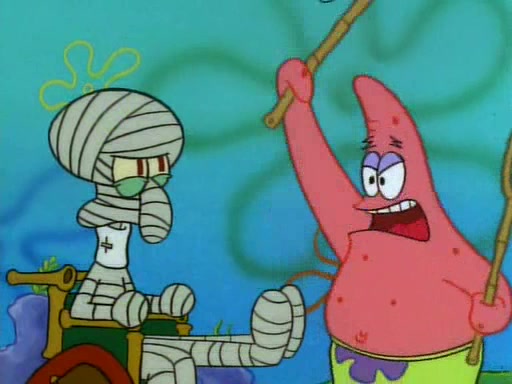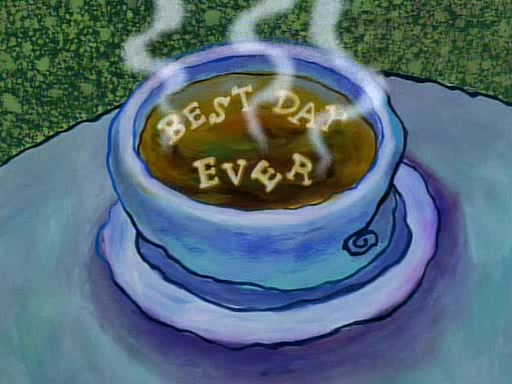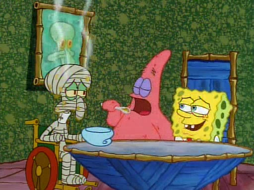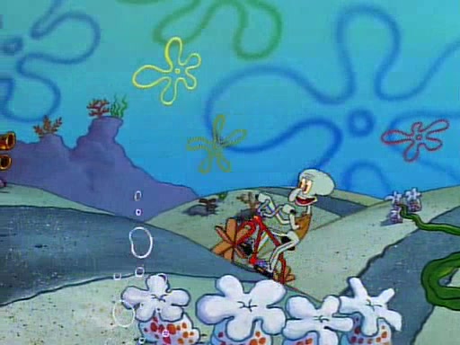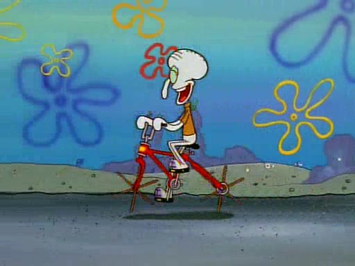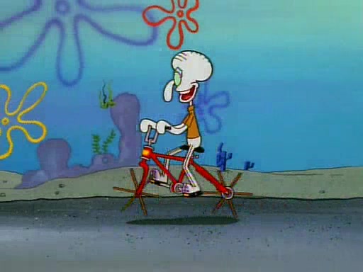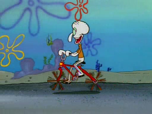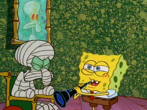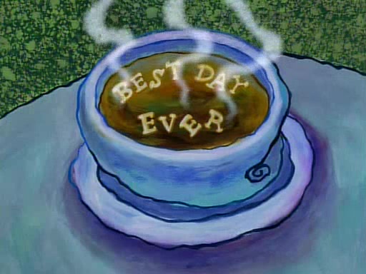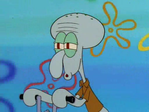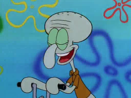 Unfortunately, while he is bicycling, he has an accident involving a jellyfish and is ultimately left wheelchair bound. SpongeBob and Patrick decide that what Squidward needs is a "Best Day Ever." It begins at Squidward's house where Patrick offers Squidward some soup. (For whatever reason, the doctors put bandages all over Squidward's body, including his mouth). Patrick blows the hot soup onto Squidward's bandaged face several times before SpongeBob says that soup isn't a good idea. SpongeBob then suggests that some music would be good, and gets Squidward's clarinet. He blows a bad note before realizing that his lips are too dry, and goes through several disgusting motions of trying to wet his lips. Patrick soon violently takes the instrument away from SpongeBob, declaring music not to be a good thing for Squidward either.