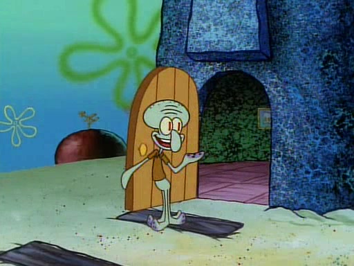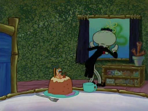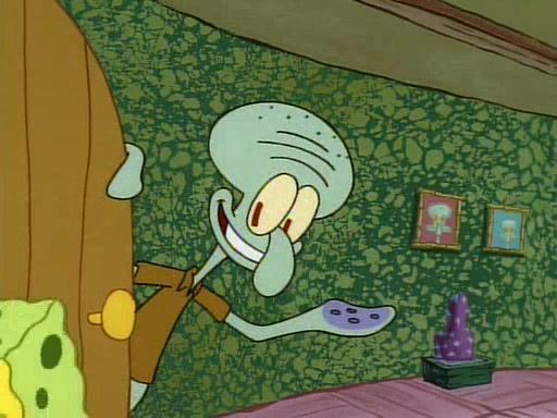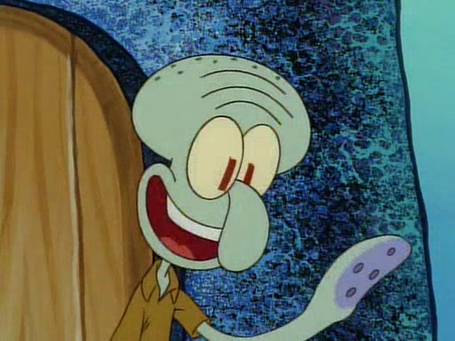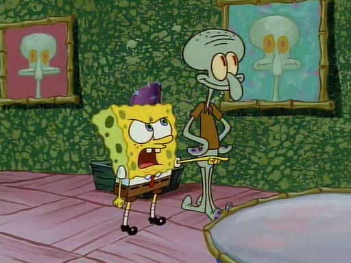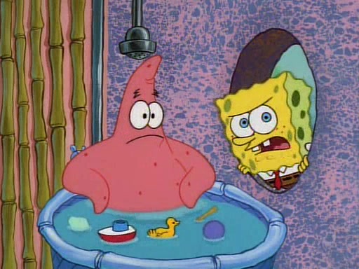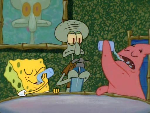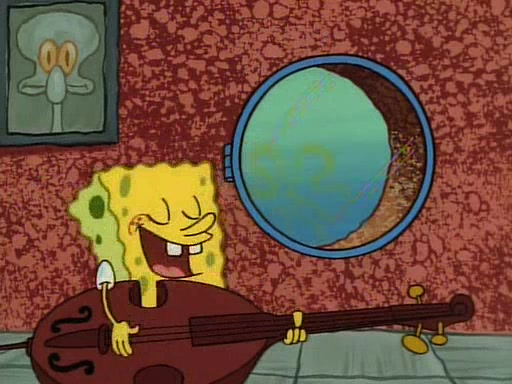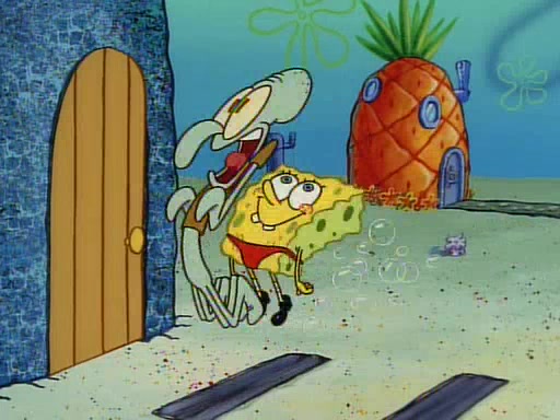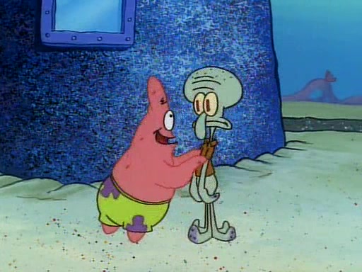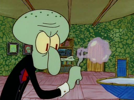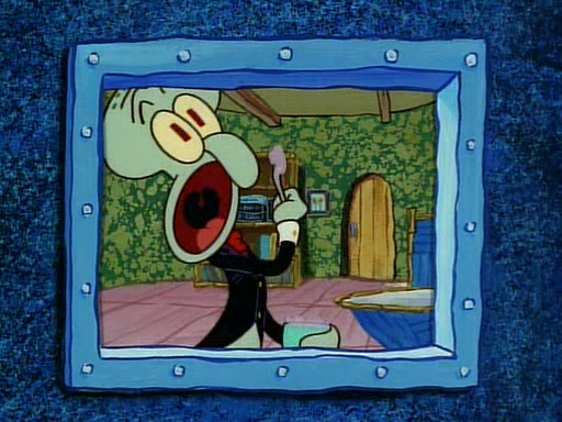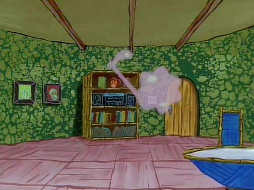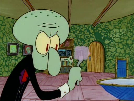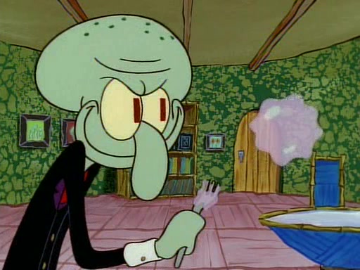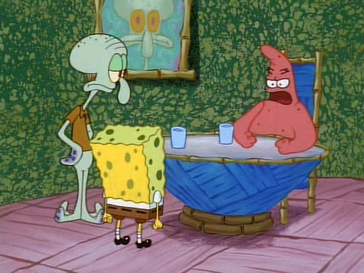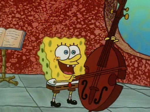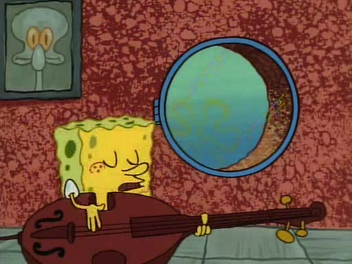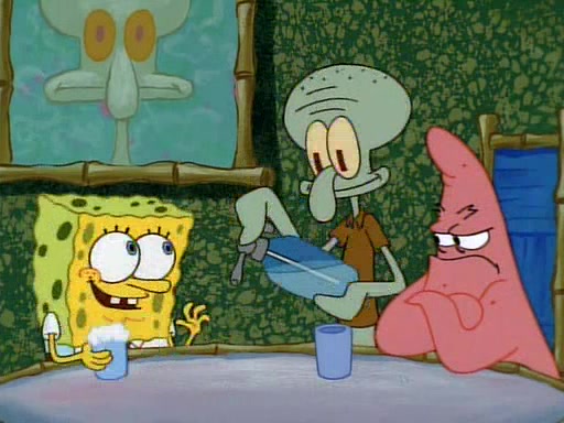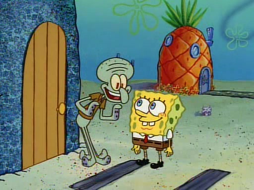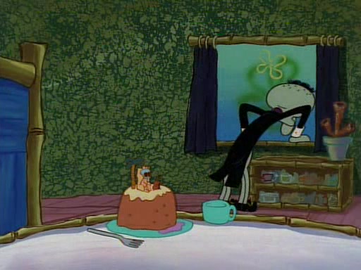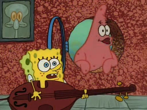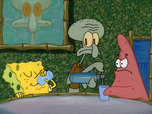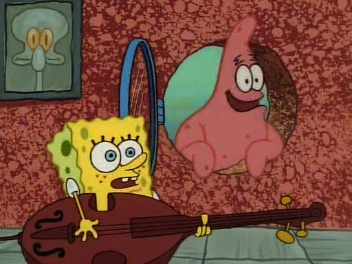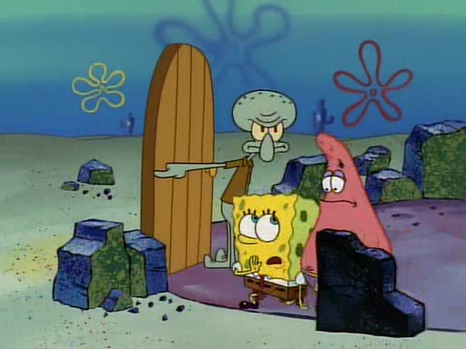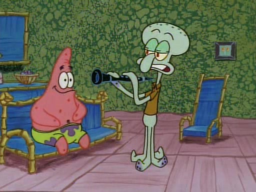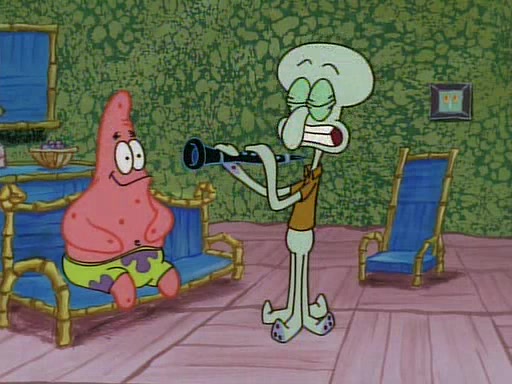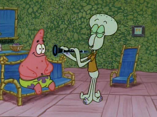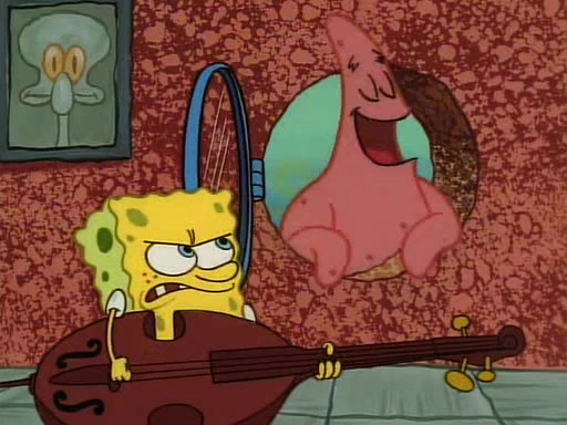 Inside, SpongeBob plays a song (badly) for Squidward on his Double Bass (which he thinks is a bassinet) and when Patrick appears in the window and interrupts the song, SpongeBob destroys the instrument in a fit of rage, and Squidward kicks him out. Squidward then tries to take a bath but Patrick is in the tub. SpongeBob appears in the window and sees this, and he and Patrick begin arguing again, driving Squidward crazy.
