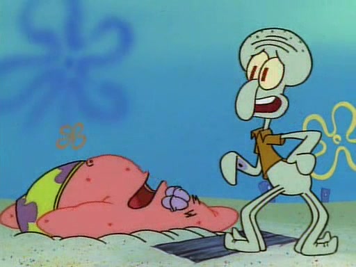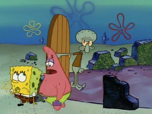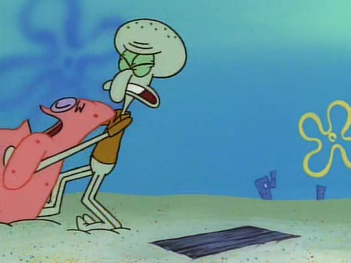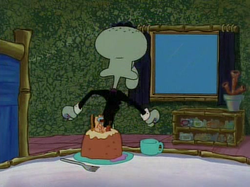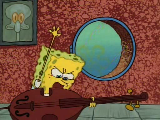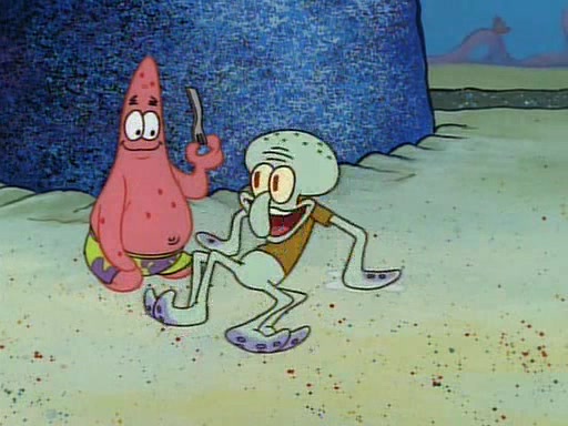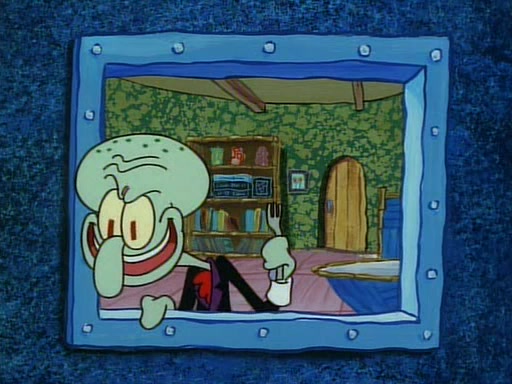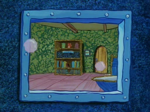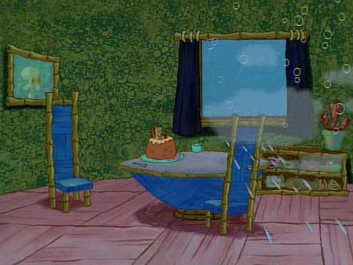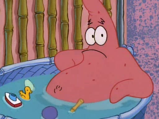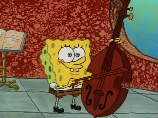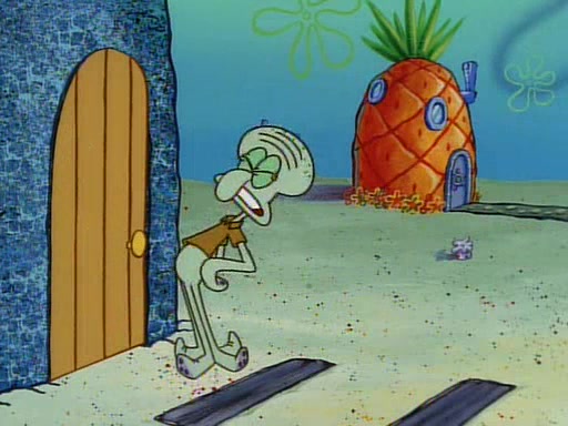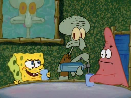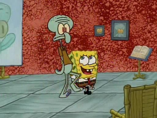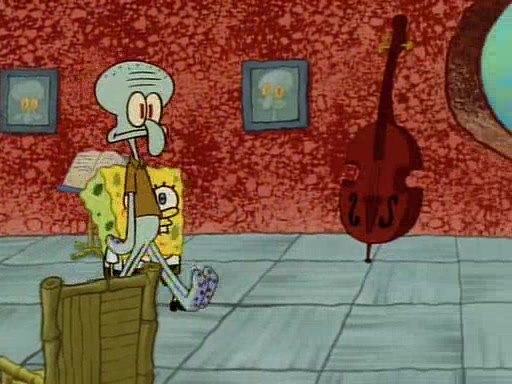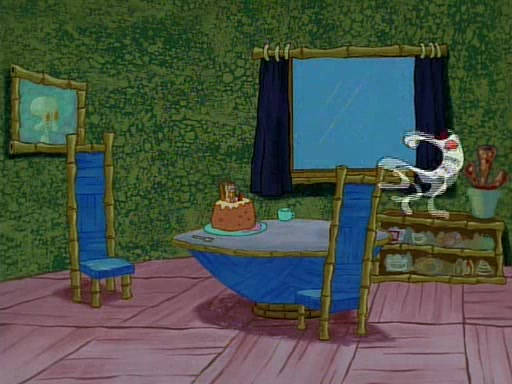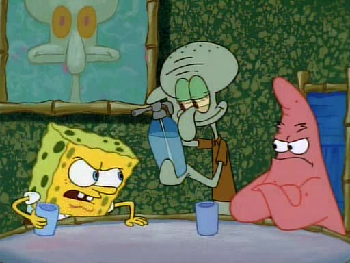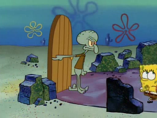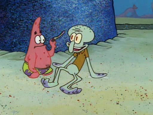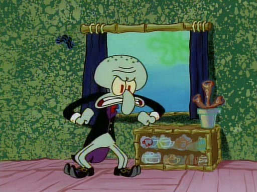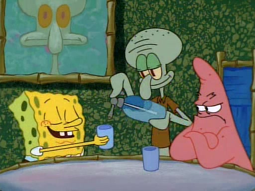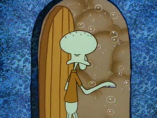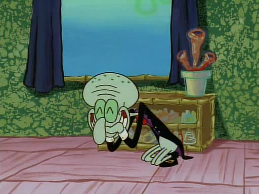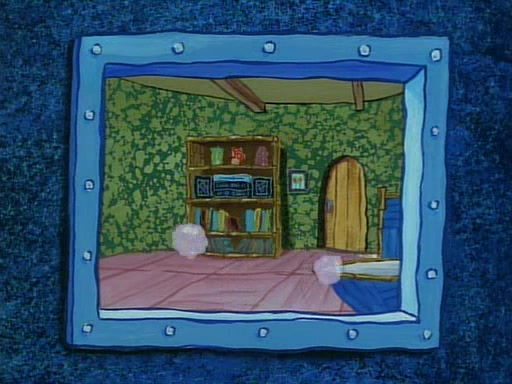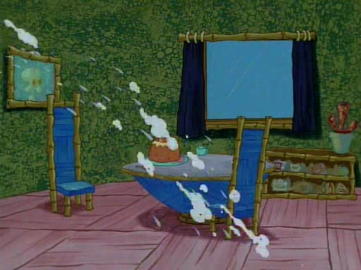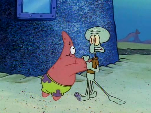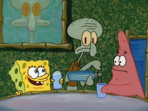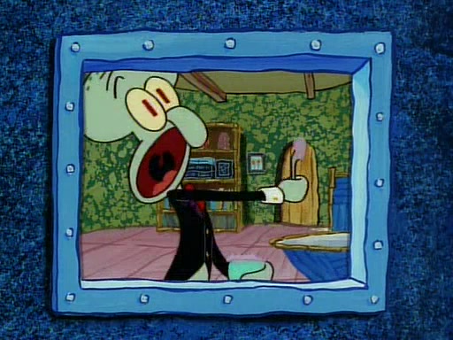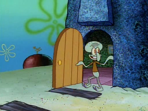 Inside, SpongeBob plays a song (badly) for Squidward on his Double Bass (which he thinks is a bassinet) and when Patrick appears in the window and interrupts the song, SpongeBob destroys the instrument in a fit of rage, and Squidward kicks him out. Squidward then tries to take a bath but Patrick is in the tub. SpongeBob appears in the window and sees this, and he and Patrick begin arguing again, driving Squidward crazy.