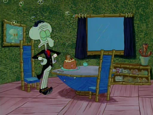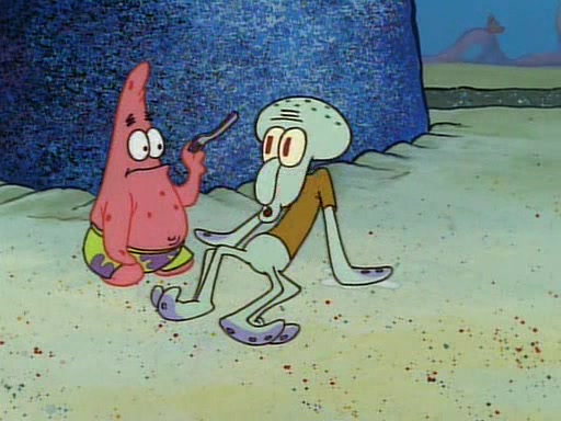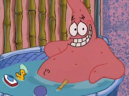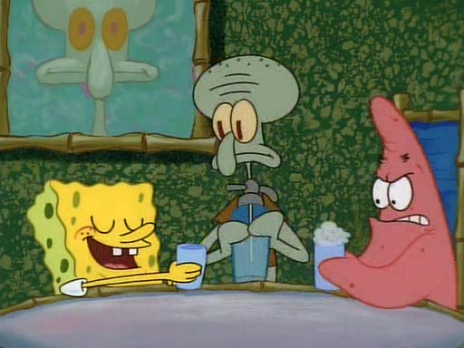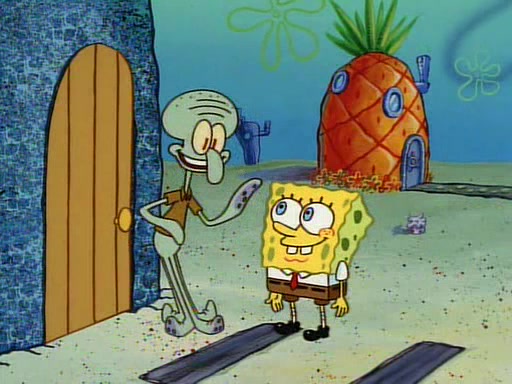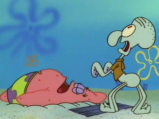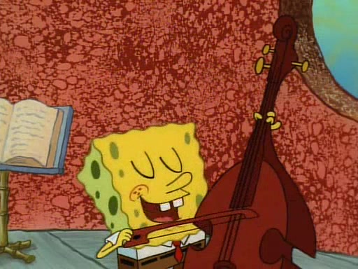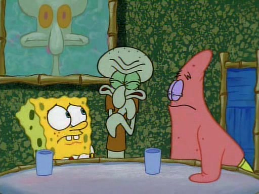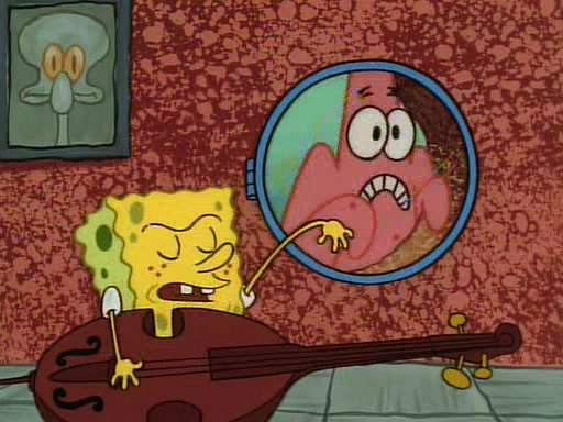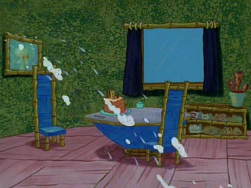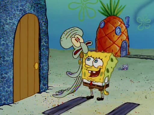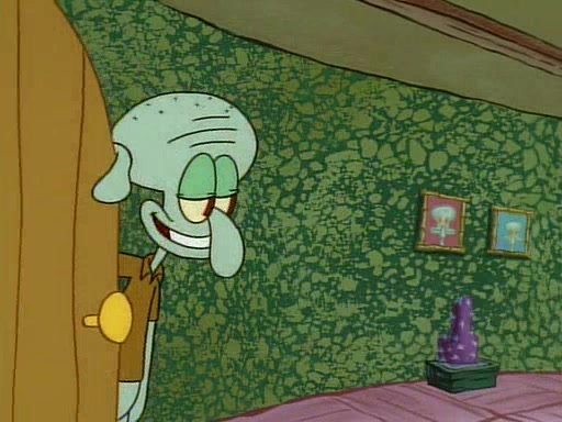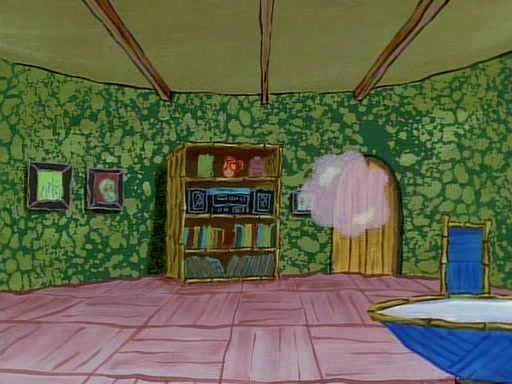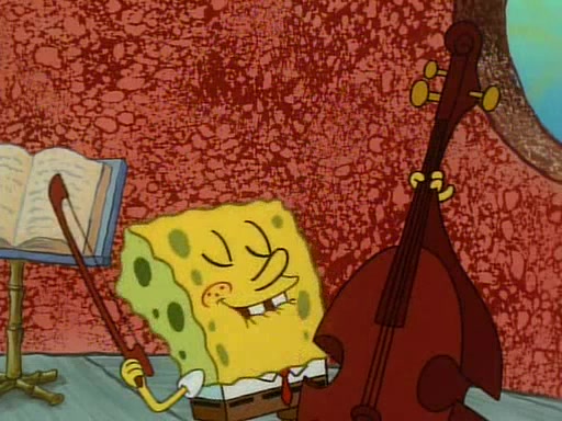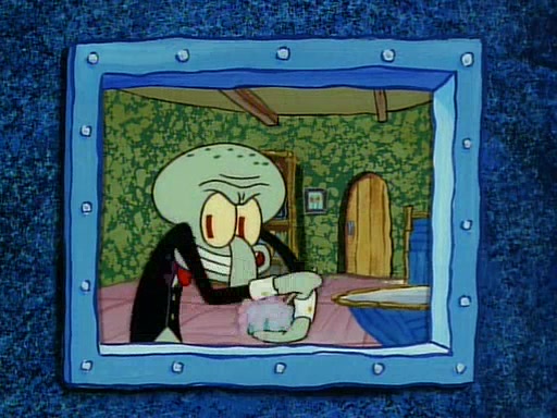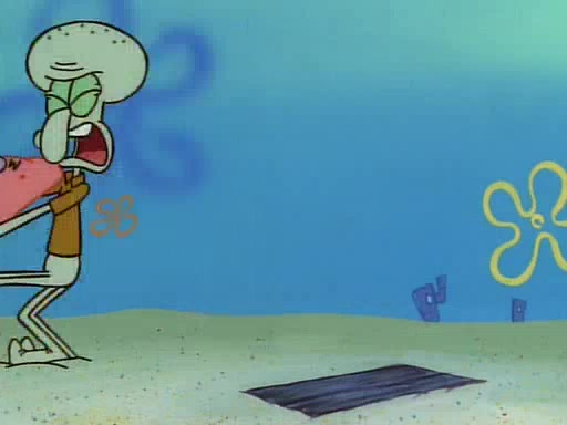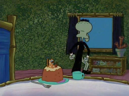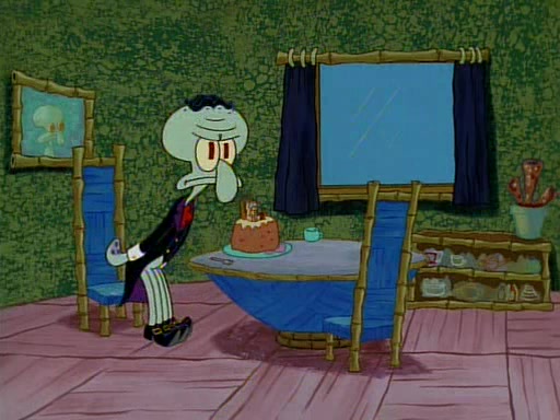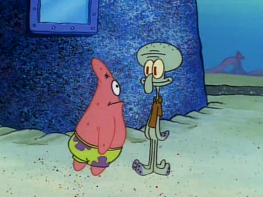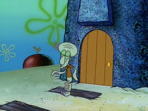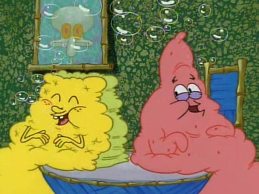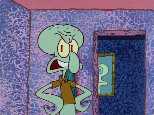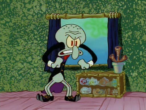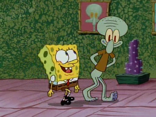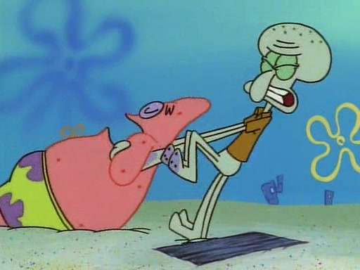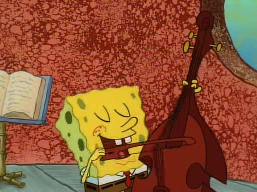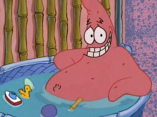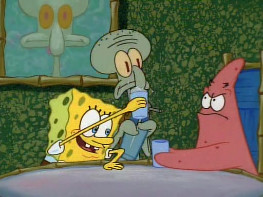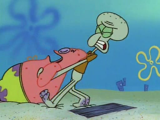 Inside, SpongeBob plays a song (badly) for Squidward on his Double Bass (which he thinks is a bassinet) and when Patrick appears in the window and interrupts the song, SpongeBob destroys the instrument in a fit of rage, and Squidward kicks him out. Squidward then tries to take a bath but Patrick is in the tub. SpongeBob appears in the window and sees this, and he and Patrick begin arguing again, driving Squidward crazy.