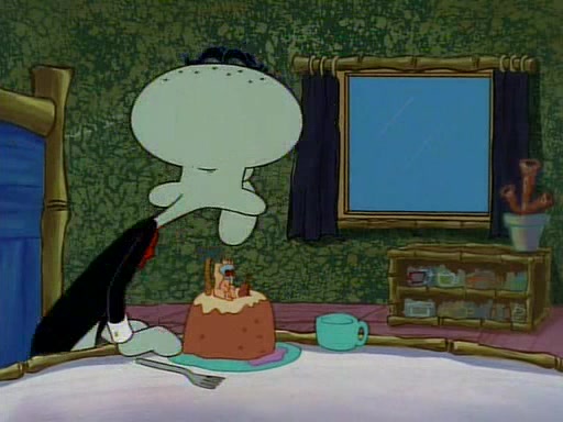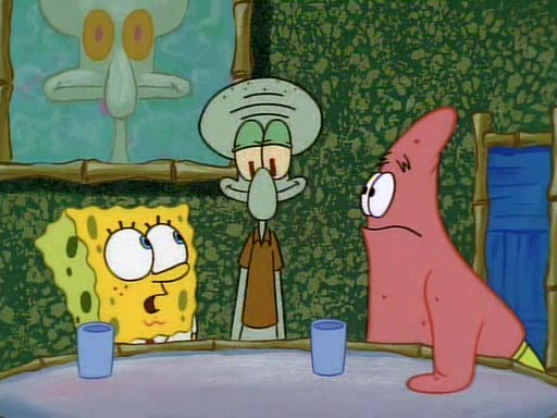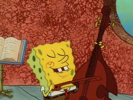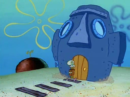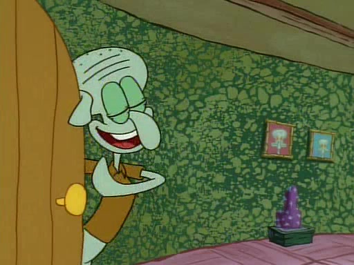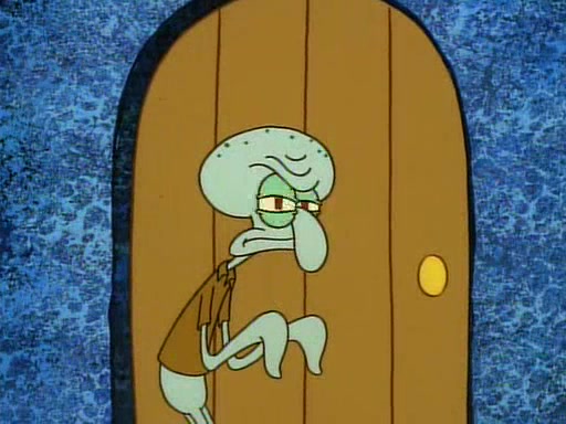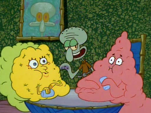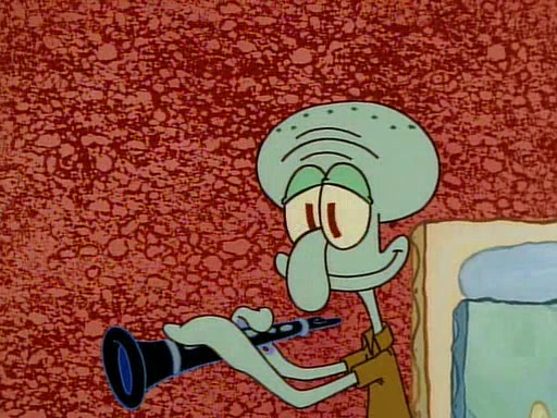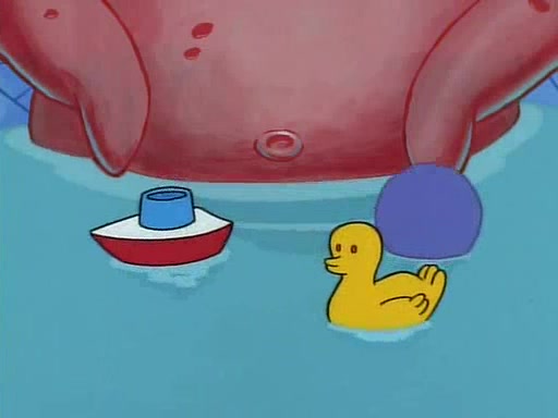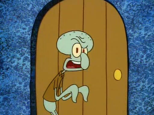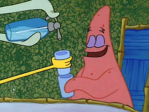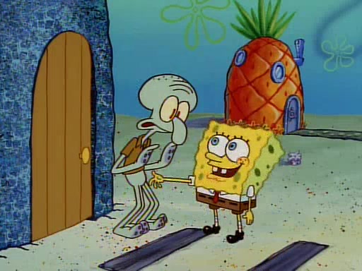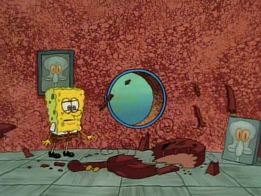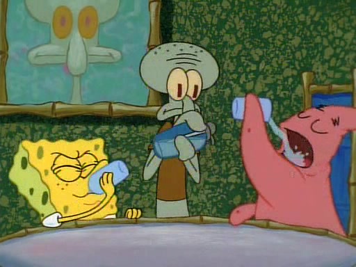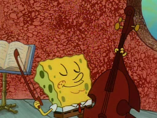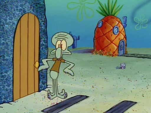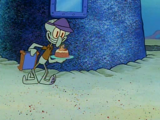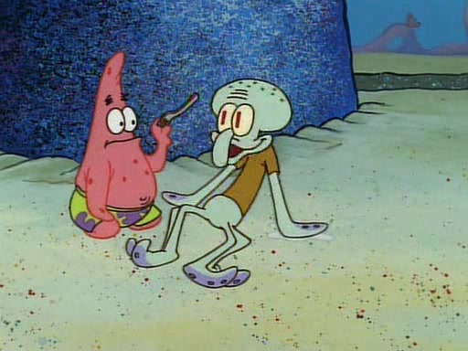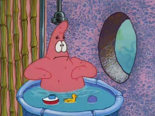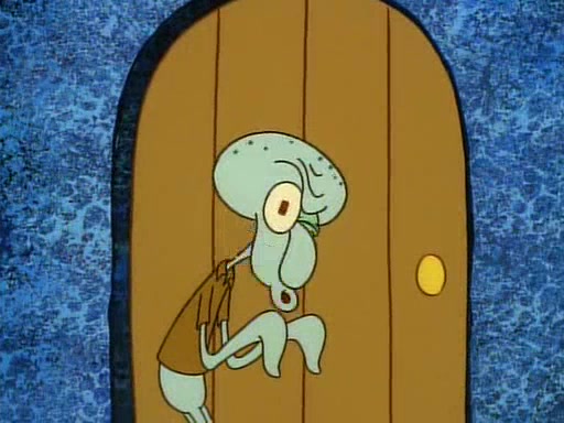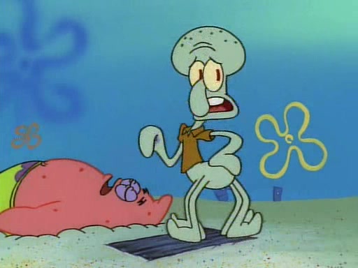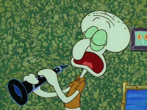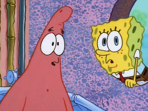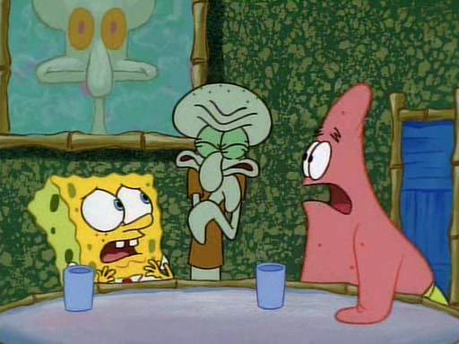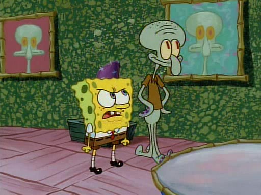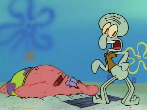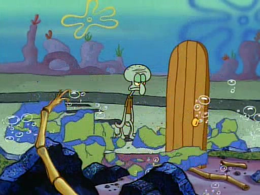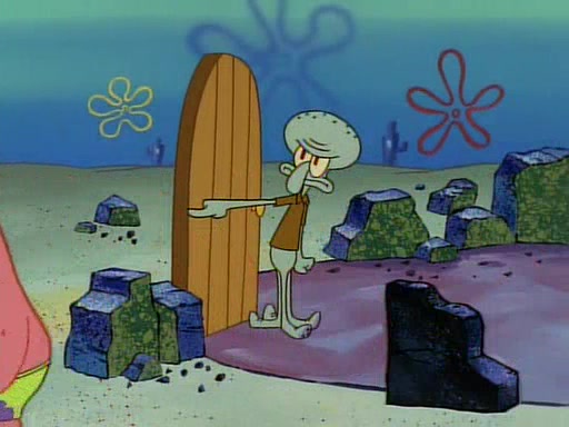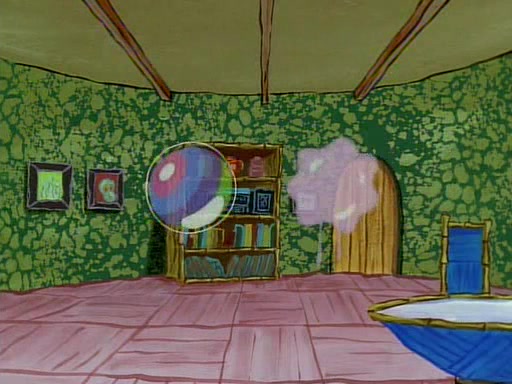 Inside, SpongeBob plays a song (badly) for Squidward on his Double Bass (which he thinks is a bassinet) and when Patrick appears in the window and interrupts the song, SpongeBob destroys the instrument in a fit of rage, and Squidward kicks him out. Squidward then tries to take a bath but Patrick is in the tub. SpongeBob appears in the window and sees this, and he and Patrick begin arguing again, driving Squidward crazy.
