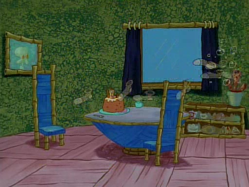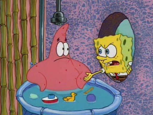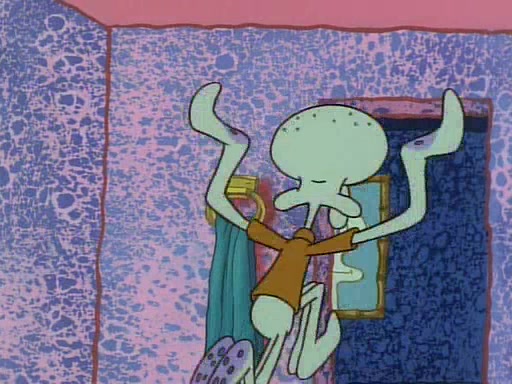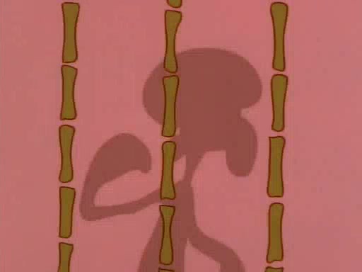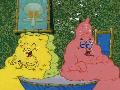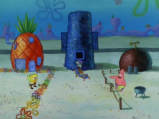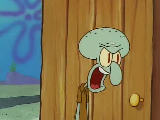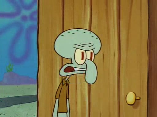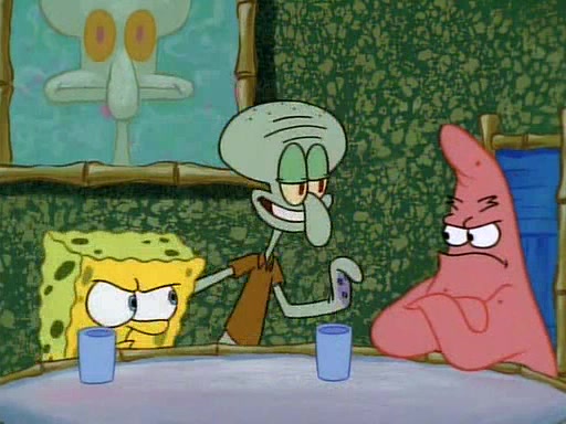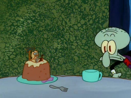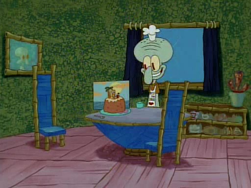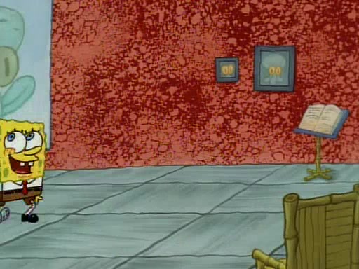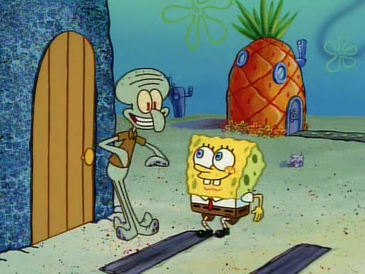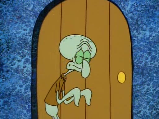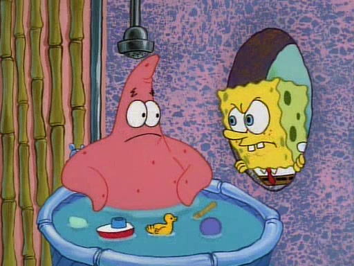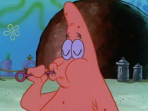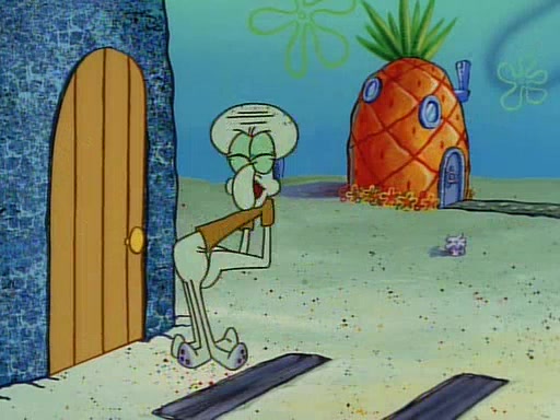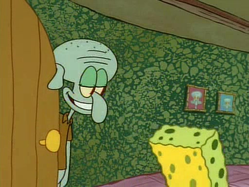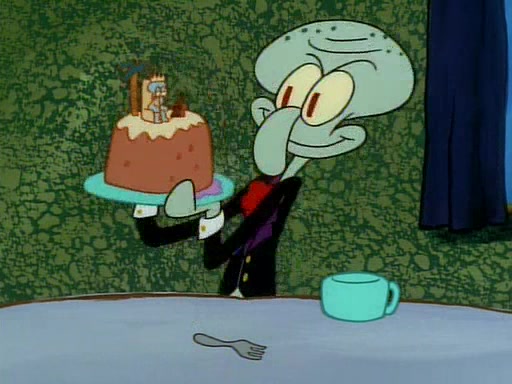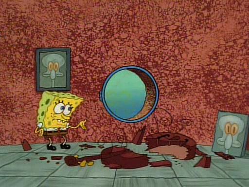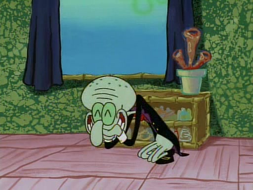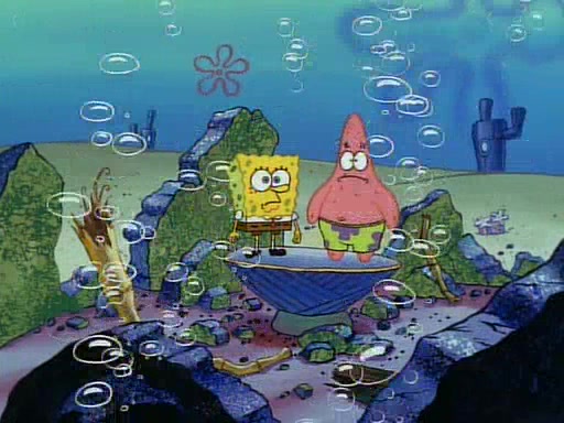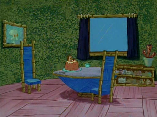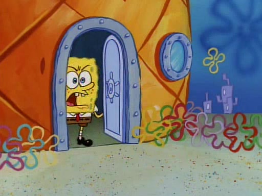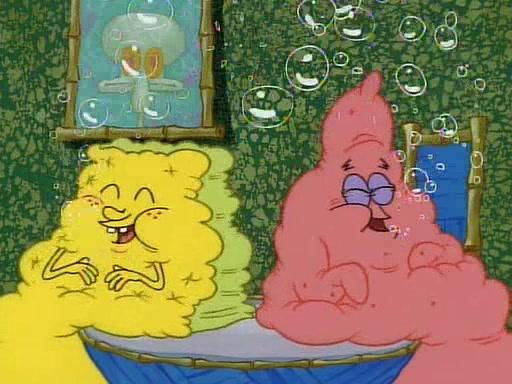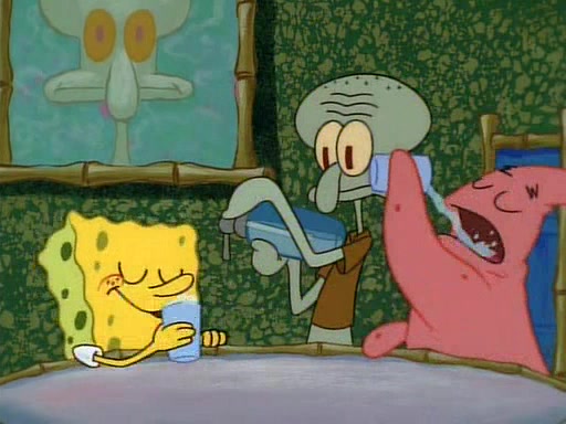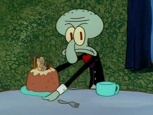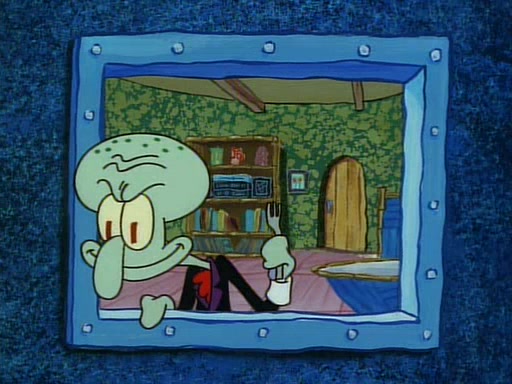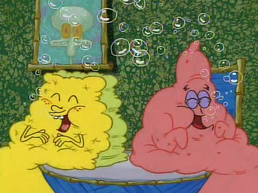 Inside, SpongeBob plays a song (badly) for Squidward on his Double Bass (which he thinks is a bassinet) and when Patrick appears in the window and interrupts the song, SpongeBob destroys the instrument in a fit of rage, and Squidward kicks him out. Squidward then tries to take a bath but Patrick is in the tub. SpongeBob appears in the window and sees this, and he and Patrick begin arguing again, driving Squidward crazy.