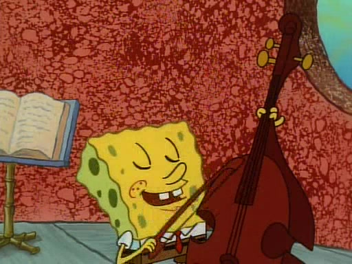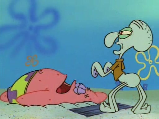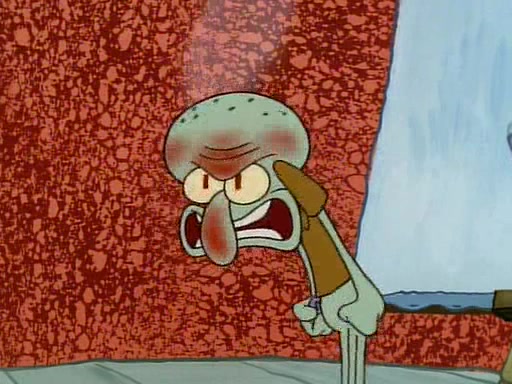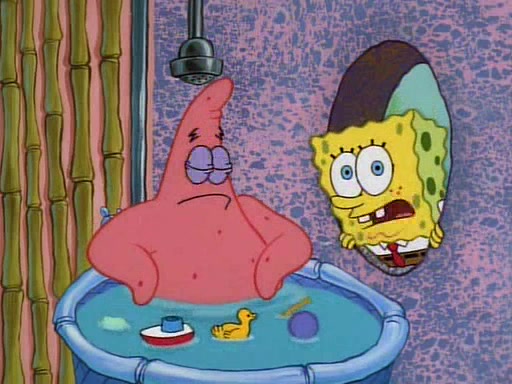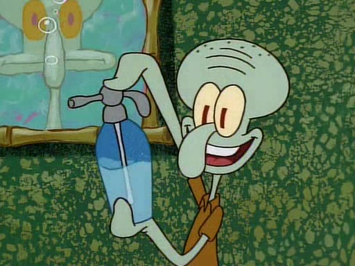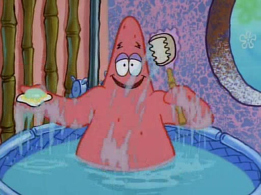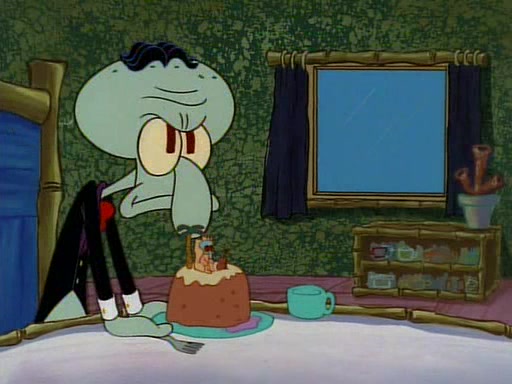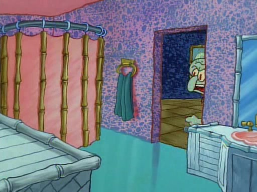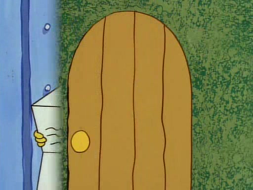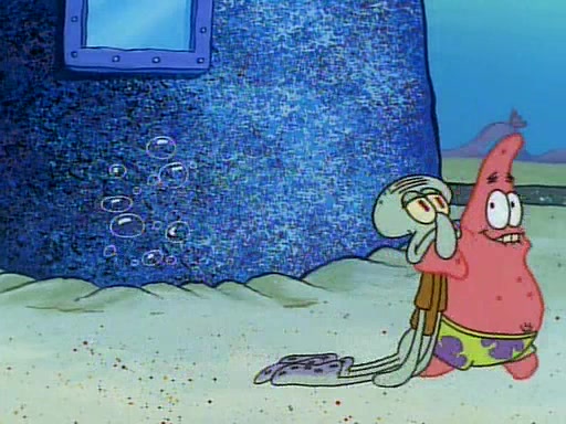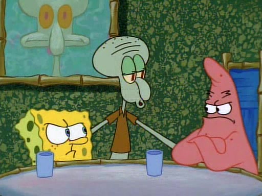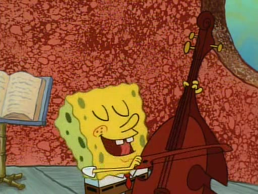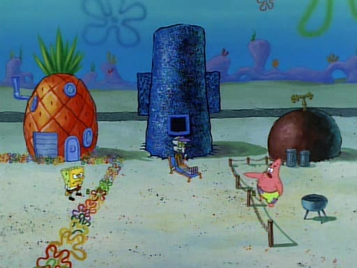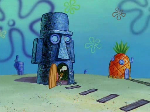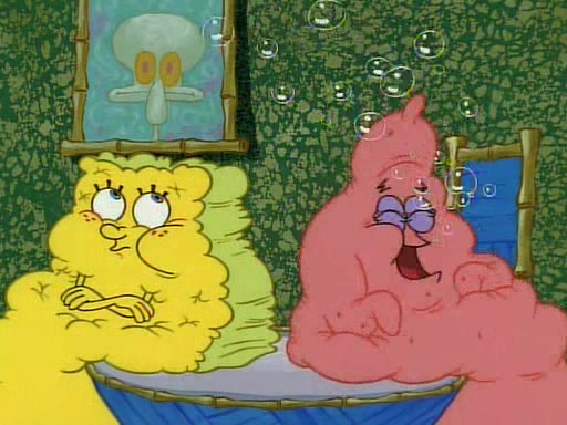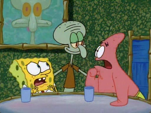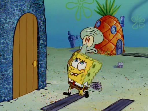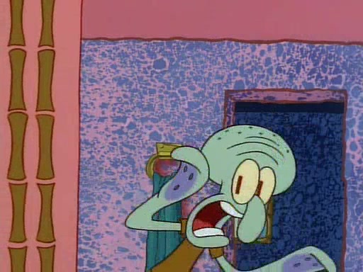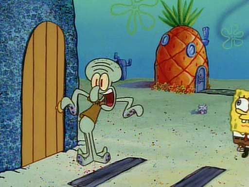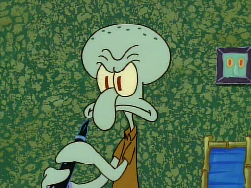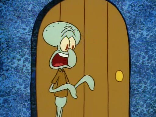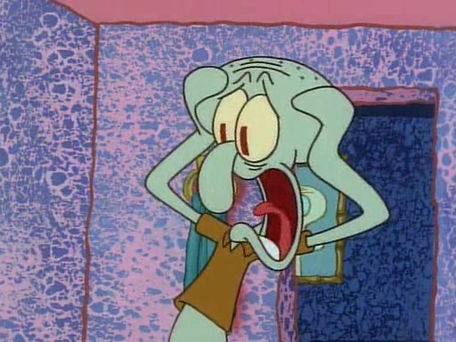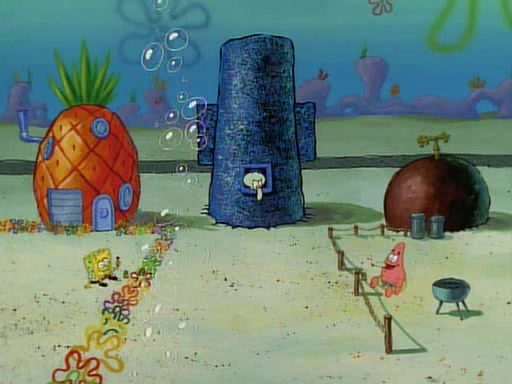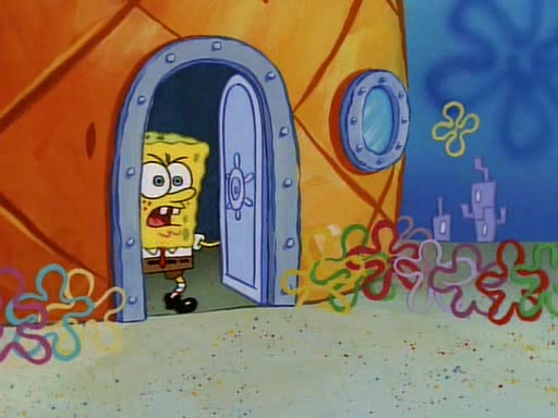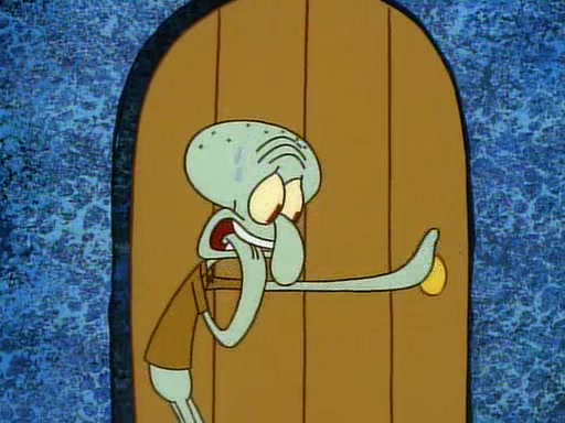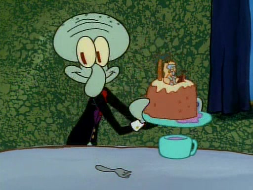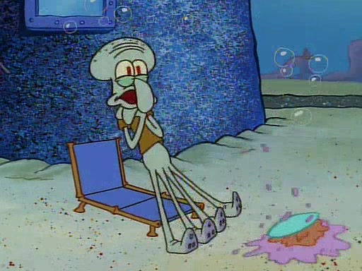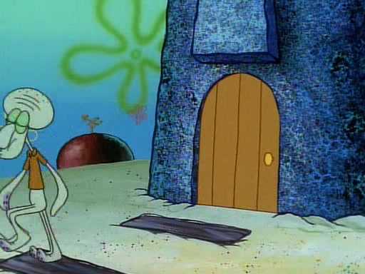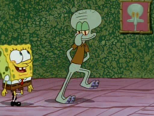 Inside, SpongeBob plays a song (badly) for Squidward on his Double Bass (which he thinks is a bassinet) and when Patrick appears in the window and interrupts the song, SpongeBob destroys the instrument in a fit of rage, and Squidward kicks him out. Squidward then tries to take a bath but Patrick is in the tub. SpongeBob appears in the window and sees this, and he and Patrick begin arguing again, driving Squidward crazy.