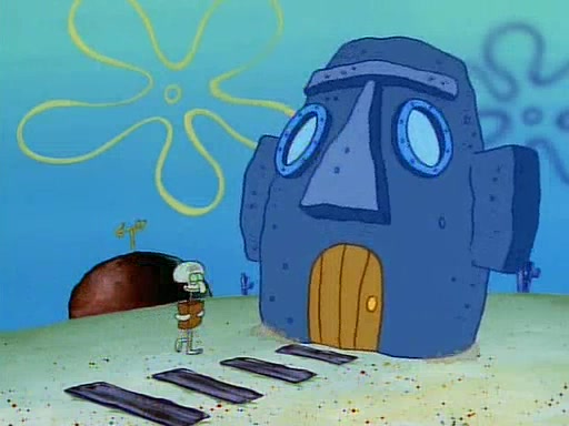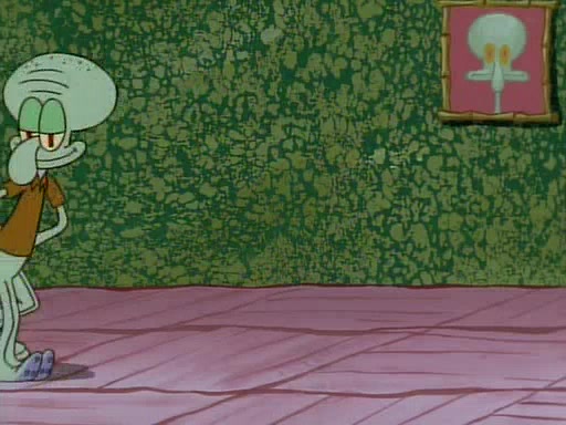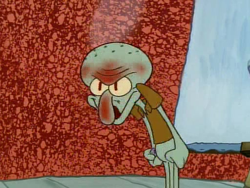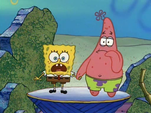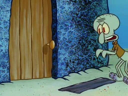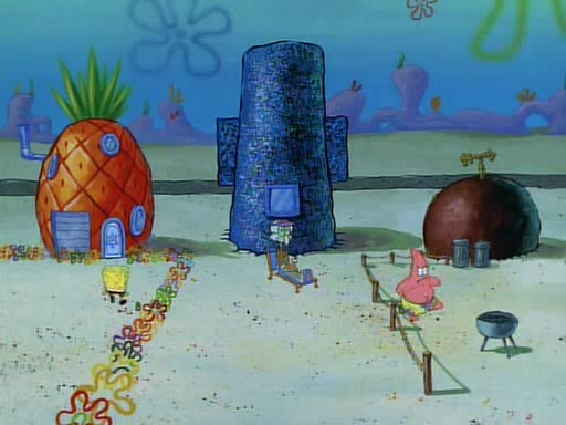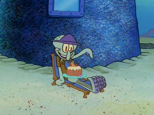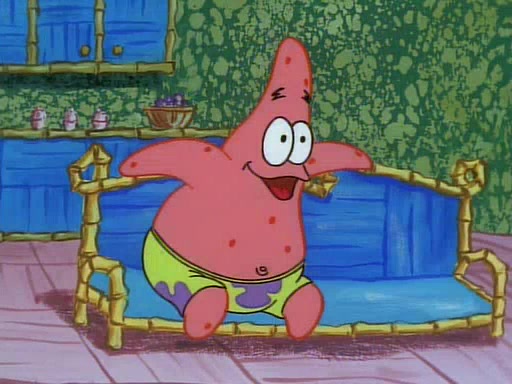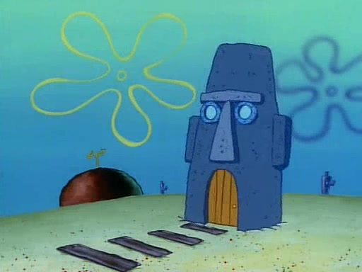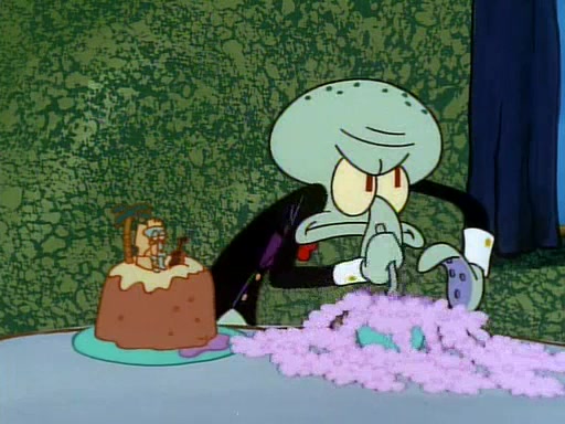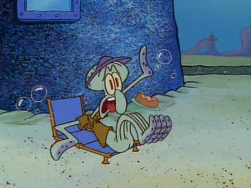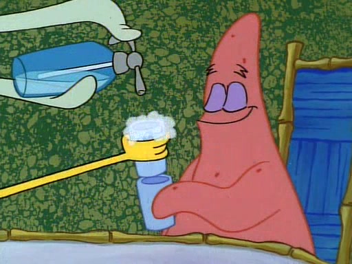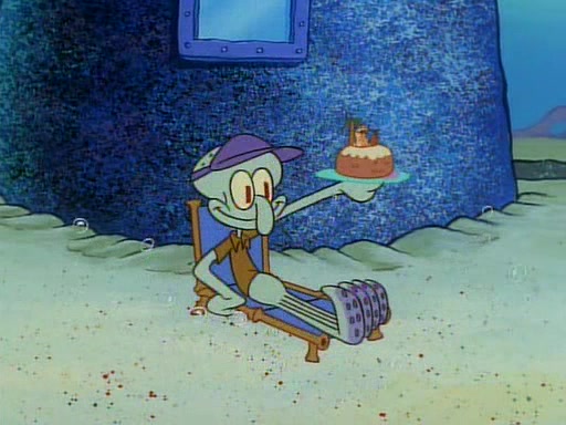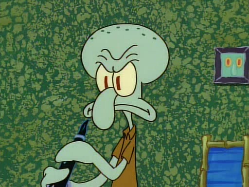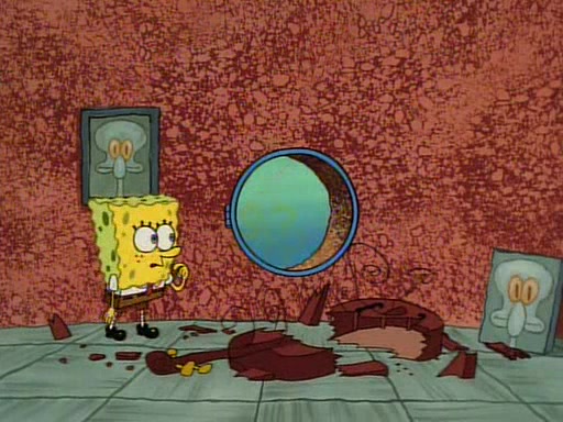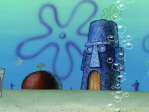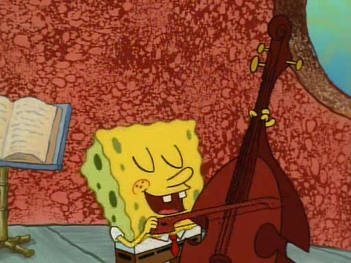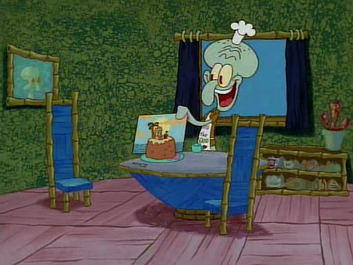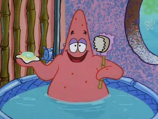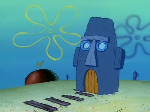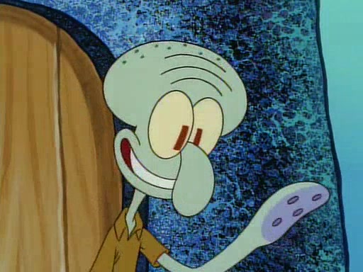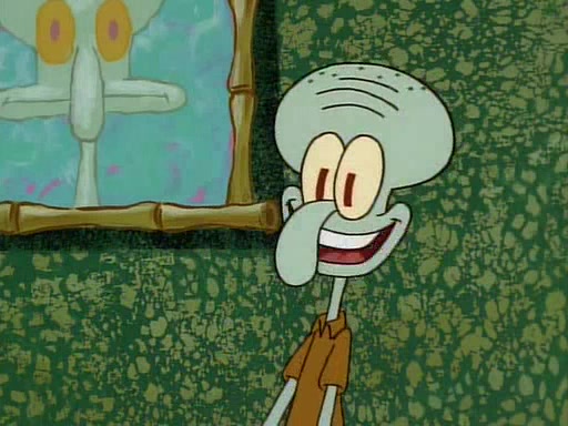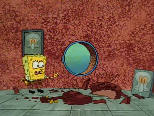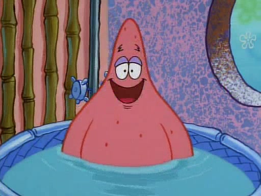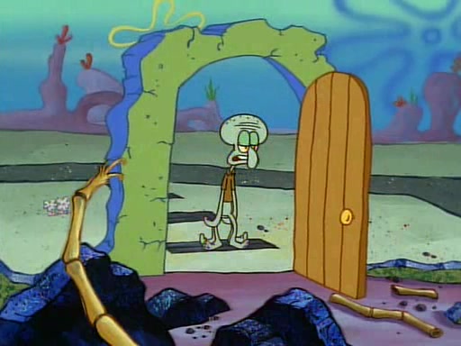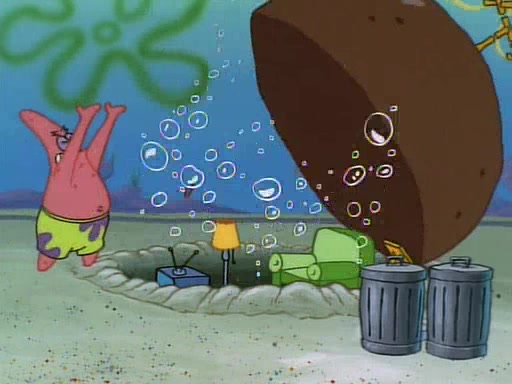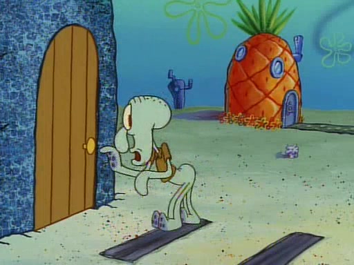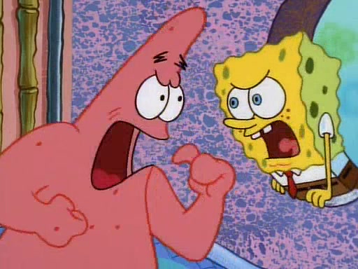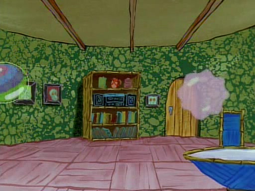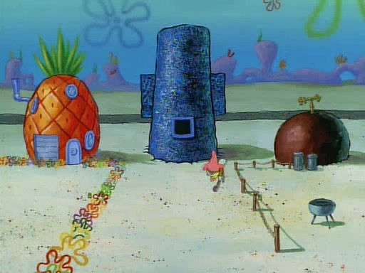 Inside, SpongeBob plays a song (badly) for Squidward on his Double Bass (which he thinks is a bassinet) and when Patrick appears in the window and interrupts the song, SpongeBob destroys the instrument in a fit of rage, and Squidward kicks him out. Squidward then tries to take a bath but Patrick is in the tub. SpongeBob appears in the window and sees this, and he and Patrick begin arguing again, driving Squidward crazy.