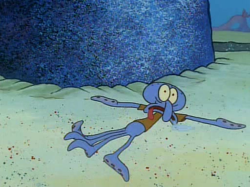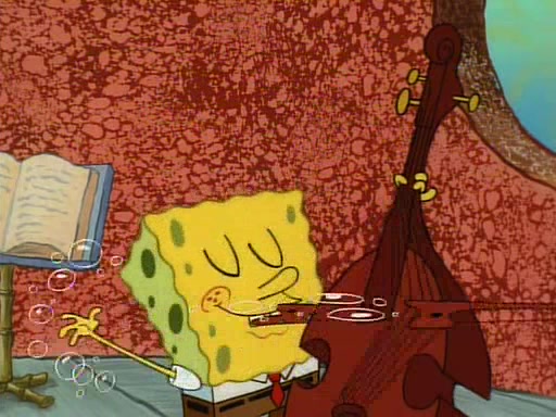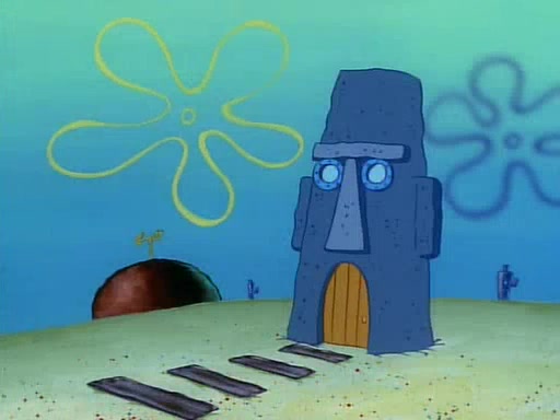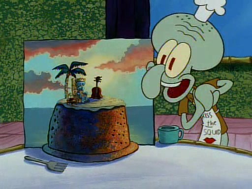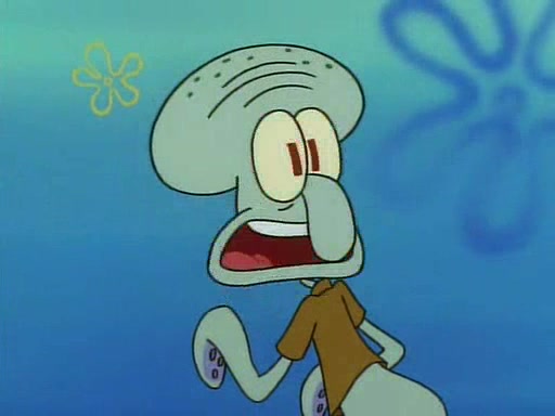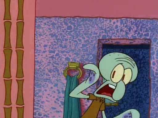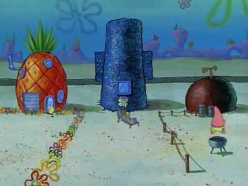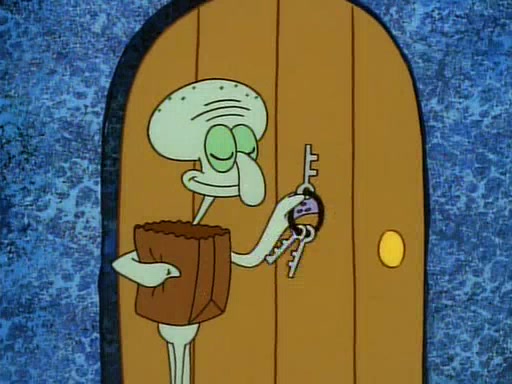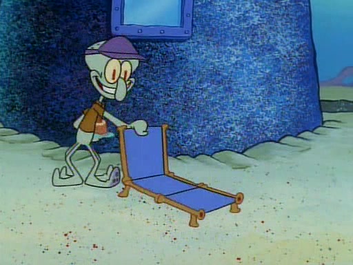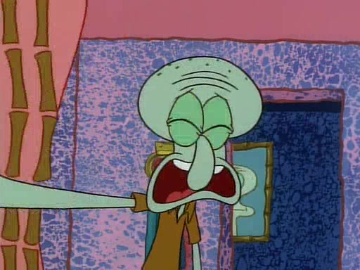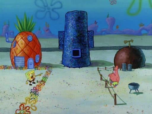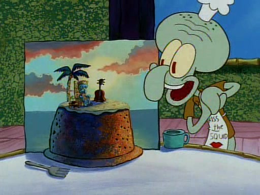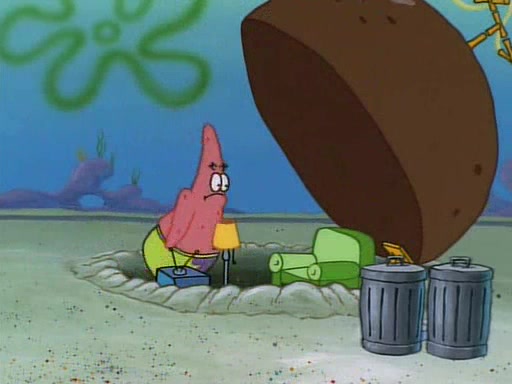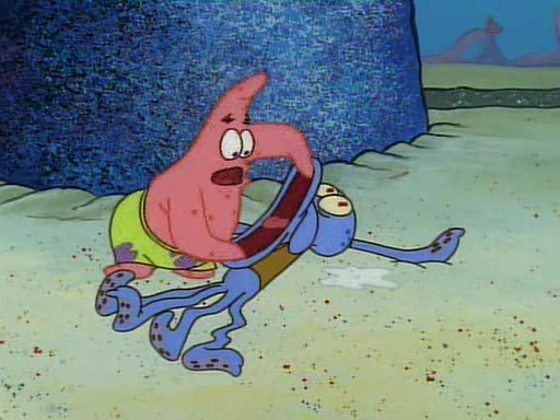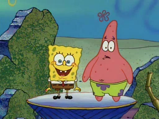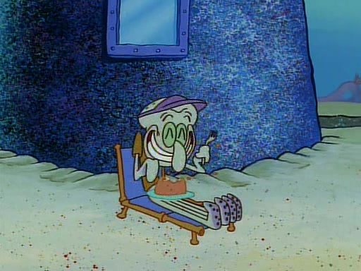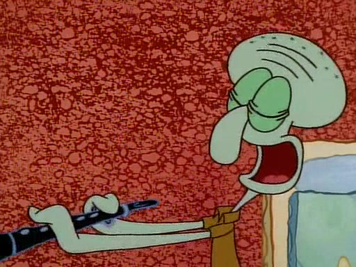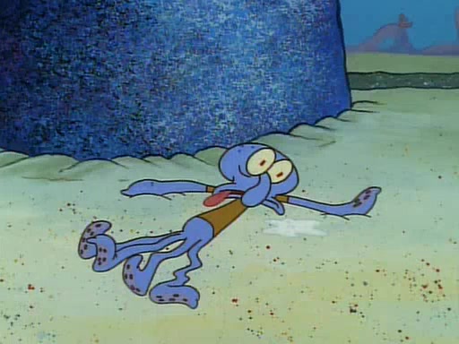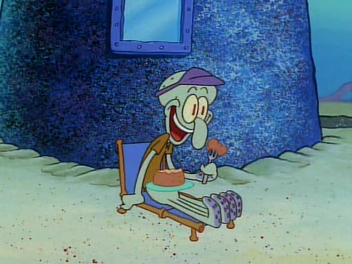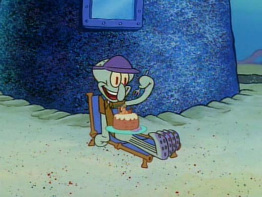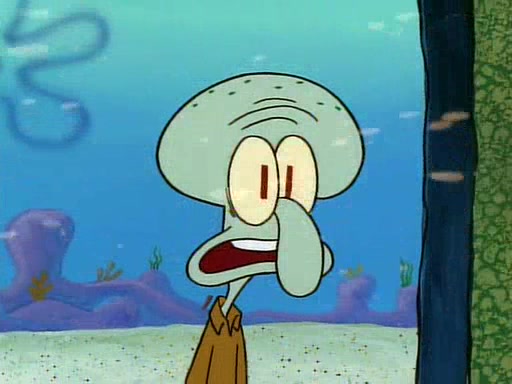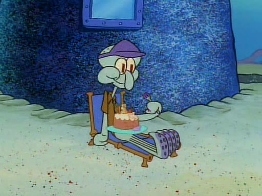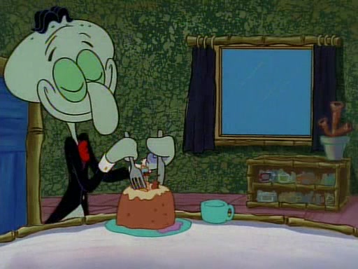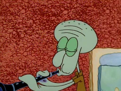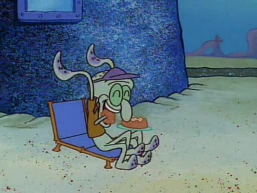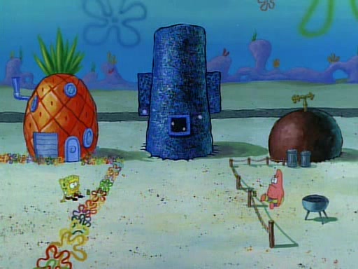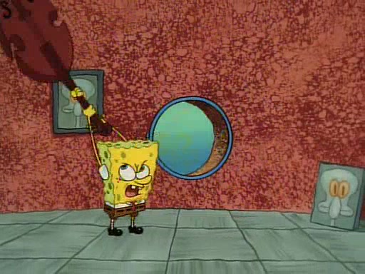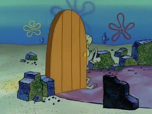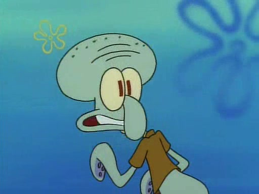 Inside, SpongeBob plays a song (badly) for Squidward on his Double Bass (which he thinks is a bassinet) and when Patrick appears in the window and interrupts the song, SpongeBob destroys the instrument in a fit of rage, and Squidward kicks him out. Squidward then tries to take a bath but Patrick is in the tub. SpongeBob appears in the window and sees this, and he and Patrick begin arguing again, driving Squidward crazy.
