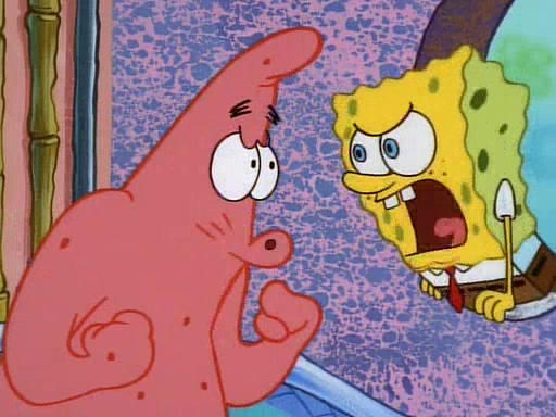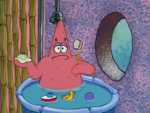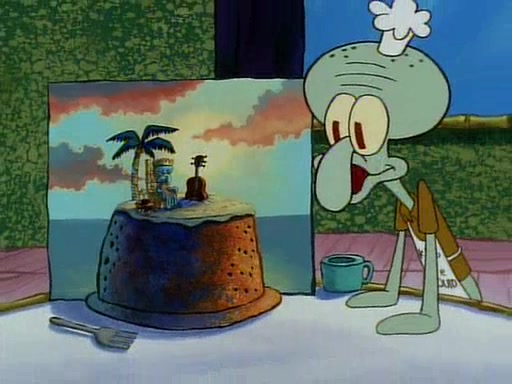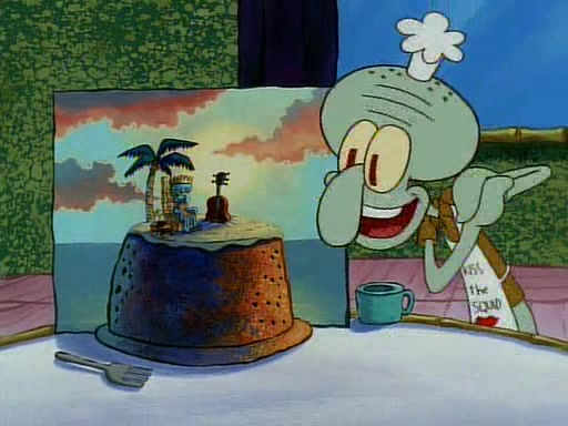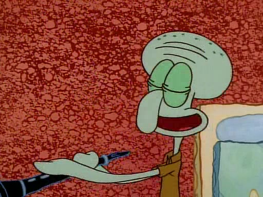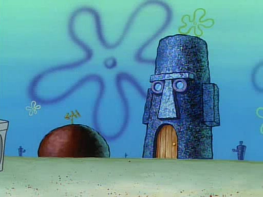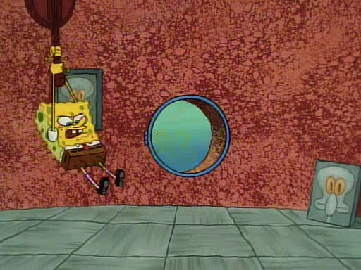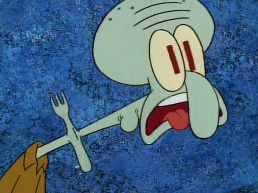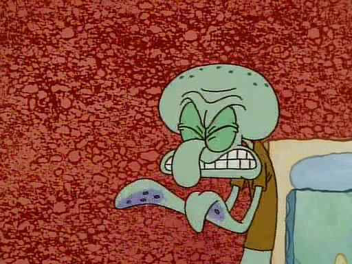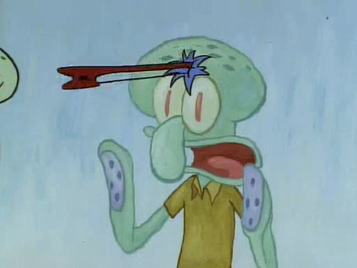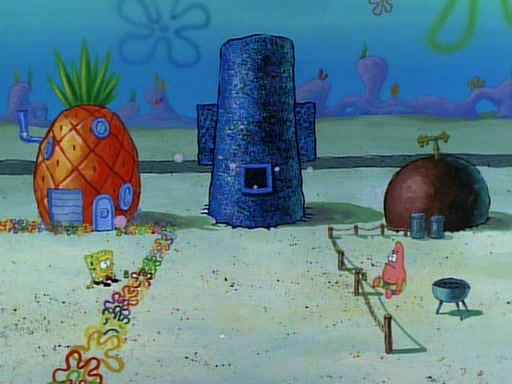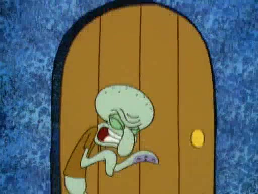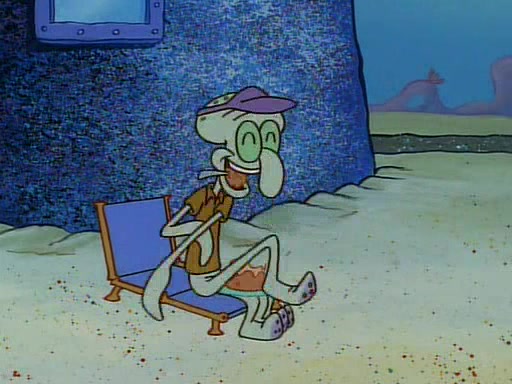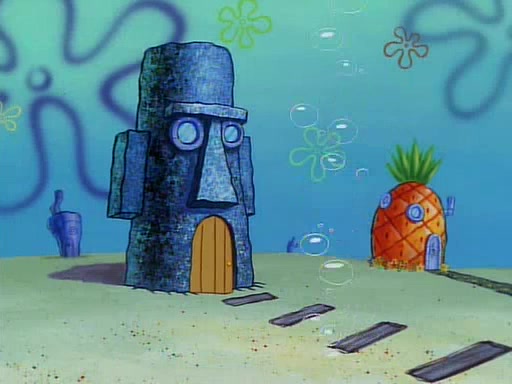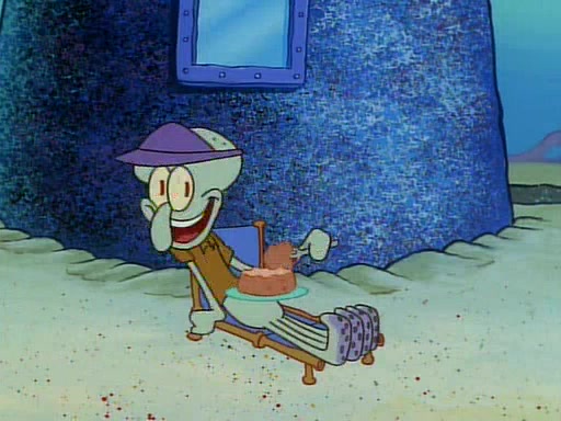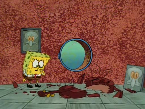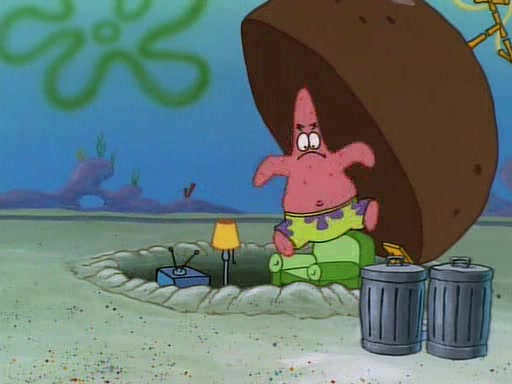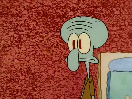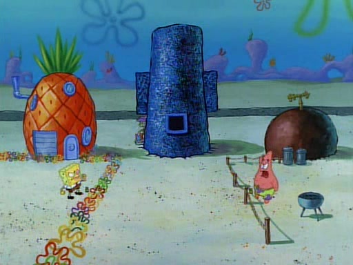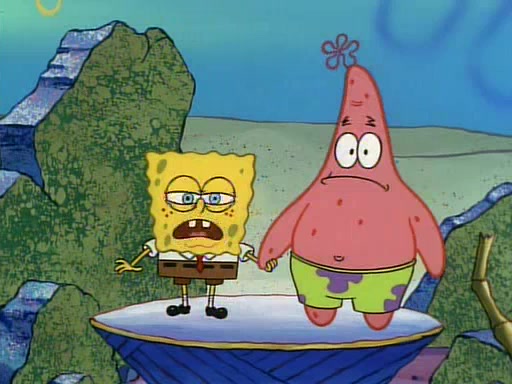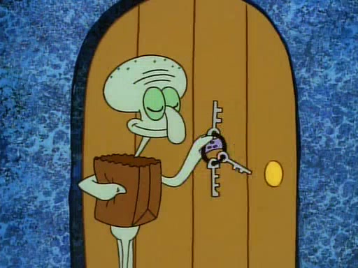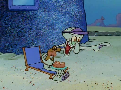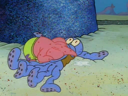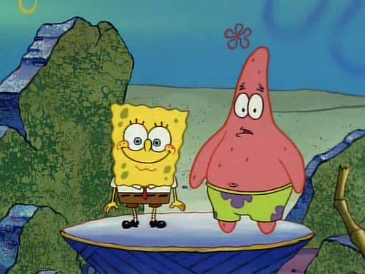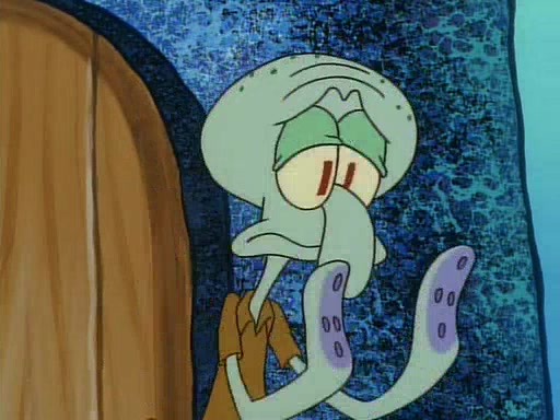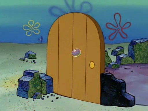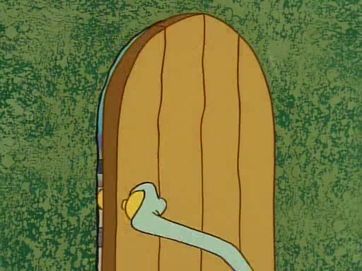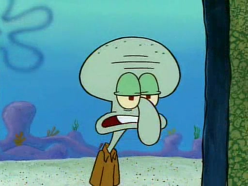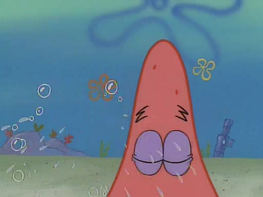 Inside, SpongeBob plays a song (badly) for Squidward on his Double Bass (which he thinks is a bassinet) and when Patrick appears in the window and interrupts the song, SpongeBob destroys the instrument in a fit of rage, and Squidward kicks him out. Squidward then tries to take a bath but Patrick is in the tub. SpongeBob appears in the window and sees this, and he and Patrick begin arguing again, driving Squidward crazy.
