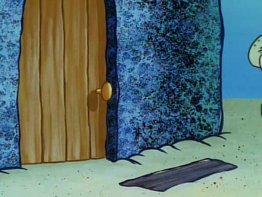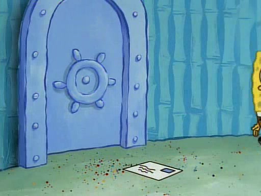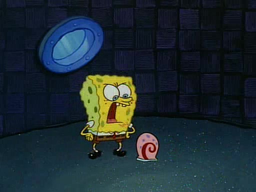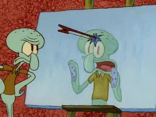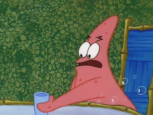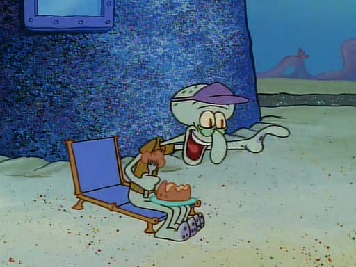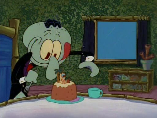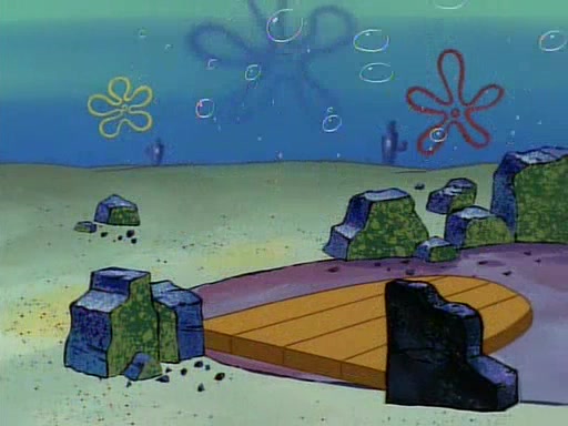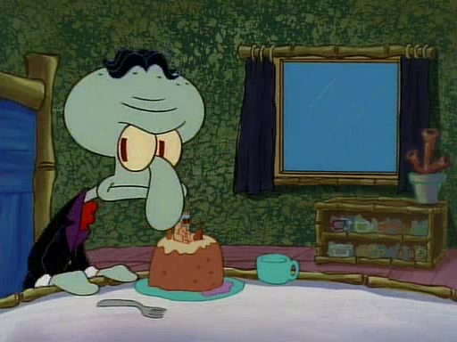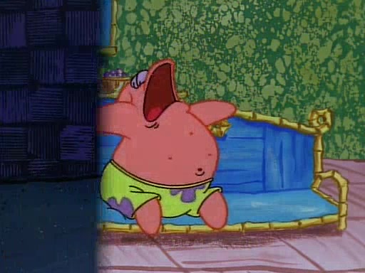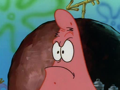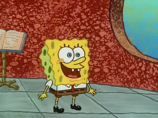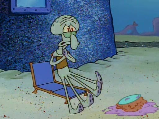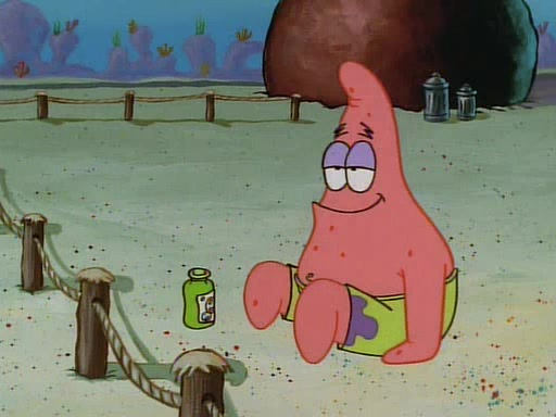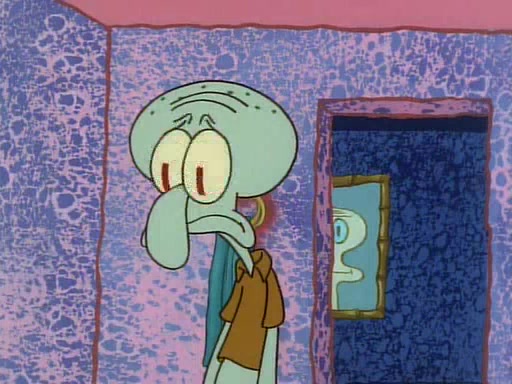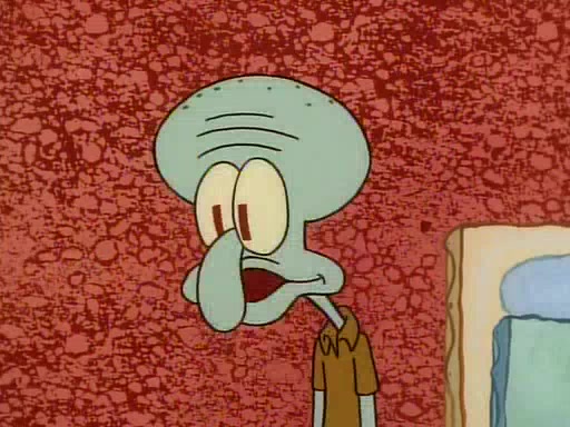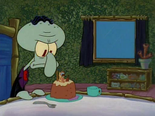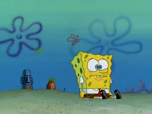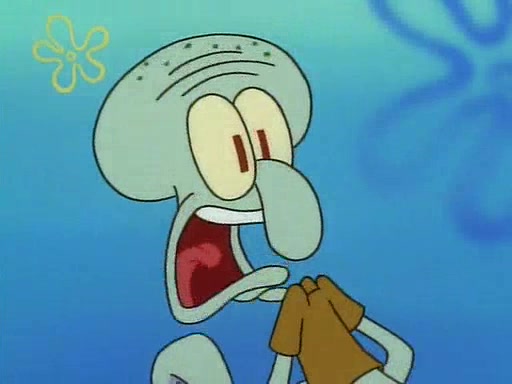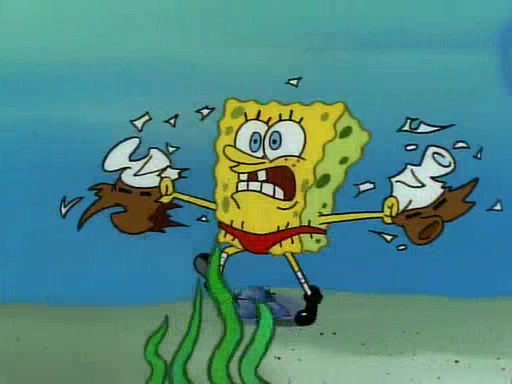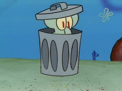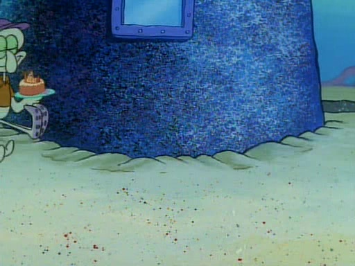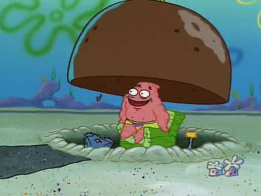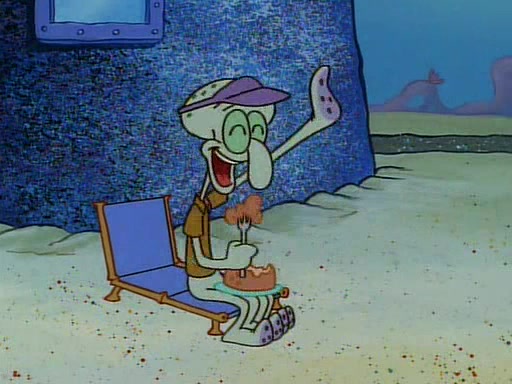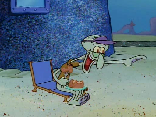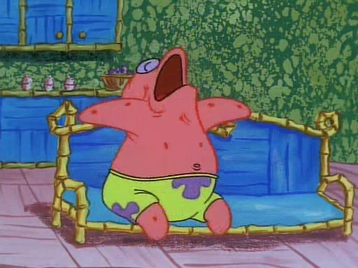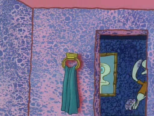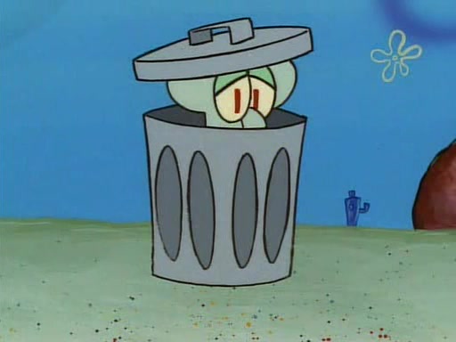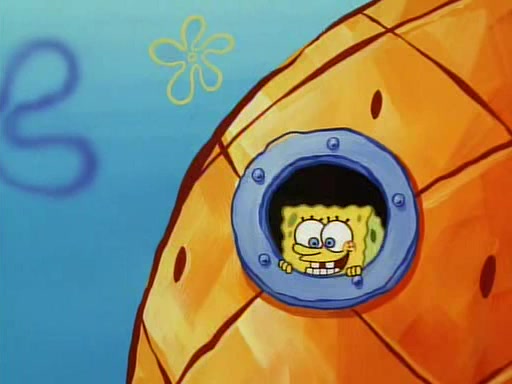 Inside, SpongeBob plays a song (badly) for Squidward on his Double Bass (which he thinks is a bassinet) and when Patrick appears in the window and interrupts the song, SpongeBob destroys the instrument in a fit of rage, and Squidward kicks him out. Squidward then tries to take a bath but Patrick is in the tub. SpongeBob appears in the window and sees this, and he and Patrick begin arguing again, driving Squidward crazy.