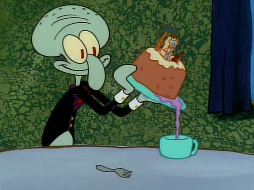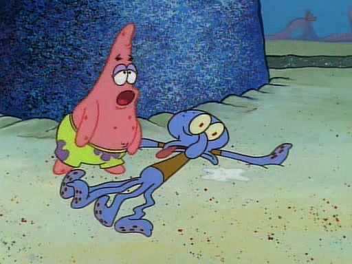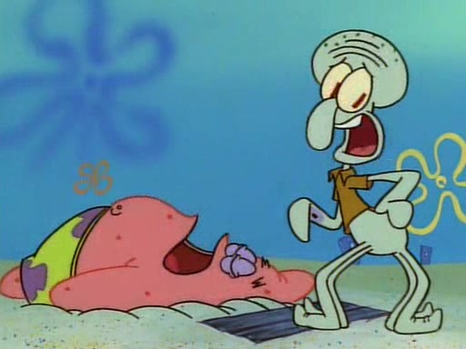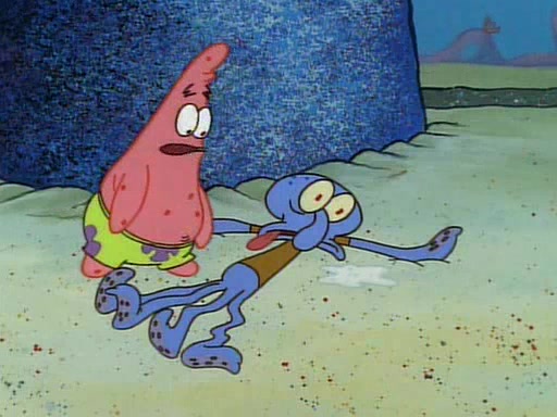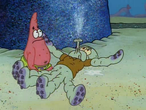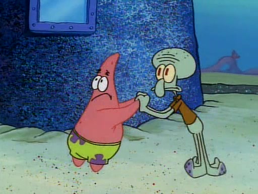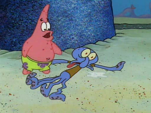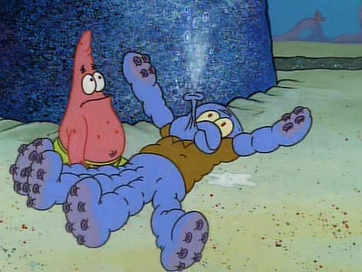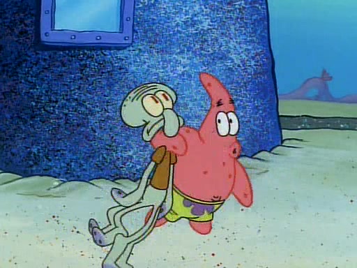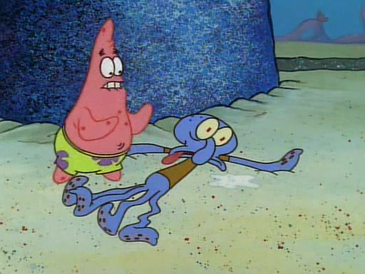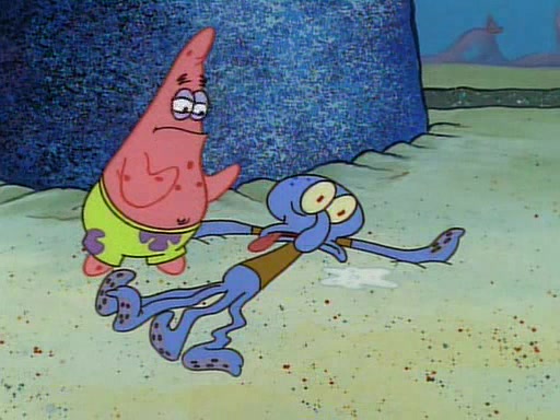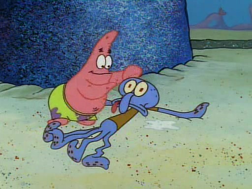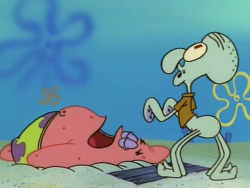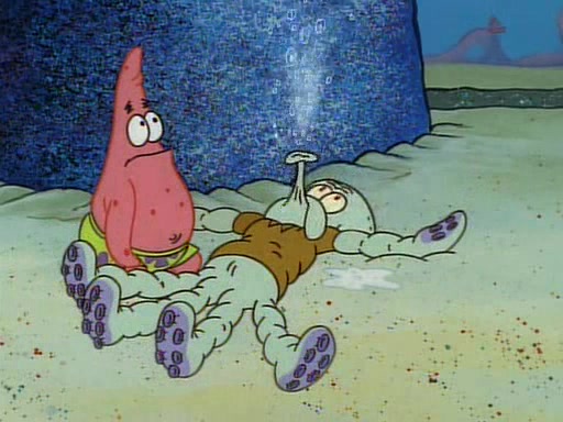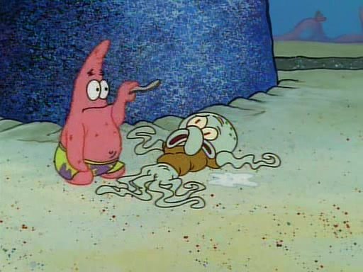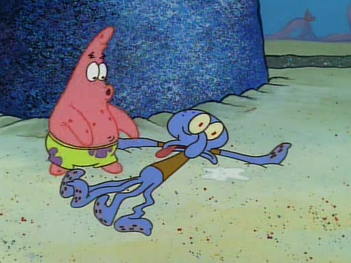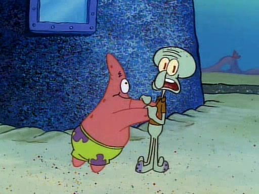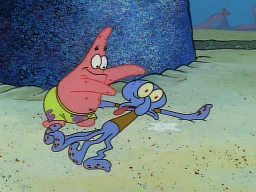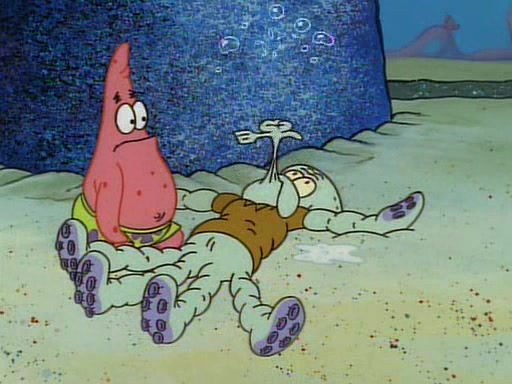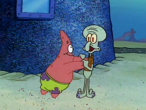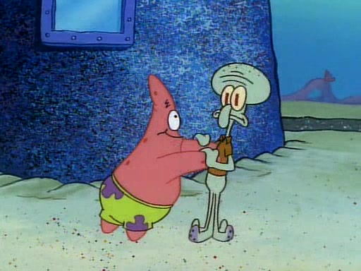 Annoyed by that, Squidward makes bubbles of his own, imitating SpongeBob and Patrick, but insulting them both. Thinking the bubbles are from the other, SpongeBob and Patrick become angry and get into a fight, eventually declaring that they are no longer friends. Squidward comes outside and eats his soufflé while laughing, but in doing so, he chokes on the fork. Patrick saves his life by performing CPR on him (which is basically blowing him up and as the air comes out, the fork can be seen spluttering in between his lips) and becomes Squidward's friend. Inside Squidward's house, Patrick falls asleep while Squidward plays a composition called "Solitude in E Minor" on his clarinet, and Squidward pulls him outside. While doing this, he sprains his back, and SpongeBob sees this as an opportunity to help him. He bumps into Squidward's back and thus becomes Squidward's friend.