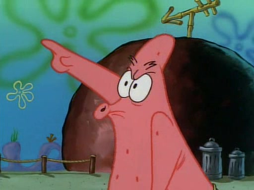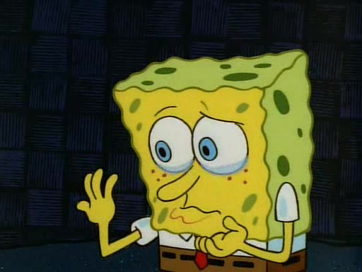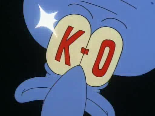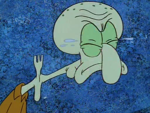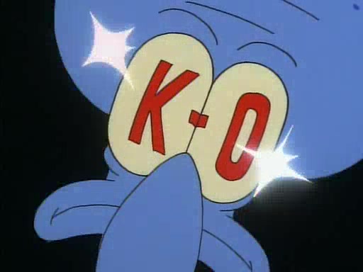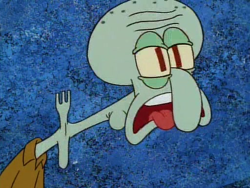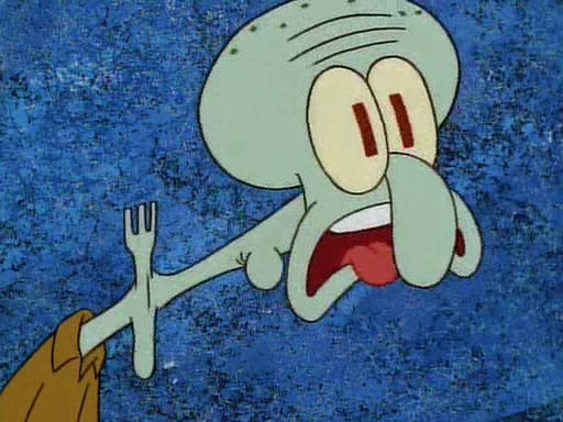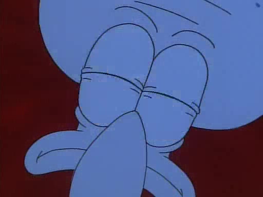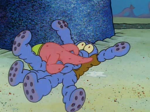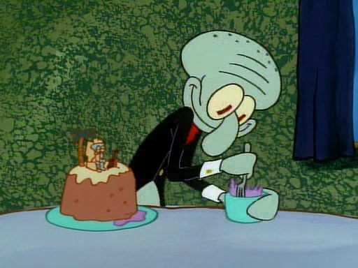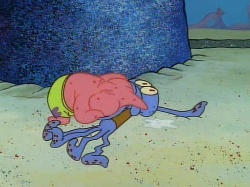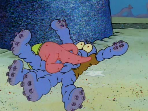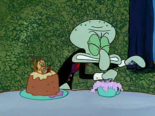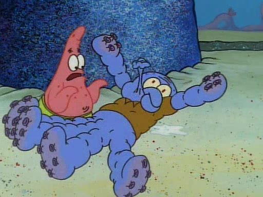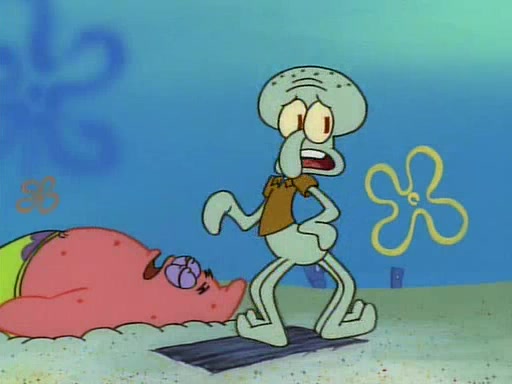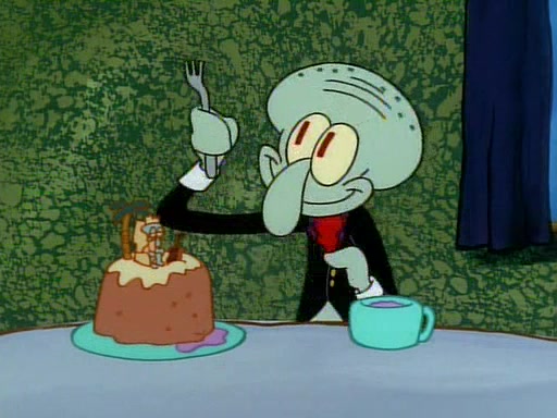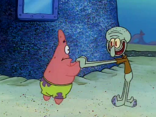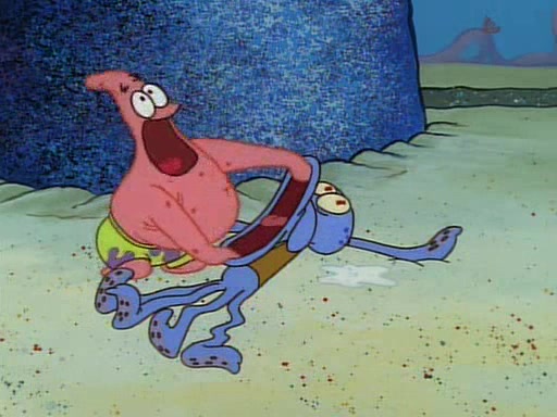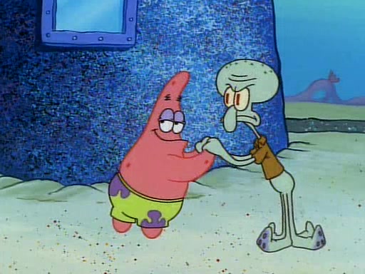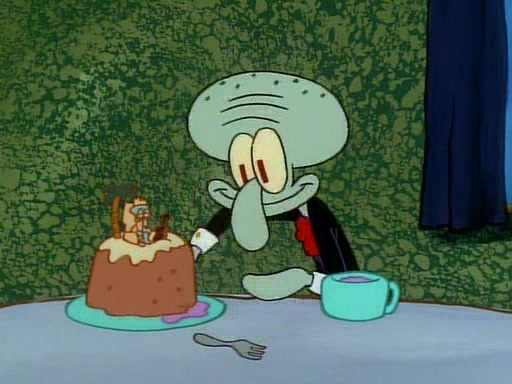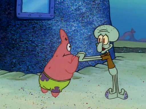 Annoyed by that, Squidward makes bubbles of his own, imitating SpongeBob and Patrick, but insulting them both. Thinking the bubbles are from the other, SpongeBob and Patrick become angry and get into a fight, eventually declaring that they are no longer friends. Squidward comes outside and eats his soufflé while laughing, but in doing so, he chokes on the fork. Patrick saves his life by performing CPR on him (which is basically blowing him up and as the air comes out, the fork can be seen spluttering in between his lips) and becomes Squidward's friend. Inside Squidward's house, Patrick falls asleep while Squidward plays a composition called "Solitude in E Minor" on his clarinet, and Squidward pulls him outside. While doing this, he sprains his back, and SpongeBob sees this as an opportunity to help him. He bumps into Squidward's back and thus becomes Squidward's friend.