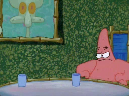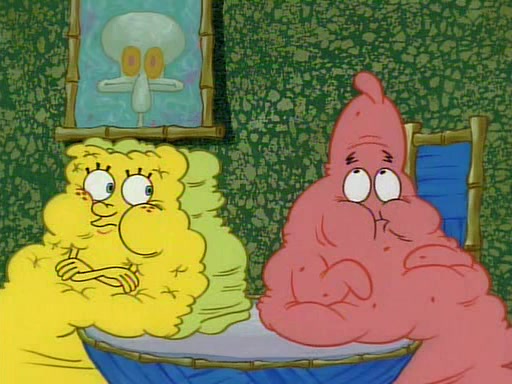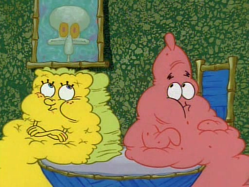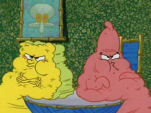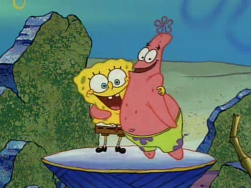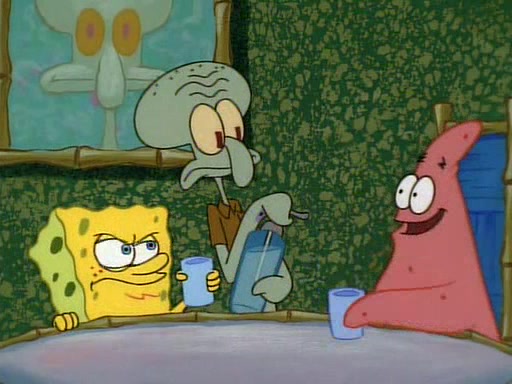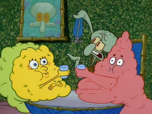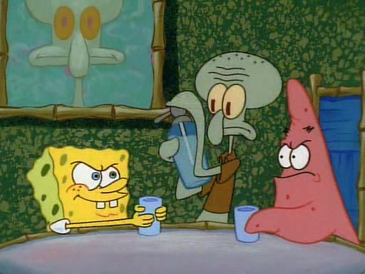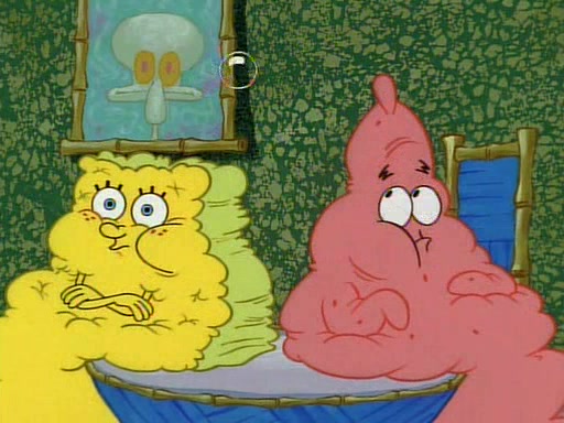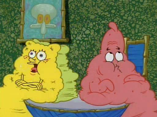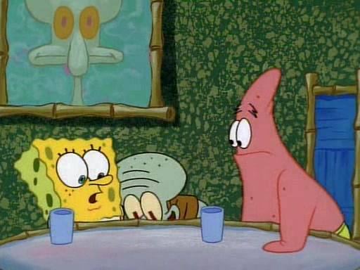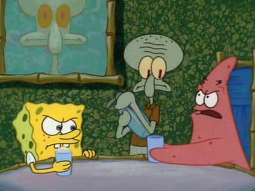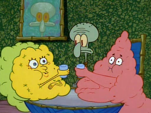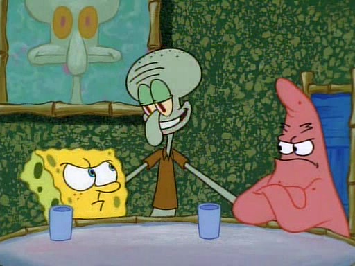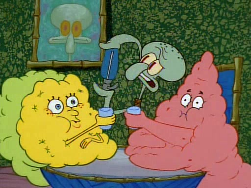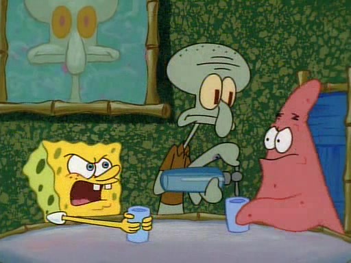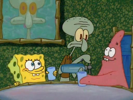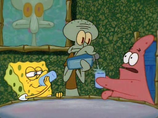 Squidward decides to invite Patrick and SpongeBob to a dinner party (without telling either of them that the other is coming) in order to repair their friendship. When they arrive, they are still mad at each other. Squidward tries to get them back together, but the situation devolves into a competition to see who can drink the most soda and thus become Squidward's best friend. Squidward runs out of soda and leaves to get some more. While he is gone, SpongeBob and Patrick, who have become literally inflated from all the soda, begin to hiccup small bubbles that make a burping sound when they burst. They find this amusing and become friends again, but they create so many bubbles that Squidward's house explodes. Squidward orders them out and slams the door. A bubble pops over the door, which then falls over on Squidward, moaning 'Ohhhh! My back...' as the episode ends.