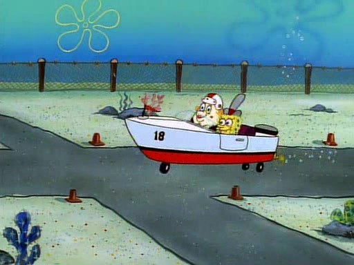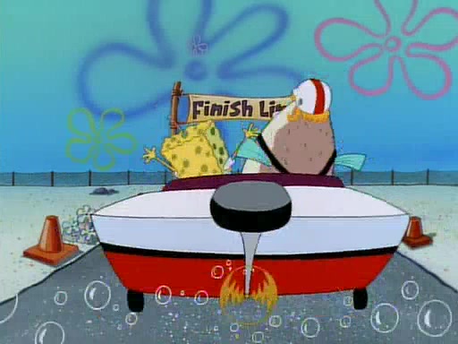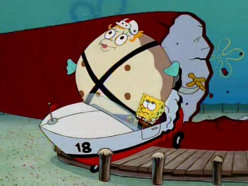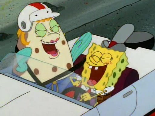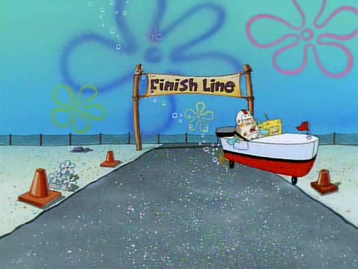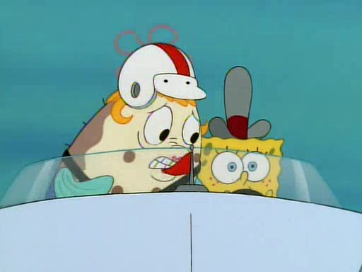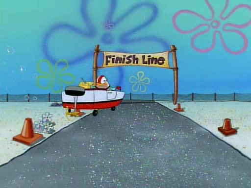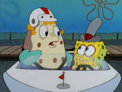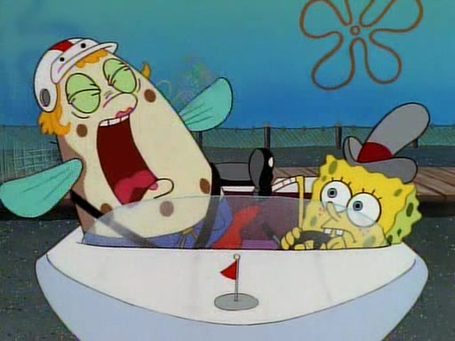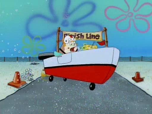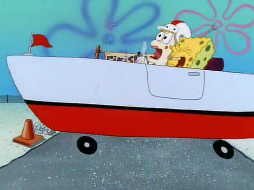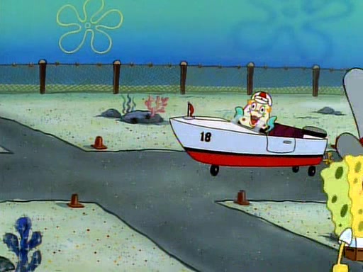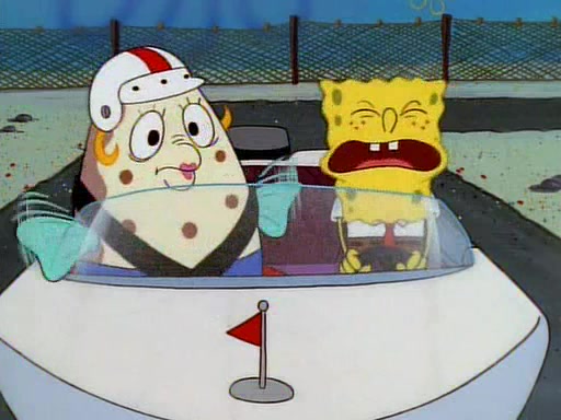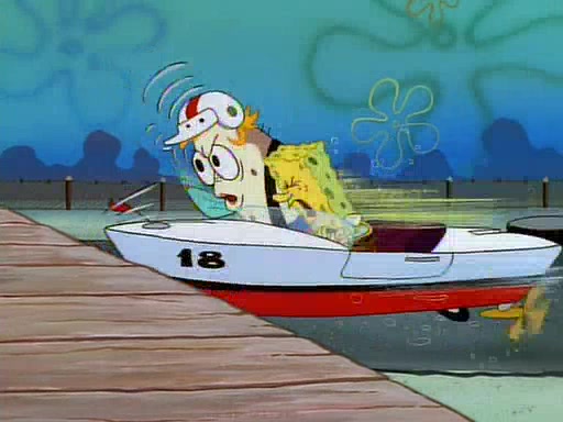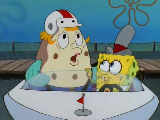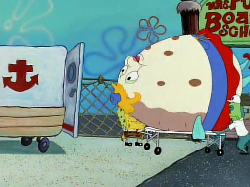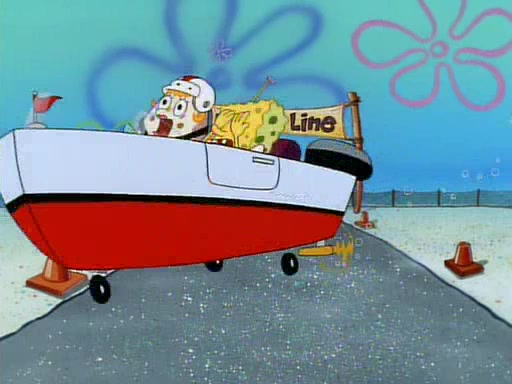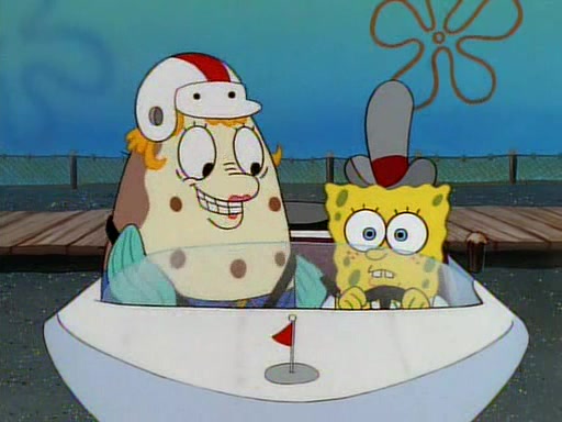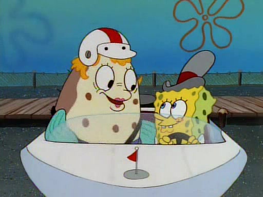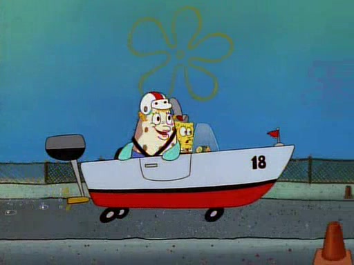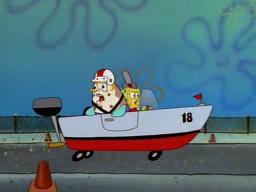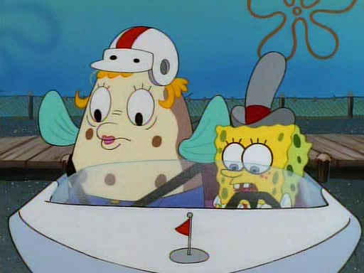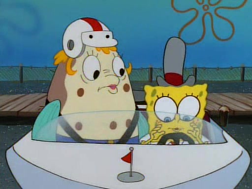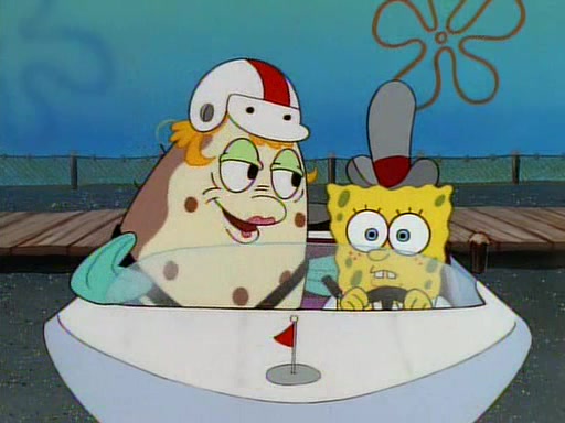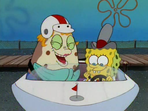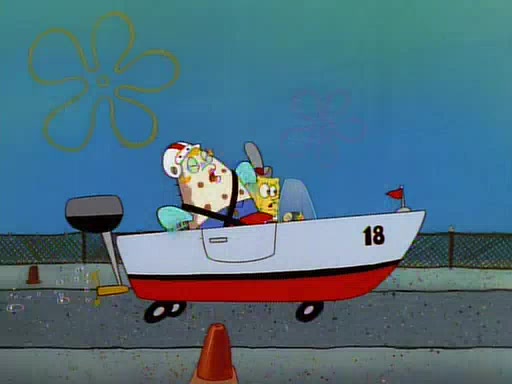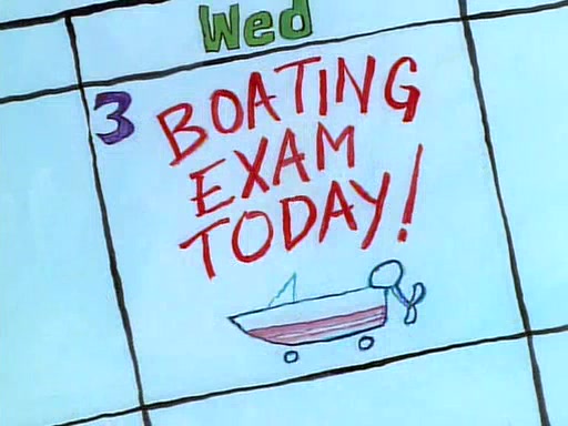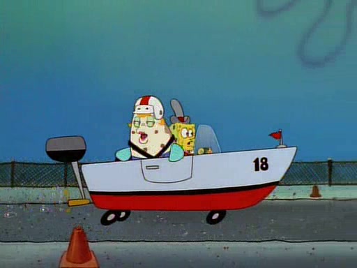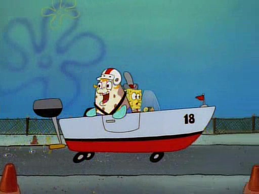 The next day, SpongeBob goes back to take the test again. When asked to start the boat, he initially panics, but Patrick's instructions keep him calm. Just after SpongeBob puts the boat in drive he almost floors the pedal but then Patrick goes, "Freeze mister!," and SpongeBob's foot stops just before it touches the pedal. Patrick then says, "Big toe." SpongeBob's toe then pops out of his shoe and it presses the pedal. This is followed by a video montage of SpongeBob acing the exam, interspersed with shots of Patrick eating SpongeBob's food and reading his diary while helping him. Mrs. Puff is floored by his sudden improvement and jokingly suggests that SpongeBob's success is due to an antenna under his hat through which "some guy miles away from here is giving you (him) all the answers." SpongeBob (and Patrick) finds this hilarious, until Mrs. Puff concludes, "But that would be cheating!" Upon realizing that he has been cheating, SpongeBob goes into hysterics, making Patrick realize that his method is bad, forcing Patrick to flee to his house, and driving wildly all over the course and sobbing while Mrs. Puff, in a panic, tries desperately to stop him but SpongeBob refuses to listen and crashes the boat and fails the test again, and the inflated Mrs. Puff is taken to the hospital. As he leaves boating school, he finds Gary riding his unicycle. SpongeBob rides off on it, with Gary atop his head, saying "Let's go surprise someone at the hospital!" thus ending the episode.