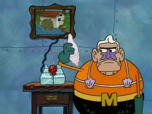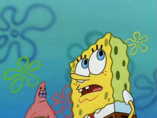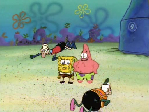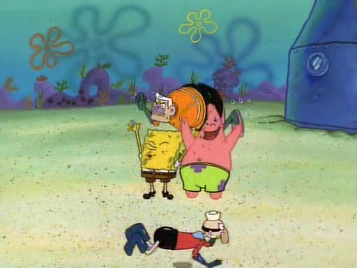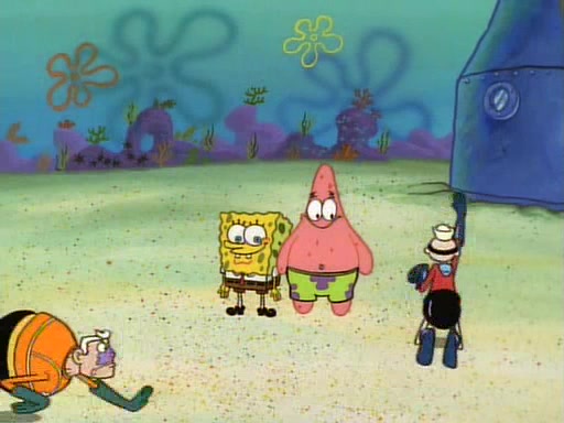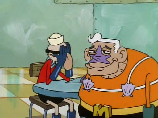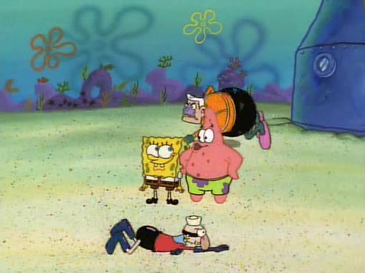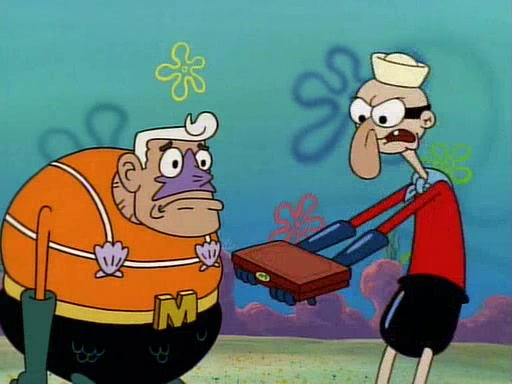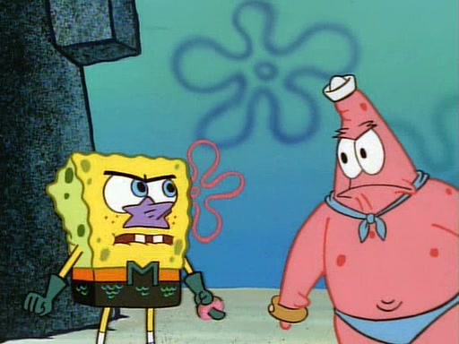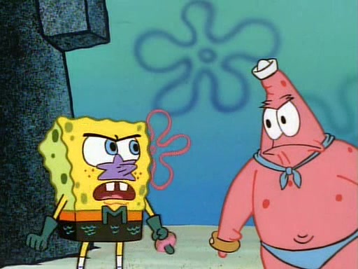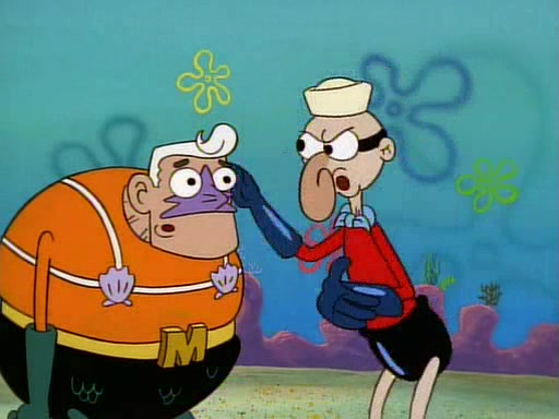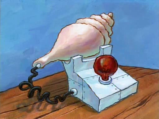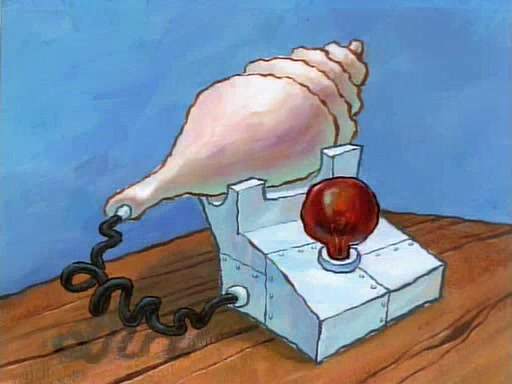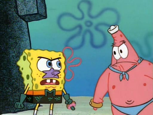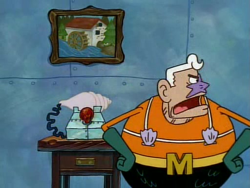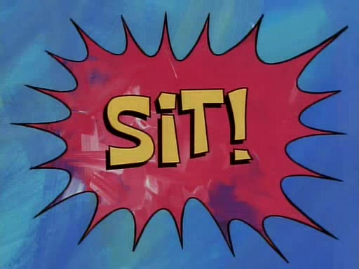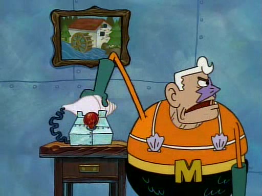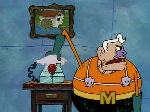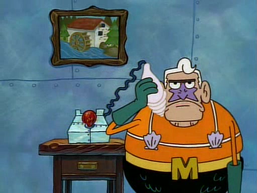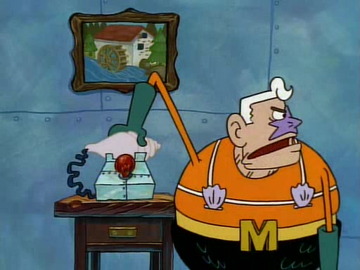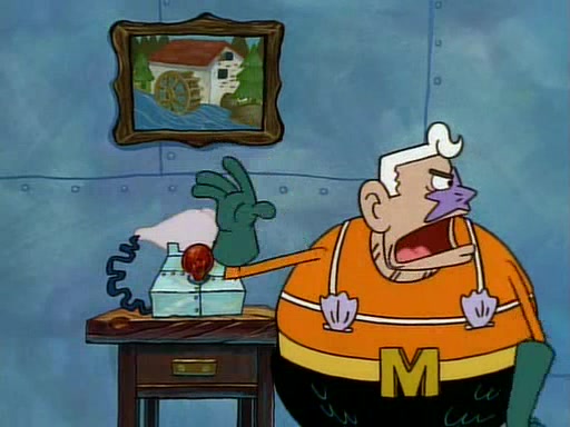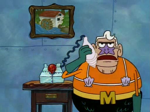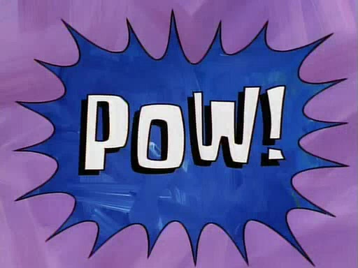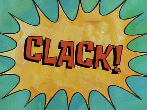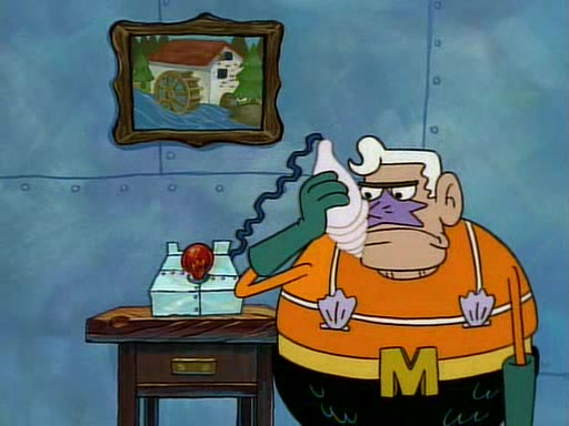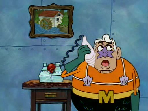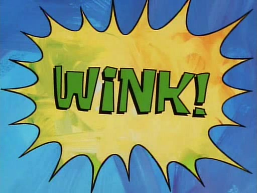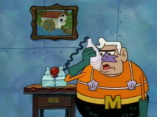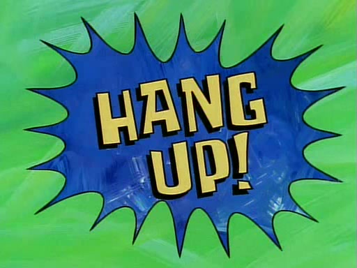 The phone gets broken, and when Mermaid Man hangs up the phone, a comic book bubble appears and dramatizes the words "HANG UP!" When Mermaid Man sits down, the bubble appears again and says "SIT!!" Will our heroes ever get their phone fixed? Tune in next week and find out. And when SpongeBob winks, the bubble appears again, saying "WINK!".