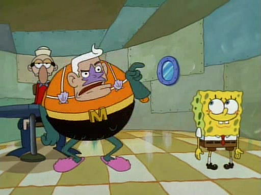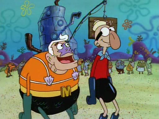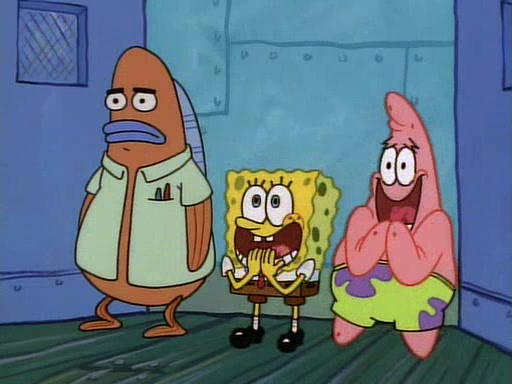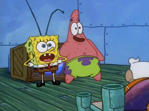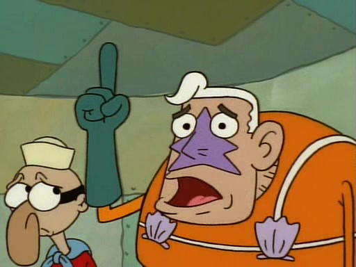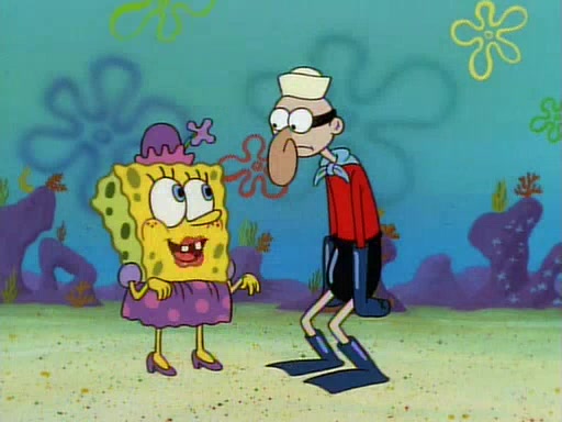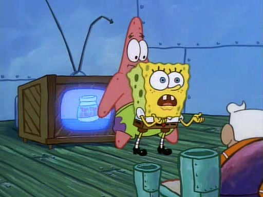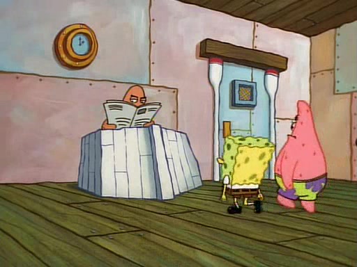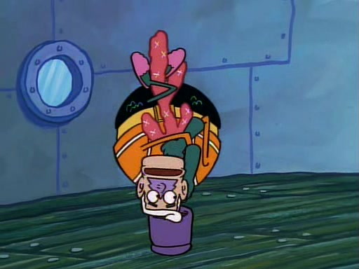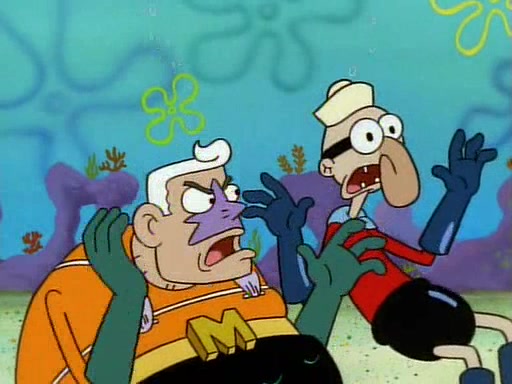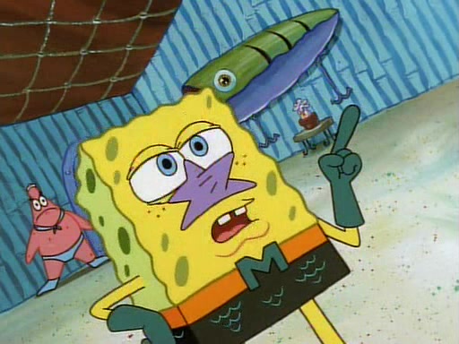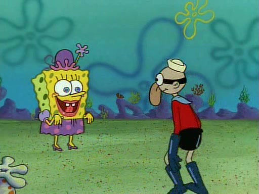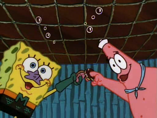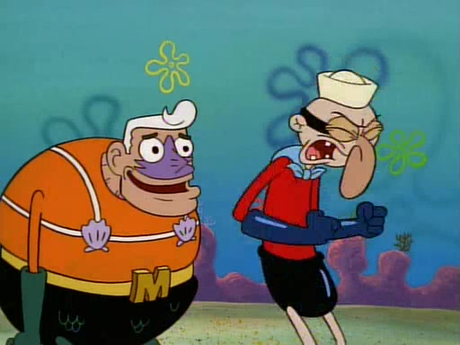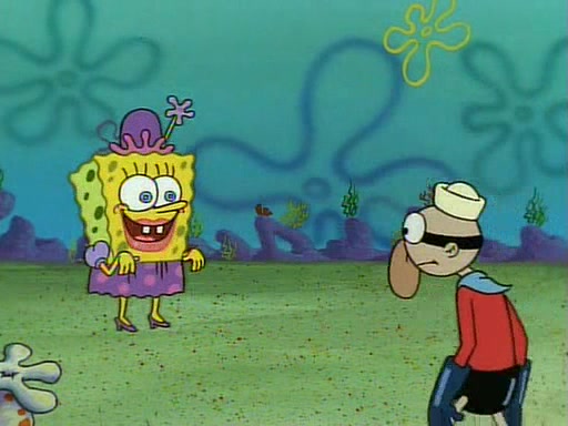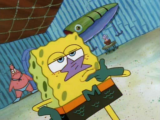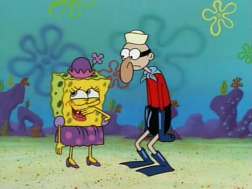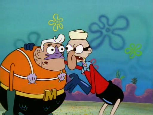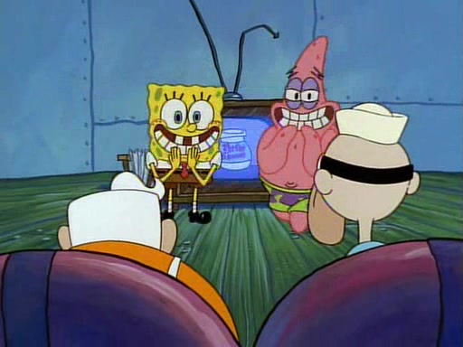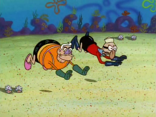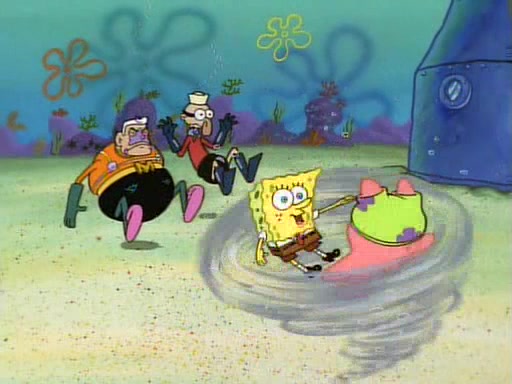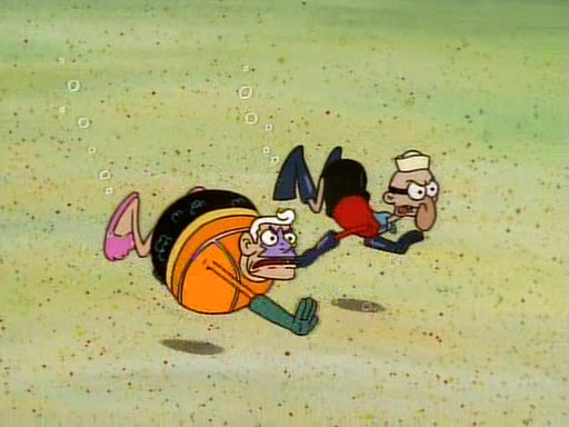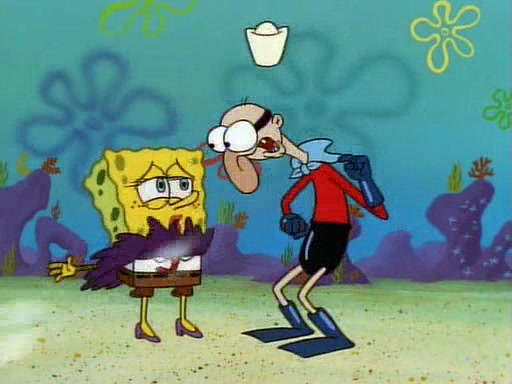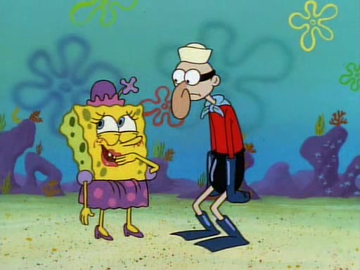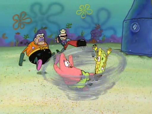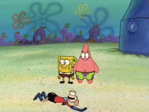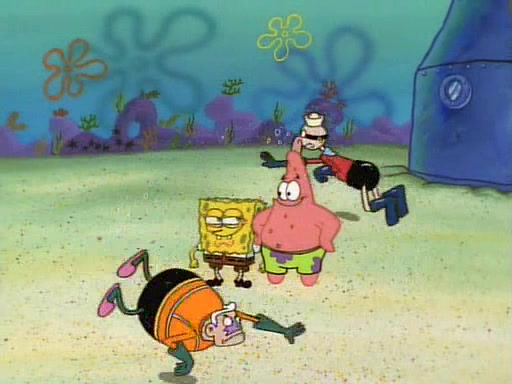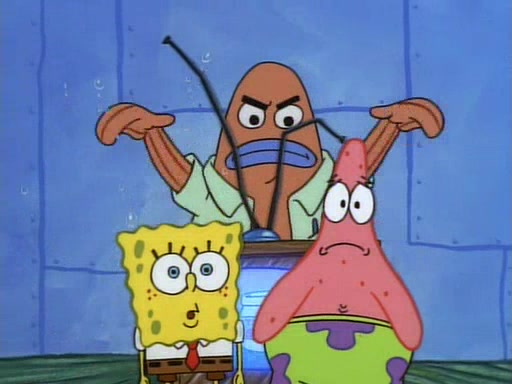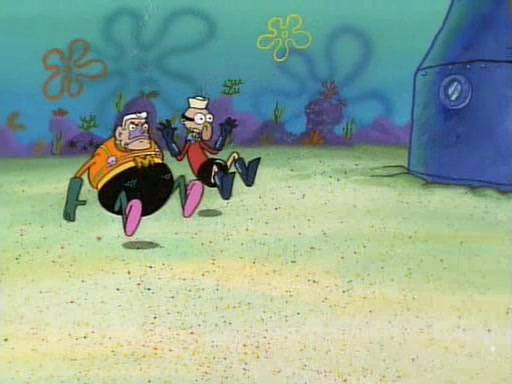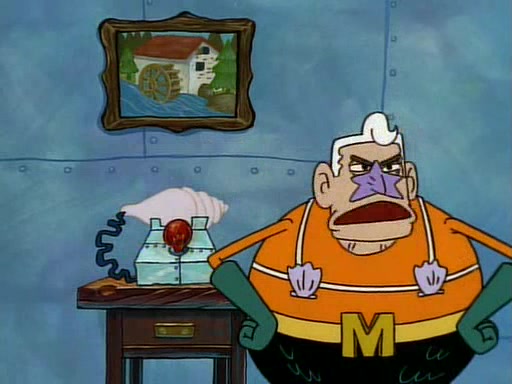 The phone gets broken, and when Mermaid Man hangs up the phone, a comic book bubble appears and dramatizes the words "HANG UP!" When Mermaid Man sits down, the bubble appears again and says "SIT!!" Will our heroes ever get their phone fixed? Tune in next week and find out. And when SpongeBob winks, the bubble appears again, saying "WINK!".