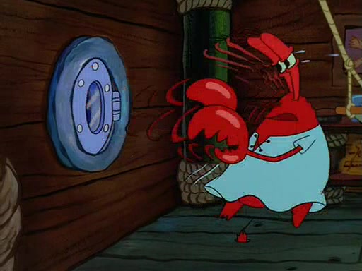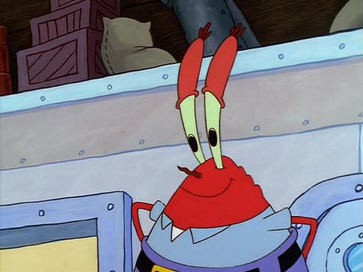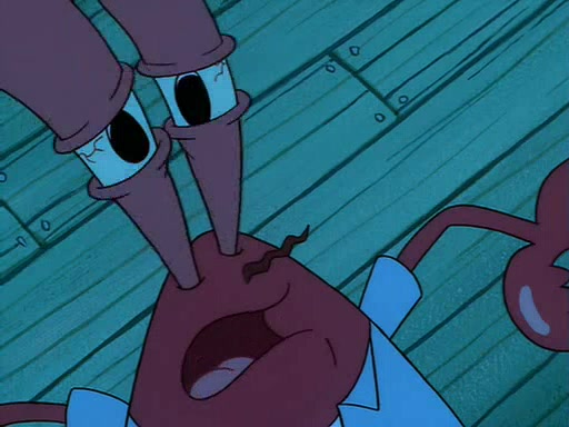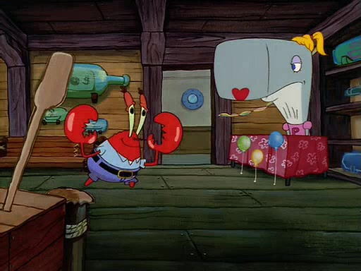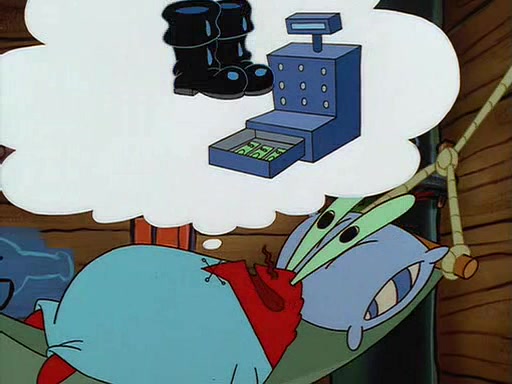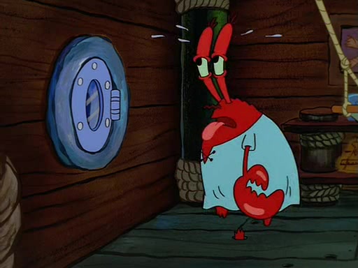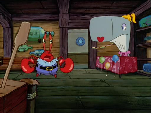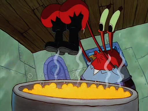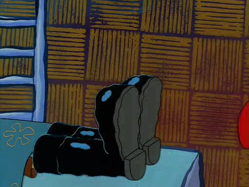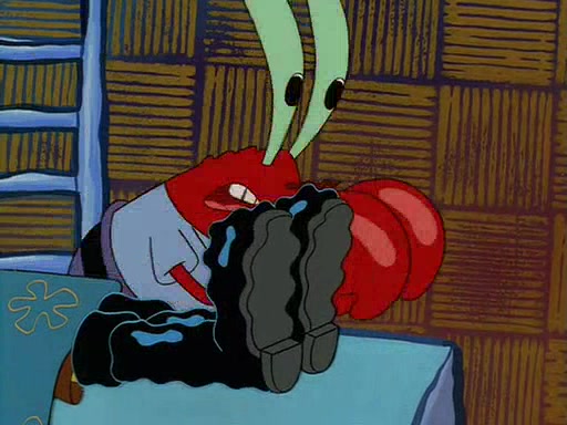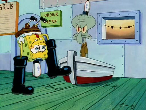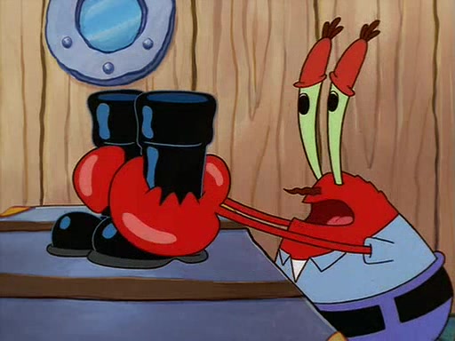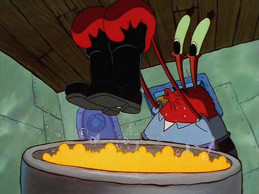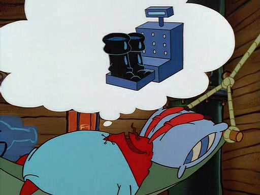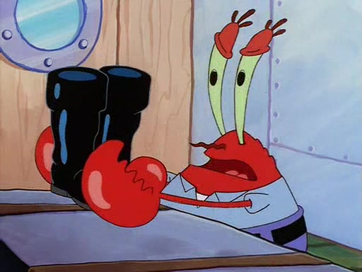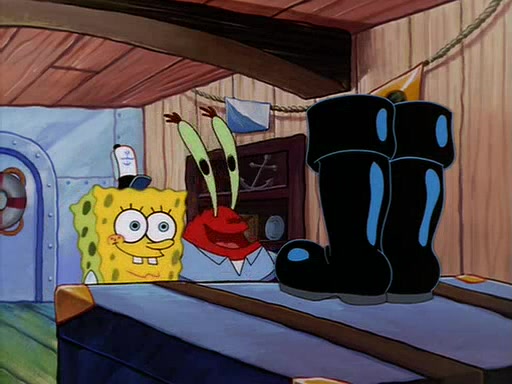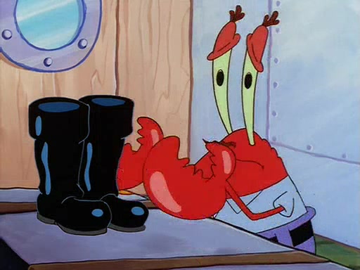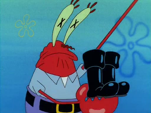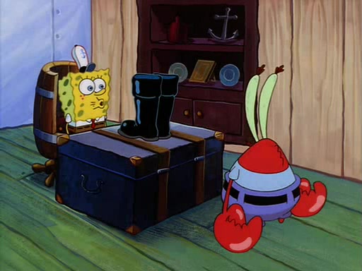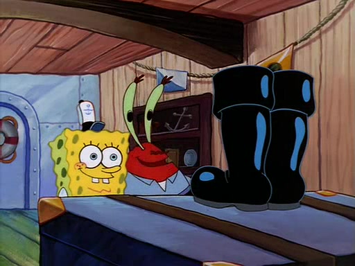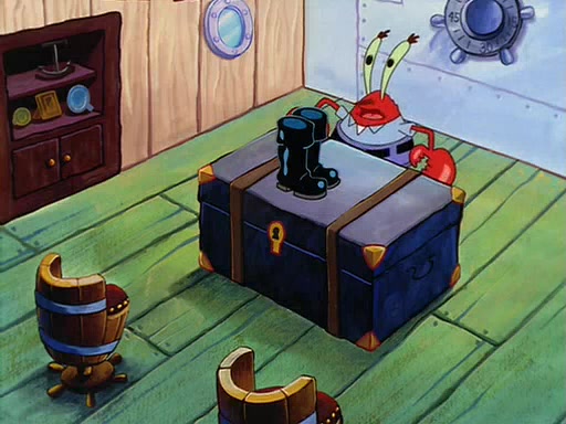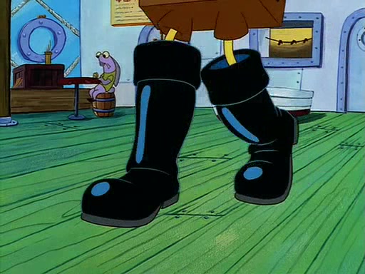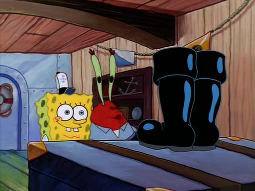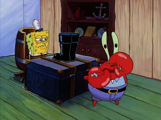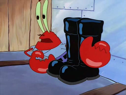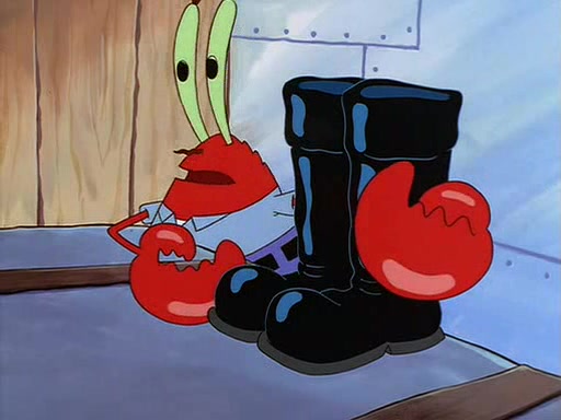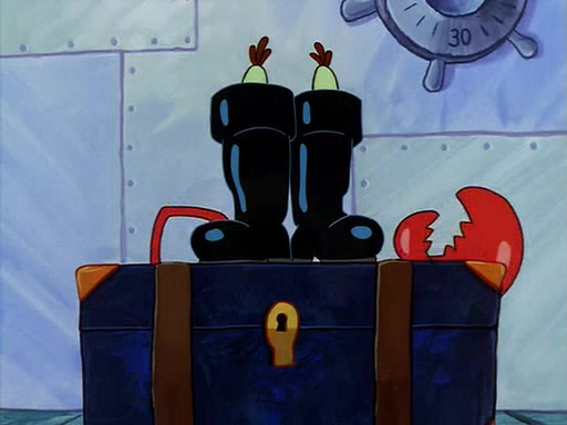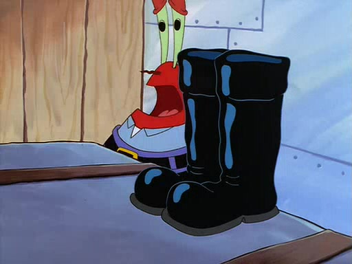 For Pearl's birthday, Mr. Krabs selfishly gives her a pair of black fishing boots that only cost $2. After Pearl doesn't accept the gift. Mr. Krabs, wanting to get rid of them, tells SpongeBob that the boots are special, and that they were only worn by the best official fry cooks in the world. SpongeBob, excitedly, exchanges his paycheck for them, and starts wearing them all day and night. The squeaking annoys Squidward so much that he goes on vacation, and Mr. Krabs has to fill in for him. After a sleepless night because of a squeaking window, Mr. Krabs can't stand the squeak of SpongeBob's boots anymore. At his wit's end, he steals the boots and buries them underneath the Krusty Krab. However, SpongeBob comes in the next day crying because he couldn't find the boots. Mr. Krabs feels guilty and starts going crazy, believing that he hears nothing but the constant squeaking of the boots (all text he sees is even replaced by the word "squeak"). Finally, he snaps and confesses that he stole the boots and hid them under the floor. He unburies the boots, shrinks them and eats them in a bout of insanity, which eventually calms Mr. Krabs and SpongeBob down. He thinks he finally has peace and quiet and goes on vacation with Pearl, until he hiccups, making the boots (inside his body) squeak.