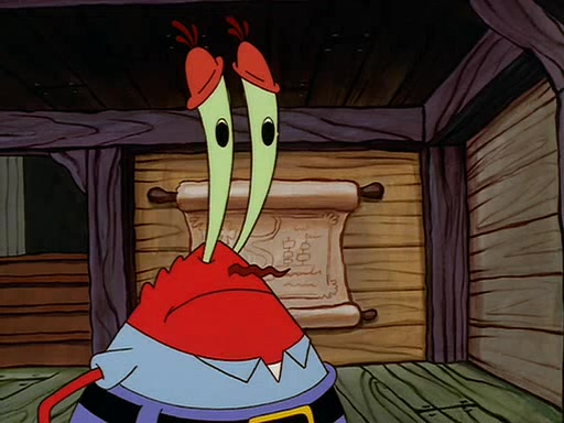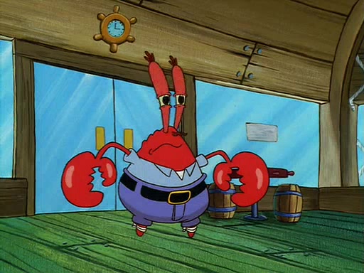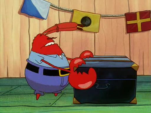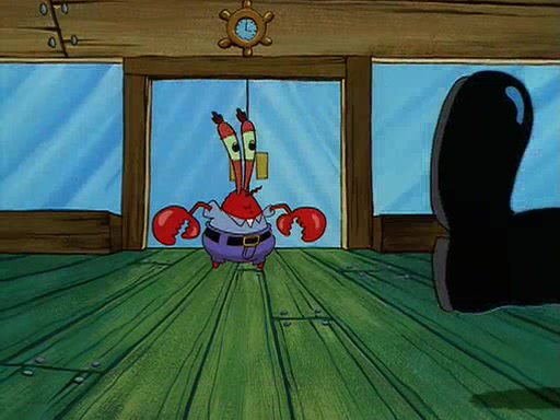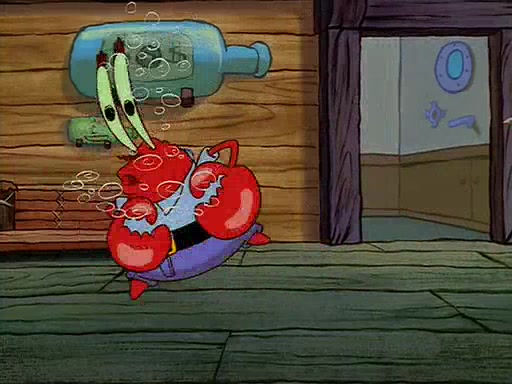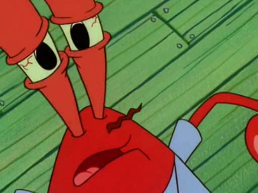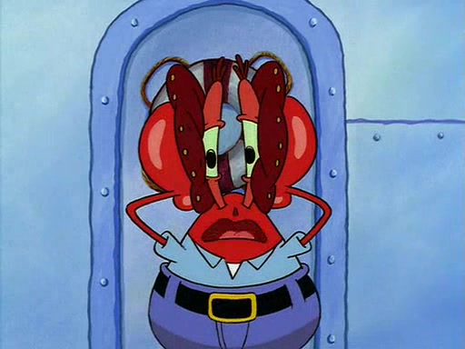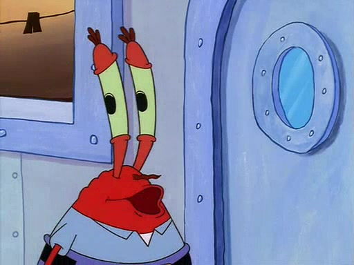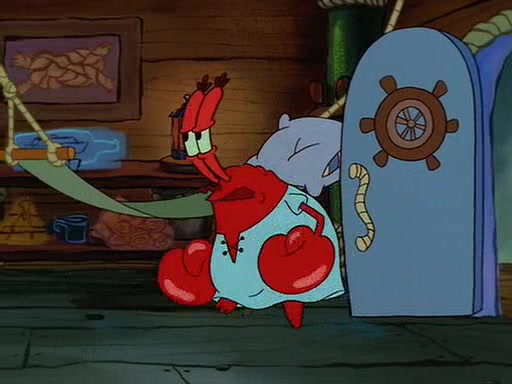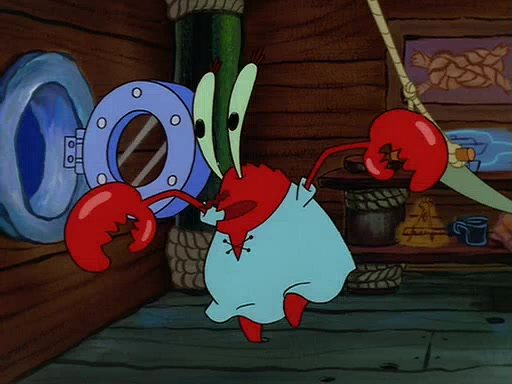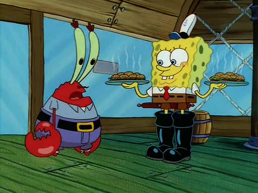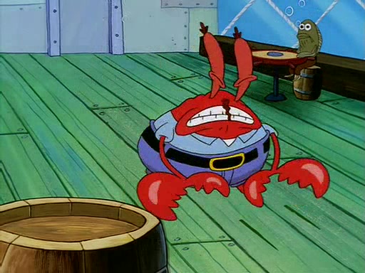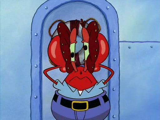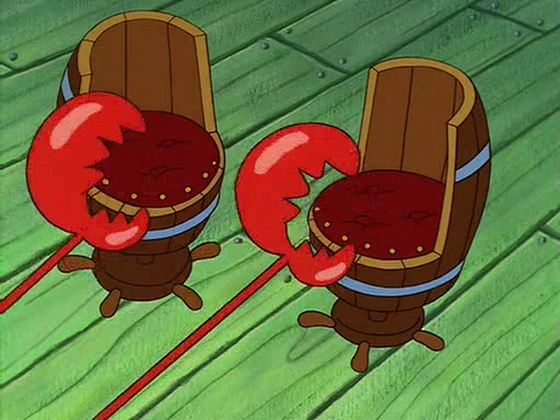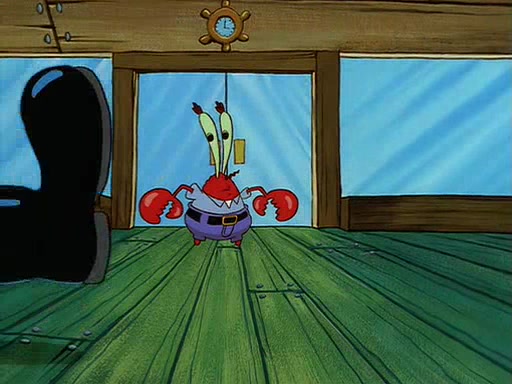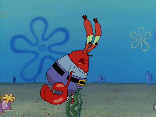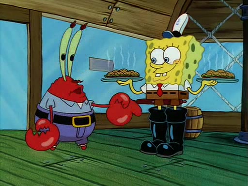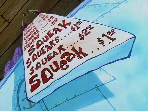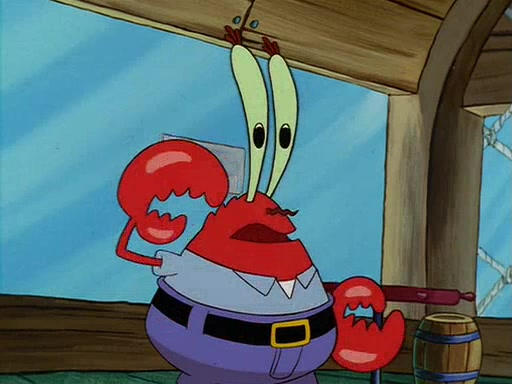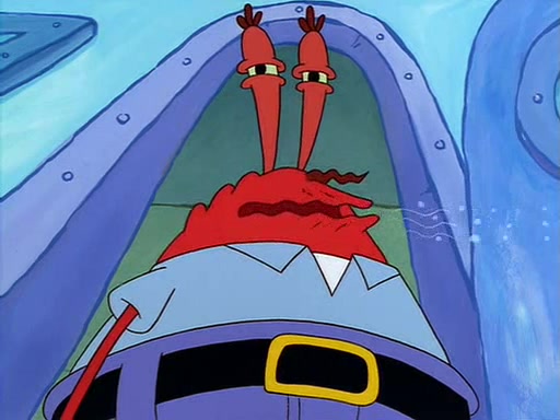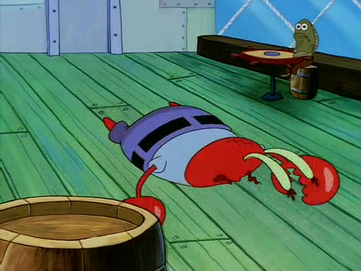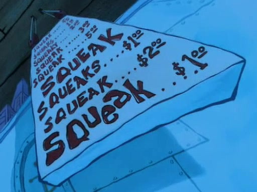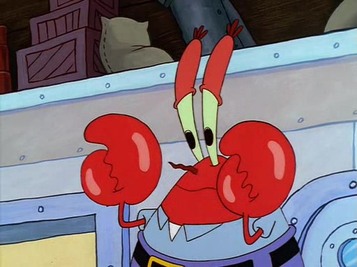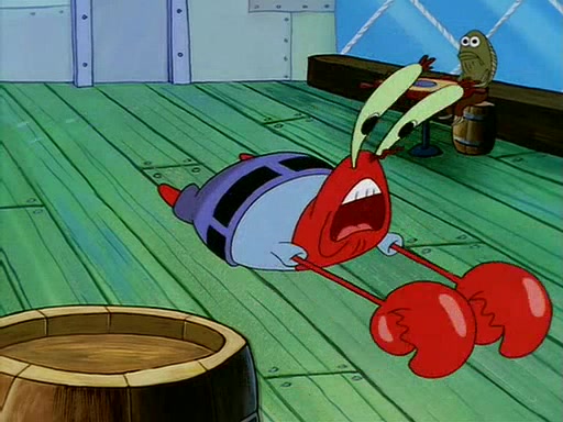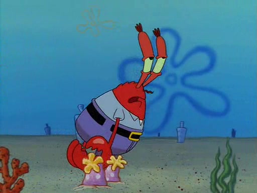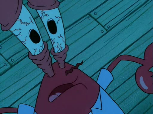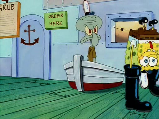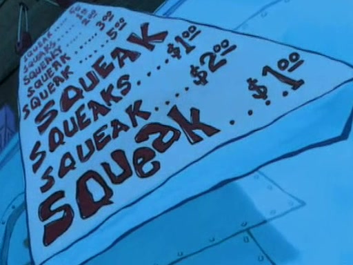 For Pearl's birthday, Mr. Krabs selfishly gives her a pair of black fishing boots that only cost $2. After Pearl doesn't accept the gift. Mr. Krabs, wanting to get rid of them, tells SpongeBob that the boots are special, and that they were only worn by the best official fry cooks in the world. SpongeBob, excitedly, exchanges his paycheck for them, and starts wearing them all day and night. The squeaking annoys Squidward so much that he goes on vacation, and Mr. Krabs has to fill in for him. After a sleepless night because of a squeaking window, Mr. Krabs can't stand the squeak of SpongeBob's boots anymore. At his wit's end, he steals the boots and buries them underneath the Krusty Krab. However, SpongeBob comes in the next day crying because he couldn't find the boots. Mr. Krabs feels guilty and starts going crazy, believing that he hears nothing but the constant squeaking of the boots (all text he sees is even replaced by the word "squeak"). Finally, he snaps and confesses that he stole the boots and hid them under the floor. He unburies the boots, shrinks them and eats them in a bout of insanity, which eventually calms Mr. Krabs and SpongeBob down. He thinks he finally has peace and quiet and goes on vacation with Pearl, until he hiccups, making the boots (inside his body) squeak.