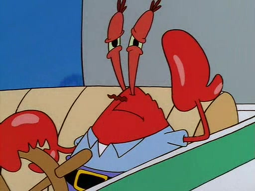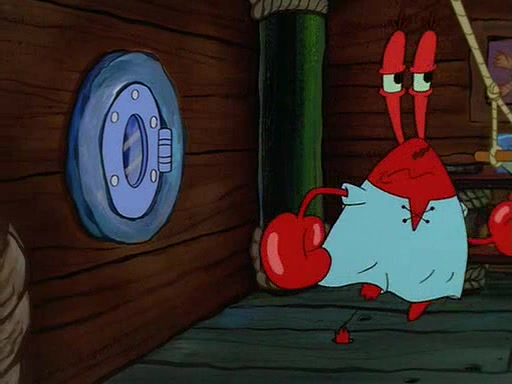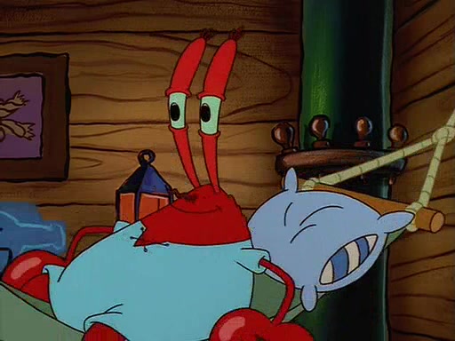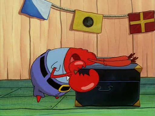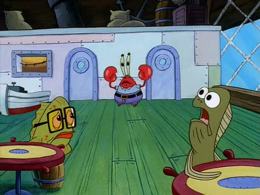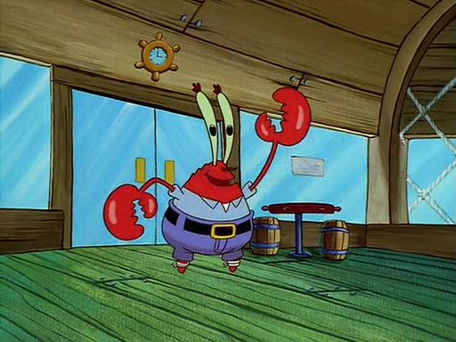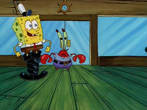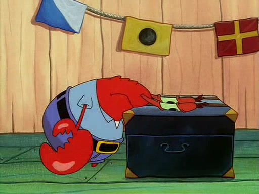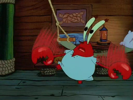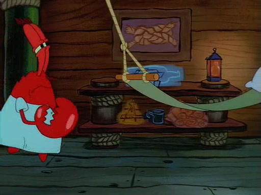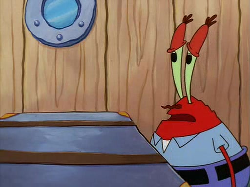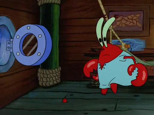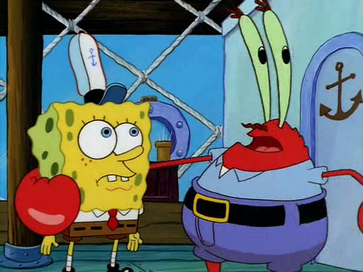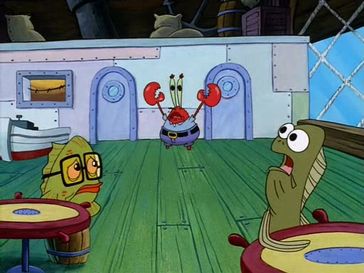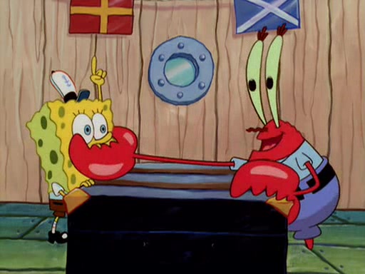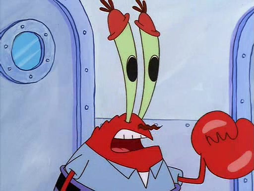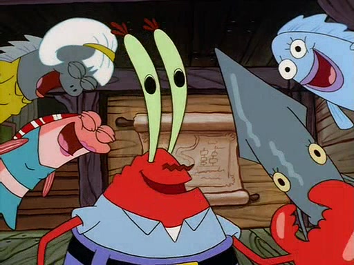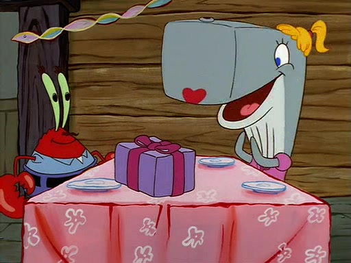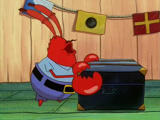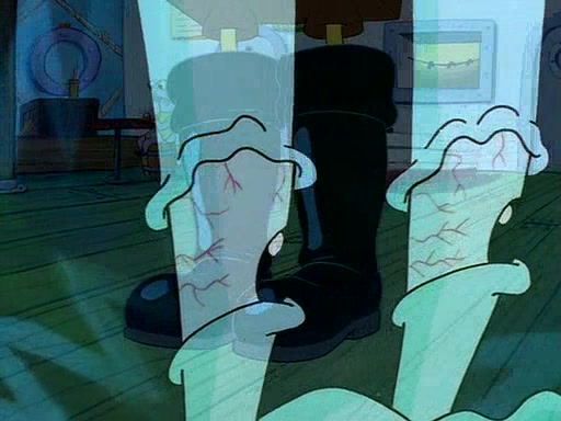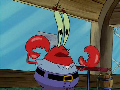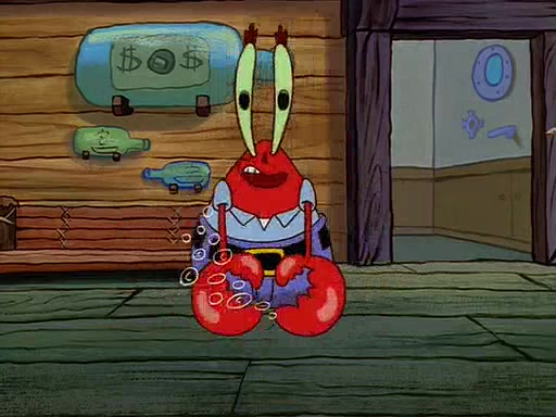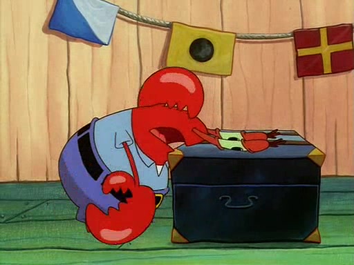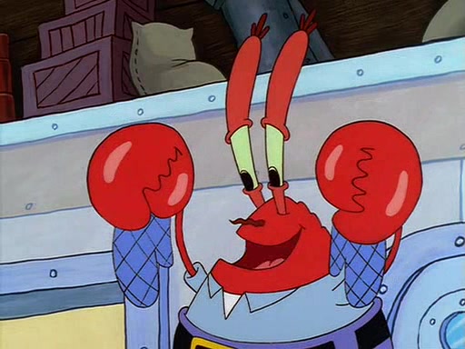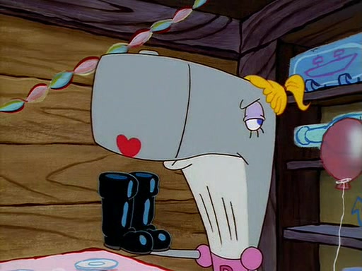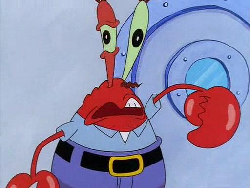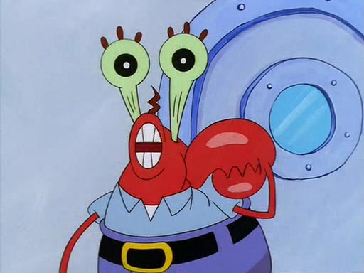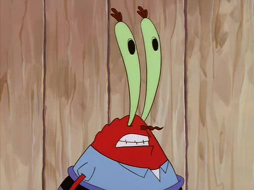 For Pearl's birthday, Mr. Krabs selfishly gives her a pair of black fishing boots that only cost $2. After Pearl doesn't accept the gift. Mr. Krabs, wanting to get rid of them, tells SpongeBob that the boots are special, and that they were only worn by the best official fry cooks in the world. SpongeBob, excitedly, exchanges his paycheck for them, and starts wearing them all day and night. The squeaking annoys Squidward so much that he goes on vacation, and Mr. Krabs has to fill in for him. After a sleepless night because of a squeaking window, Mr. Krabs can't stand the squeak of SpongeBob's boots anymore. At his wit's end, he steals the boots and buries them underneath the Krusty Krab. However, SpongeBob comes in the next day crying because he couldn't find the boots. Mr. Krabs feels guilty and starts going crazy, believing that he hears nothing but the constant squeaking of the boots (all text he sees is even replaced by the word "squeak"). Finally, he snaps and confesses that he stole the boots and hid them under the floor. He unburies the boots, shrinks them and eats them in a bout of insanity, which eventually calms Mr. Krabs and SpongeBob down. He thinks he finally has peace and quiet and goes on vacation with Pearl, until he hiccups, making the boots (inside his body) squeak.