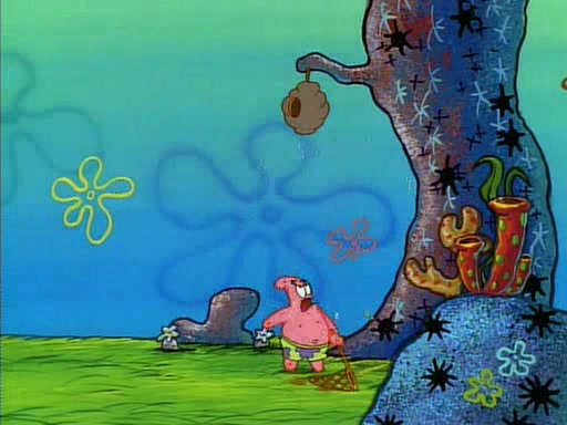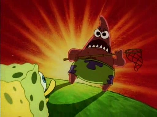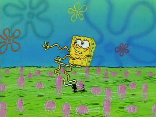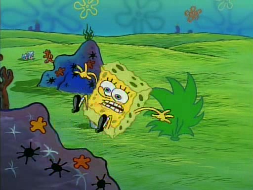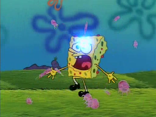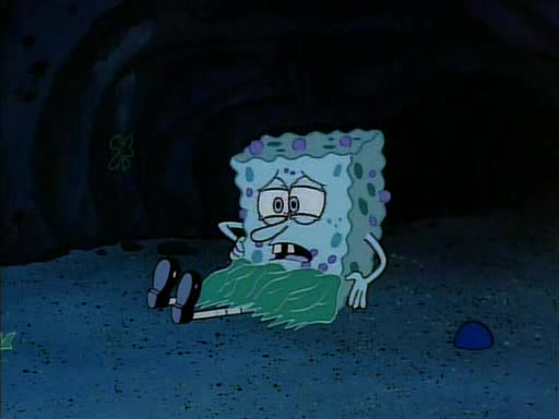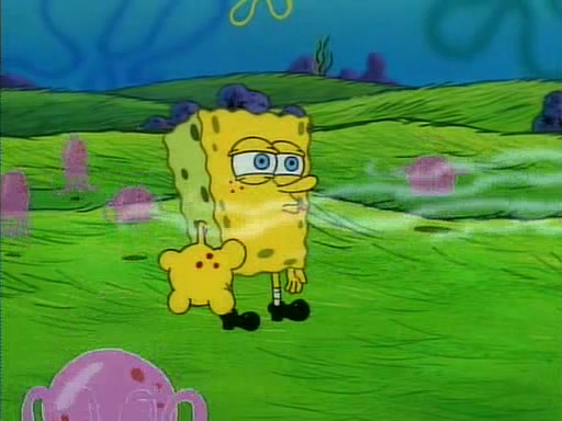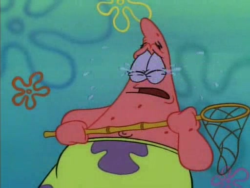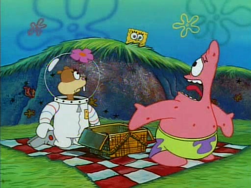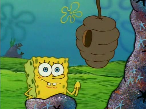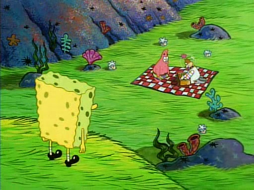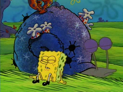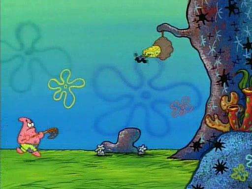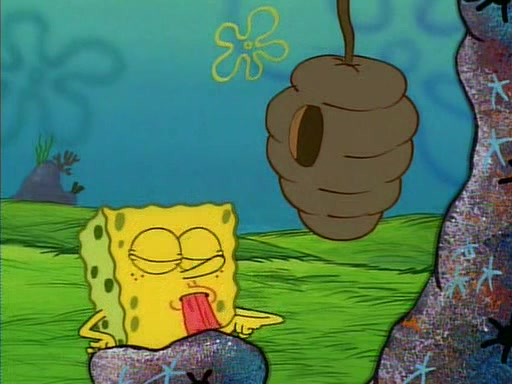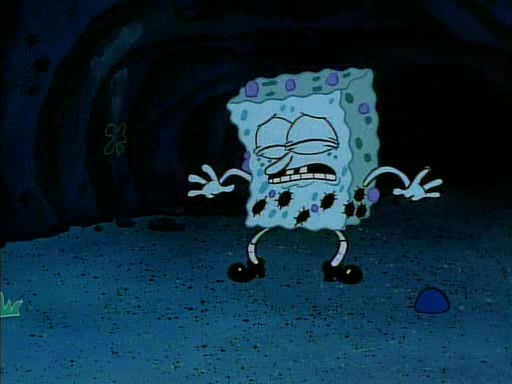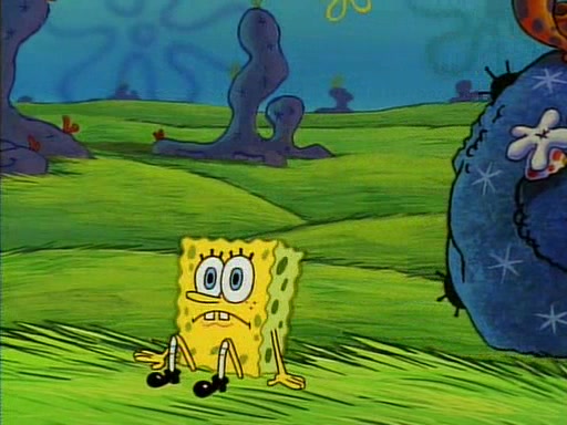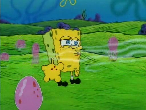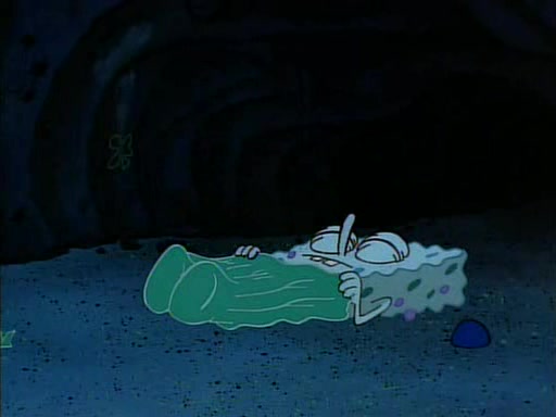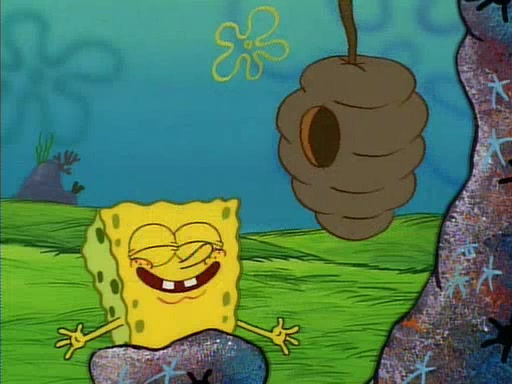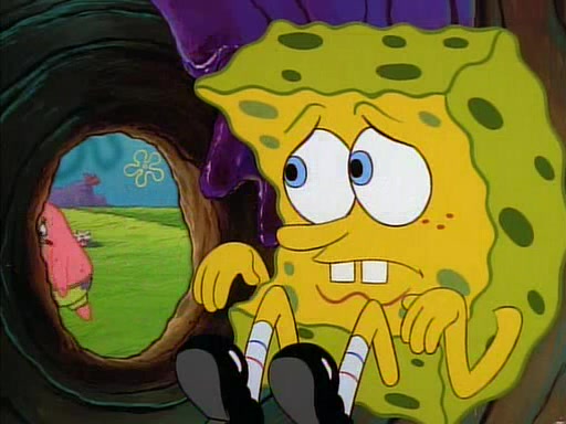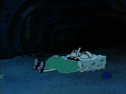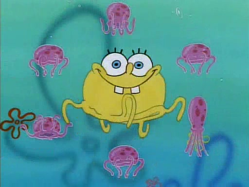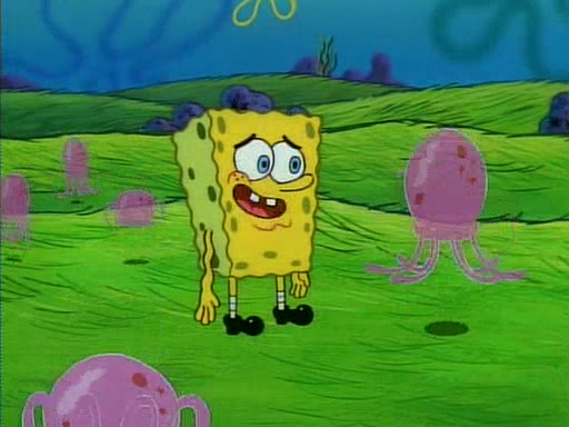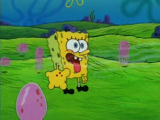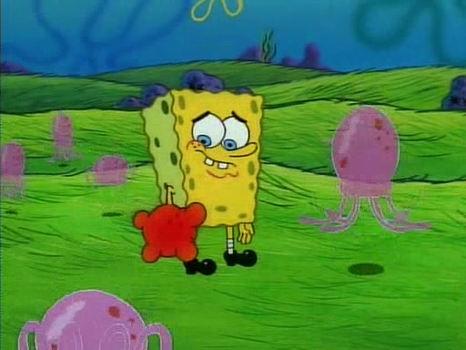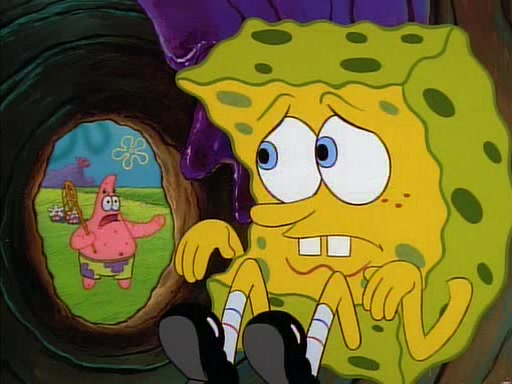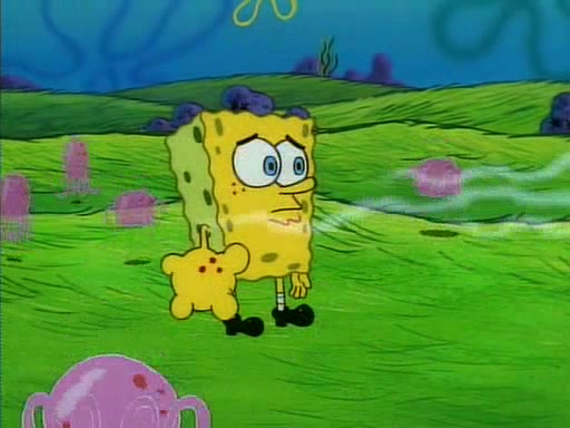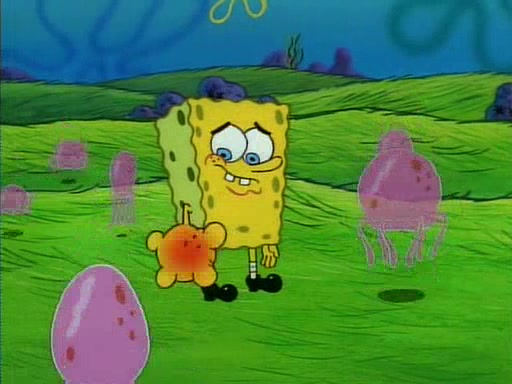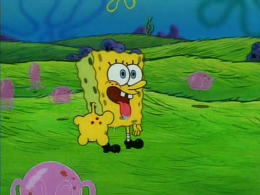 He even takes off everything he's wearing, except his shoes. SpongeBob tries to fit in with the jellyfish, but he just can't get the hang of it. Meanwhile, Patrick and Sandy have a set-up picnic to try to trick SpongeBob into coming back. They eat Krabby Patties, as an attempt to bribe SpongeBob, but he resists. A crazed and heartbroken Patrick then tries to catch him with Ol' Reliable while jellyfishing, but fails when SpongeBob jumps into the jellyfish hive, where he takes to eating the jelly inside. Upon the swarm's return, SpongeBob greets them in a friendly manner, but is then repeatedly stung and chased into a cave by them. Disheartened, but not giving up yet, SpongeBob tries to sleep in a cave, using a fern as a blanket, but ultimately ends up getting covered in poison sea urchins.