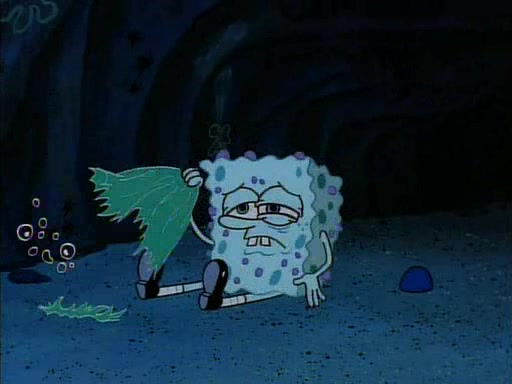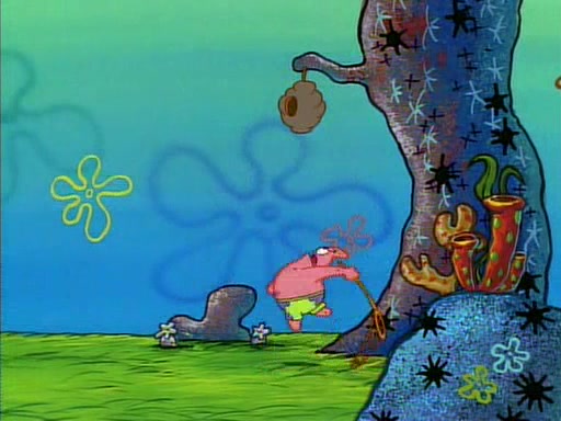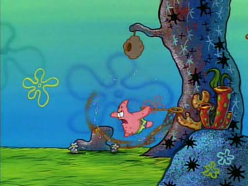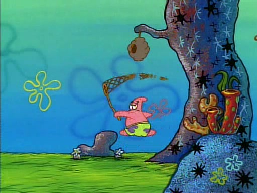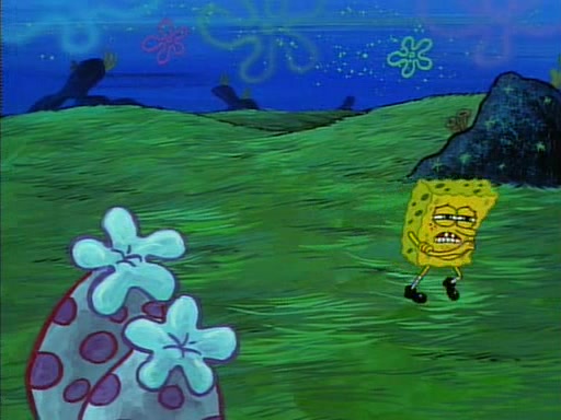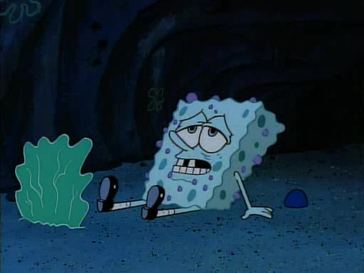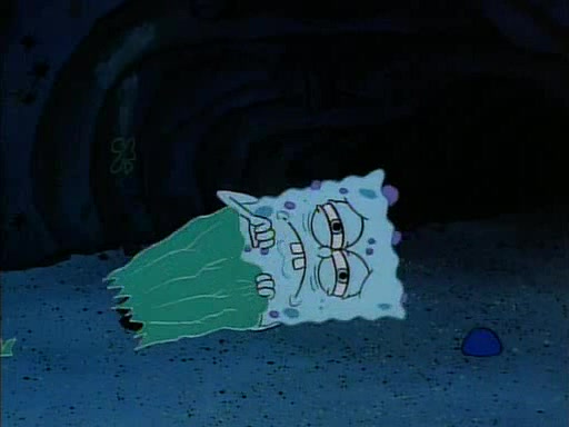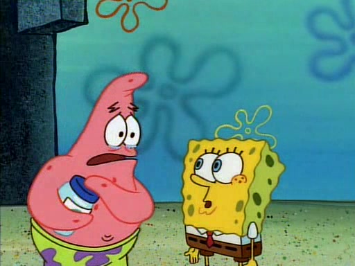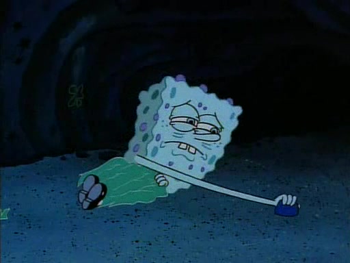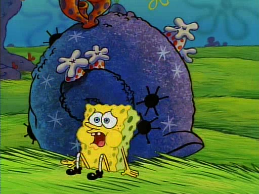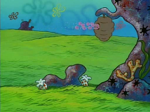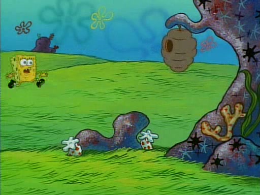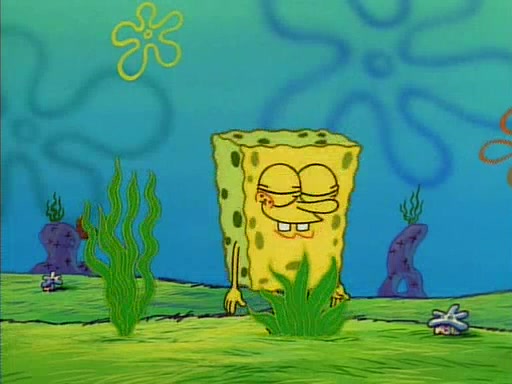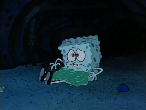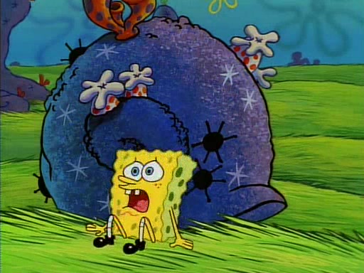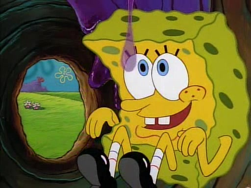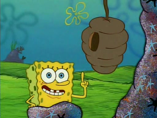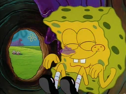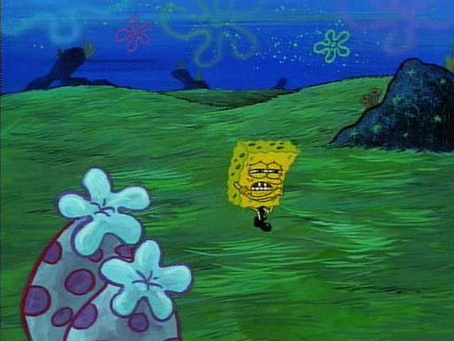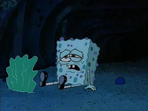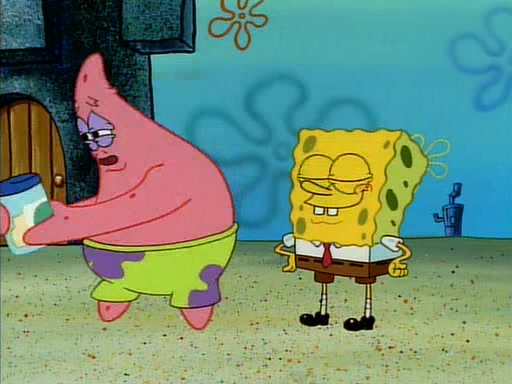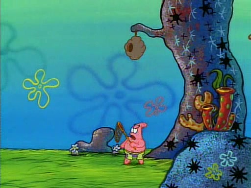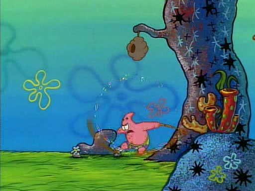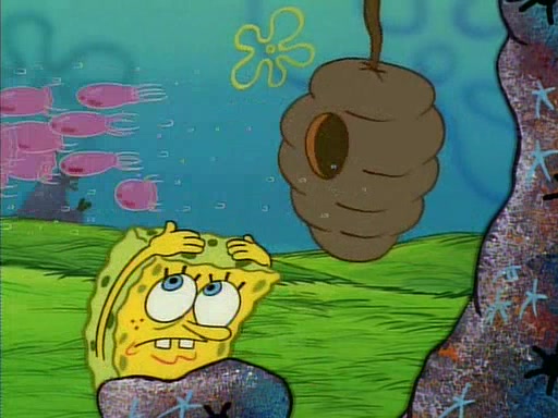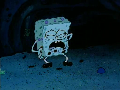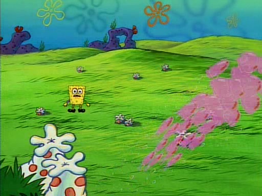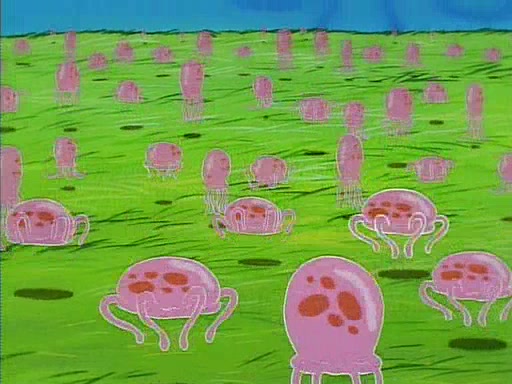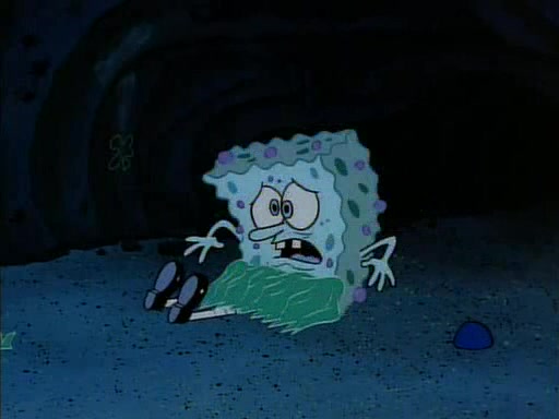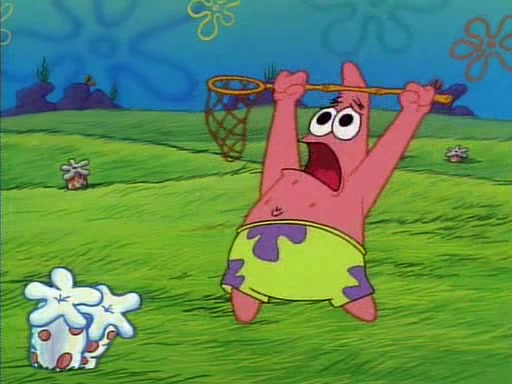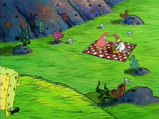 He even takes off everything he's wearing, except his shoes. SpongeBob tries to fit in with the jellyfish, but he just can't get the hang of it. Meanwhile, Patrick and Sandy have a set-up picnic to try to trick SpongeBob into coming back. They eat Krabby Patties, as an attempt to bribe SpongeBob, but he resists. A crazed and heartbroken Patrick then tries to catch him with Ol' Reliable while jellyfishing, but fails when SpongeBob jumps into the jellyfish hive, where he takes to eating the jelly inside. Upon the swarm's return, SpongeBob greets them in a friendly manner, but is then repeatedly stung and chased into a cave by them. Disheartened, but not giving up yet, SpongeBob tries to sleep in a cave, using a fern as a blanket, but ultimately ends up getting covered in poison sea urchins.