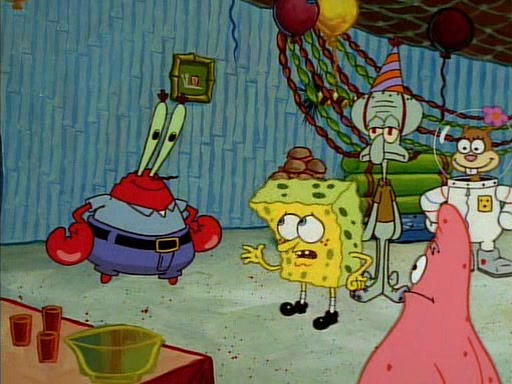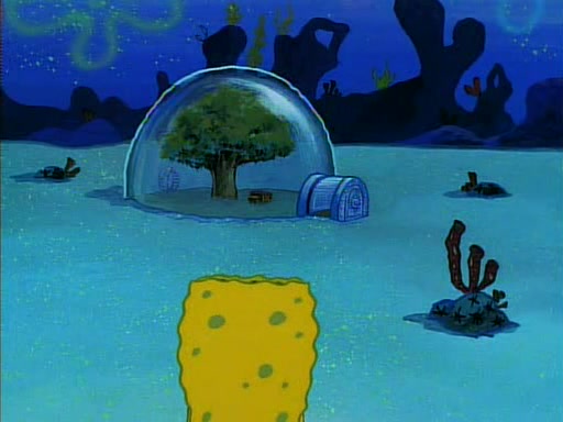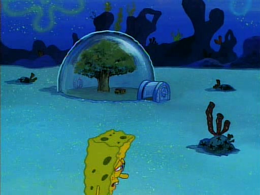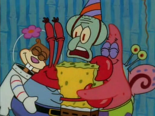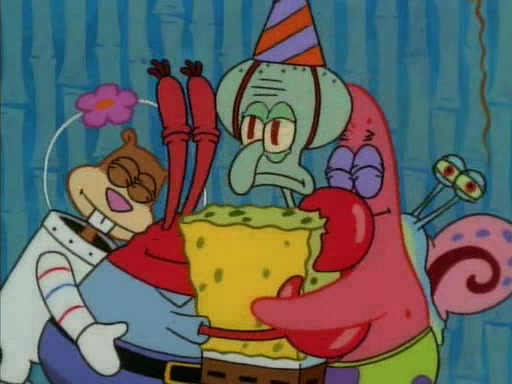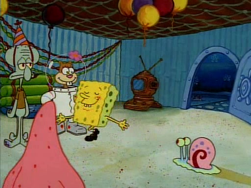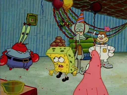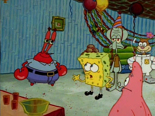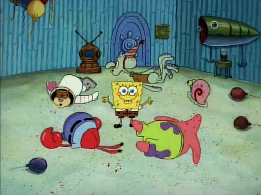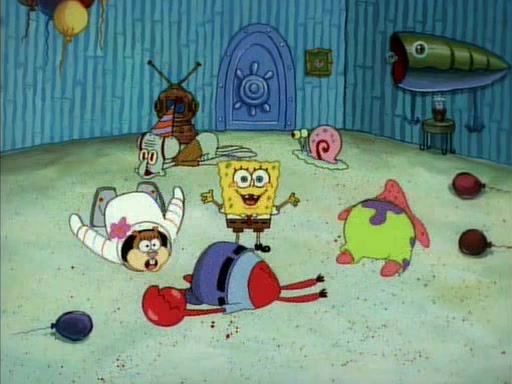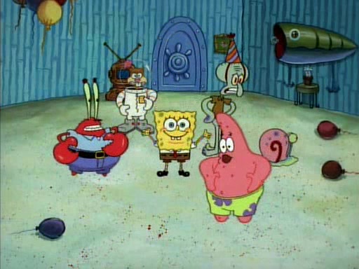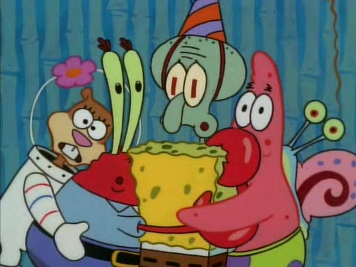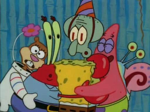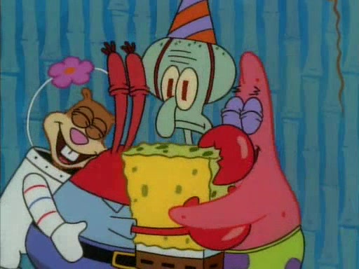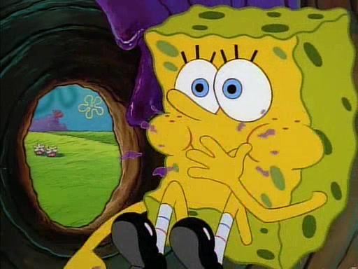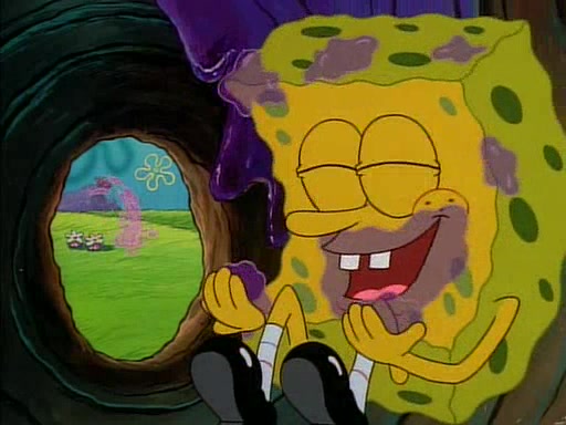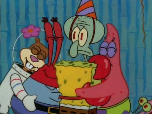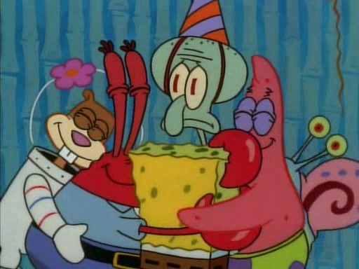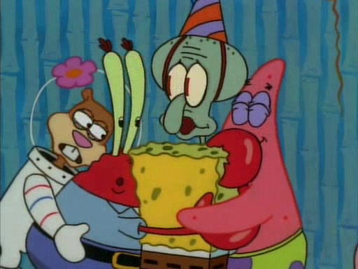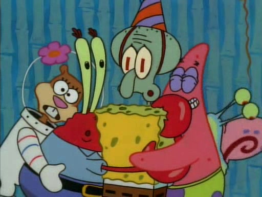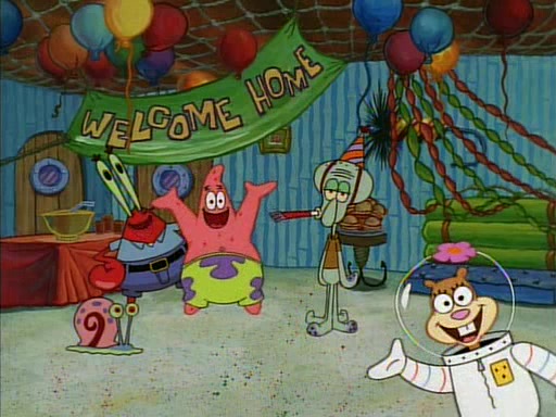 Finally deciding that the wild isn't as good as he thought, SpongeBob returns to Bikini Bottom and, after seeing Sandy's Treedome and the Krusty Krab, realizes his mistake; he had a great life and friends, and gave it all up. Upon his return to the pineapple, he is greeted with a massive "Welcome Home" party, the others apparently having been expecting him. All is forgiven, SpongeBob puts his clothes back on as a favour to Squidward, and everyone group-hugs. However, the poison sea urchin bacteria spreads, and everyone except SpongeBob becomes itchy.